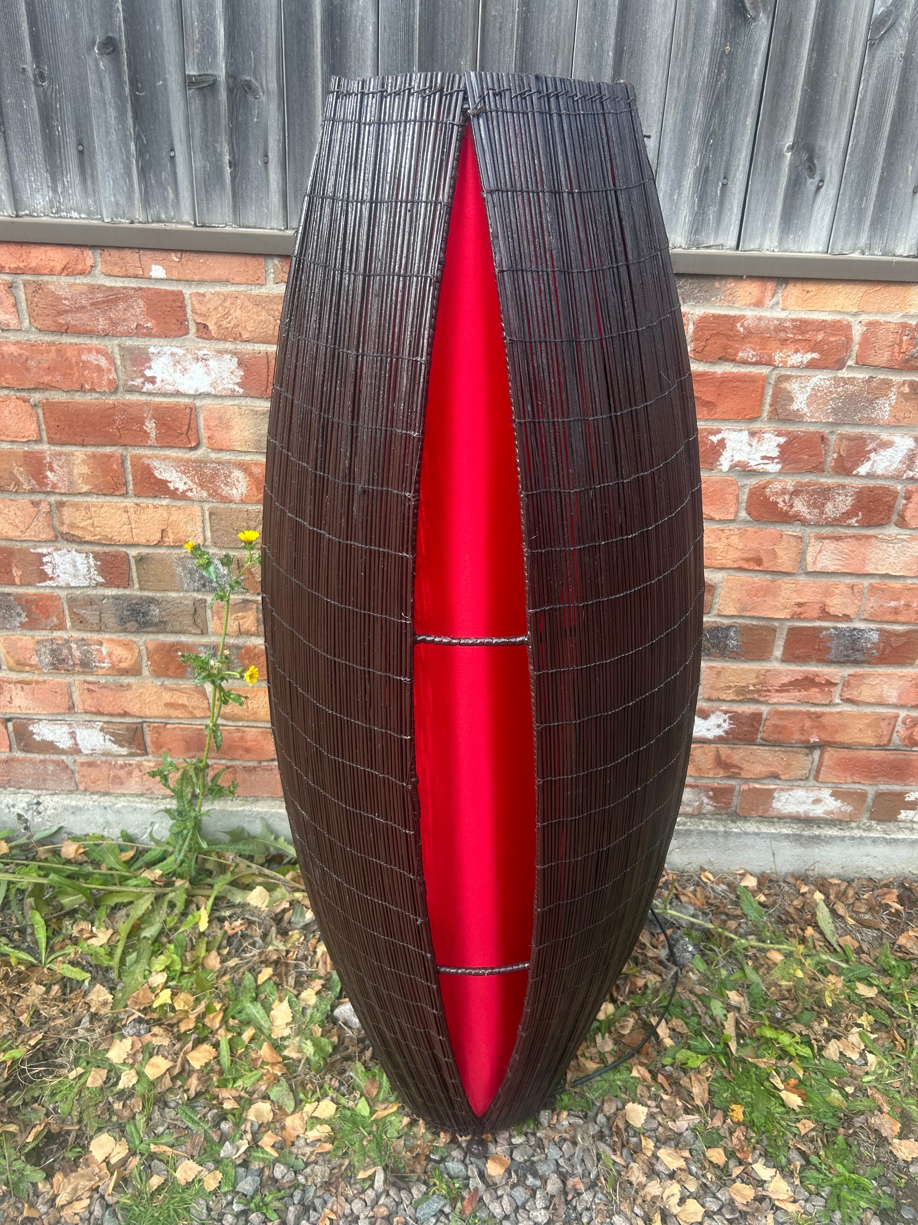 A Mid-Century Style Floor Lamp. Made in Thailand. This tall, ovoid-shaped floor lamp features an outer shell crafted from numerous dark, slender reeds or bamboo slats, tightly secured together in horizontal bands. The shell is split vertically down the front, revealing a vibrant, reflective red fabric lining the interior, which acts as a decorative light diffuser. The lamp exhibits a contemporary and organic design aesthetic.