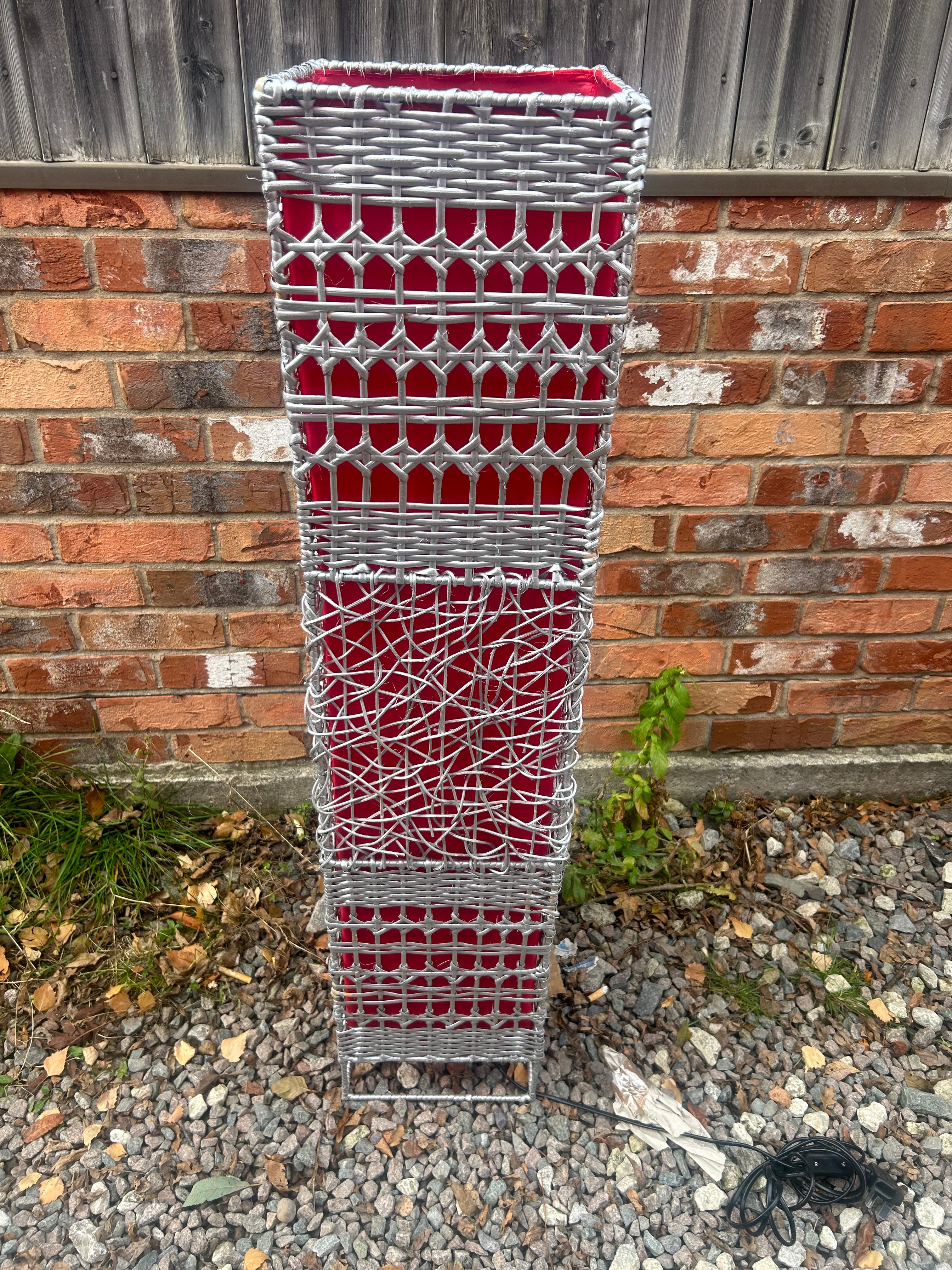 A new contemporary floor lamp, approximately 45 inches tall, featuring a rectangular columnar form. The item’s materials are confirmed to be ‘Made in Thailand’. It presents a grey-toned woven exterior over a vibrant red fabric lining. The weaving pattern varies, with a tight basketweave at the top and bottom bands, an open, decorative lattice pattern in the middle sections, and a looser, more randomized ‘tangled’ weave towards the lower middle. It includes an electrical cord and plug, suggesting functionality as an illumination source.