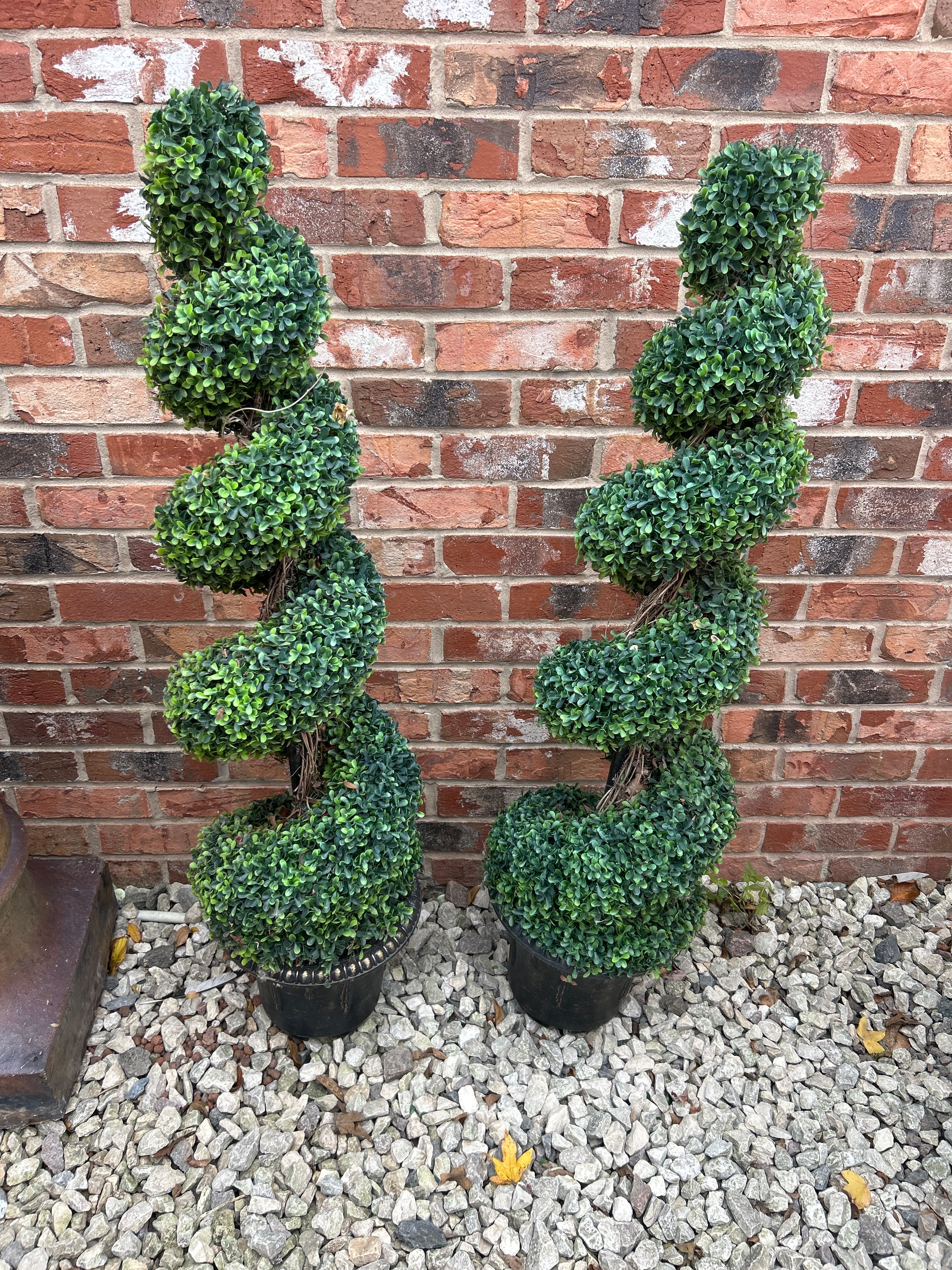 A pair of artificial spiral boxwood topiary plants, each featuring dense, vibrant green synthetic foliage arranged in a distinctive helical shape. The items are housed in simple, black plastic planters with a ribbed exterior design, suitable for indoor or outdoor decorative accents. The foliage simulates the appearance of boxwood or a similar small-leaved shrub.