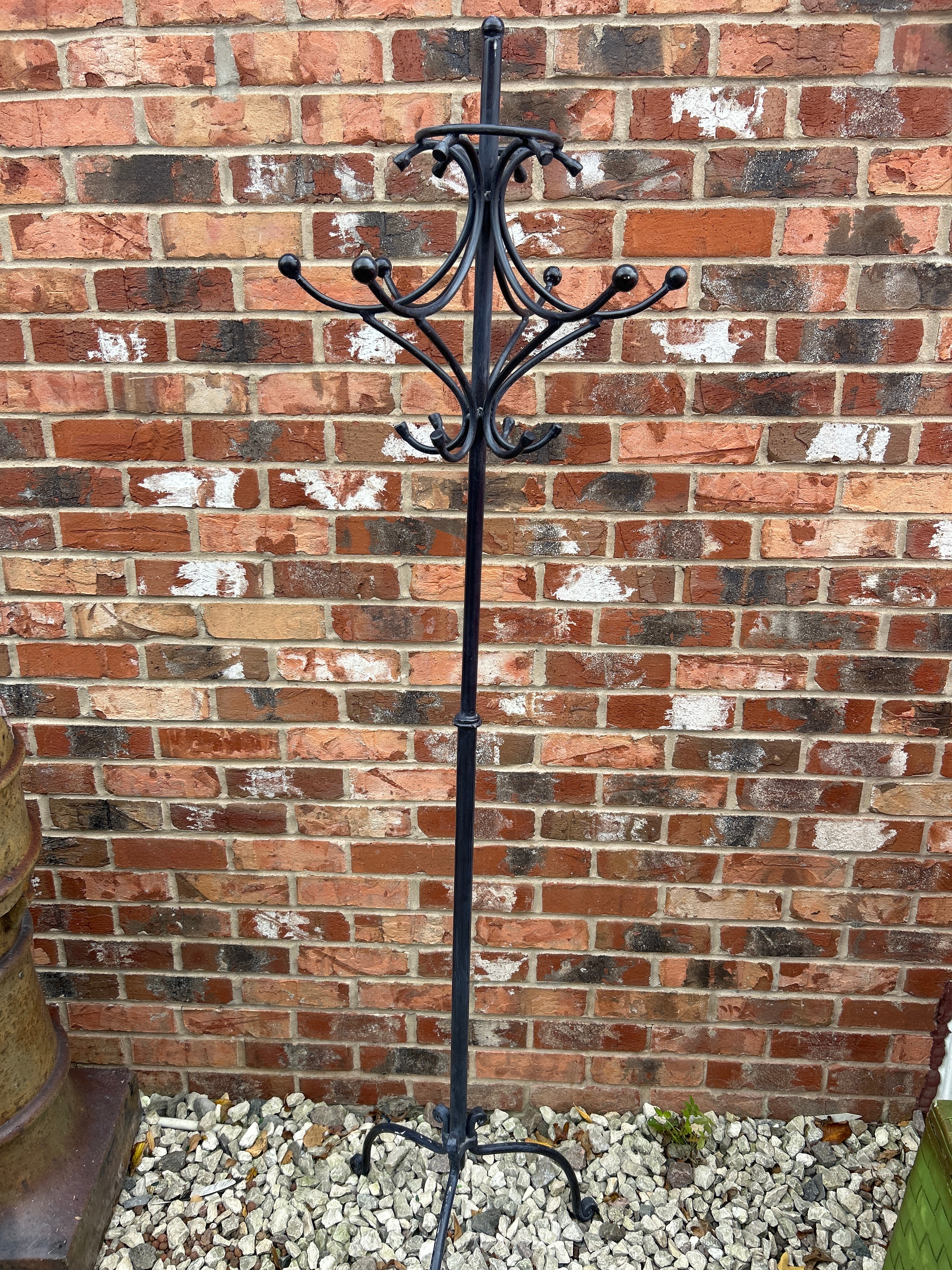 A freestanding, traditional-style metal coat and hat stand, likely crafted from wrought or cast iron with a dark, possibly black, matte finish. It features a central column supporting two tiers of ornate, scrolled arms, each ending in a ball-tipped hook, along with a decorative finial at the top. The stable four-legged base also incorporates scrollwork. No visible manufacturer’s marks or text are discernible.