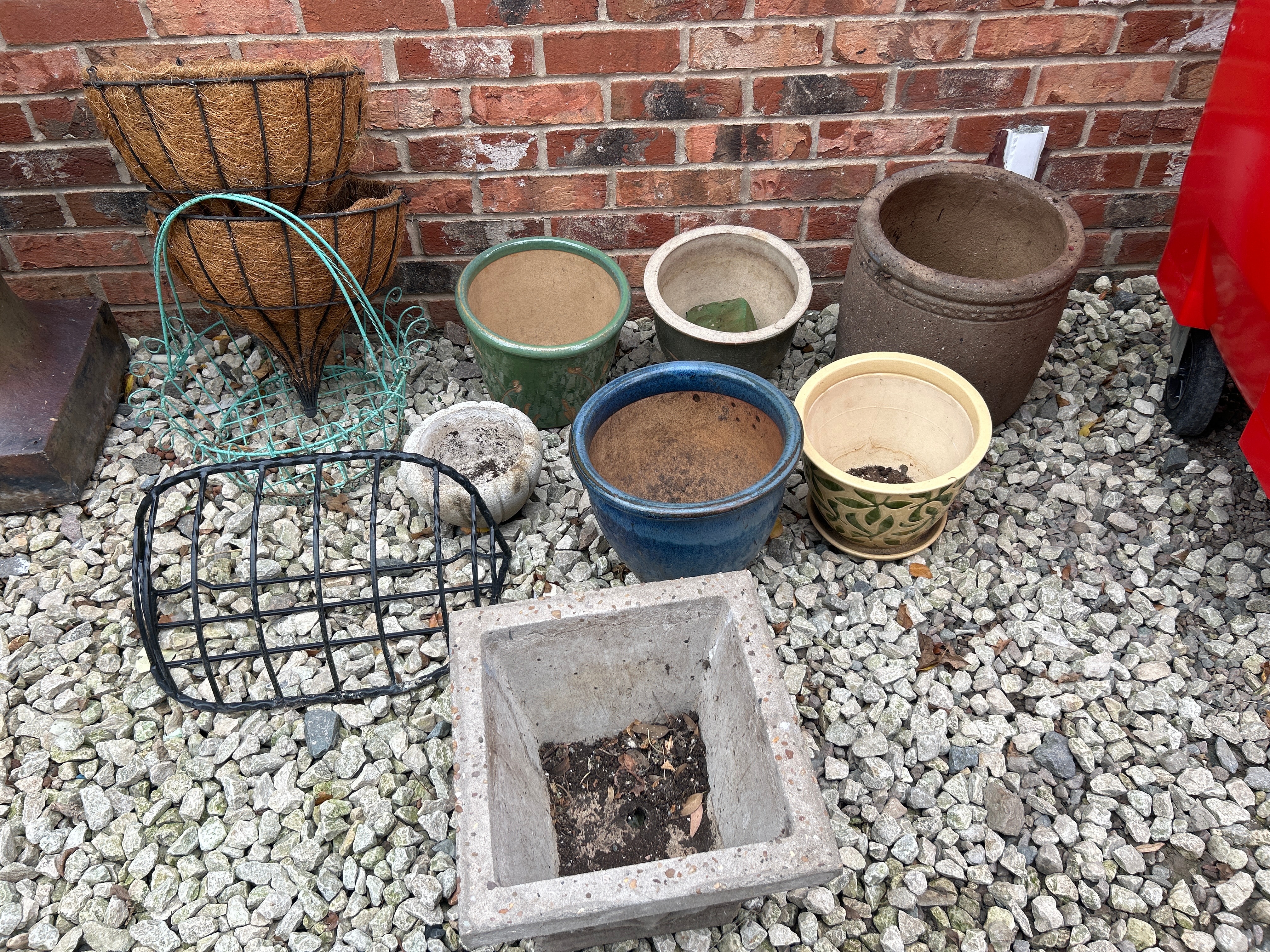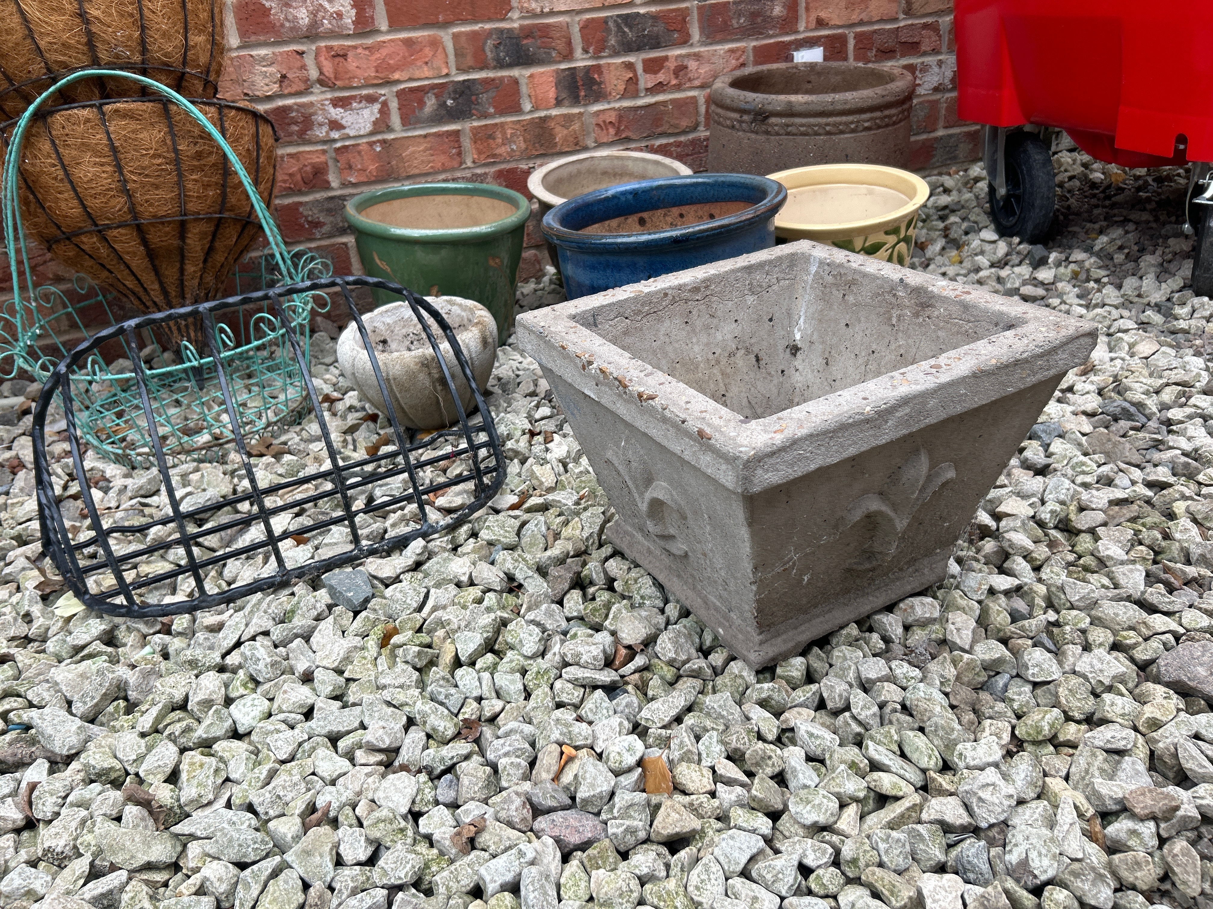 A varied assortment of garden planters and accessories. Comprising a group of four glazed ceramic pots in various colors including green, cream, blue, and yellow with decorative relief; a larger unglazed stoneware or terracotta pot; a prominent square, tapered concrete planter with decorative relief on its sides; a small rough-textured stone or concrete pot; a collection of metal wire hanging baskets, some retaining coir liners; and a pair of metal wire cages.