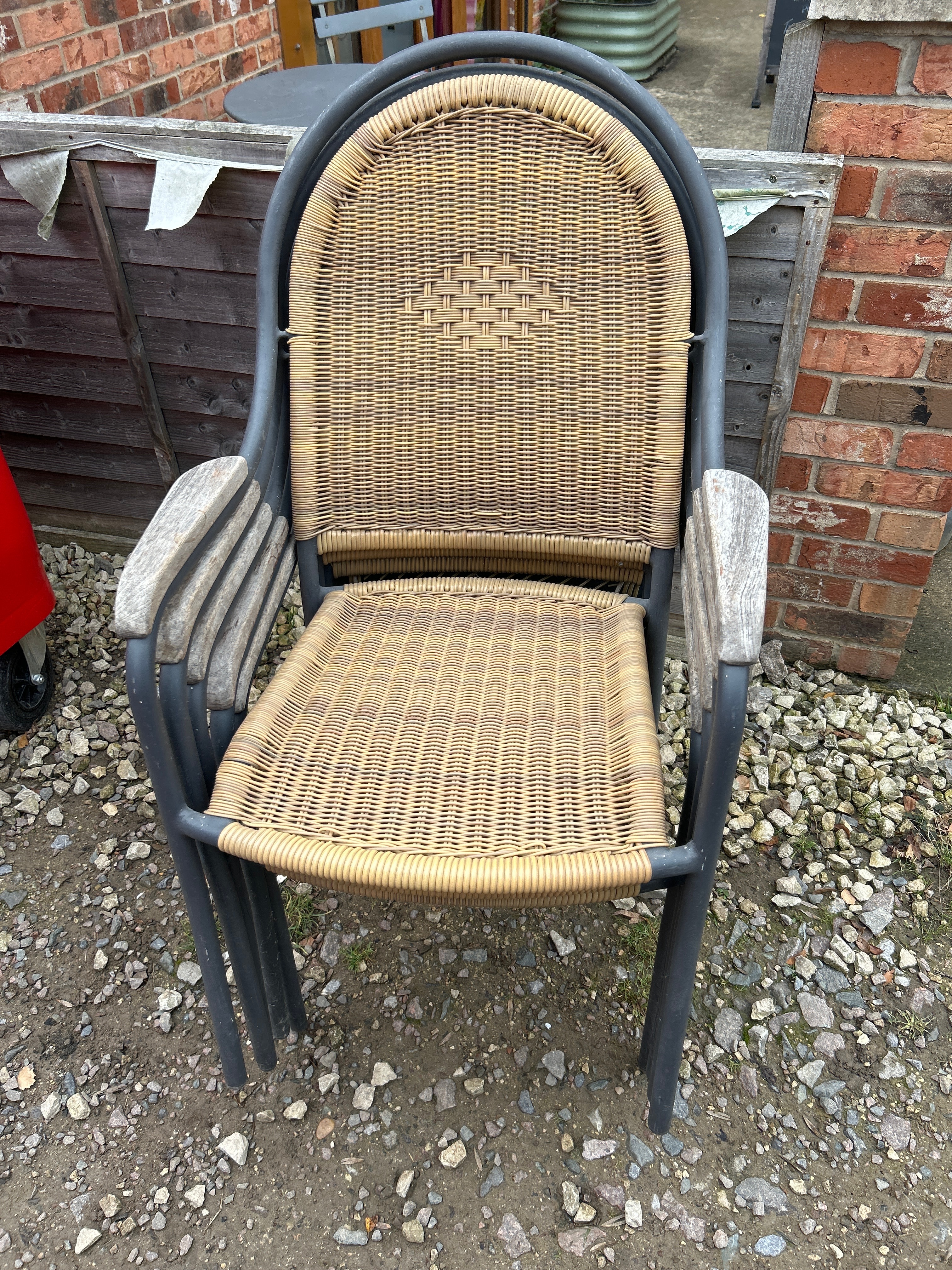 A set of five contemporary outdoor dining chairs, each featuring a dark grey tubular metal frame. The chairs are designed with a woven synthetic wicker seat and backrest in a light tan hue, complemented by weathered grey wooden slat armrests. Their stackable design allows for convenient storage.
