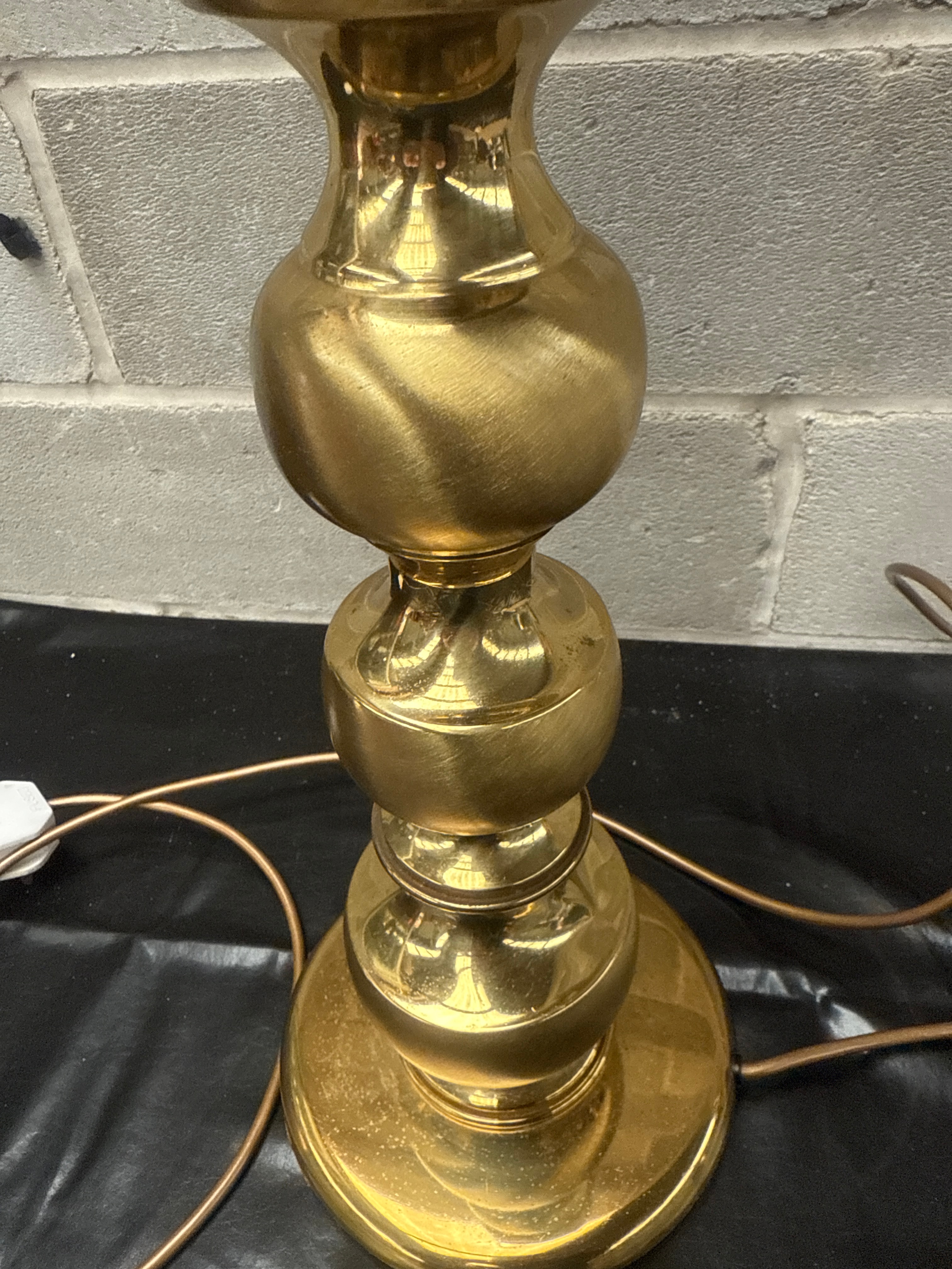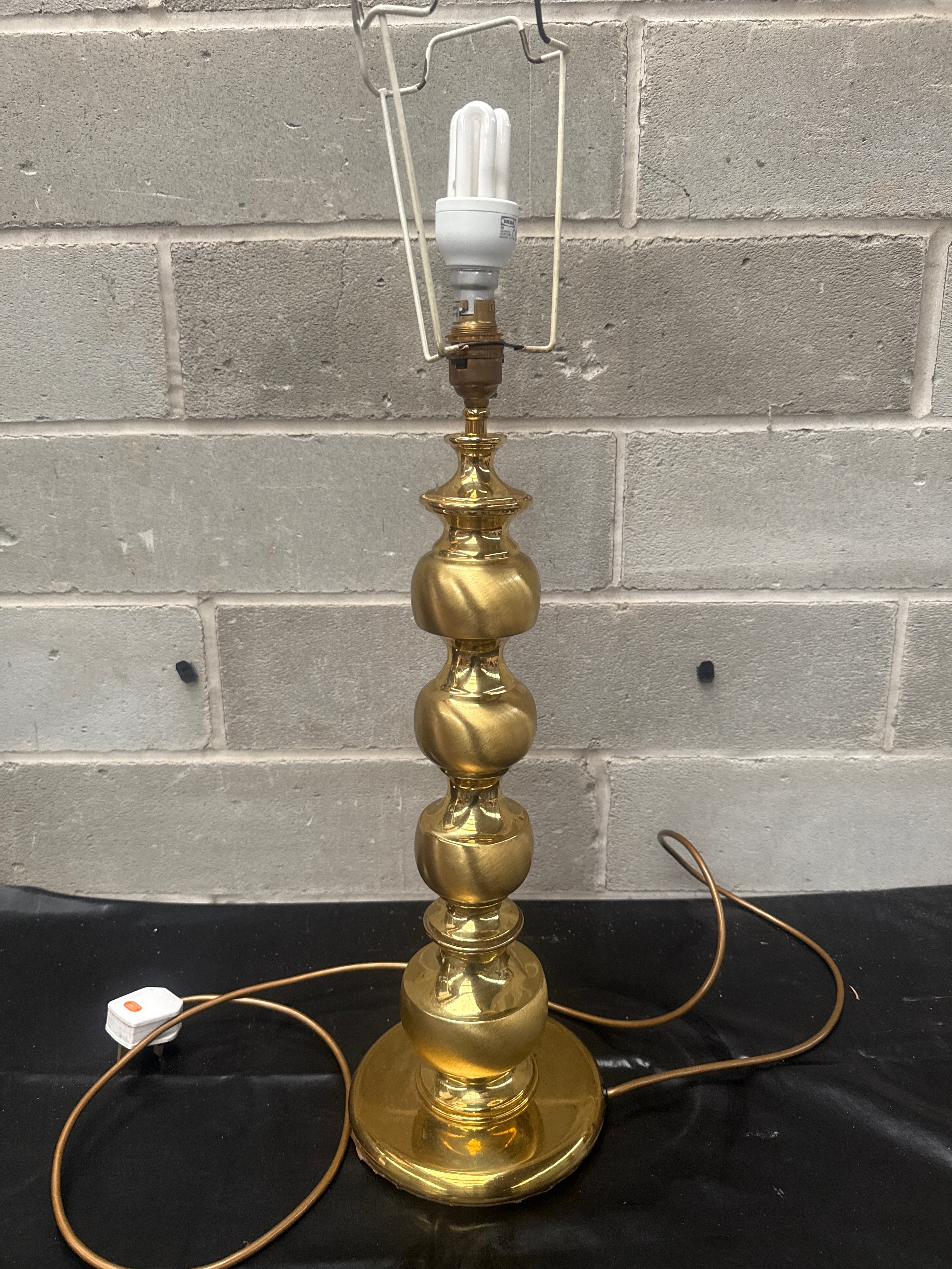 A Mid-Century Hollywood Regency style brass table lamp. The lamp base features a traditional, turned design with a stack of rounded and fluted decorative elements. It is fitted with a white metal harp for a lampshade, a modern compact fluorescent bulb, and an associated brown electrical cord terminating in a white plastic plug. The plug is marked ‘0.2A 250V~’ and bears the ‘CE’ conformity mark.