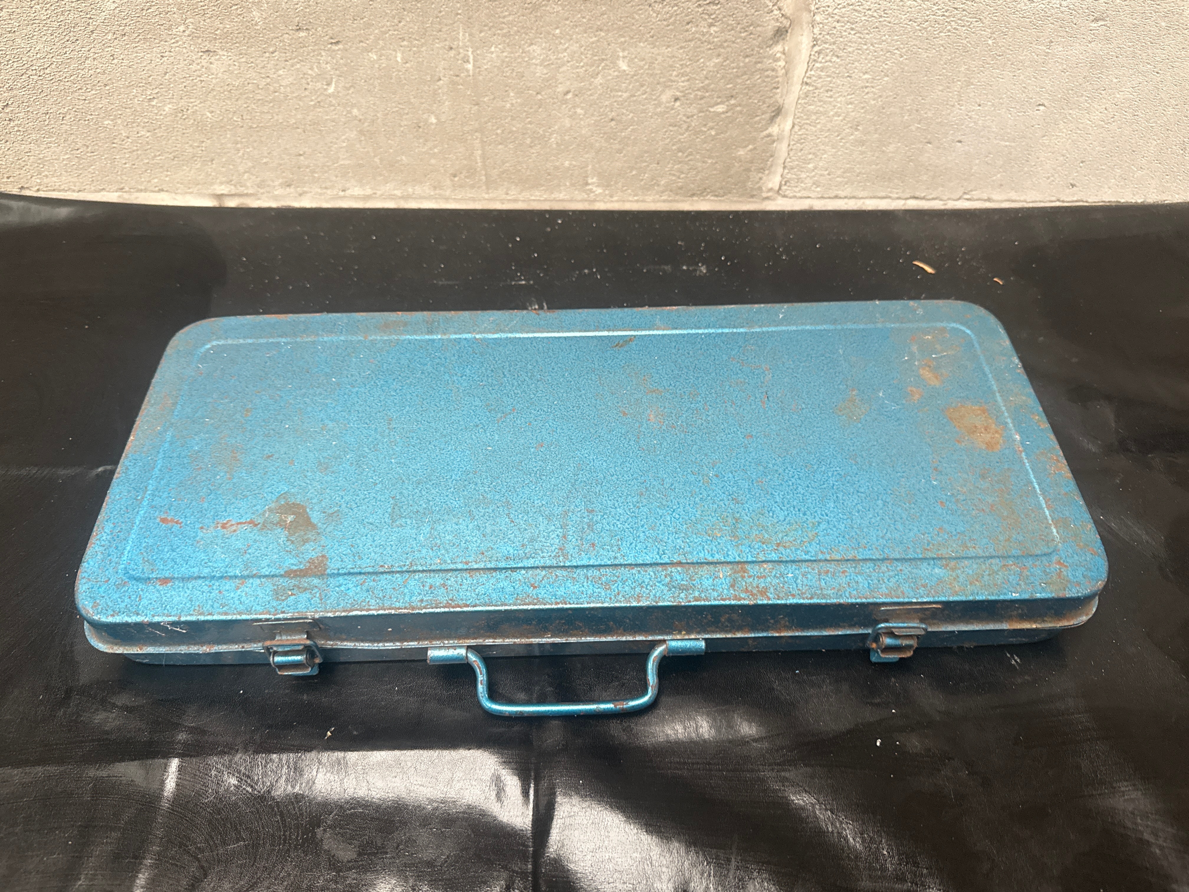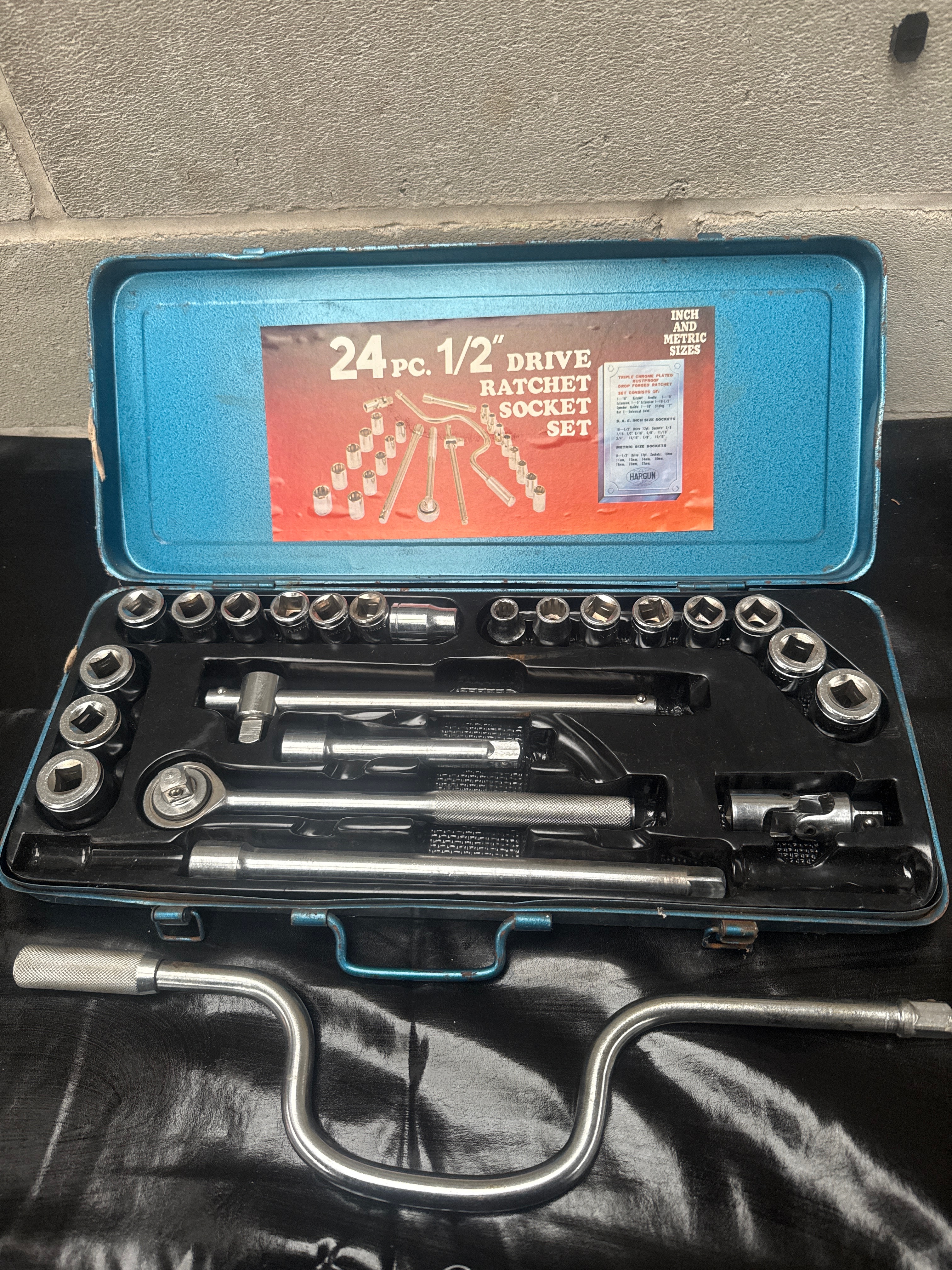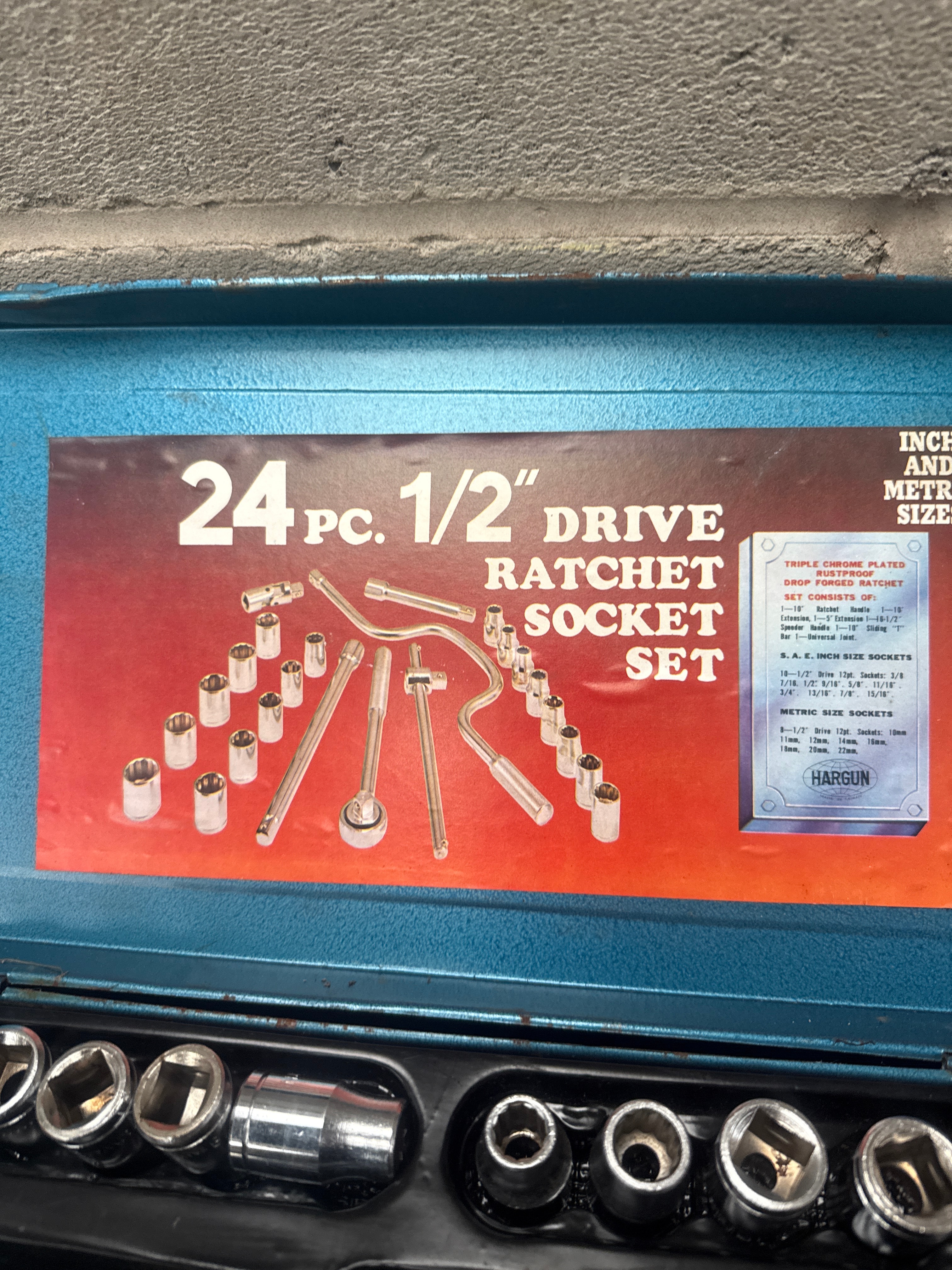 A HARGUN 24-piece 1/2-inch drive ratchet and socket set. The set includes a range of chrome-plated metal tools, including a ratchet, extensions, T-handle, and universal joint, alongside both SAE (inch) and Metric sized 12-point sockets. The tools are specified as ‘TRIPLE CHROME PLATED DROP FORGED’. Presented in its original blue painted metal case, the tools are neatly organized within a molded plastic tray. Two additional chrome-plated metal tool handles, possibly a speeder bar and another extension, are visible outside the opened case. The set appears to be from the mid-to-late 20th century.