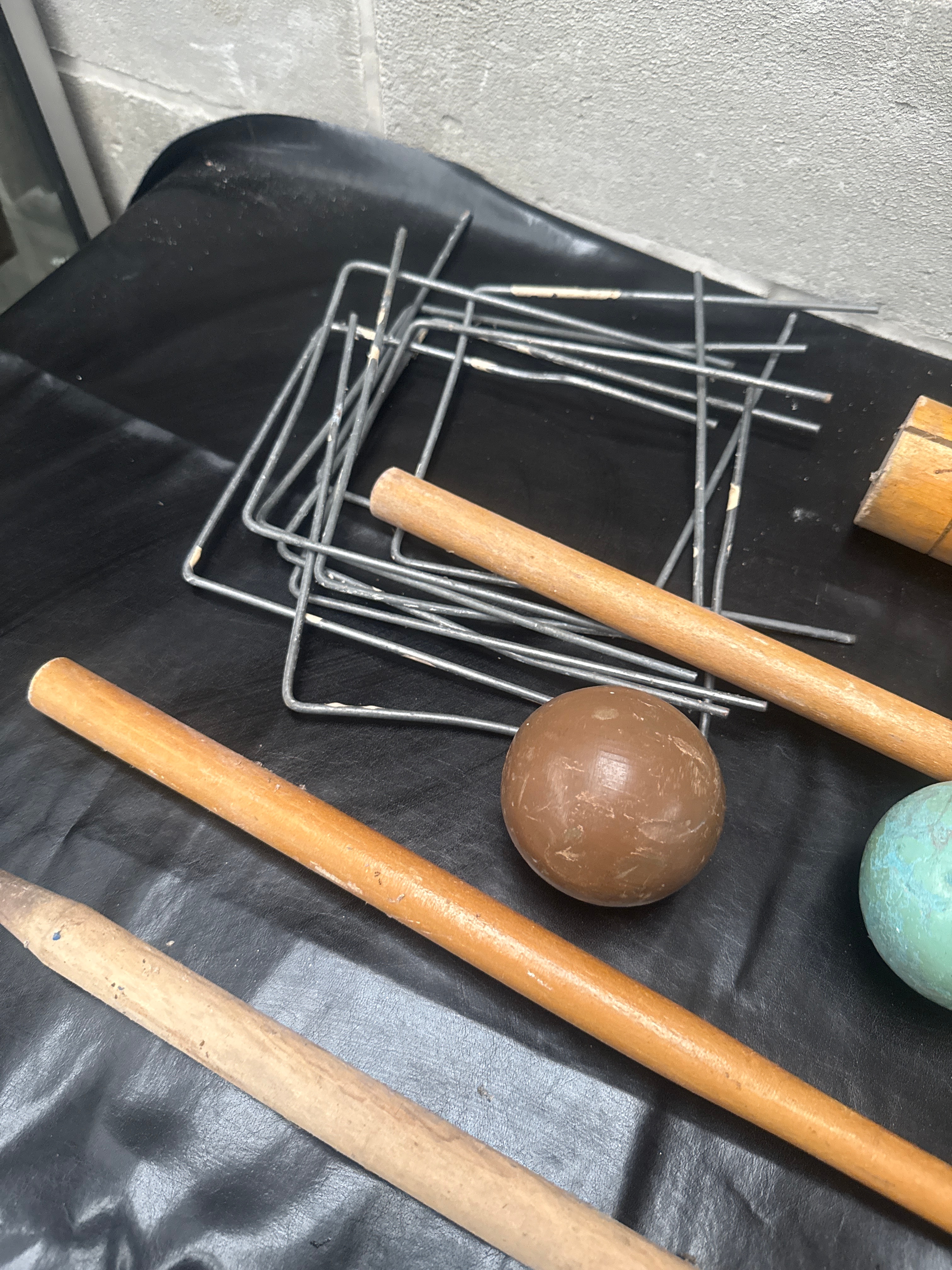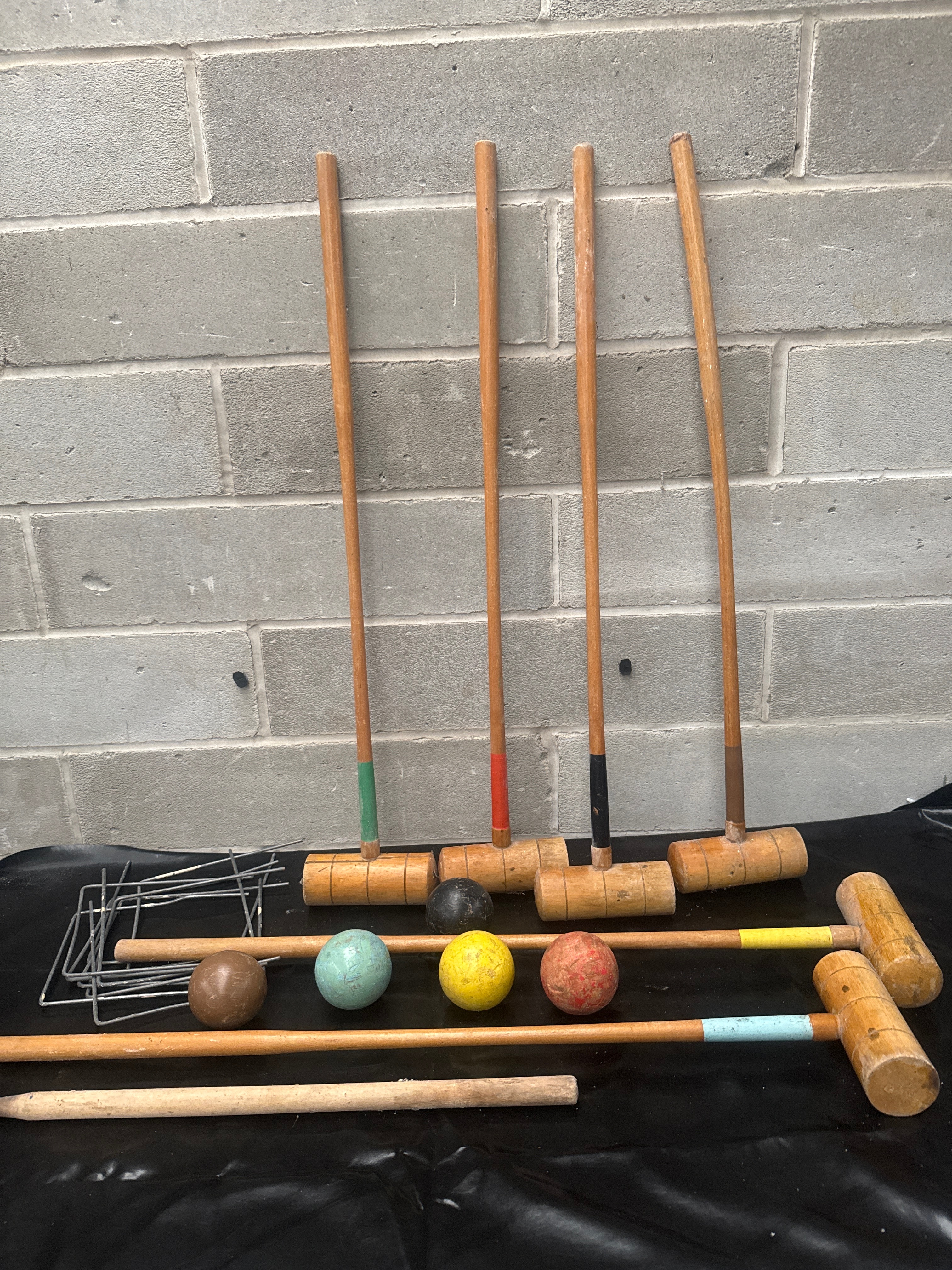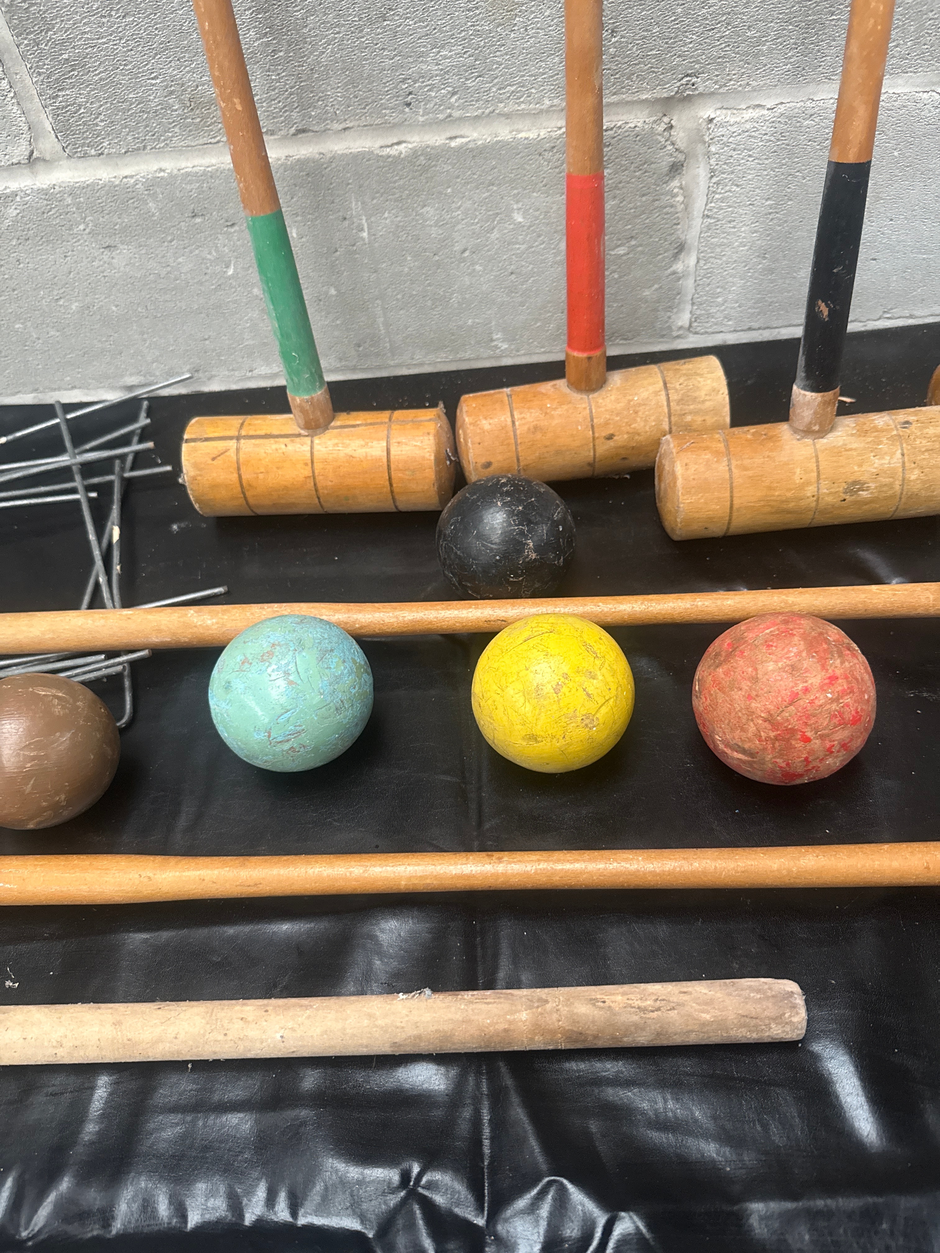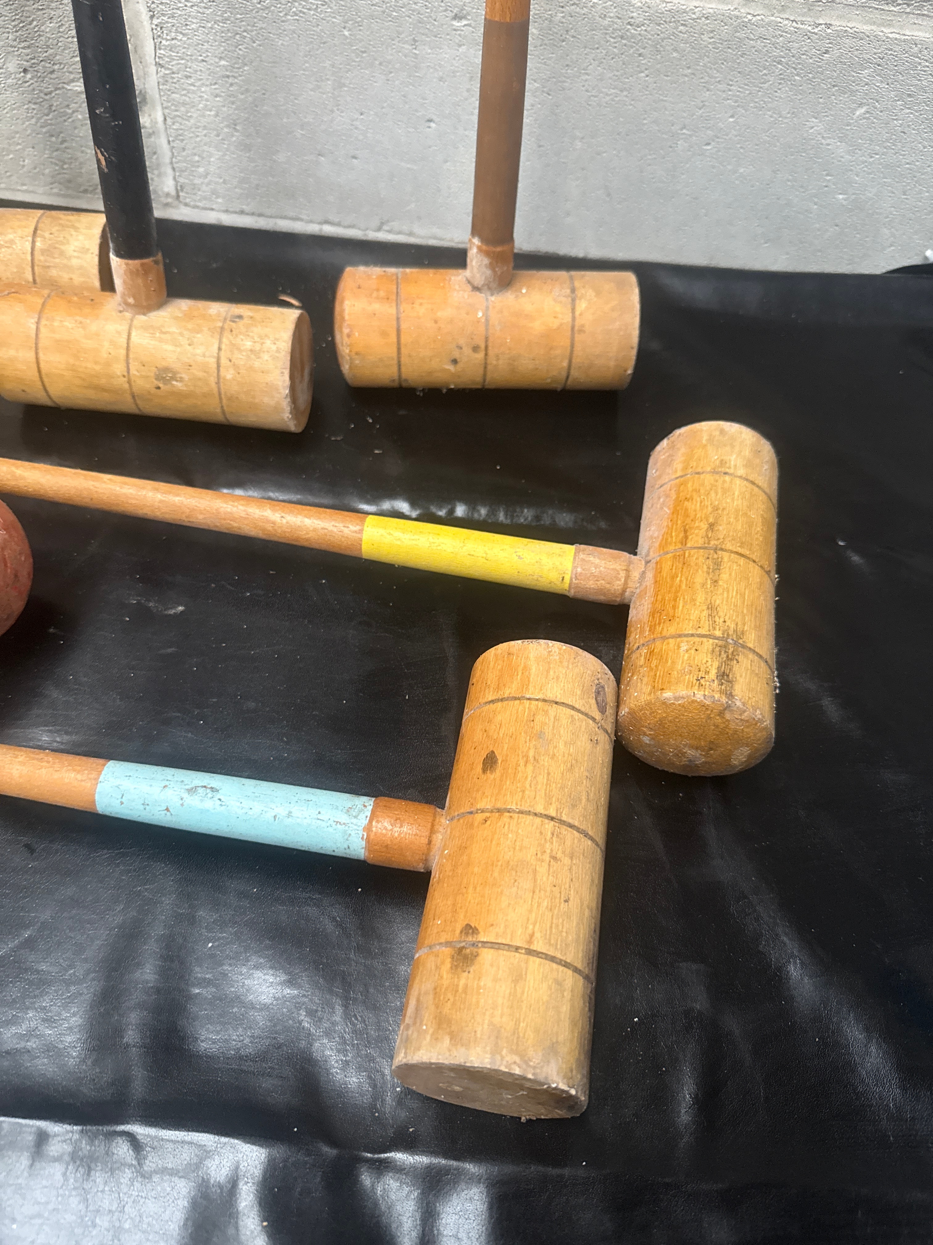 A traditional croquet set, primarily constructed from wood and metal. The set comprises six wooden mallets with cylindrical heads and shafts featuring colored bands (green, red, black, unpainted, yellow, light blue), five wooden balls in black, light blue, yellow, reddish-brown, and dark brown, a collection of U-shaped metal wickets, and two additional wooden stakes.