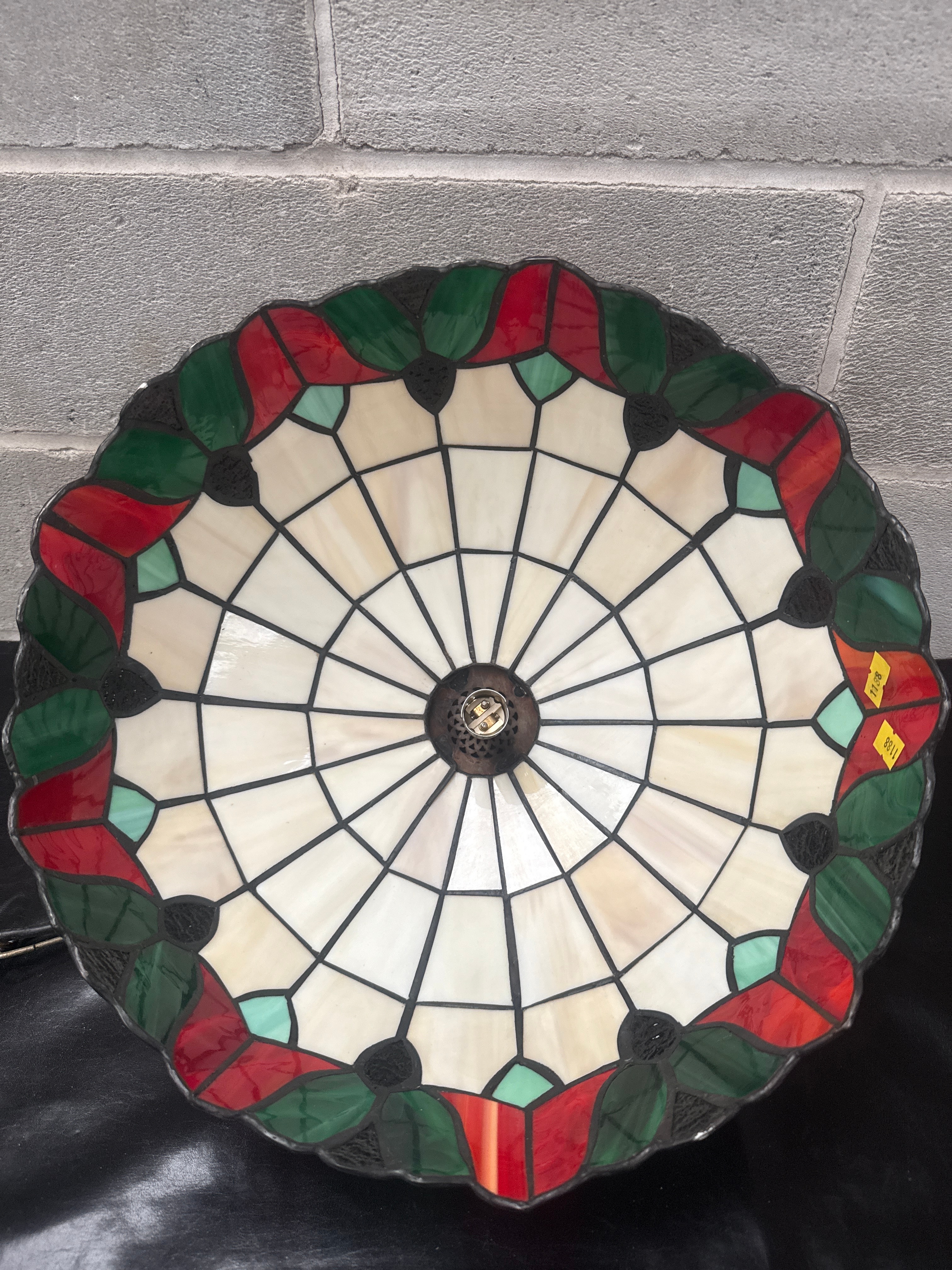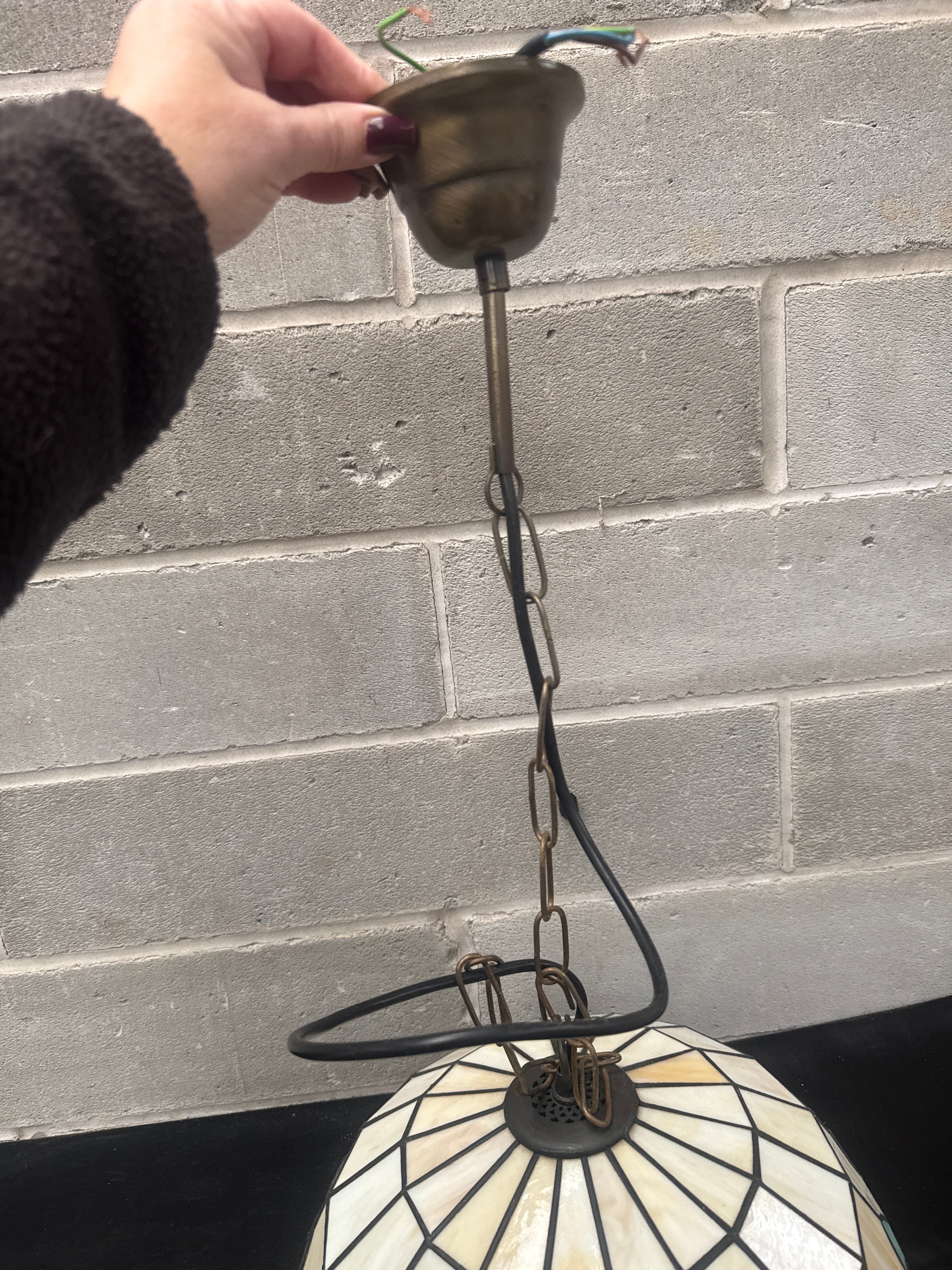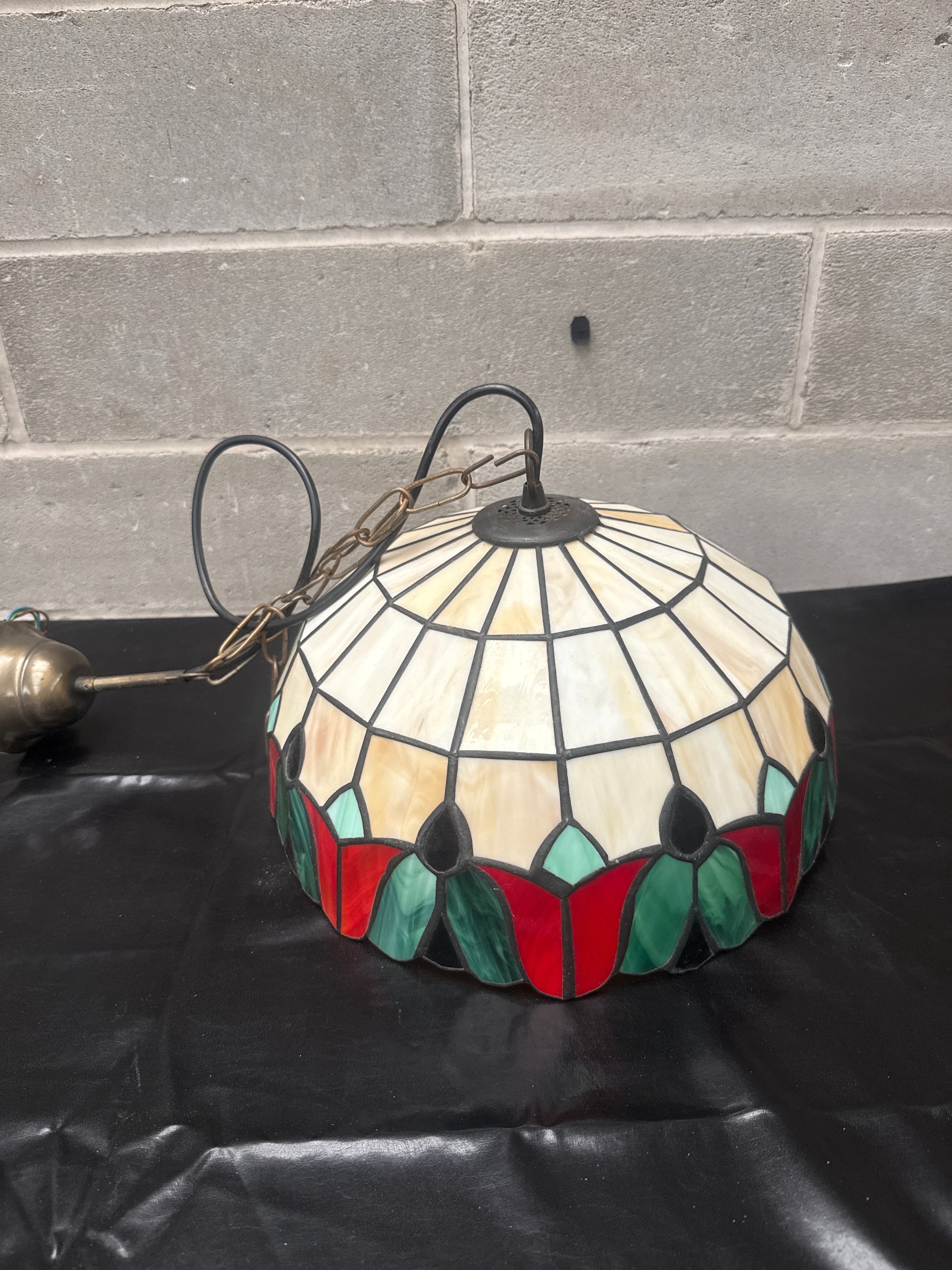 A Tiffany style pendant light fixture, featuring a domed stained glass shade with a radial pattern of off-white opalescent glass panels. The shade is bordered by a decorative band of red, green, and light blue glass pieces. The individual glass panels are joined by visible lead or copper foil lines. The fixture includes brass-toned metal hardware comprising a ceiling canopy, a hanging chain, and a stem, with a black electrical cord featuring exposed wiring at the top.