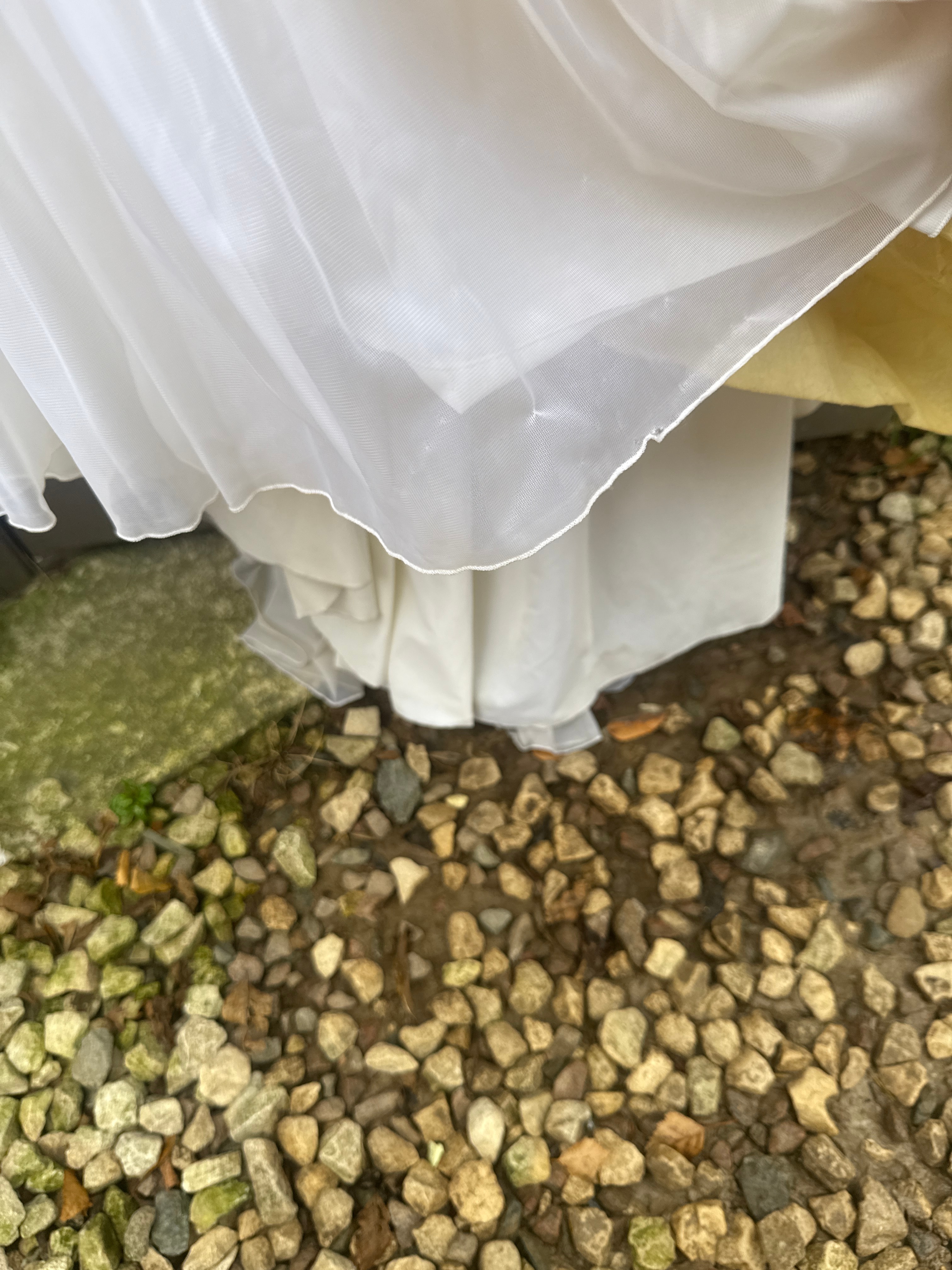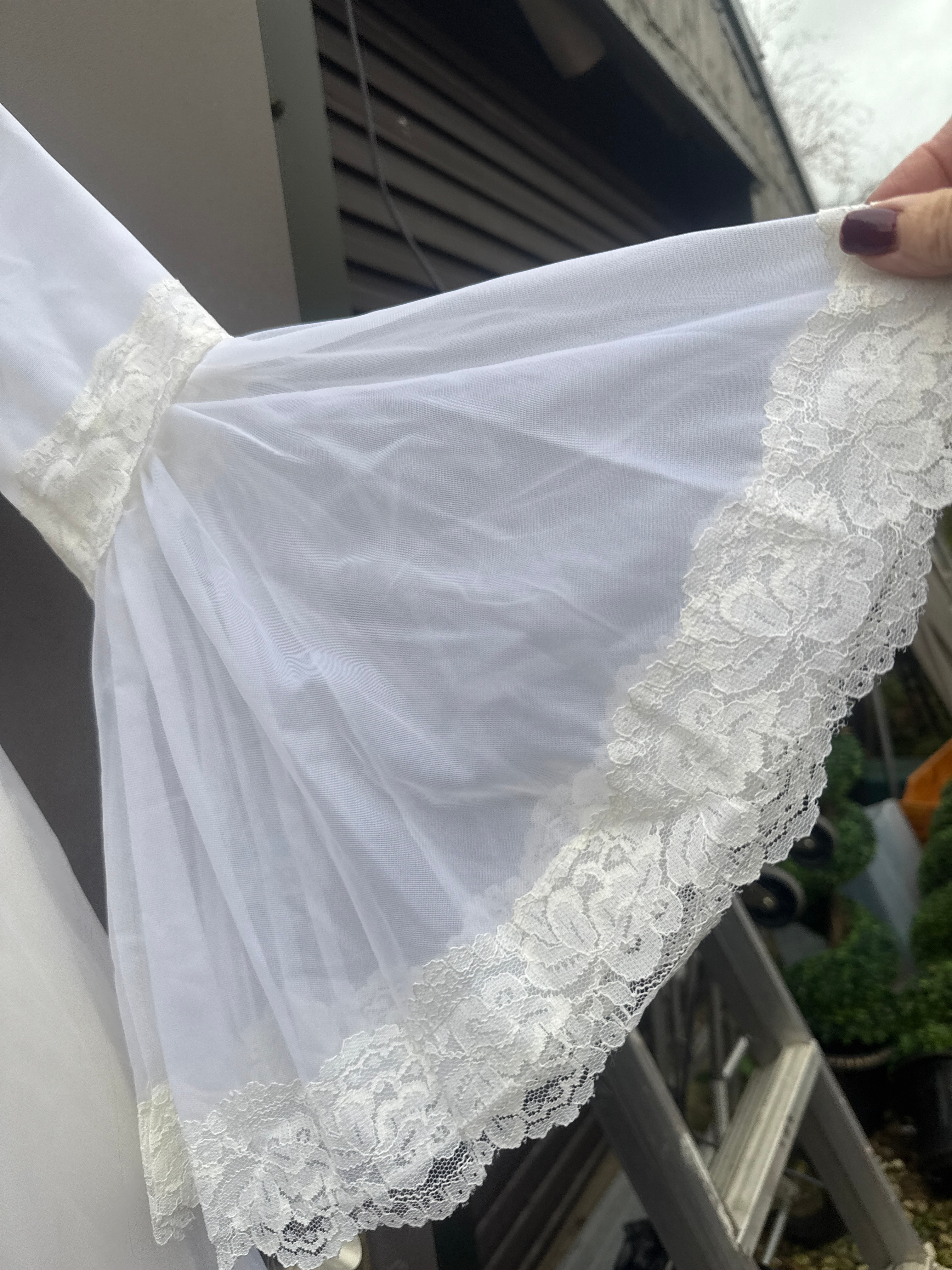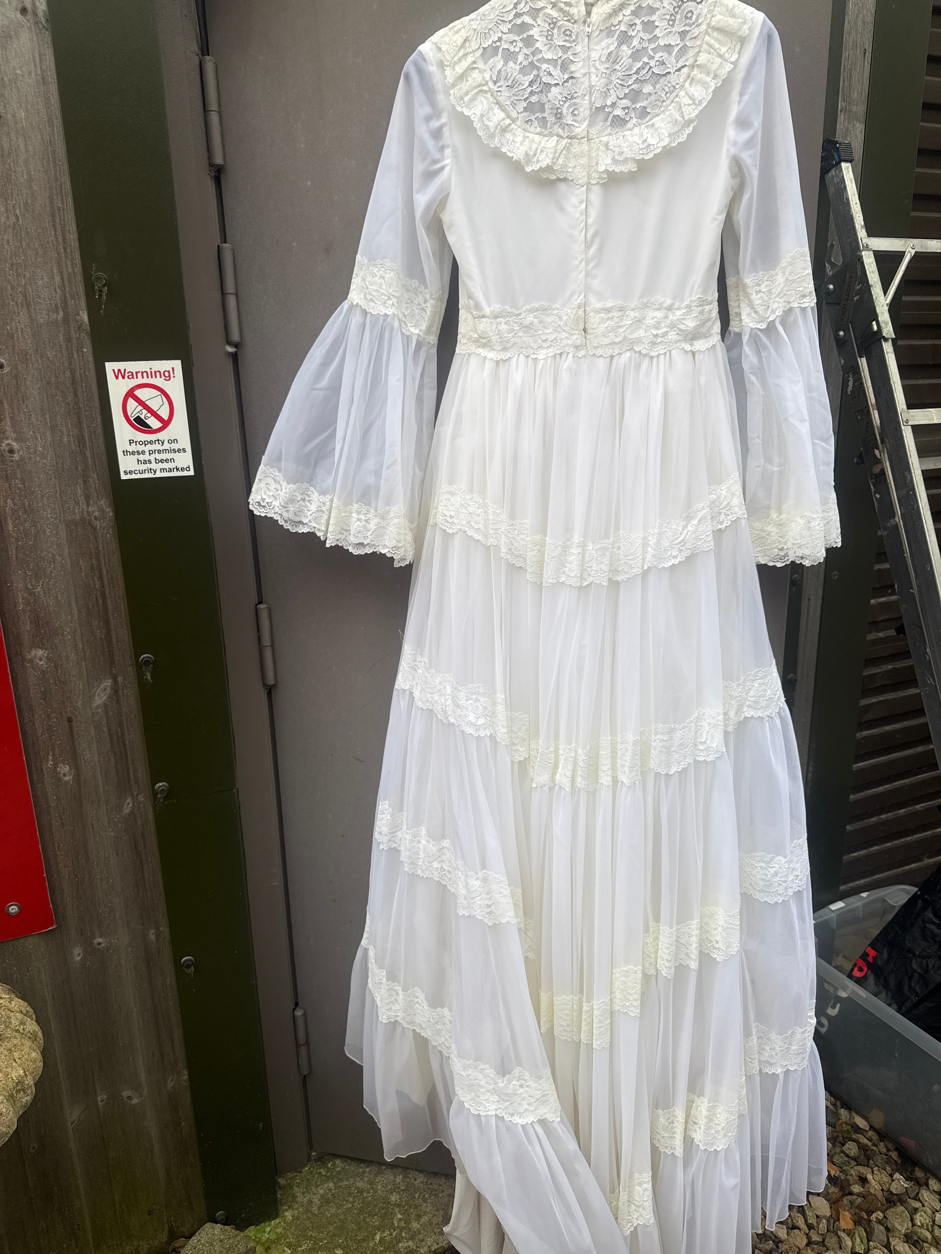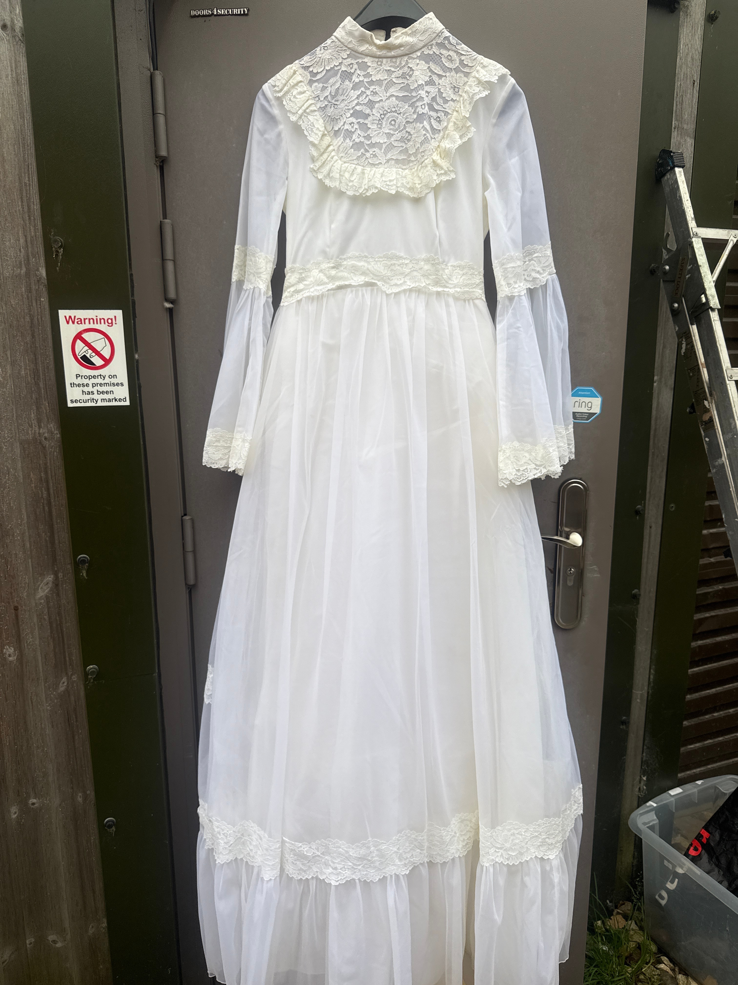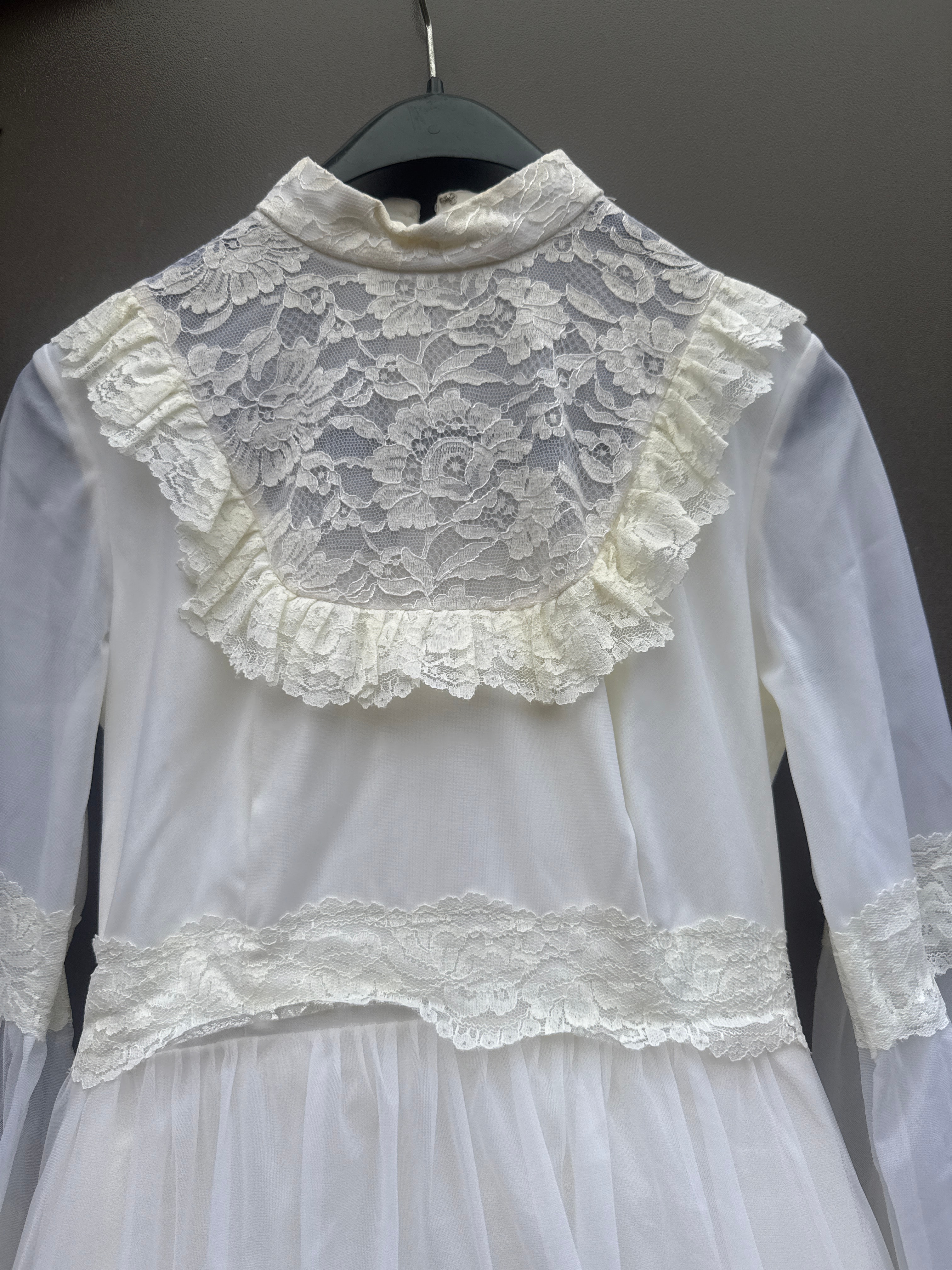 A full-length white dress, exhibiting a vintage aesthetic characteristic of the late 1960s or 1970s, with Victorian-era stylistic influences. Constructed from a lightweight, semi-sheer synthetic fabric, it features a high mock-neck collar and a lace overlay on the upper bodice with a ruffled trim. The dress has long, sheer bell sleeves finished with tiered lace cuffs. A horizontal lace band defines the waistline, leading to a full, tiered skirt, with each tier also adorned with lace banding. A zipper closure is visible at the back.