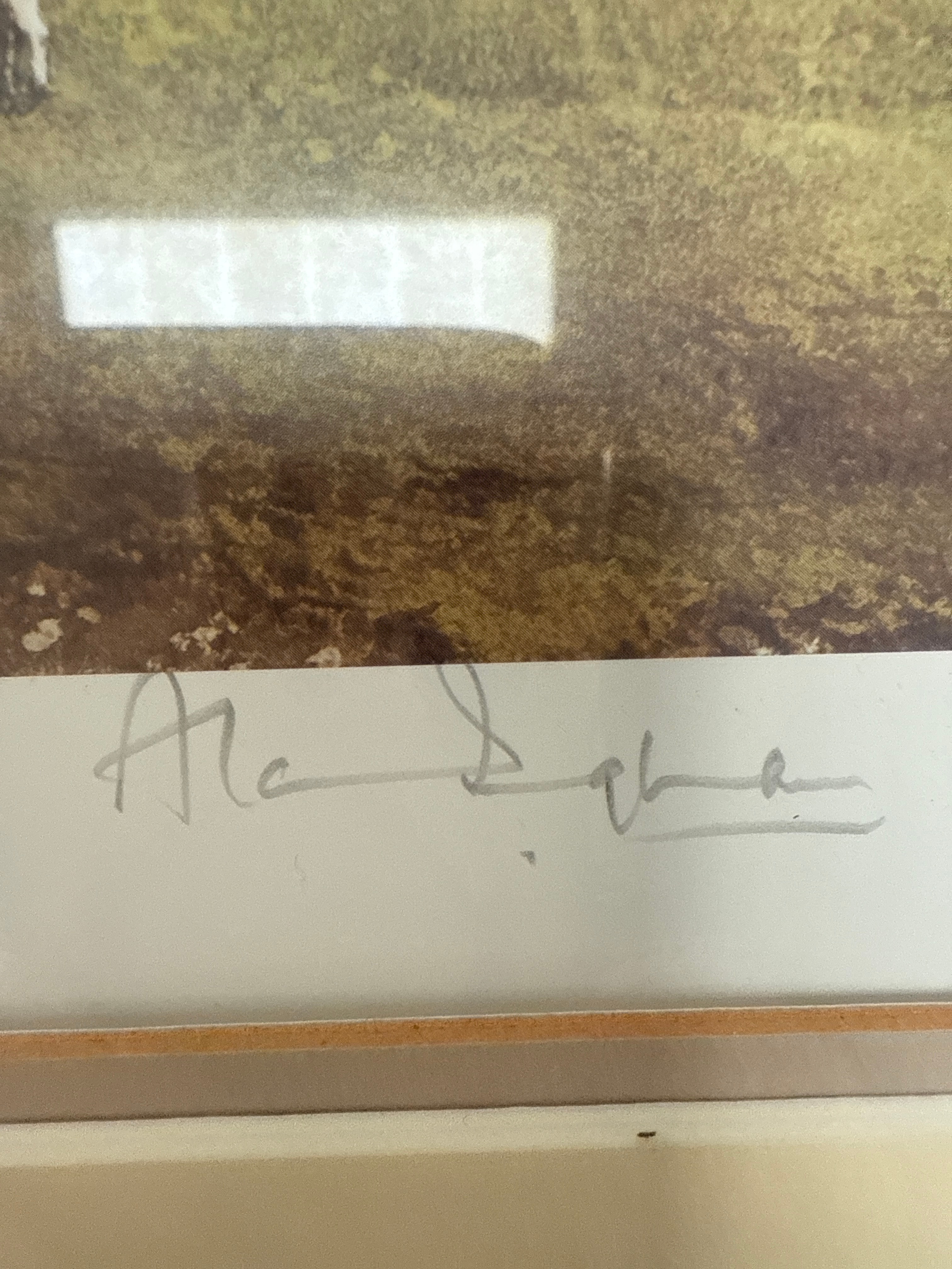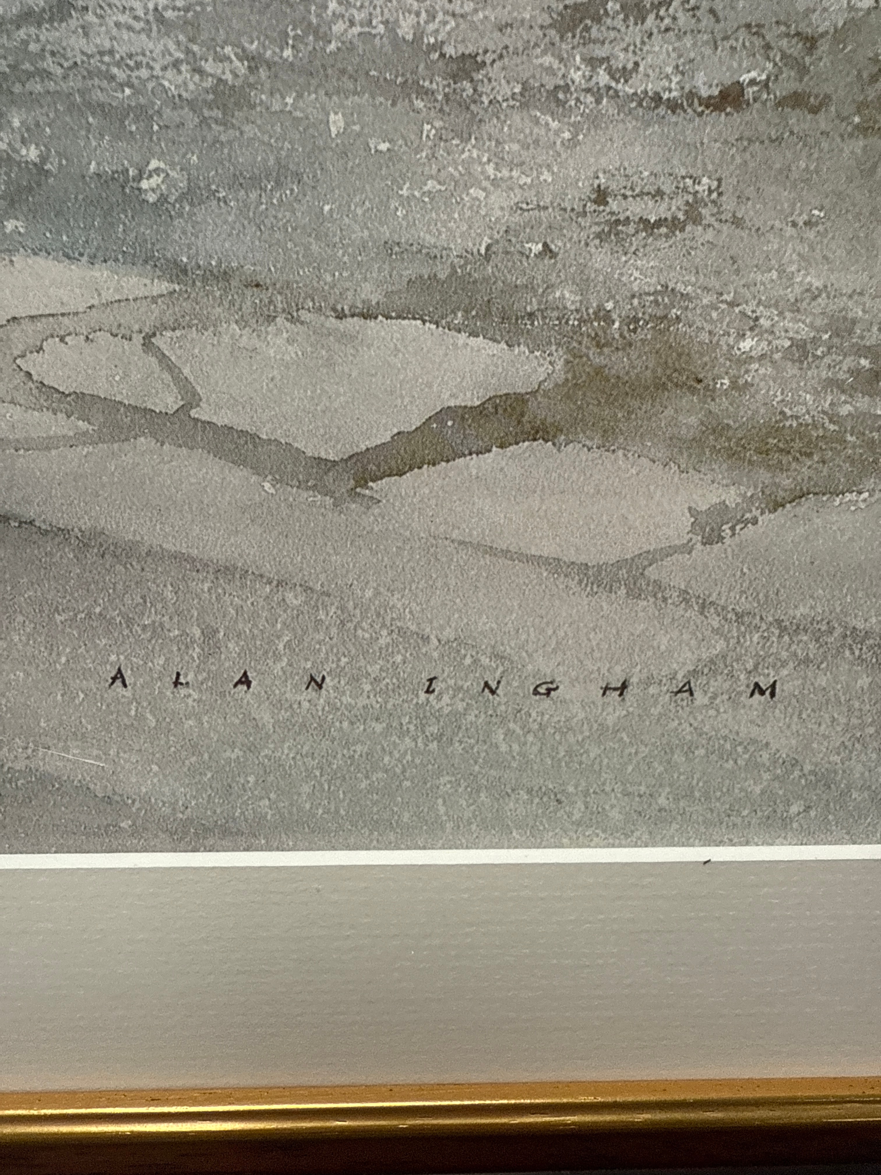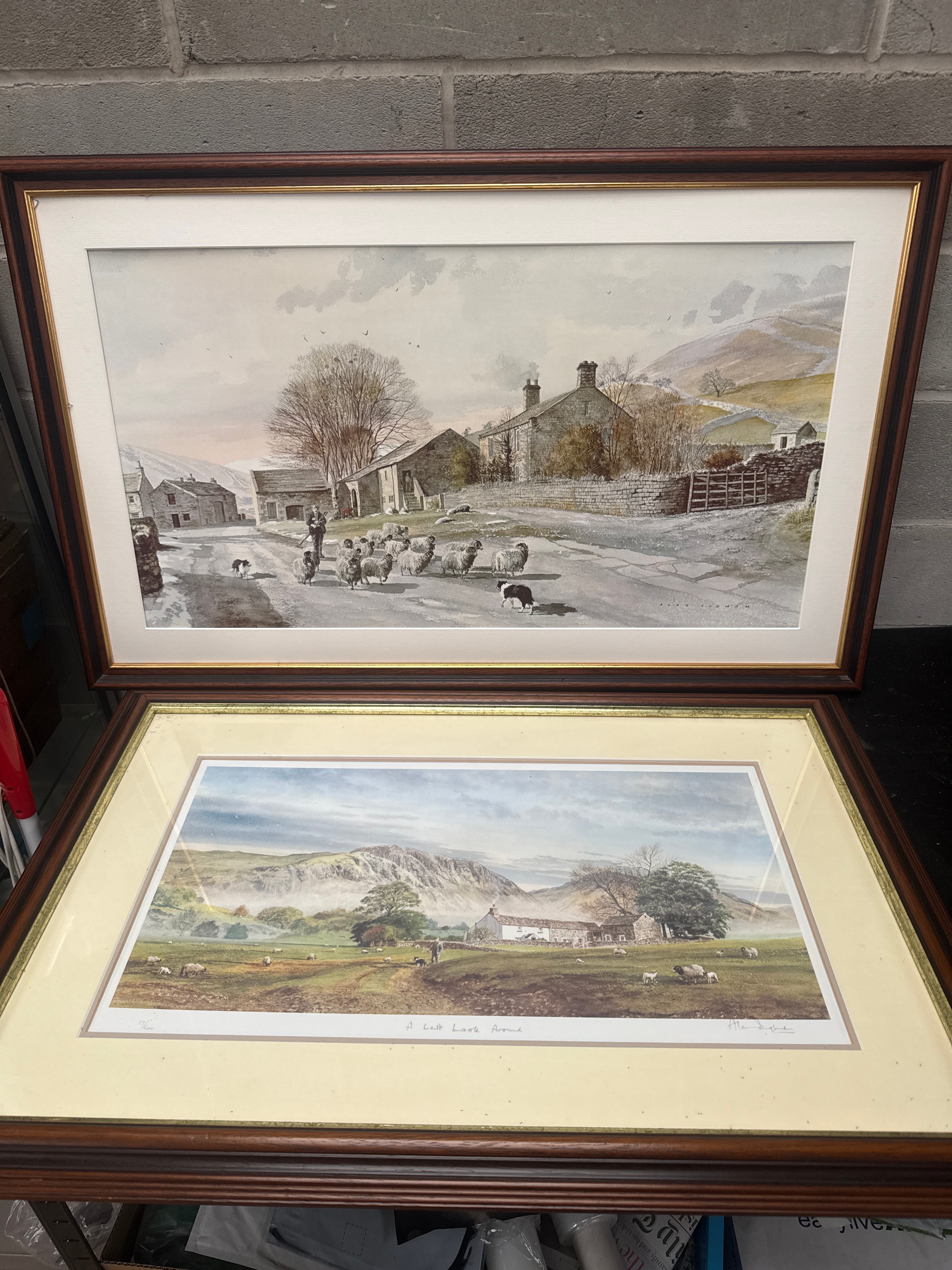 A pair of limited edition prints by Alan Ingham, titled ‘Rounding Up the Strays’ and ‘Gone Fishing’, reproductions of watercolor landscape paintings depicting traditional rural scenes. The upper print, ‘Rounding Up the Strays’, portrays a village road with stone buildings, a lone figure, and a flock of sheep and dogs, set against a mountainous background. The lower print, ‘Gone Fishing’, features a panoramic valley view with a cottage, scattered sheep, and rolling hills partially obscured by mist. Both artworks are presented under glass, matted, and housed in wooden frames; the top with a dark wood frame, and the bottom with a lighter wood frame accented with gold. The lower print is clearly marked with the artist’s name “ALAN INGHAM” in the lower right margin and bears a handwritten signature to the left. It is also numbered “57/250,” indicating it is the 57th print from a limited edition of 250 copies, and includes a partially illegible title below the image.