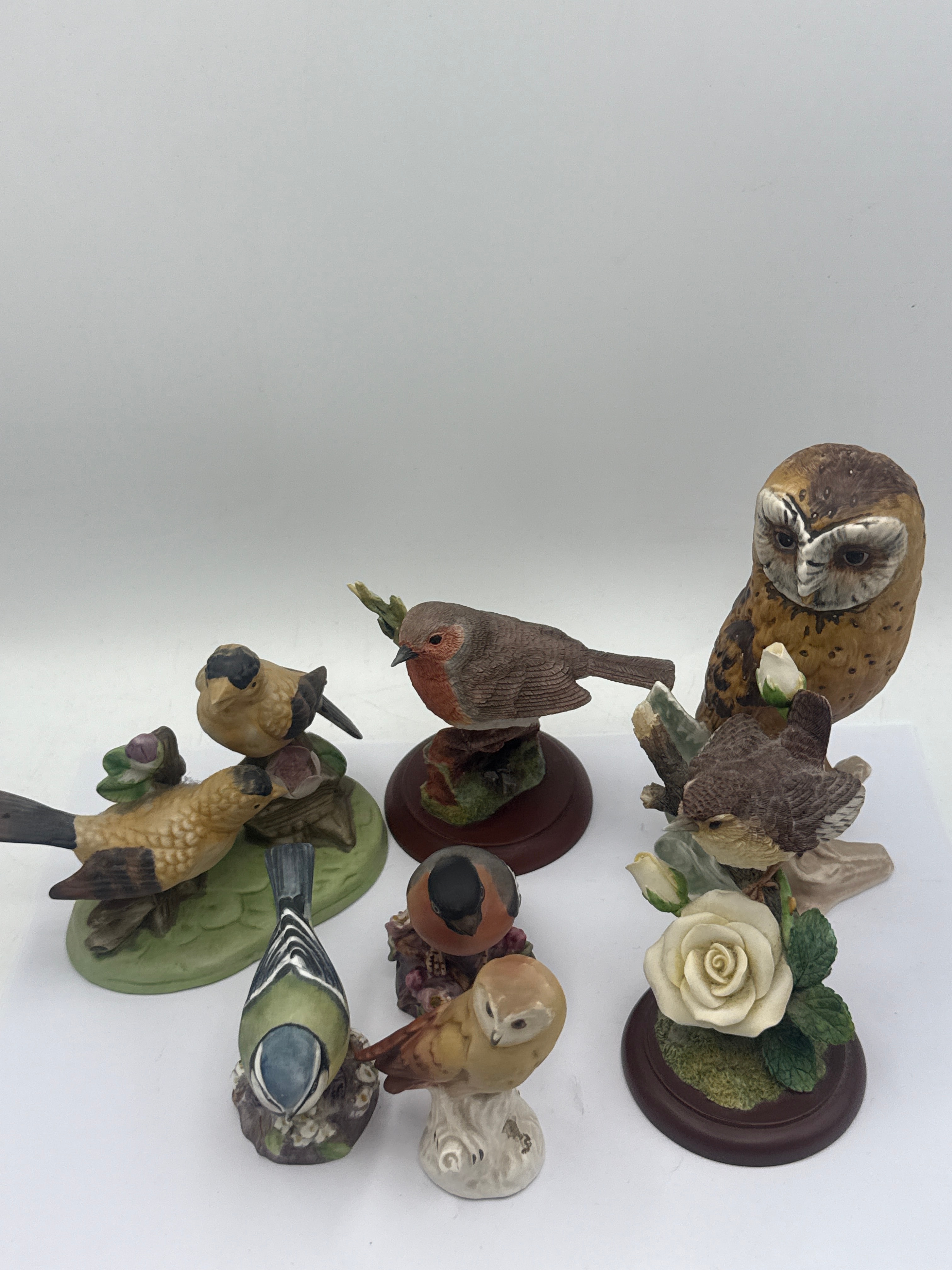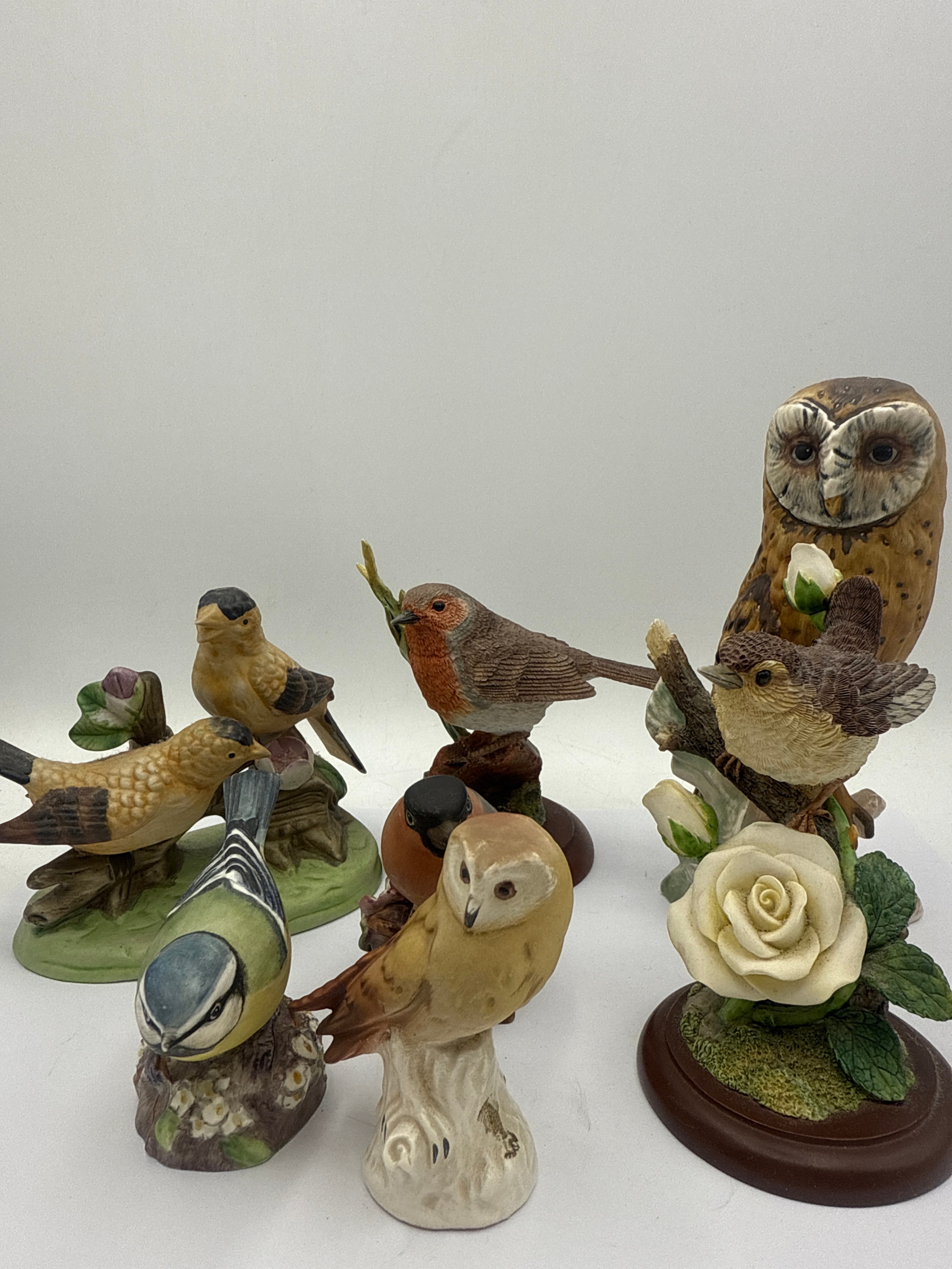 A collection of approximately ten glazed porcelain or ceramic bird figurines, rendered in a realistic, decorative style, likely by Border Fine Arts and Country Artists. The group includes various species such as a large tawny owl, a robin, a blue tit, several goldfinch-like birds, and other smaller brown birds, along with a creamy owlet. Many are depicted perched on naturalistic elements like branches, foliage, or moss-textured bases, some featuring white rose accents. Bases vary from naturalistic green forms to smooth dark brown circular plinths, and one small white ceramic base. The figurines are hand-painted in naturalistic colors. No manufacturer’s marks or text are discernible from these images.
