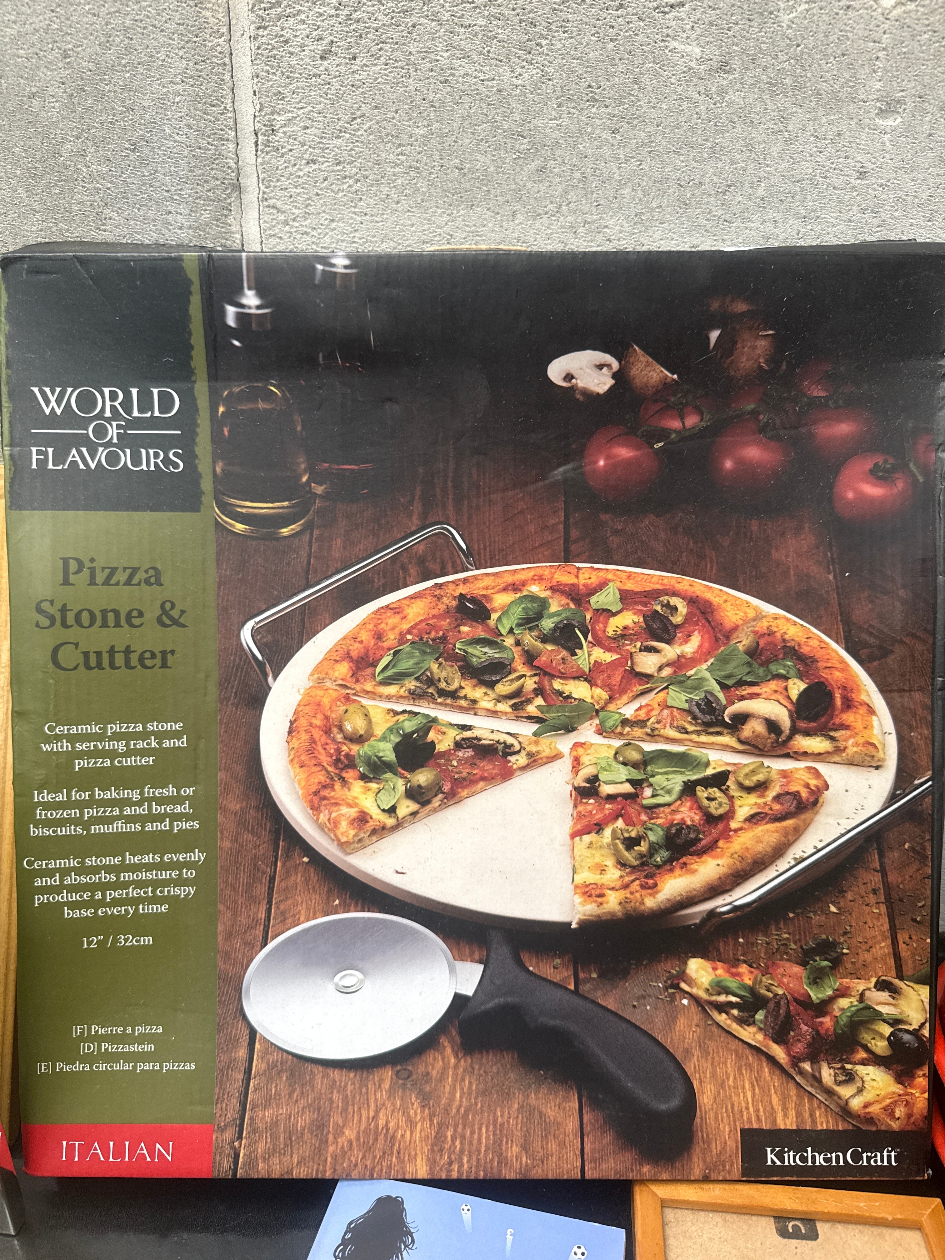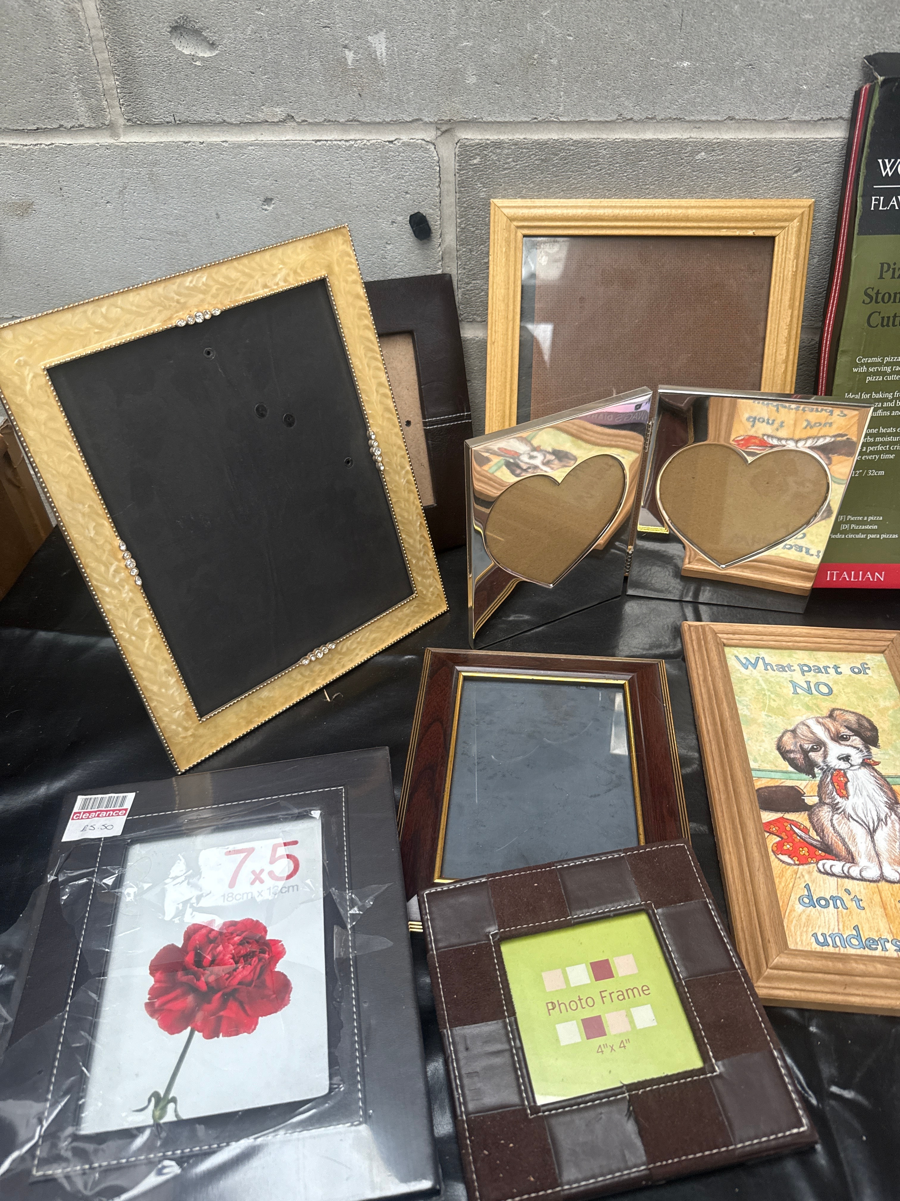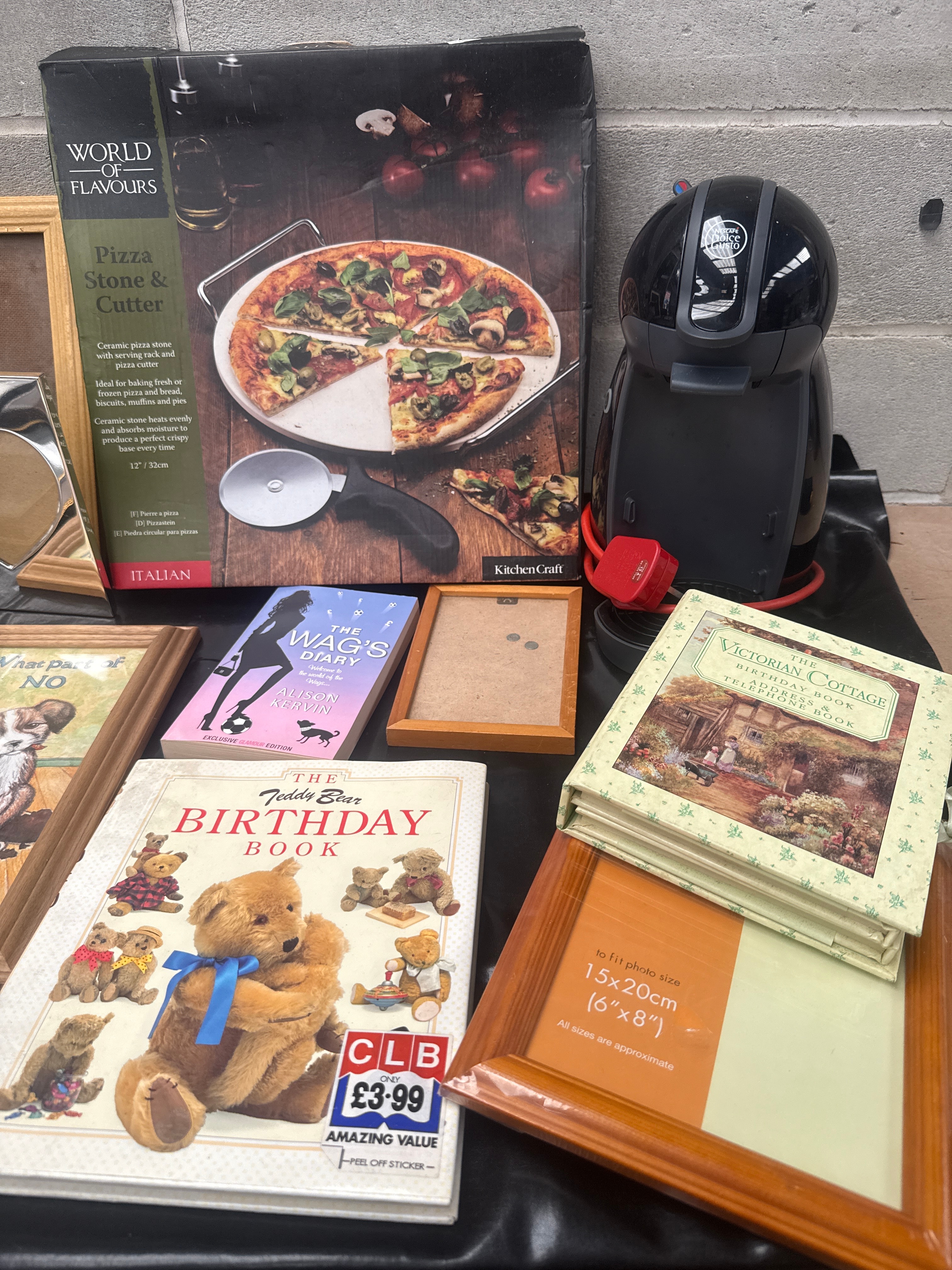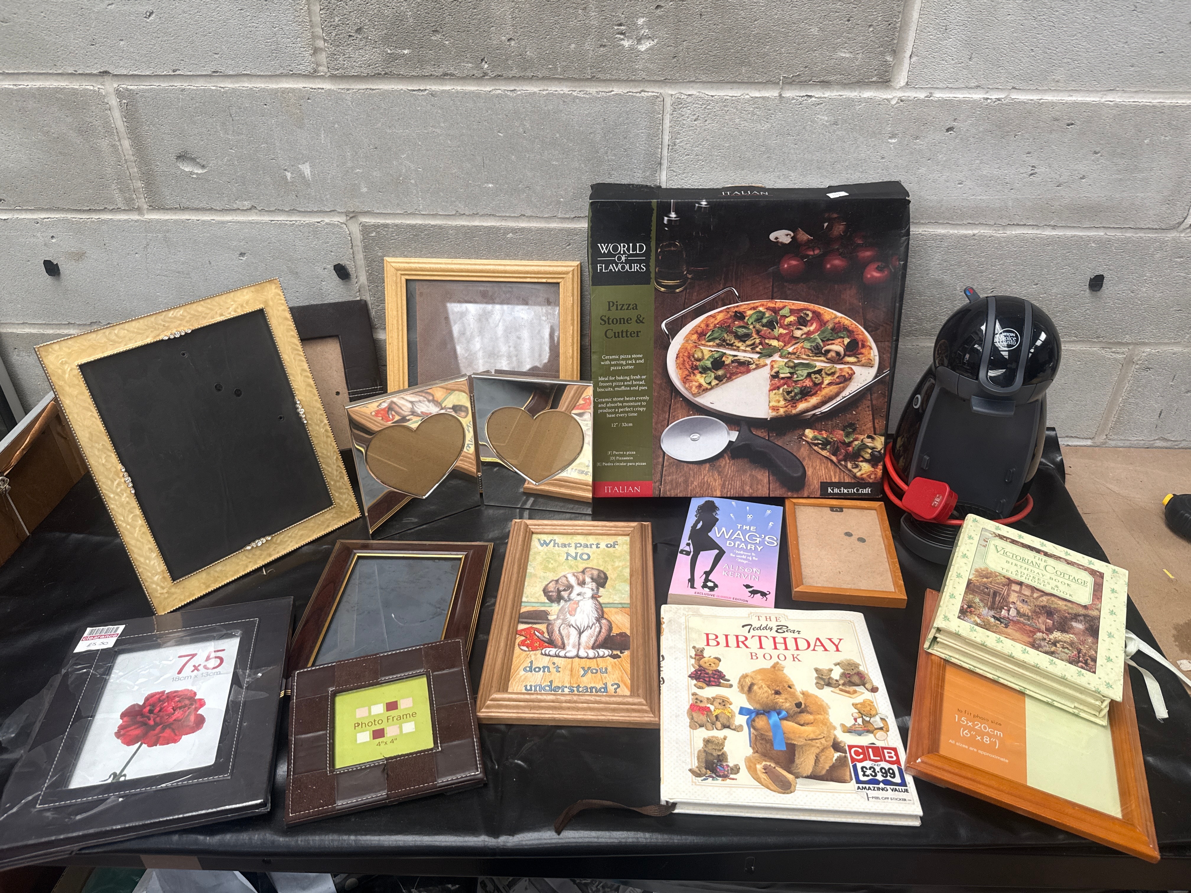 A KitchenCraft ‘World of Flavours’ pizza stone and cutter set, new in its original box. The box features multilingual text including “Pierre à pizza” (French), “Pizzastein” (German), and “Piedra circular para pizzas” (Spanish), indicating a 12″/32cm size. Accompanied by a diverse collection of modern picture frames in various sizes and materials, including ornate gold-colored, two mirrored heart-shaped, wooden, and black plastic designs. Several frames appear new in original packaging with visible size markings such as ‘7×5’, ‘4×4′, and ’15x20cm’, and some retain price stickers. Also included are a black, sleek coffee machine, and a group of books comprising ‘The Teddy Bear Birthday Book’, ‘The VAG’S DIARY’, and three copies of ‘Victorian Cottage Tea Room Book’.