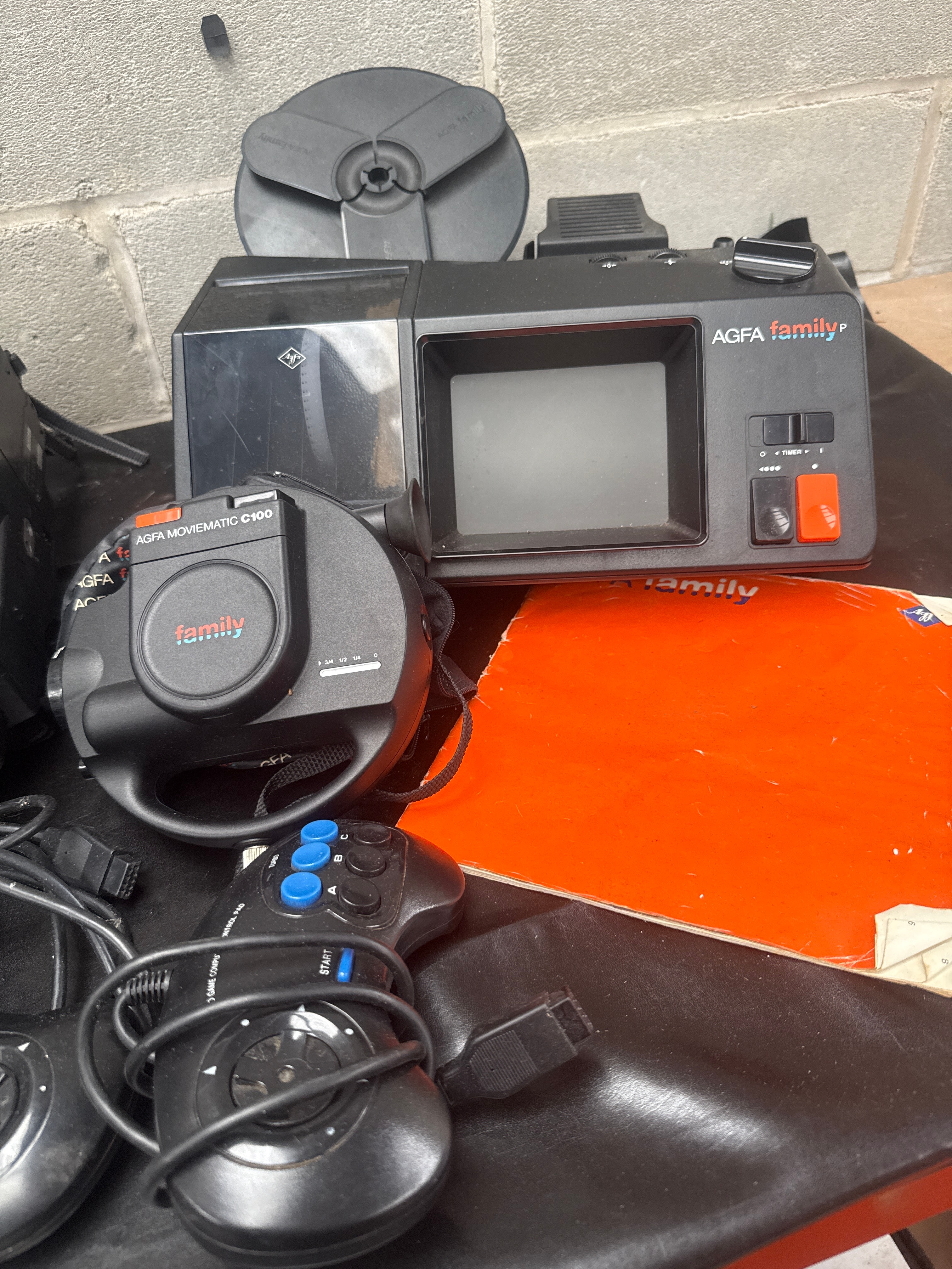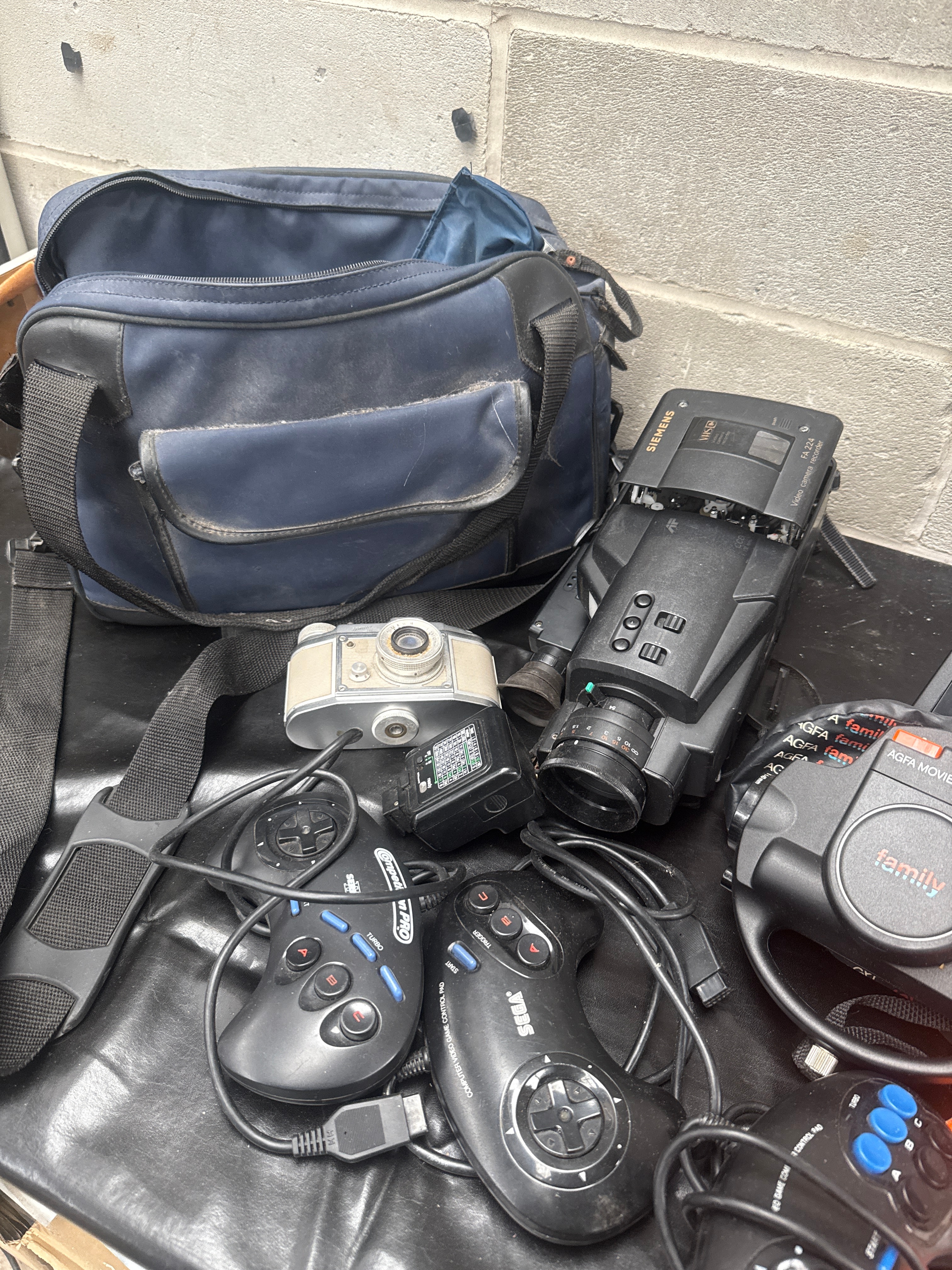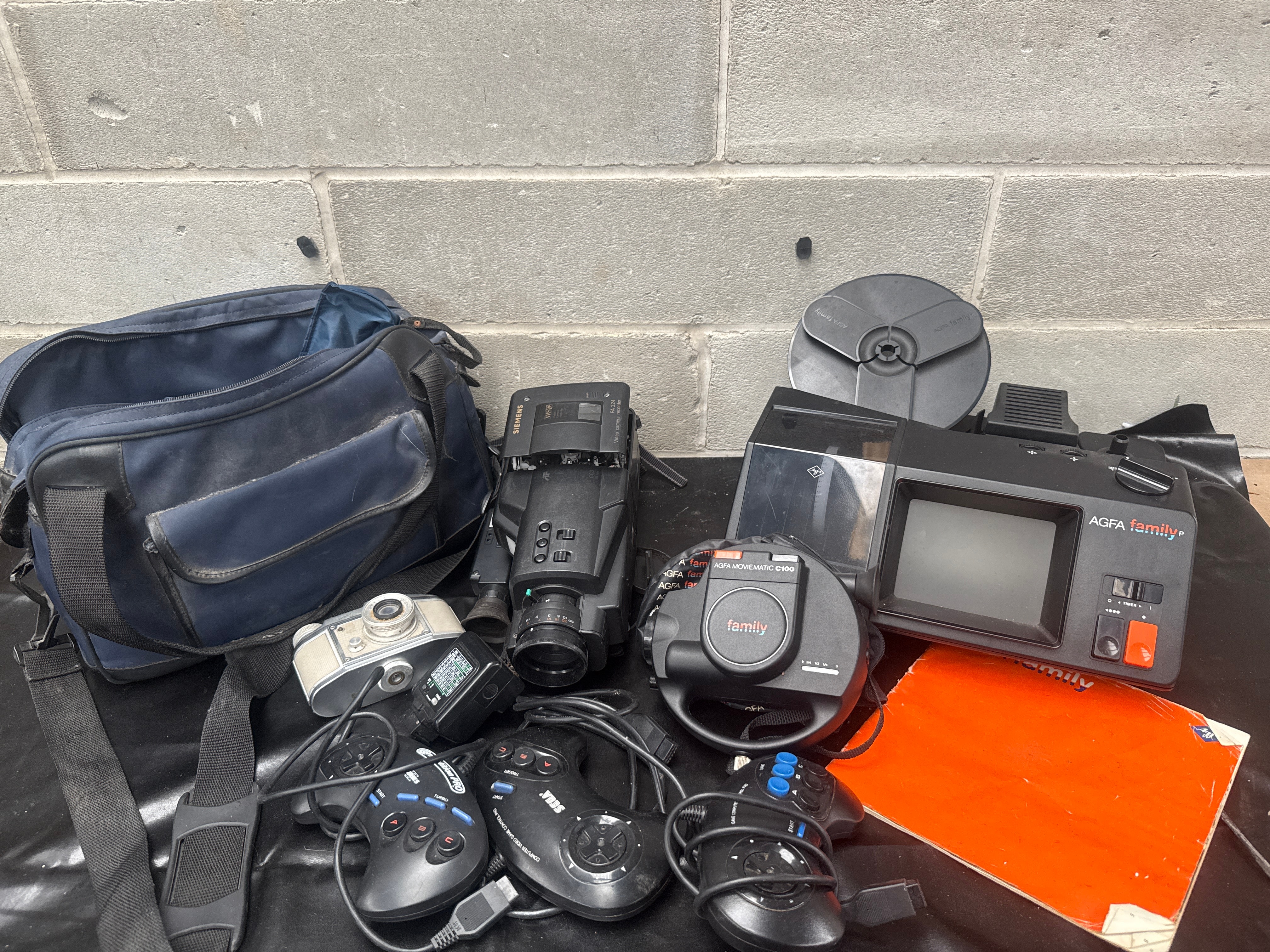 This group of vintage consumer electronics is centered around an AGFA ‘family’ home video system. The AGFA system includes an ‘AGFA family P’ integrated monitor/VCR unit, an ‘AGFA MOVIEMATIC C100’ camcorder, and an AGFA branded film reel or cassette. An orange manual or folder bearing the ‘family’ logo is also present. Complementing these are a Siemens black plastic camcorder, a chrome and leatherette Minolta rangefinder camera from an earlier period, and a well-worn blue fabric shoulder bag. The lot also includes multiple wired black plastic controllers, notably two explicitly marked ‘SEGA Mega Drive’ and ‘SEGA Game Controller’. The items are primarily constructed from black plastic and date from the late 1980s to early 1990s, with the Minolta camera being of an earlier vintage.