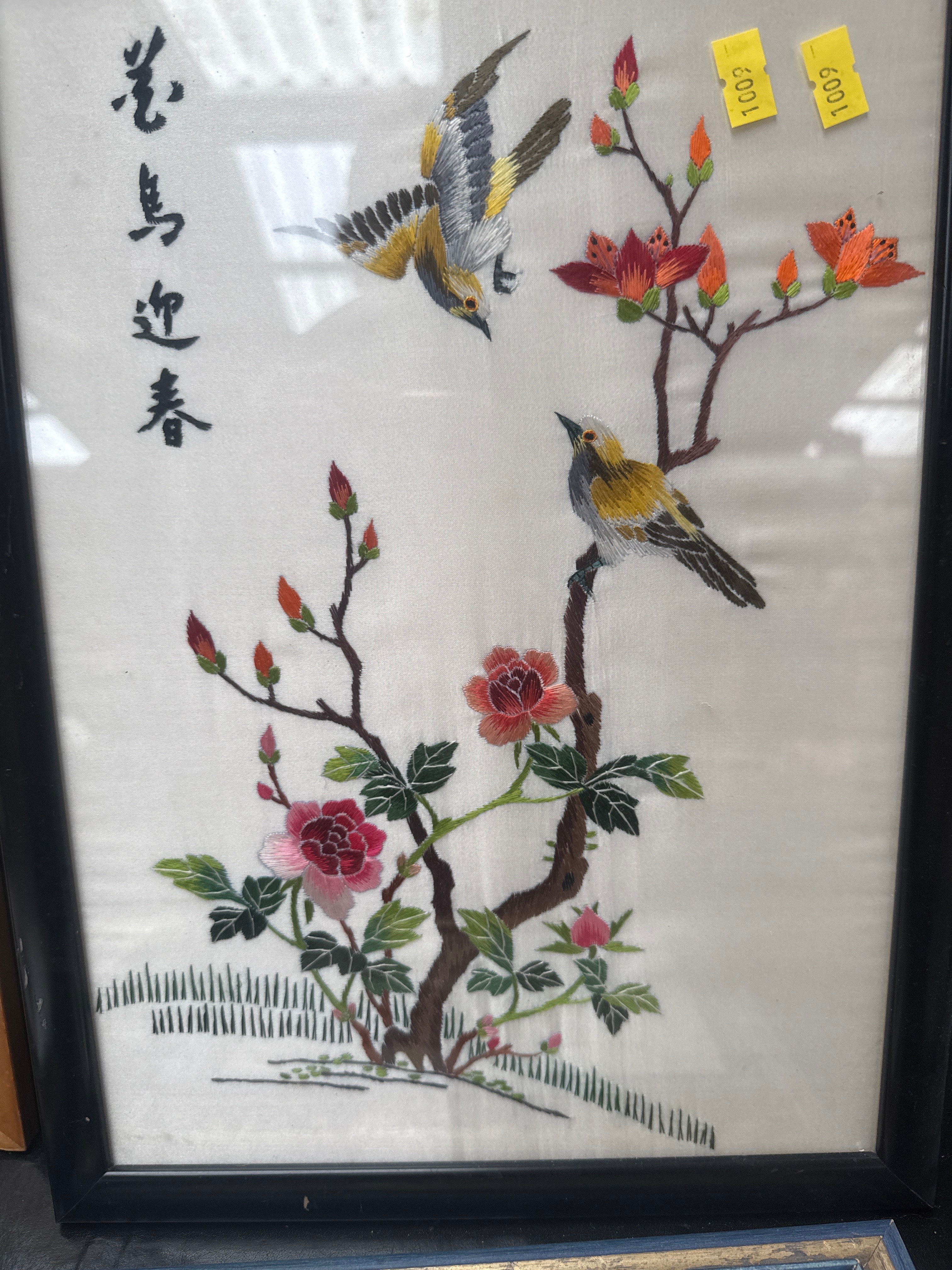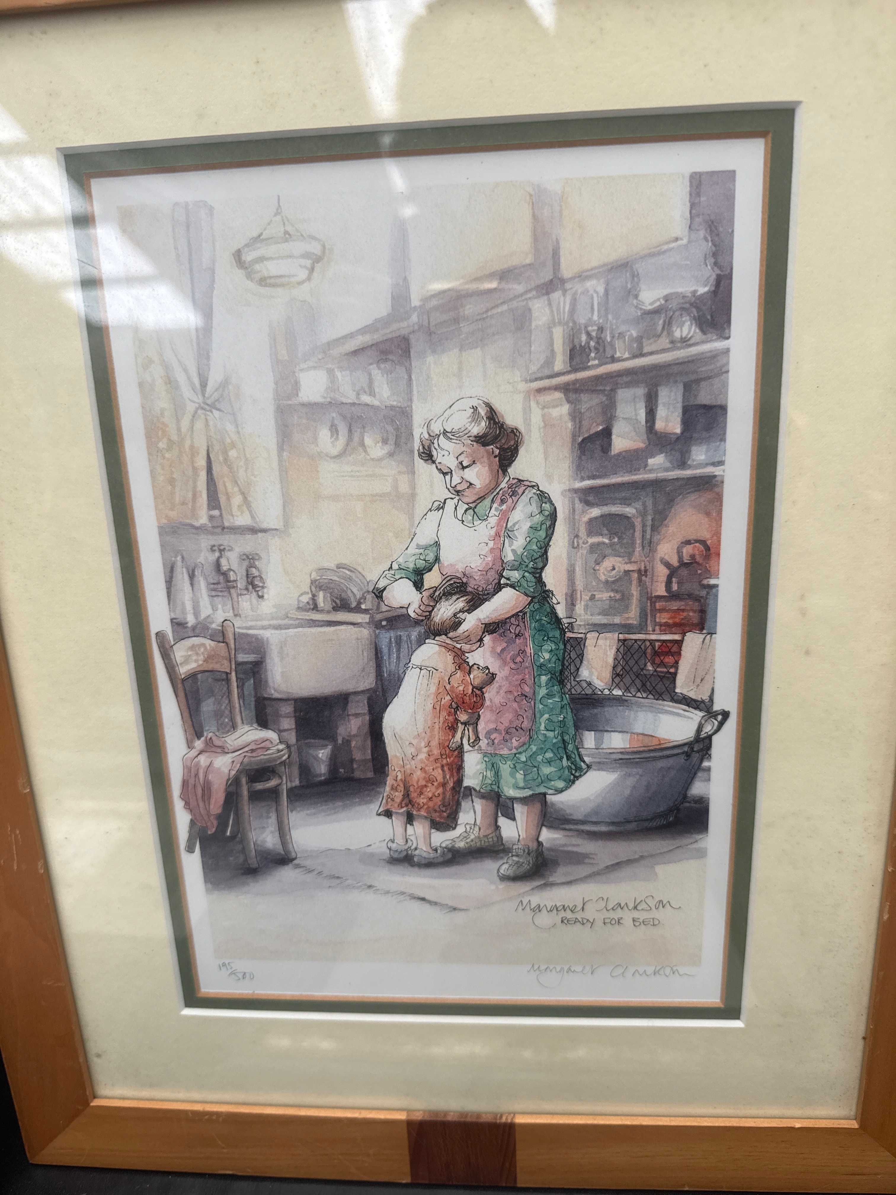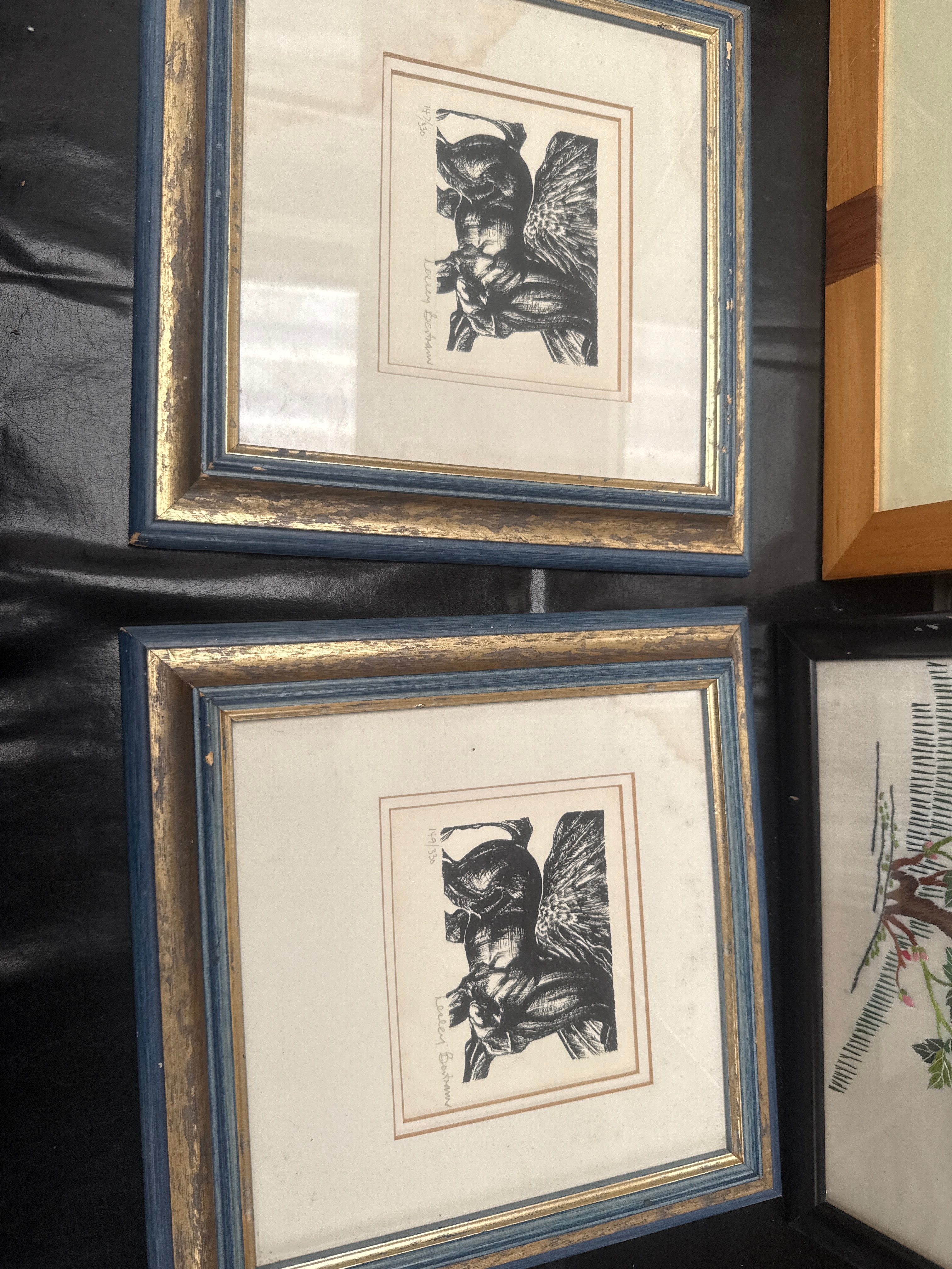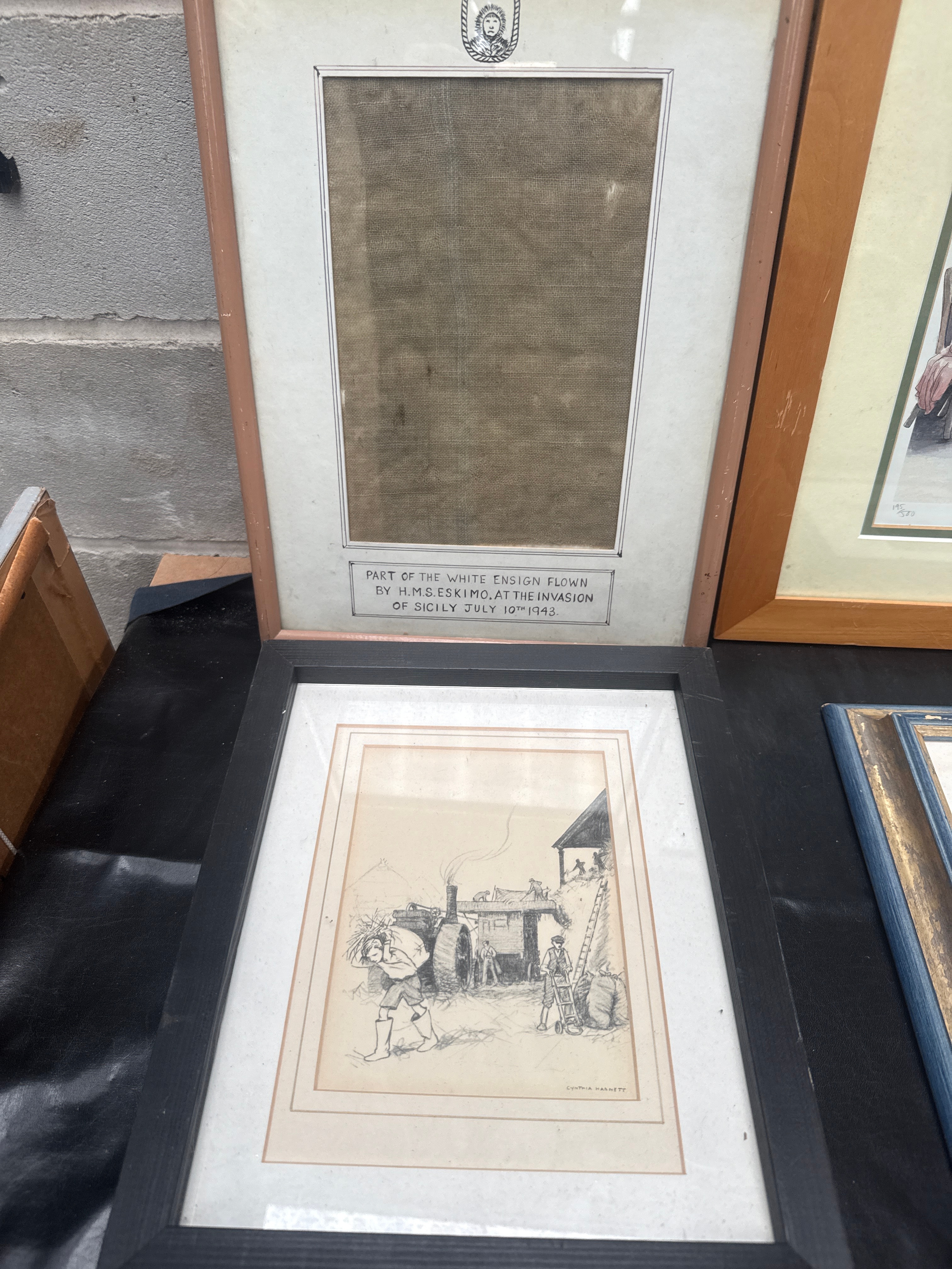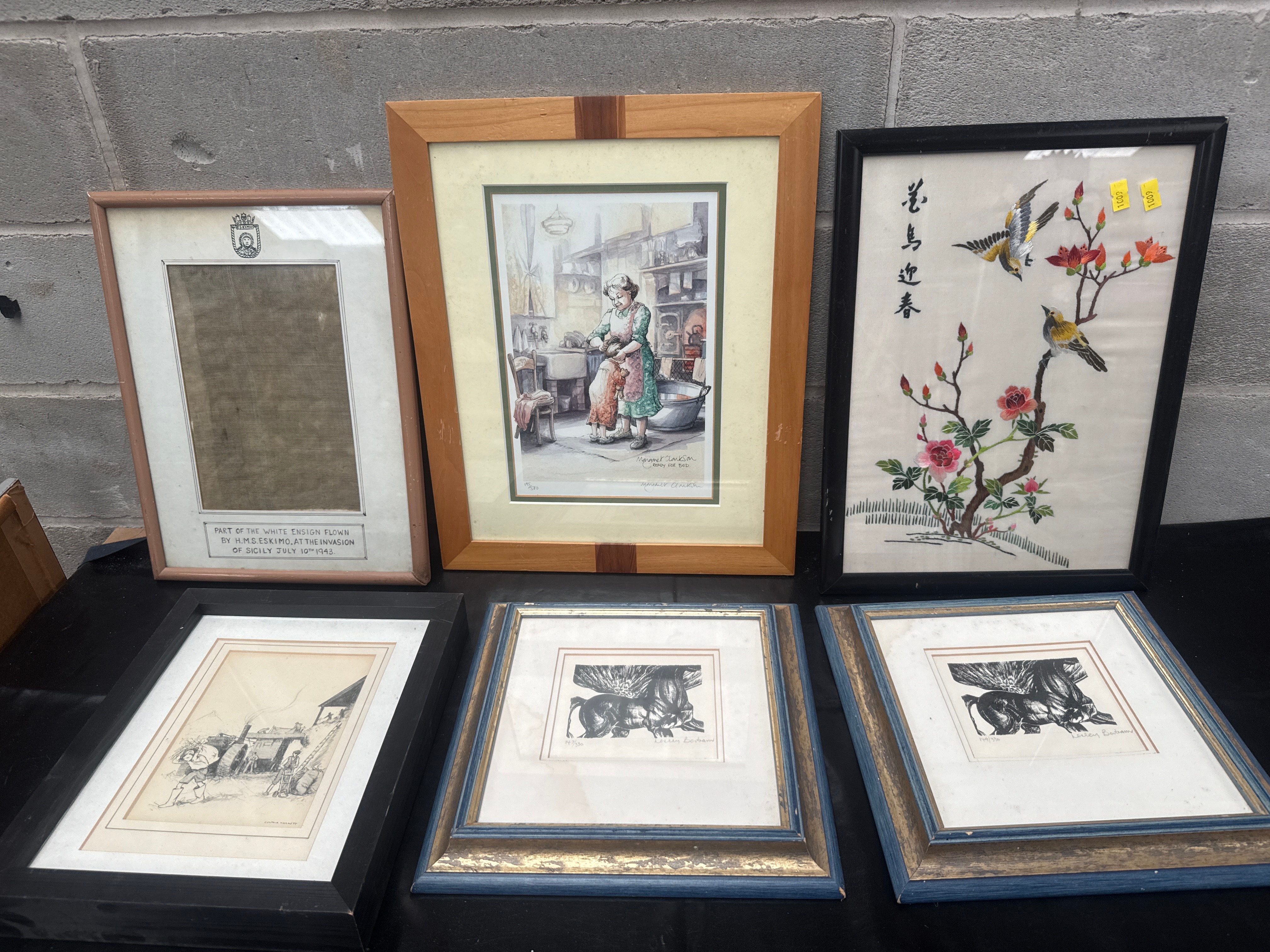 This lot comprises a group of six framed artworks, prominently featuring a limited edition print by Margaret Clarkson titled ‘Ready For Bed’. The print, signed ‘Margaret Clarkson’ and numbered ‘195/380’, depicts a domestic scene of a woman bathing a child, presented in a light wood frame. Also included is an embroidered textile art piece, depicting birds and blossoming branches with Chinese calligraphy reading “花鳥迎春” (Flowers and birds welcome spring), presented in a black frame. A framed textile fragment is identified by an inscription as “PART OF THE WHITE ENSIGN FLOWN BY H.M.S. ESKIMO, AT THE INVASION OF SICILY JULY 10TH 1943”, presented in a light wood frame. Further included is a framed pen-and-ink drawing of a rural scene, signed “Cynthia Barnett”, in a black frame. Completing the lot are two identically framed graphic prints (likely woodcuts or linocuts) of a winged figure, each signed “Lesley Buchanan 19/25”, presented in distressed blue and gold-tone frames.