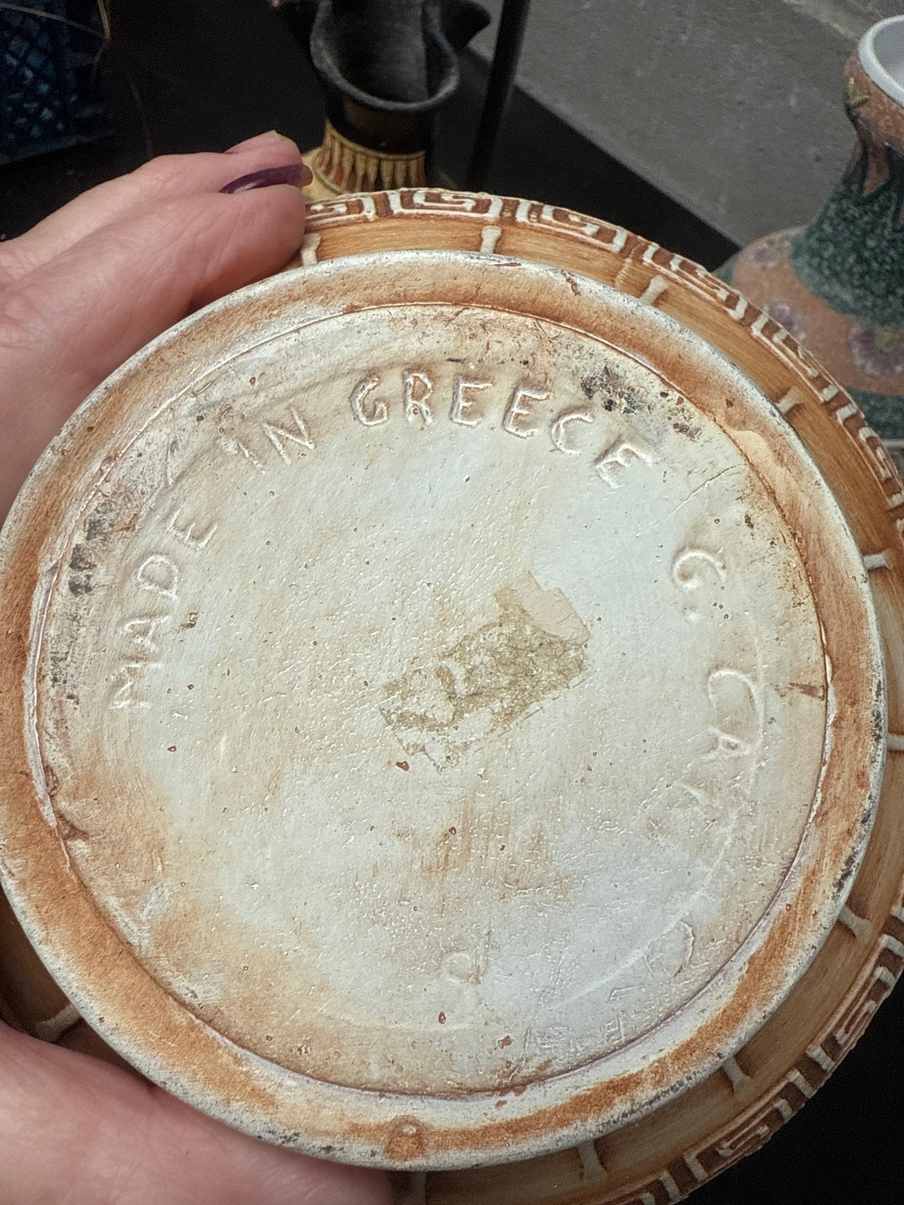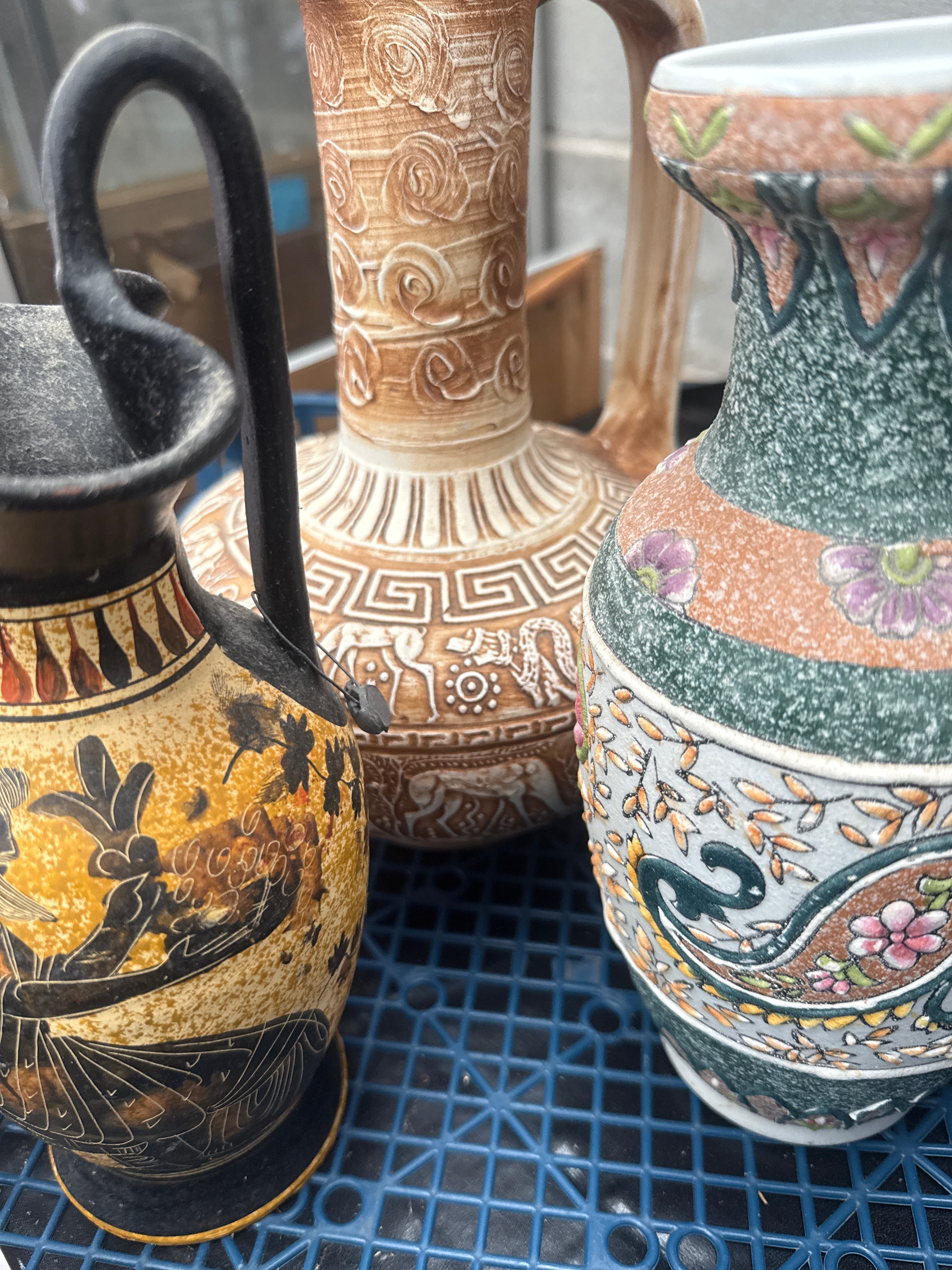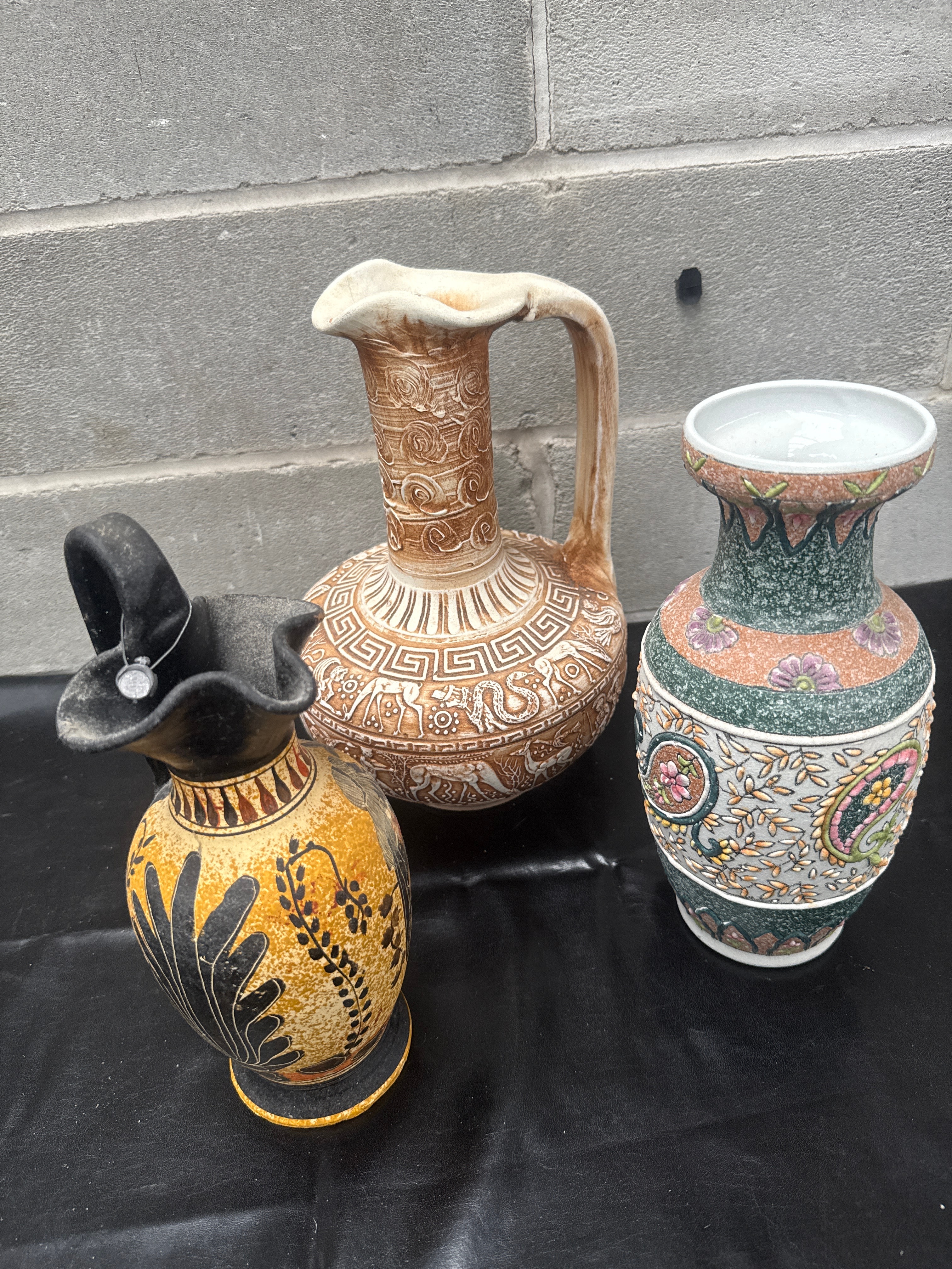 A group of three decorative ceramic vessels. The tallest item, a vase with a flared rim, is characterized by a vibrant polychrome glaze featuring textured speckled bands in green and pink, elaborately decorated with floral and paisley motifs, consistent with Mexican Tonala folk art pottery. The central ewer, made of stoneware-like ceramic, features a prominent handle and spout, adorned with intricate relief work including Greek key geometric patterns and mythological figures; its base is clearly marked “MADE IN GREECE,” indicating its origin. The smallest pitcher, inspired by ancient Greek pottery styles, features black-figure style decoration depicting classical figures and patterns on a distressed yellow ground with a black handle and fluted rim. All items appear to be ceramic or pottery.