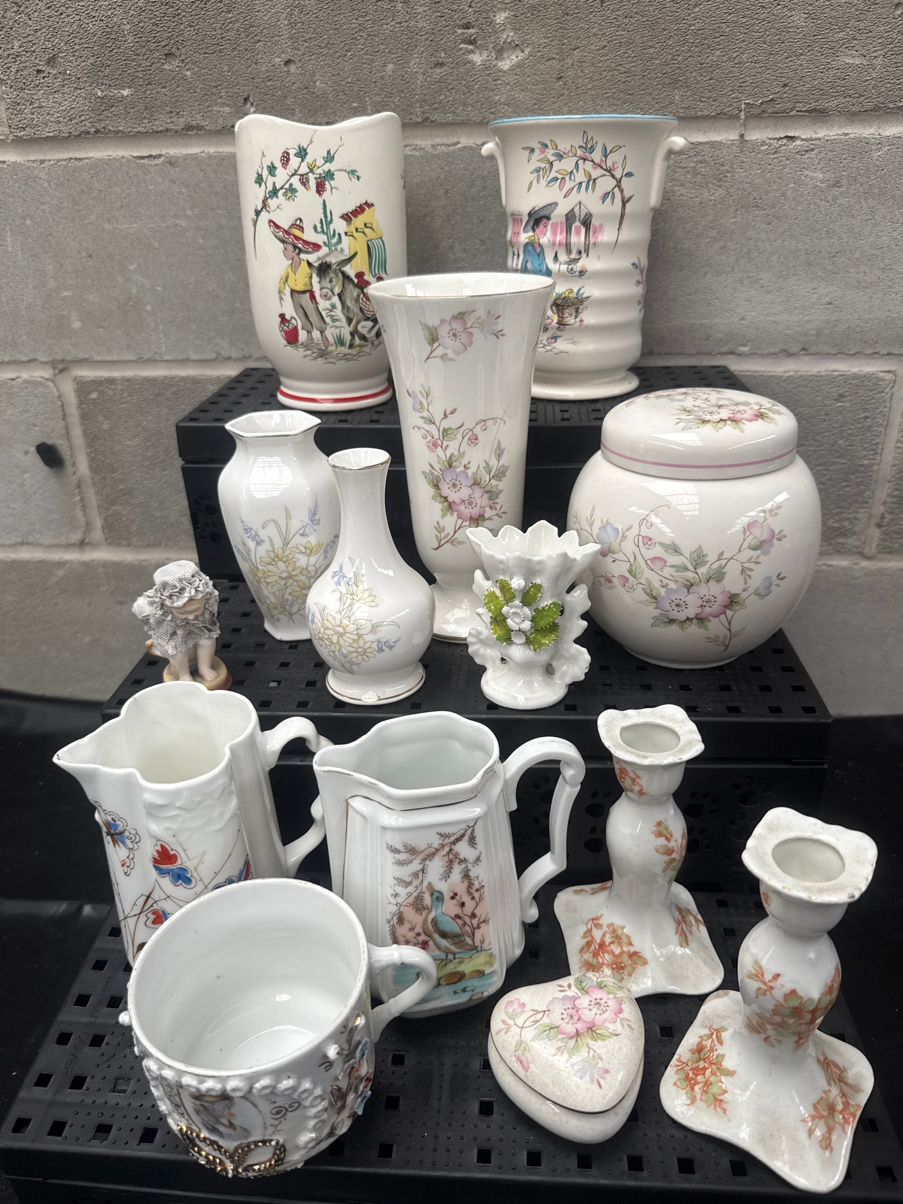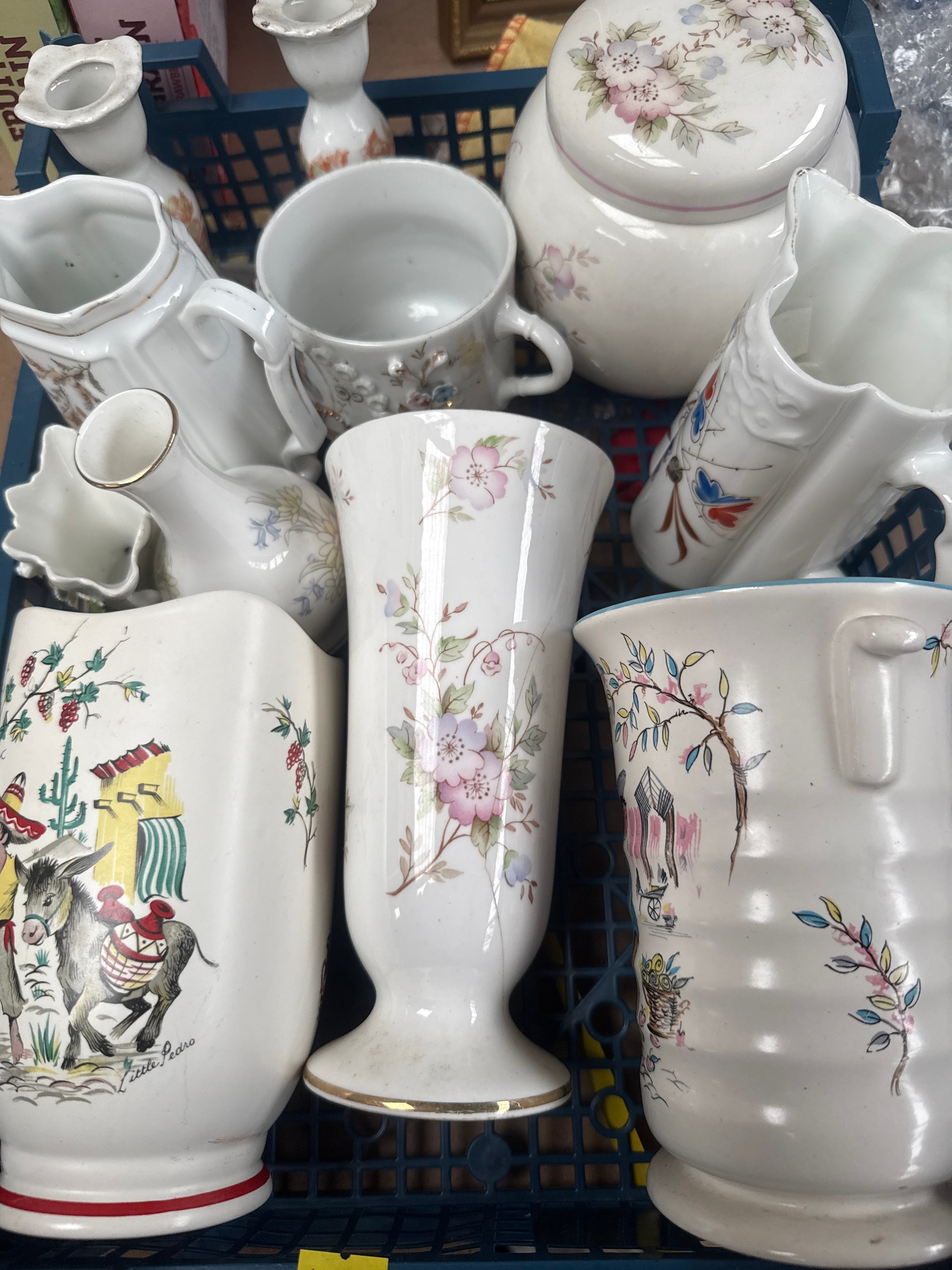 A collection of approximately 16 pieces of glazed ceramic and porcelain ware. The collection includes several pieces of Aynsley ‘Wild Tudor’ fine bone china, featuring characteristic floral motifs in pink, green, and blue hues, comprising items such as vases, a lidded jar, and a trinket box. Also present are various other decorative ceramic items, predominantly white or cream-colored, including pitchers, candlesticks, and a small figurine. Notable among these are a jug depicting a person on a donkey with the visible English inscription ‘Little Pedro,’ and another vase adorned with a blossoming tree and building. The collection totals approximately 16 pieces.
