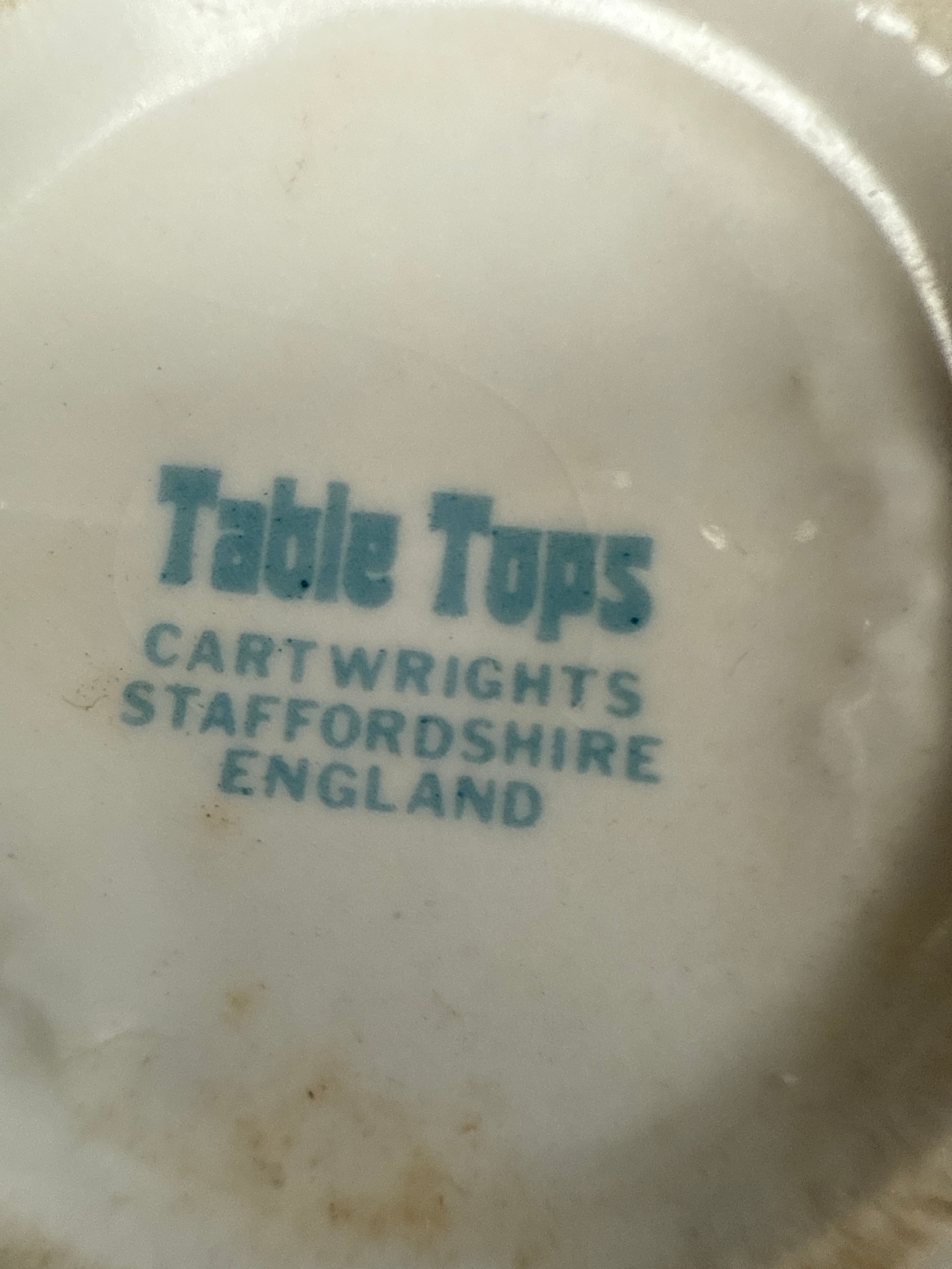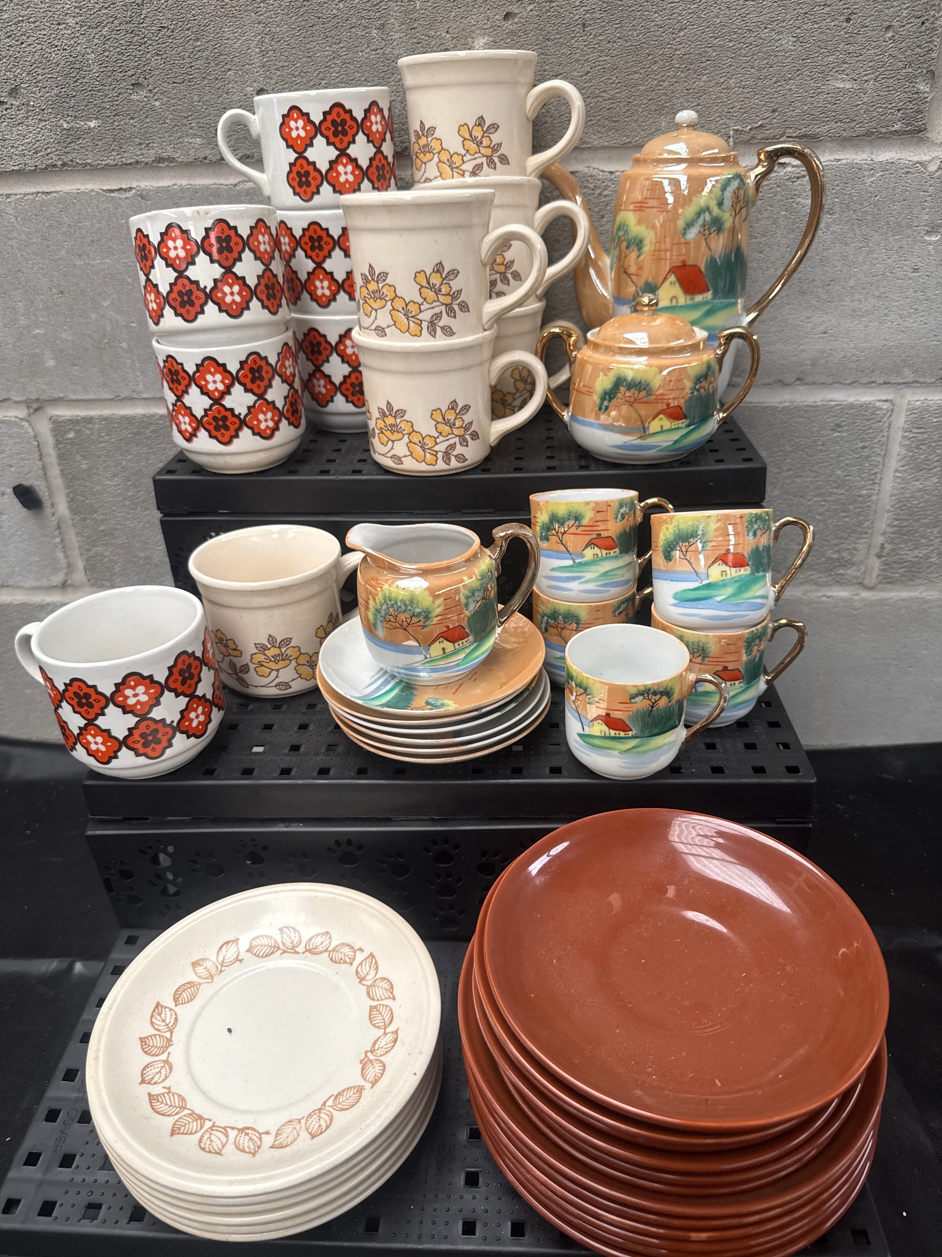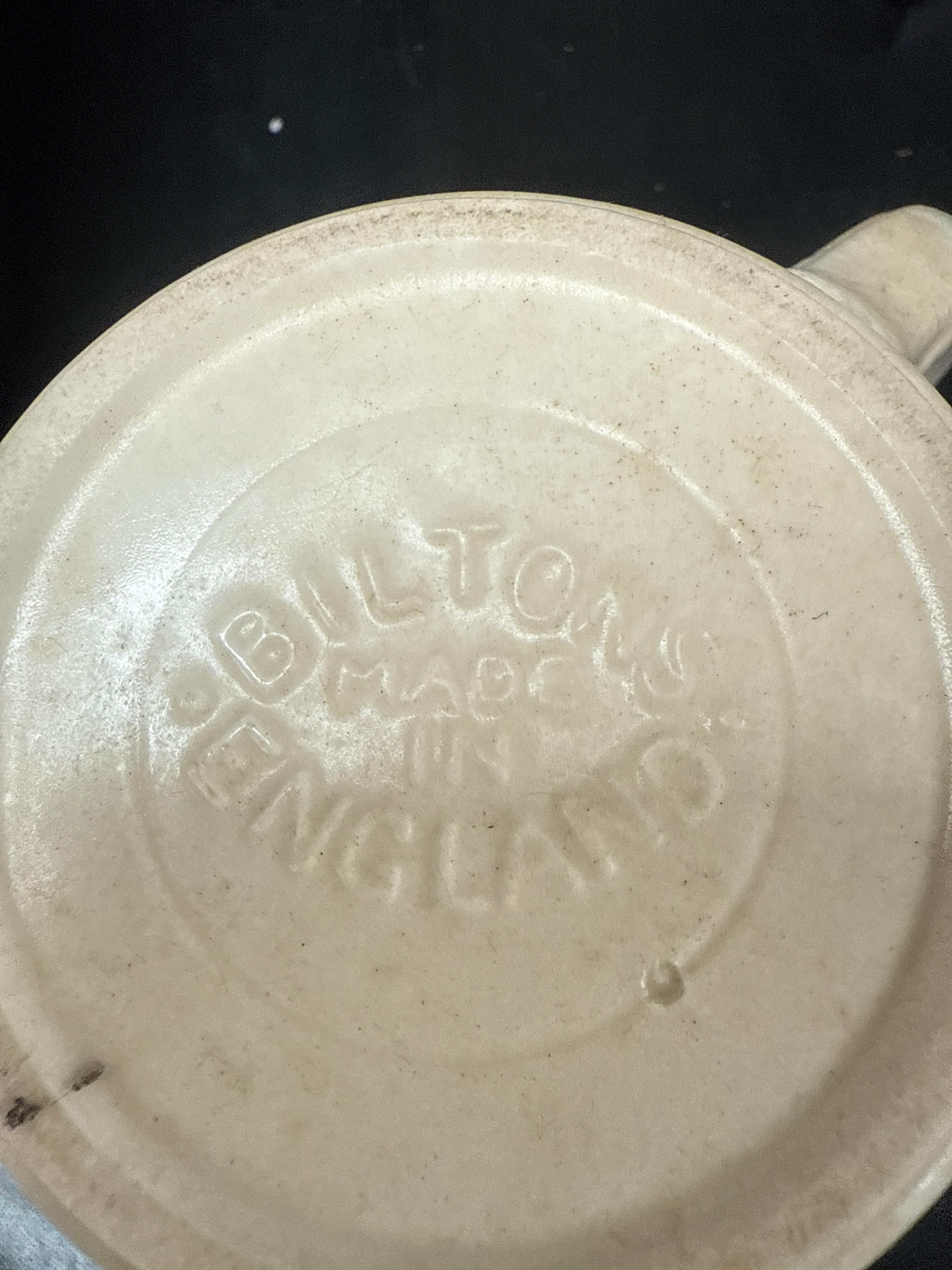 This lot comprises a diverse collection of mid-20th century ceramic tableware, predominantly earthenware or stoneware, featuring various styles. The assortment includes multiple mugs, cups, saucers, dinner plates, two teapots, and a creamer. Decorations include distinct patterns such as geometric red and black designs, yellow and brown floral motifs, and scenic countryside illustrations often accented with gold trim. Visible markings on the bases identify some pieces as “BILTONS MADE IN ENGLAND” (embossed) and others as “Table Tops CARTWRIGHTS STAFFORDSHIRE ENGLAND” (stamped in blue).