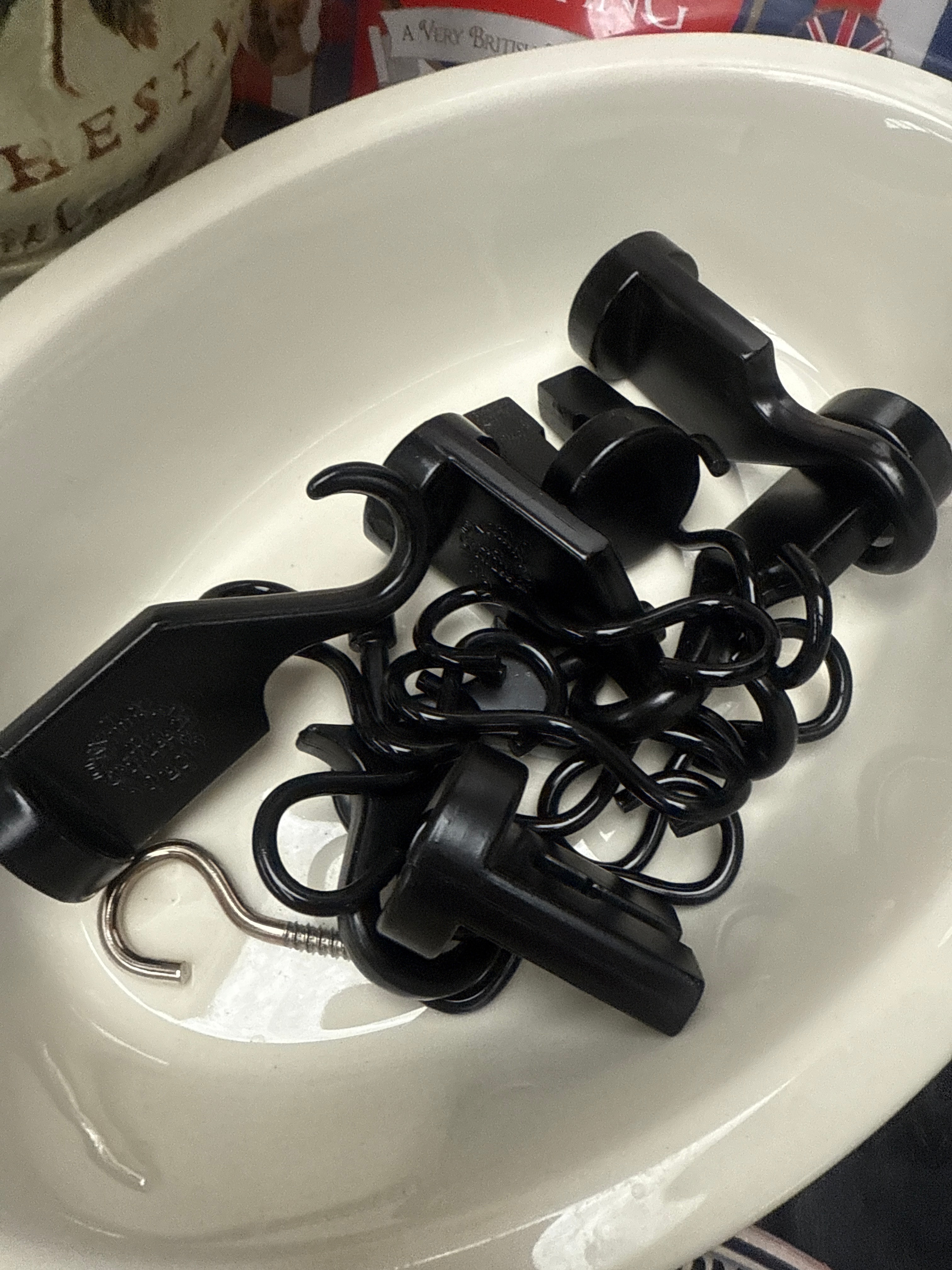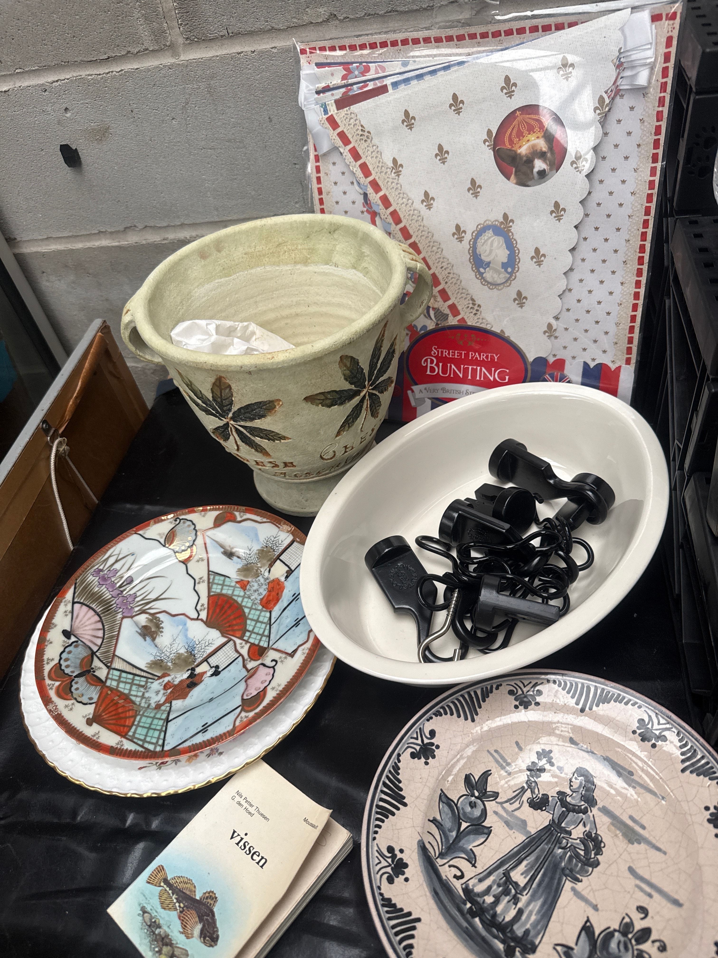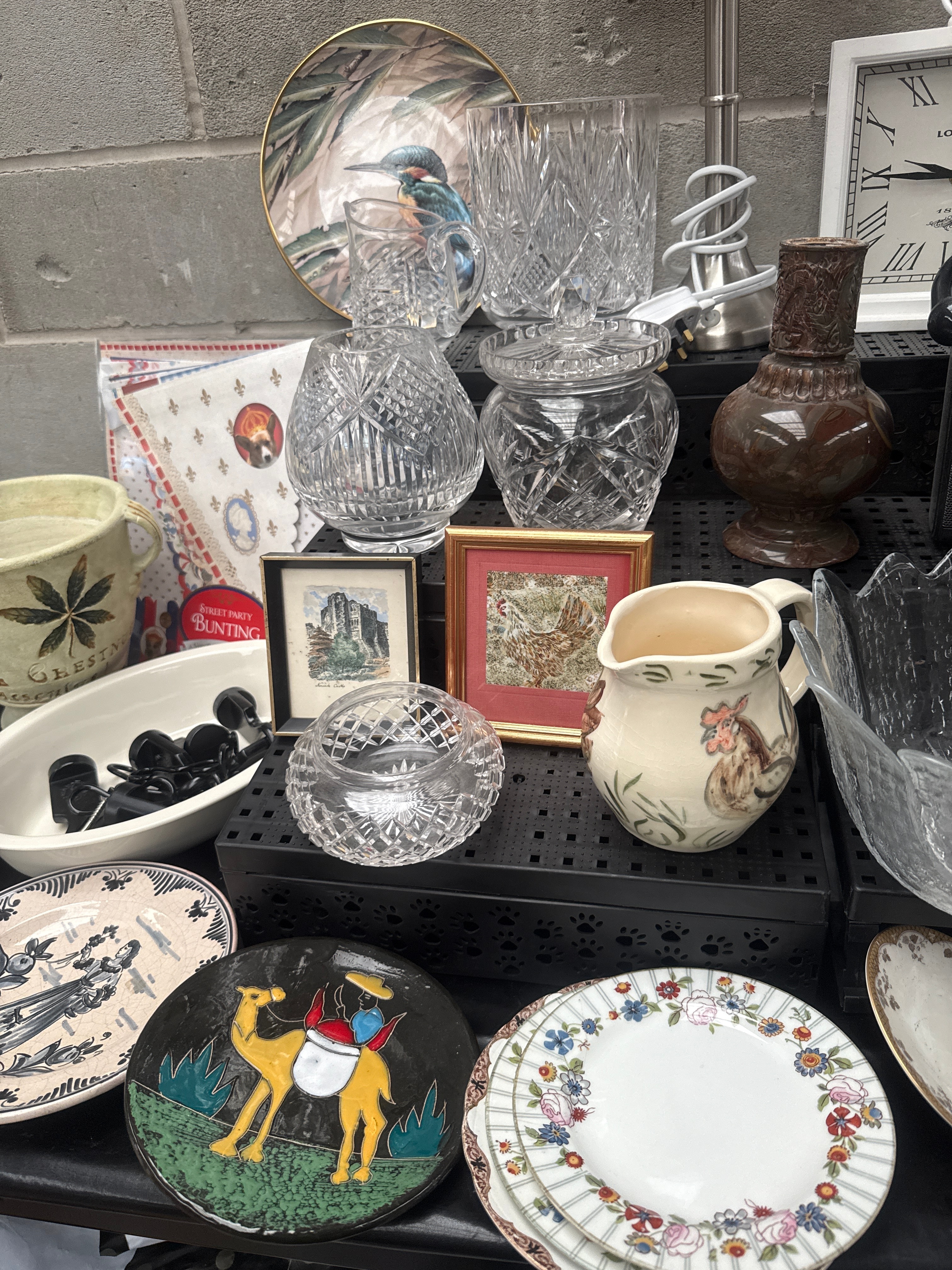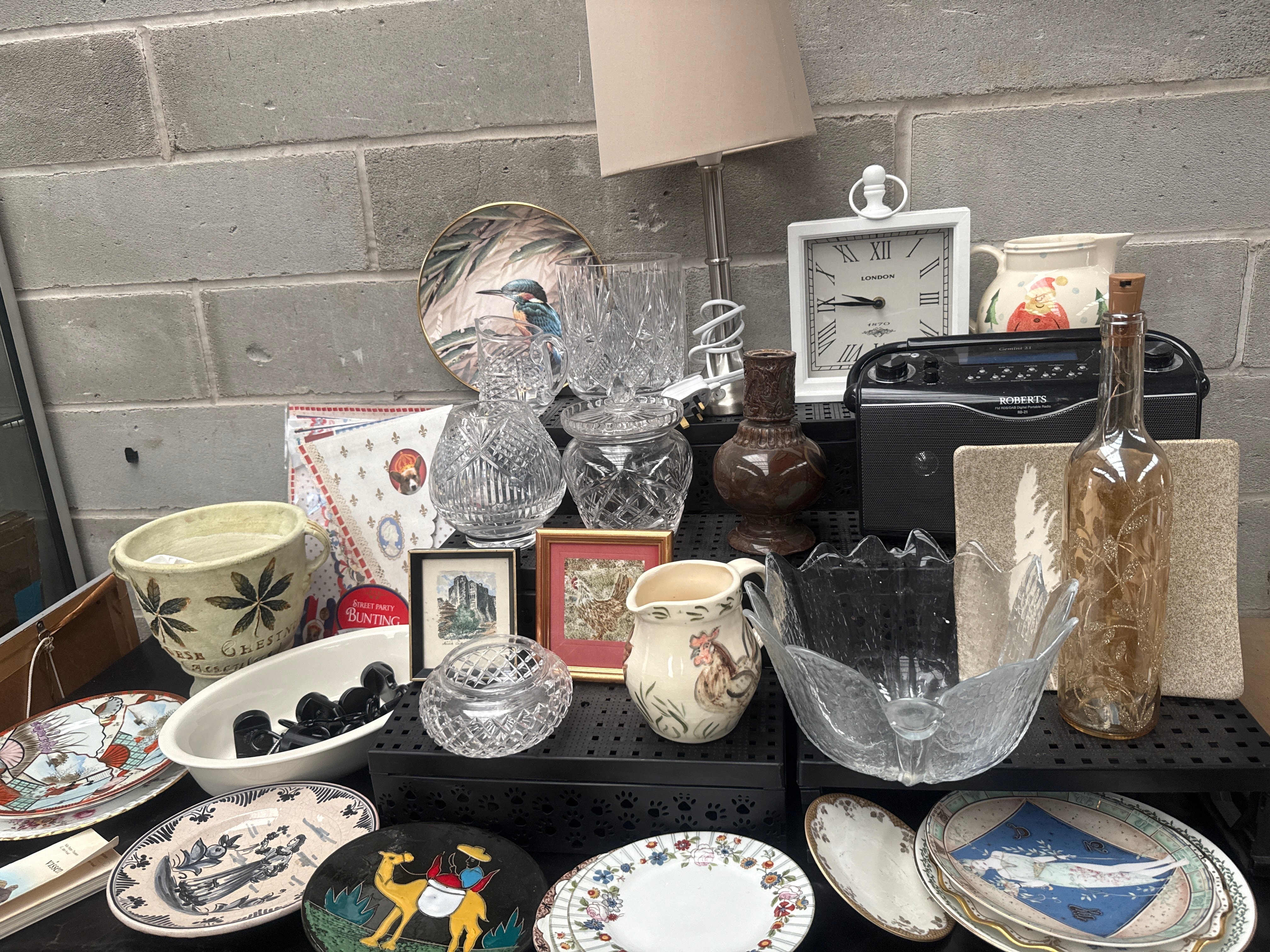 A diverse collection of decorative and functional household items, comprising ceramics, porcelain, and various forms of glass. The ceramics and porcelain include a group of decorative plates featuring floral, scenic, Asian-inspired, camel, and figure motifs; two ceramic pitchers, one decorated with a rooster and another with a Santa Claus figure; a light green planter pot with “BEST” partially visible; and a white oval dish containing black plastic hooks. The glassware includes several pieces of cut crystal, such as vases, bowls, and jars, alongside clear glass items and an amber bottle. Also present are a silver-toned table lamp with a cream shade, a white mantel clock marked “LONDON” with Roman numerals, a black Roberts radio, two small framed pictures depicting a castle landscape and a rustic animal scene, and a packaged “STREET PARTY BUNTING.” A small book titled “vissen” is also included.
