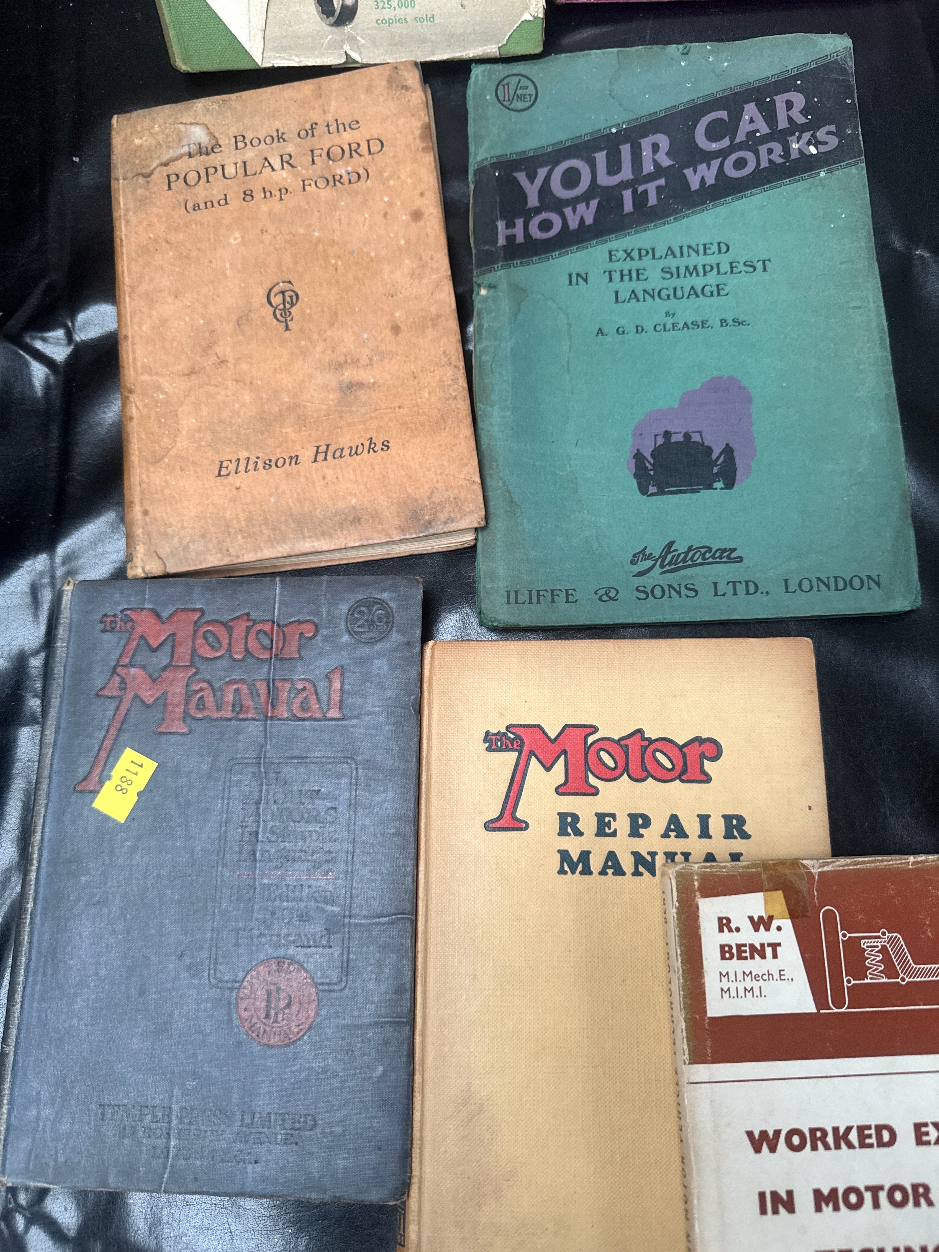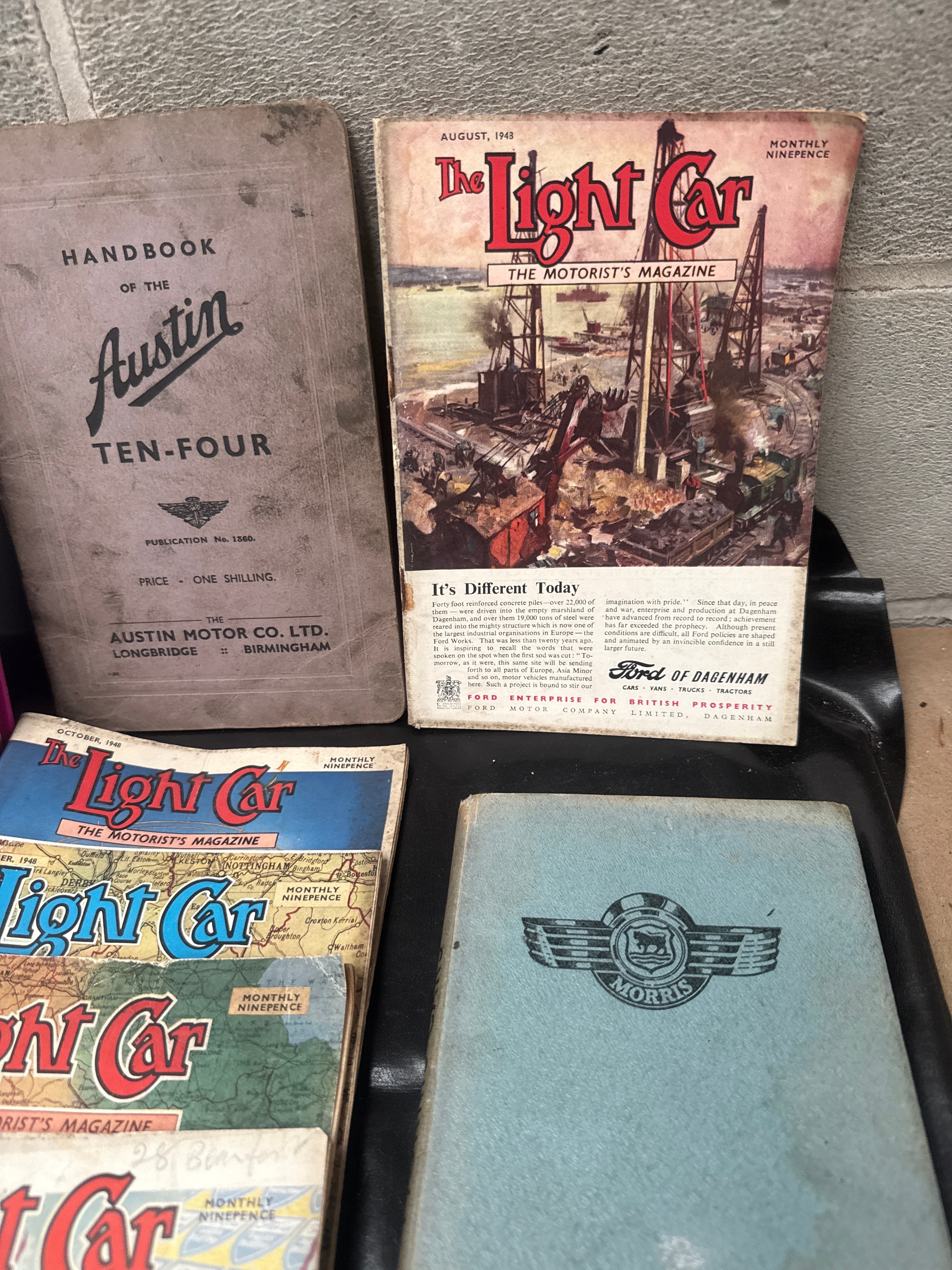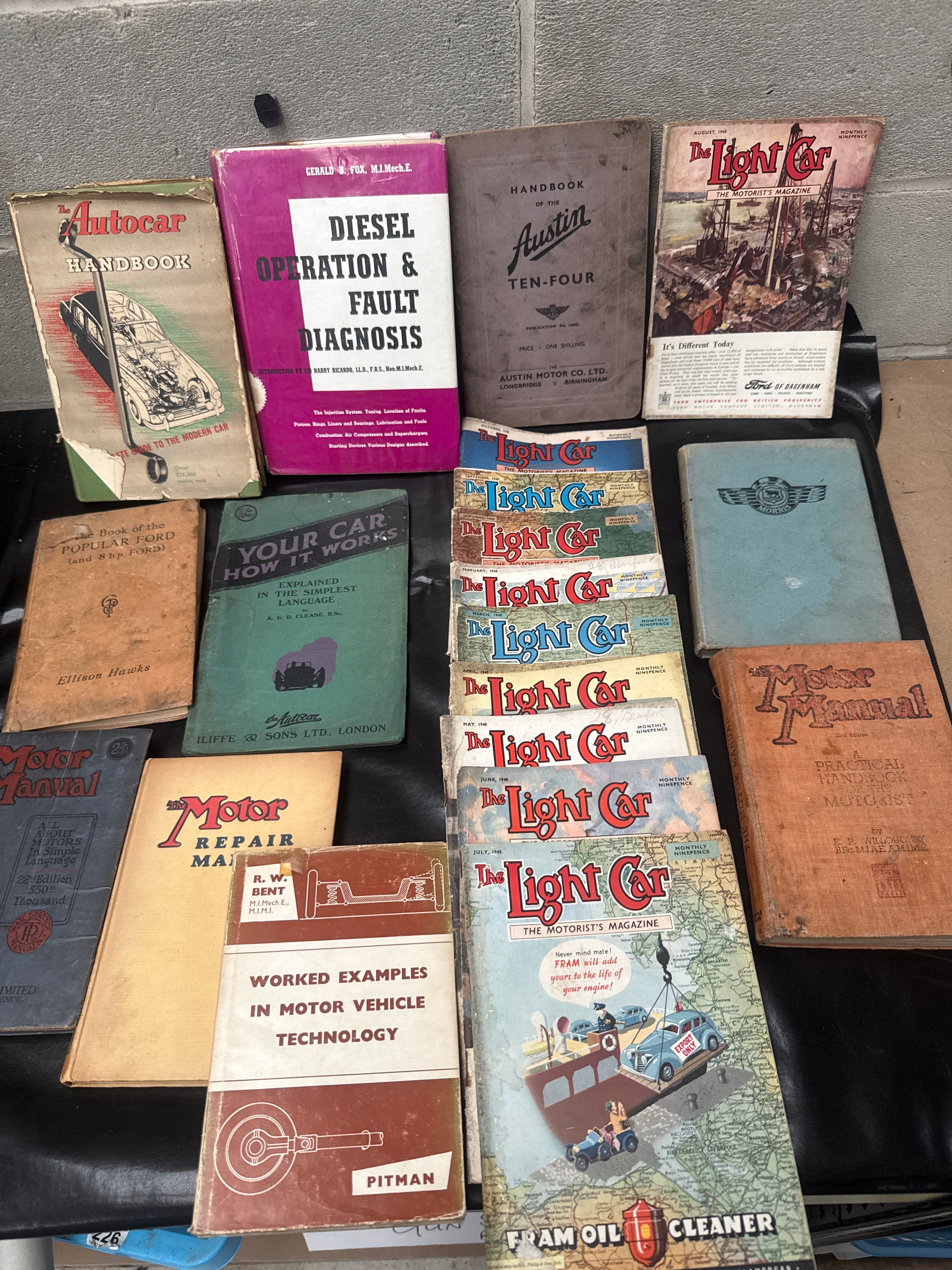This lot comprises approximately two dozen vintage automotive-related books and magazines, primarily dating from the mid-20th century. The collection includes instructional manuals, handbooks, and periodicals, constructed from paper and cardboard. Notable titles include several issues of “The Light Car” magazine explicitly dated August and October 1948, “Autocar HANDBOOK,” “Diesel Operation & Fault Diagnosis,” “Handbook of the Austin Ten-Four,” “The Book of the Popular Ford,” “Your Car How It Works,” “The Motor Manual,” and “The Motor Repair Manual.” The collection also features items with “Morris” branding. Publishers visible include “The Austin Motor Co. Ltd.,” “Iliffe & Sons Ltd.,” and “Pitman.”