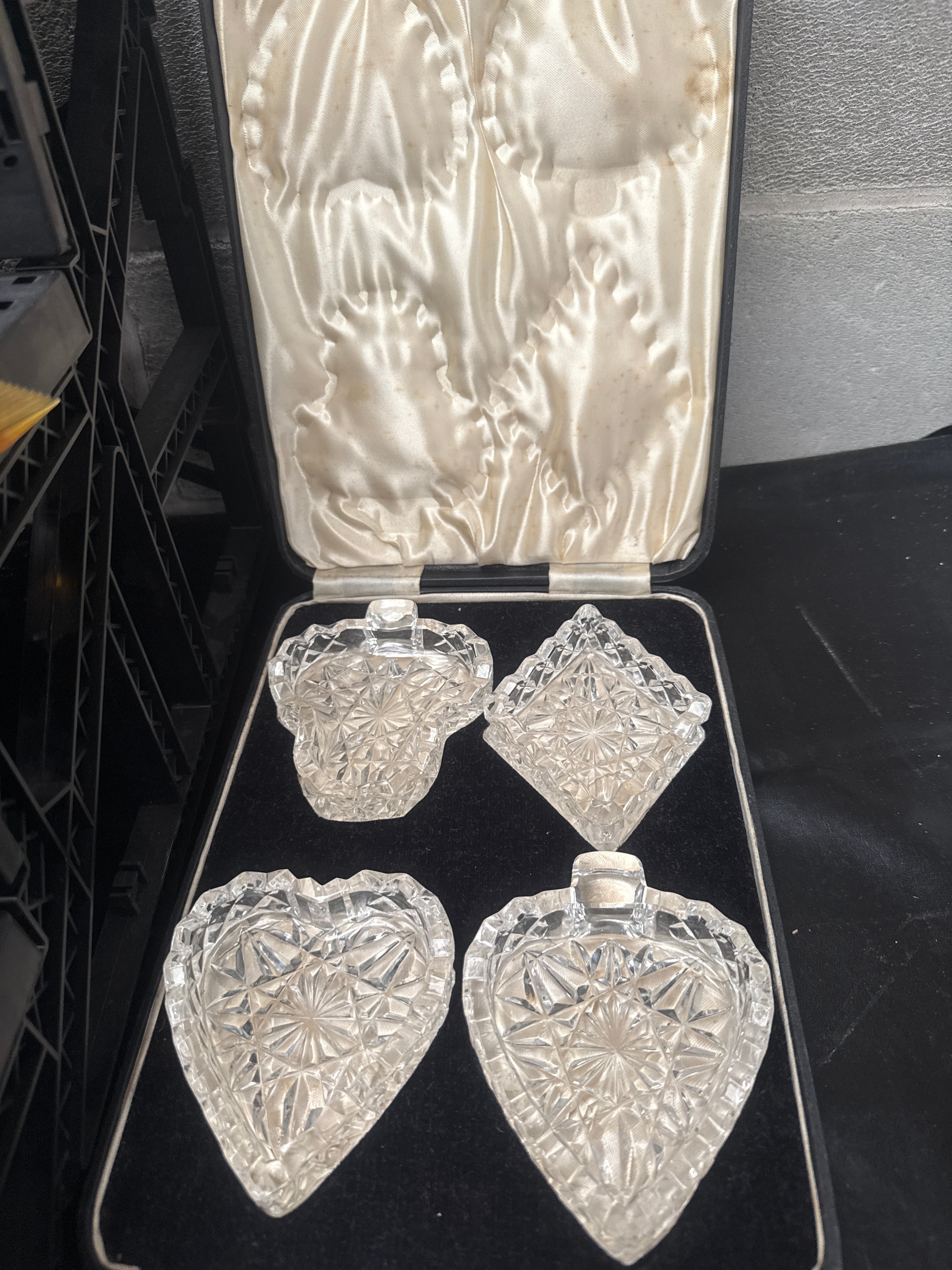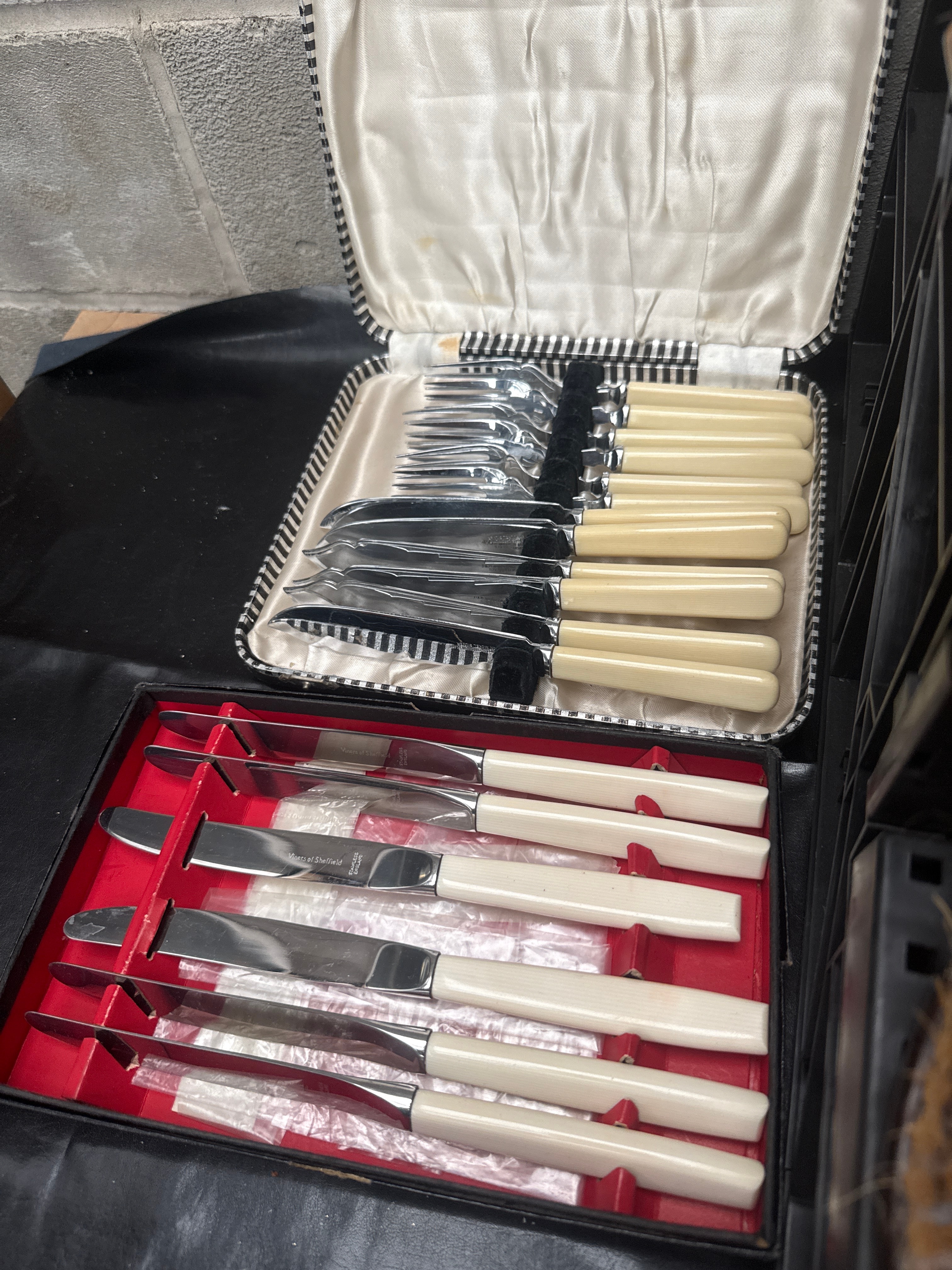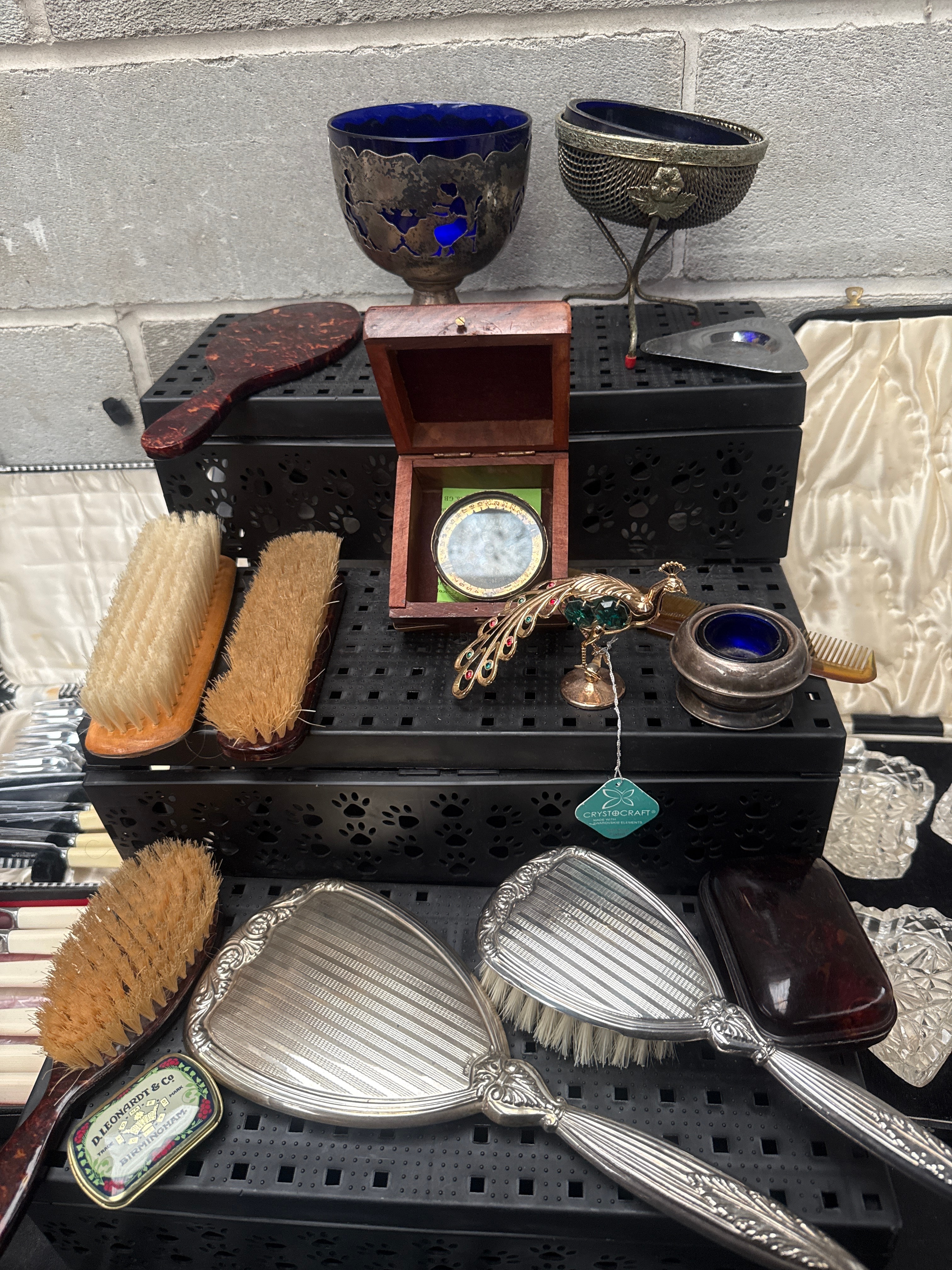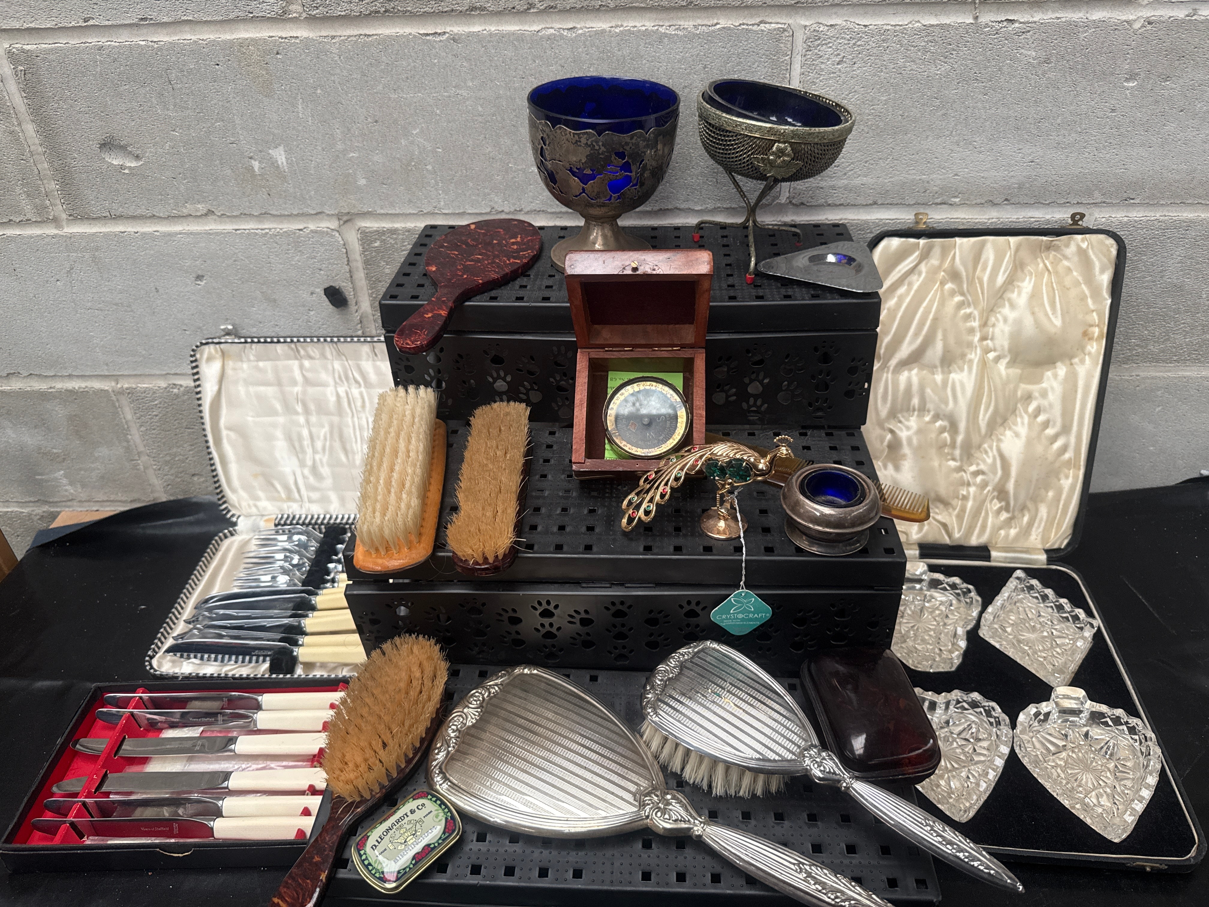 This diverse collection comprises numerous vintage personal care and decorative items. Featured are two ornate metal goblets with blue glass inserts, one presented on a stand, likely silver-plated or pewter. A small wooden box contains a circular mirror, and a small, lidded metal container also holds a blue glass insert. A colorful enamel and gilt metal peacock figurine is present. The lot includes a group of various brushes: several natural bristle types with wooden backs, a dark-handled brush, and a three-piece vanity set with decorative silver-toned metal-backed brushes and a mirror. One brush displays a label “LEONARD & CO. LIMITED. ESTABLISHED 1840.” Also included are two cased sets of flatware, consisting of knives and forks with cream-colored handles and stainless steel blades/tines, marked “Sheffield Stainless Steel.” A separate velvet-lined case houses a set of four small, clear cut-crystal dishes in various shapes, including hearts, with lids.