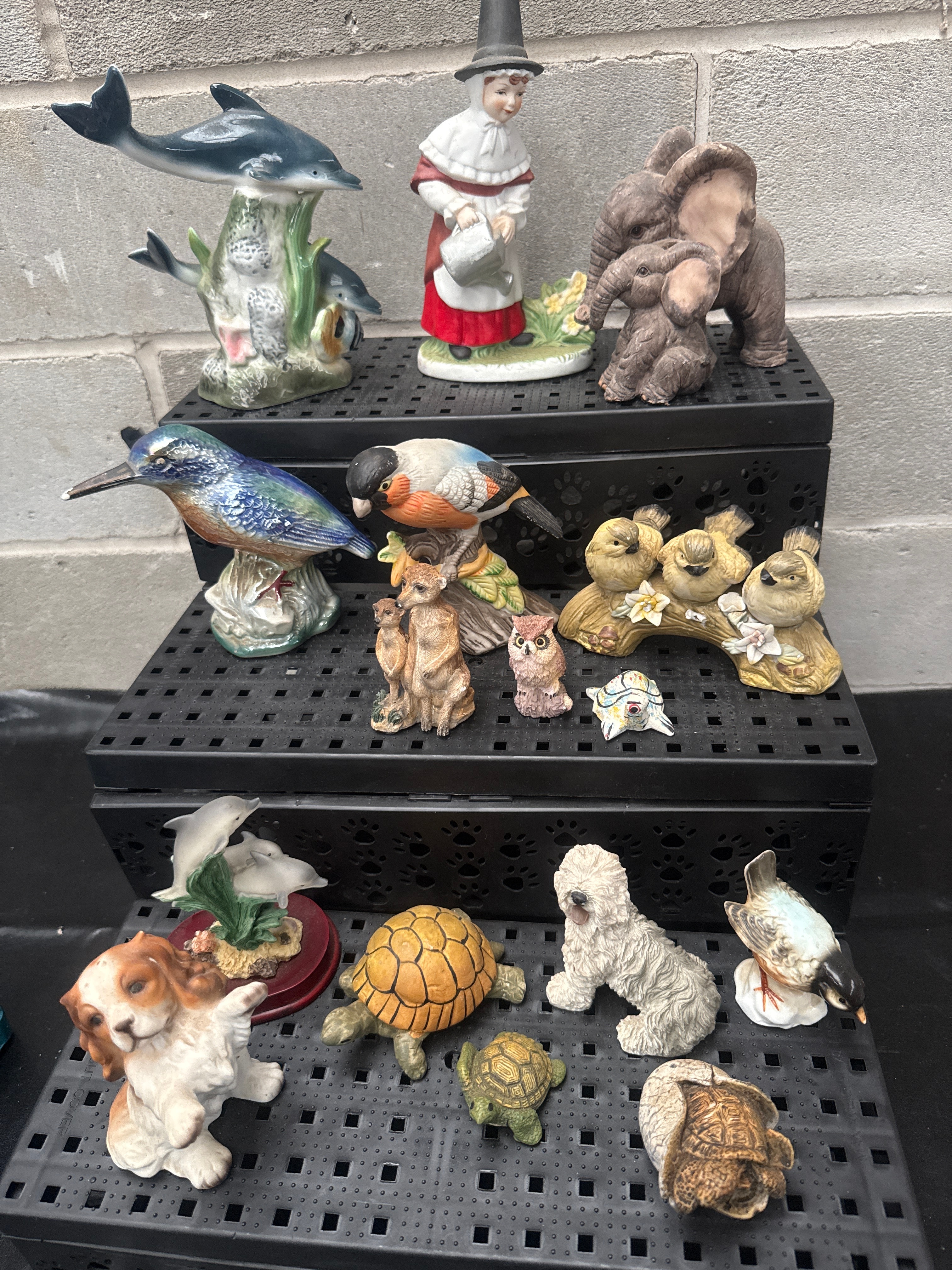 The collection comprises numerous glazed ceramic or porcelain figurines, primarily depicting animals and one human figure, consistent with decorative items from the 20th or 21st century. Included are various birds (a kingfisher, a bullfinch, and a group of small sparrows or finches), multiple dolphin arrangements, various turtle figures (one appearing to emerge from a shell-like form, a larger and a smaller turtle), two distinct dog figurines (a spaniel and a shaggy breed), a group of meerkats, an owl, an adult and baby elephant pair, and a figure of a woman in traditional Welsh attire with a pointed hat, holding a watering can. The figurines exhibit a naturalistic to illustrative style with painted details. No discernible manufacturer’s marks or text are visible on the items themselves.