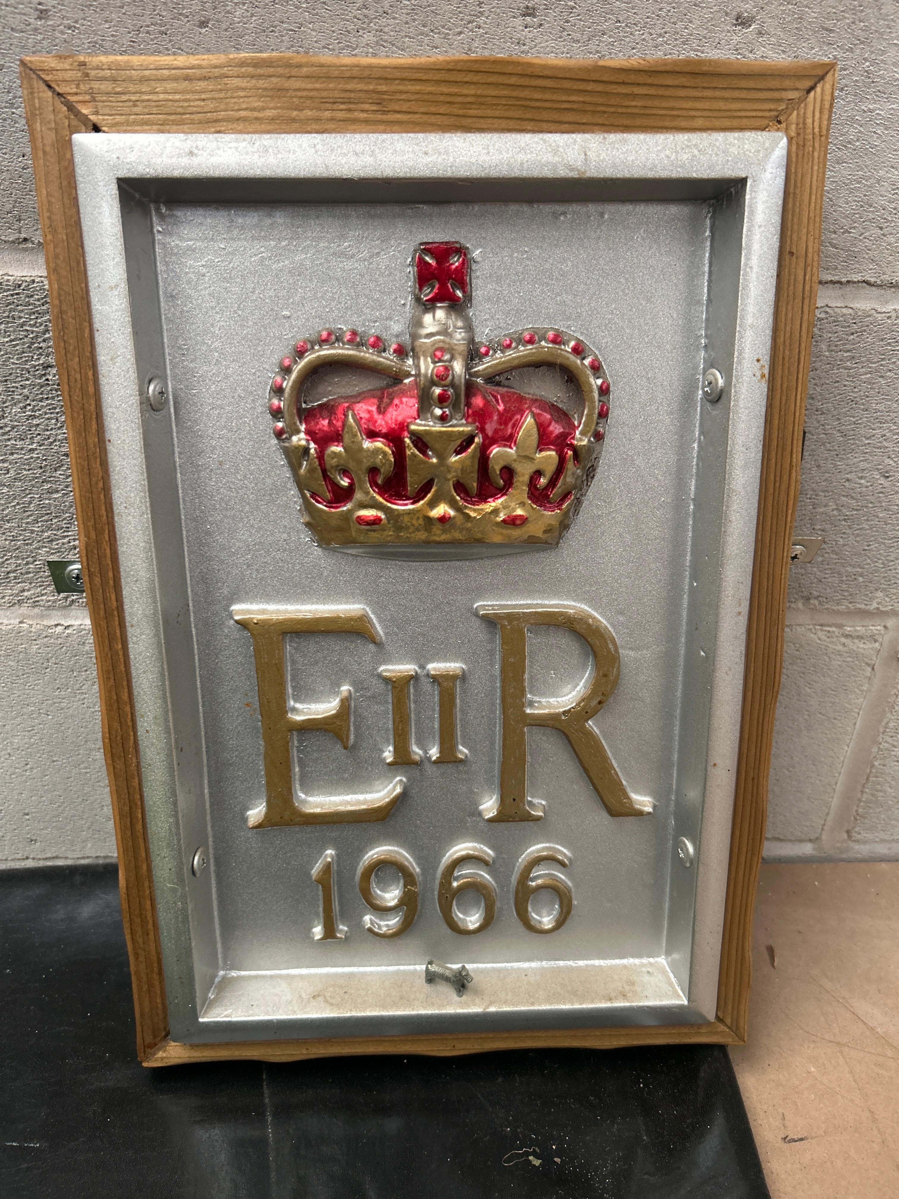 A framed commemorative plaque, featuring a cast metal panel set within a light-colored wooden frame. The central metal panel displays a raised, polychrome design including a red and gold crown at the top, followed by the gold letters “E II R” (Elizabeth II Regina) and the gold numerals “1966.” A small, distinct metallic figure of a dog is affixed below the date. The plaque itself has a textured, silvery-grey background, secured to the frame with visible screws.