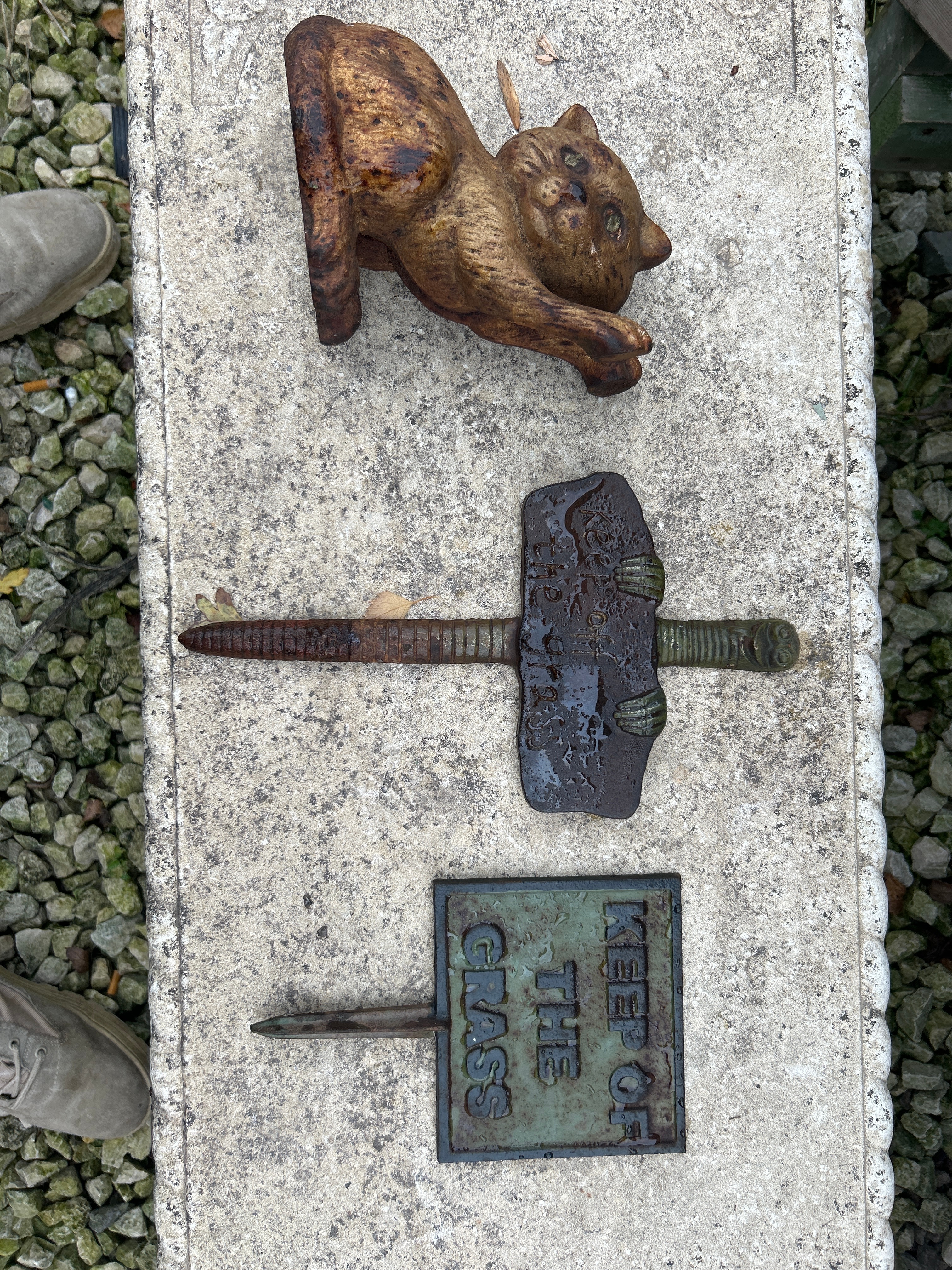 A group of three cast metal garden items, exhibiting signs of prolonged outdoor exposure. The collection includes a stylized cast iron cat figurine or doorstop, a heavy T-shaped cast metal garden stake with a pointed shaft and decorative crossbar, and a rectangular cast metal garden sign with an integrated stake, displaying the raised English text “KEEP OFF THE GRASS.” Traces of a dark green finish are visible on the T-shaped stake and the garden sign.