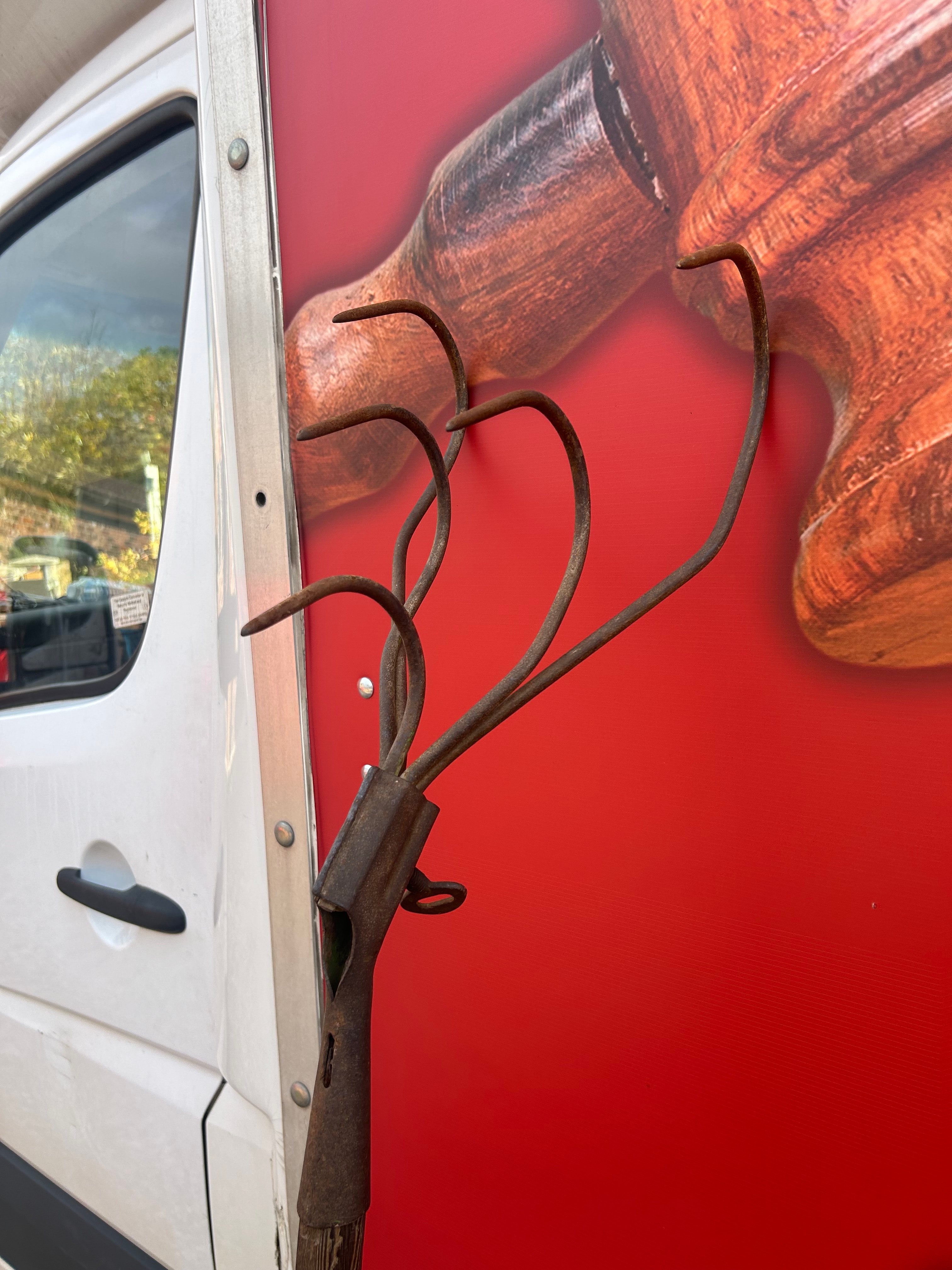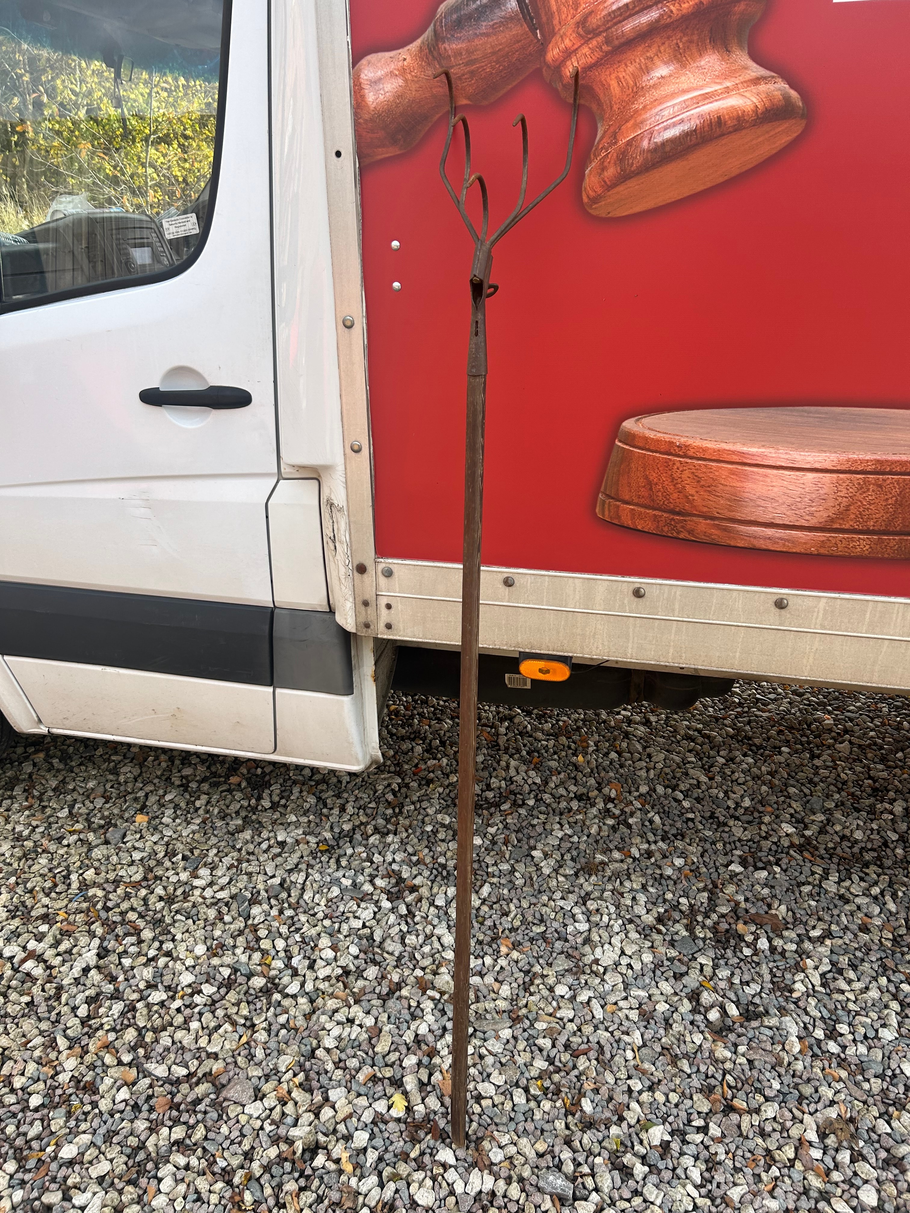 An antique primitive hay pitch fork. Constructed entirely of what appears to be iron or steel, the implement features a long, slender metal shaft and a distinctive head. The head is characterized by a central spike surrounded by four prominent, outwardly-curved metal prongs. No discernible text or manufacturer’s markings are visible.