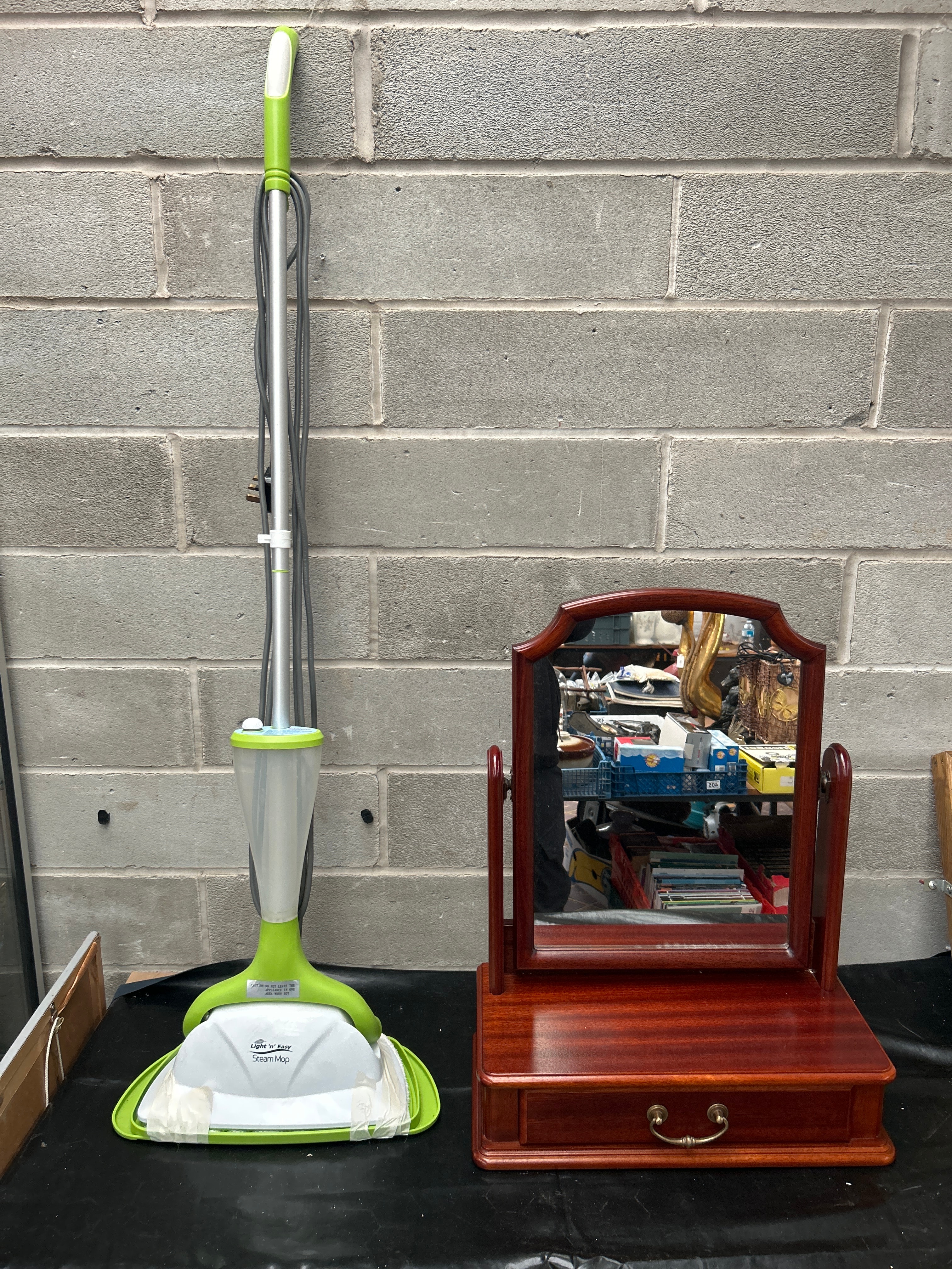 A Light ‘n’ Easy Steam Mop, branded ‘Light ‘n’ Easy Steam Mop’ on its head. Constructed predominantly from plastic in lime green, white, and clear, with a silver-colored metal pole. Features a warning label reading ‘CAUTION: DO NOT LEAVE THE STEAM MOP PLUGGED IN AND AREA WHEN HOT’. Adjacent is a tabletop vanity mirror, crafted from dark reddish-brown wood with a glossy finish, possibly mahogany or a similar stained hardwood. The mirror has a scrolled top and pivots within a stand set on a base featuring a single drawer with a brass-colored metal pull.