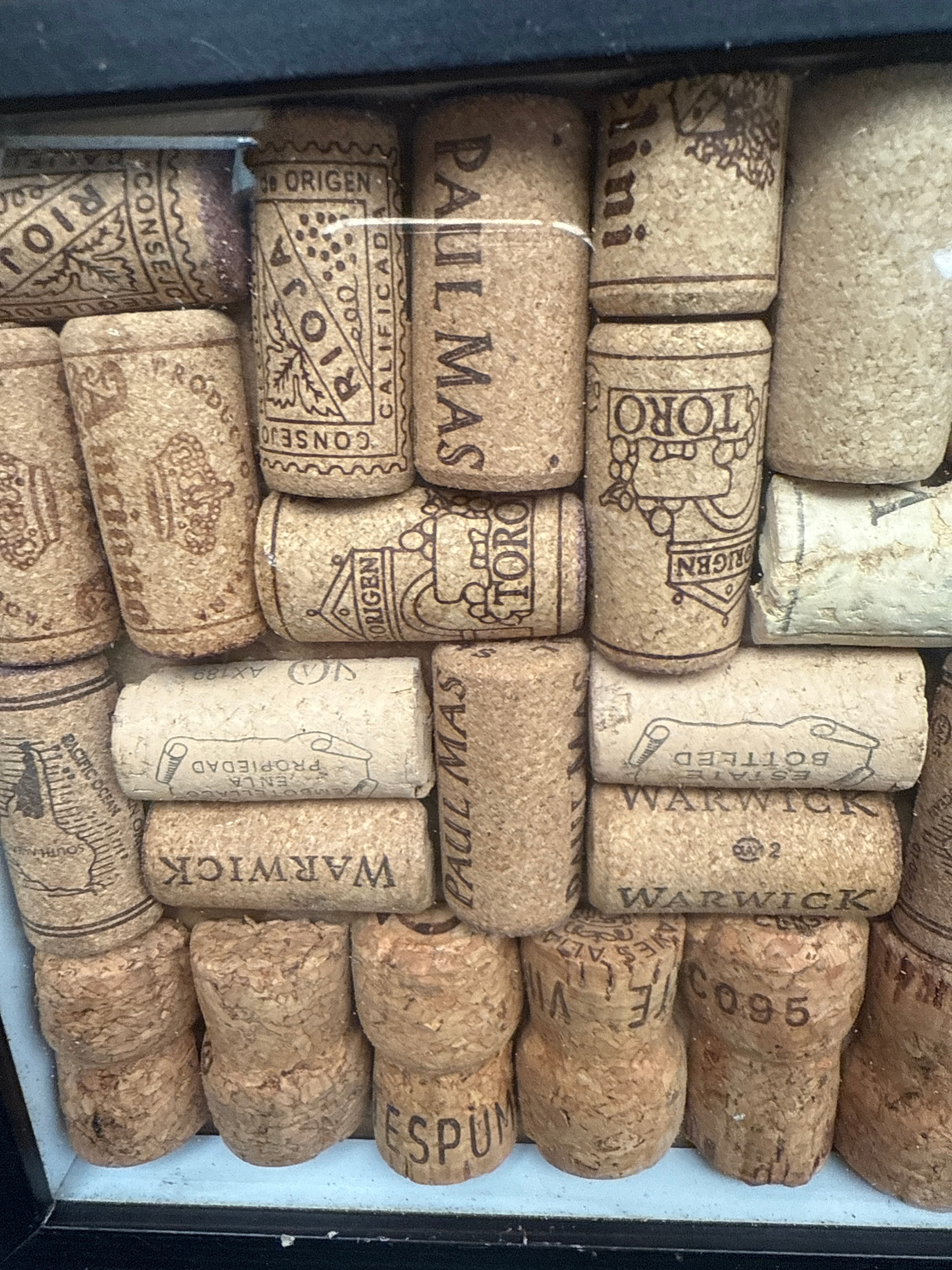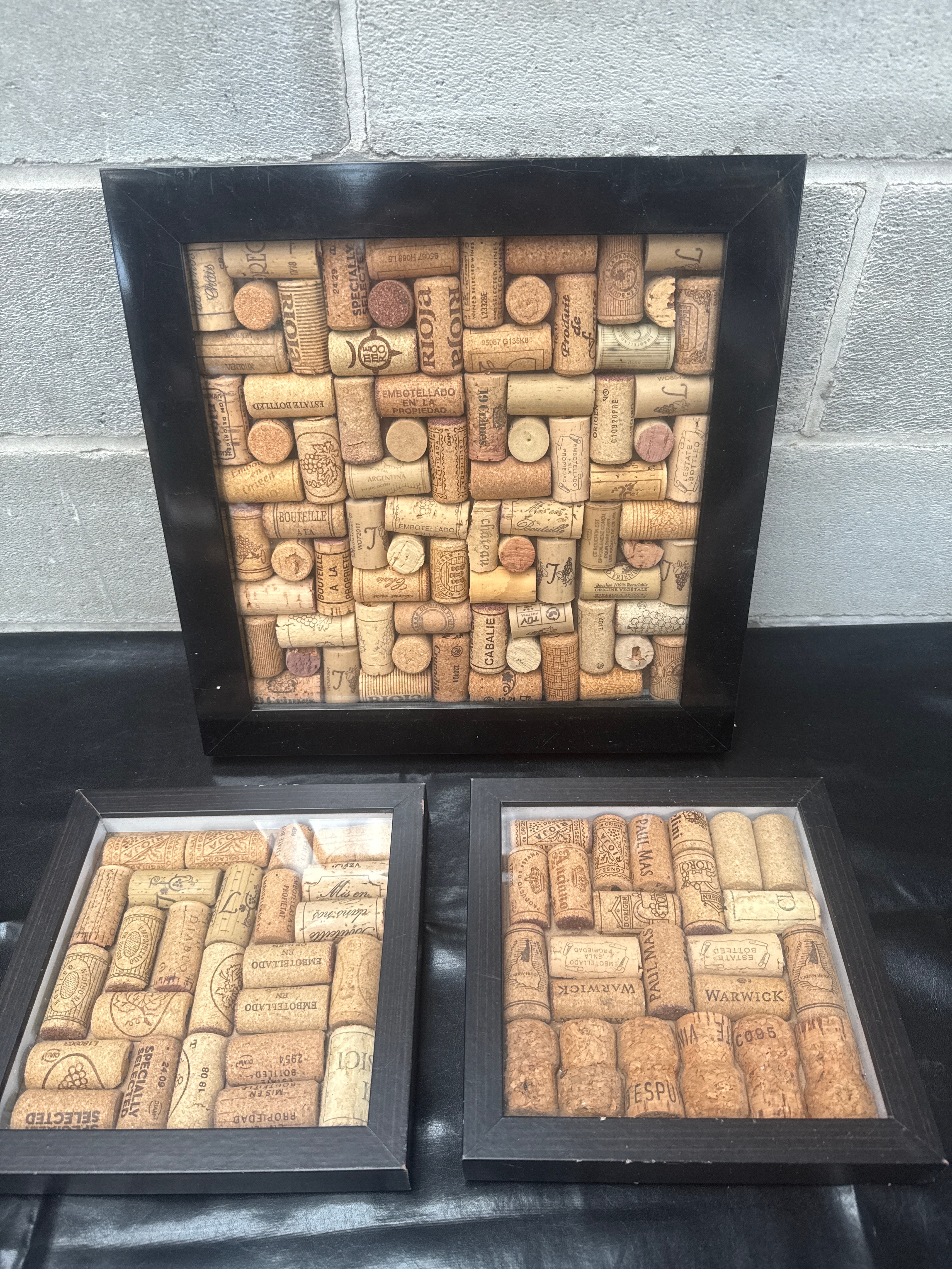 A lot comprising three decorative, contemporary framed shadow boxes, each featuring a tightly arranged mosaic of natural wine corks. The corks, varying in size and shape, display numerous printed texts and winery markings, including brand names such as ‘PAUL MAS’ (French winery), ‘WARWICK’ (South African winery), and regional names like ‘RIOJA’ and ‘TORO’ (Spanish wine regions). Other discernible text includes ‘ORIGEN’ (origin), ‘CALIFICADA’ (certified), ‘CONSEJO’ (council), ‘PROPIEDAD’ (property), ‘ESTATE BOTTLED’, and partial words like ‘ESPU’ (likely from ‘espumoso’ for sparkling wine). The cork arrangements are protected by a clear front panel, likely glass or acrylic, within simple black wooden frames. The collection includes one larger square frame and two smaller square frames.