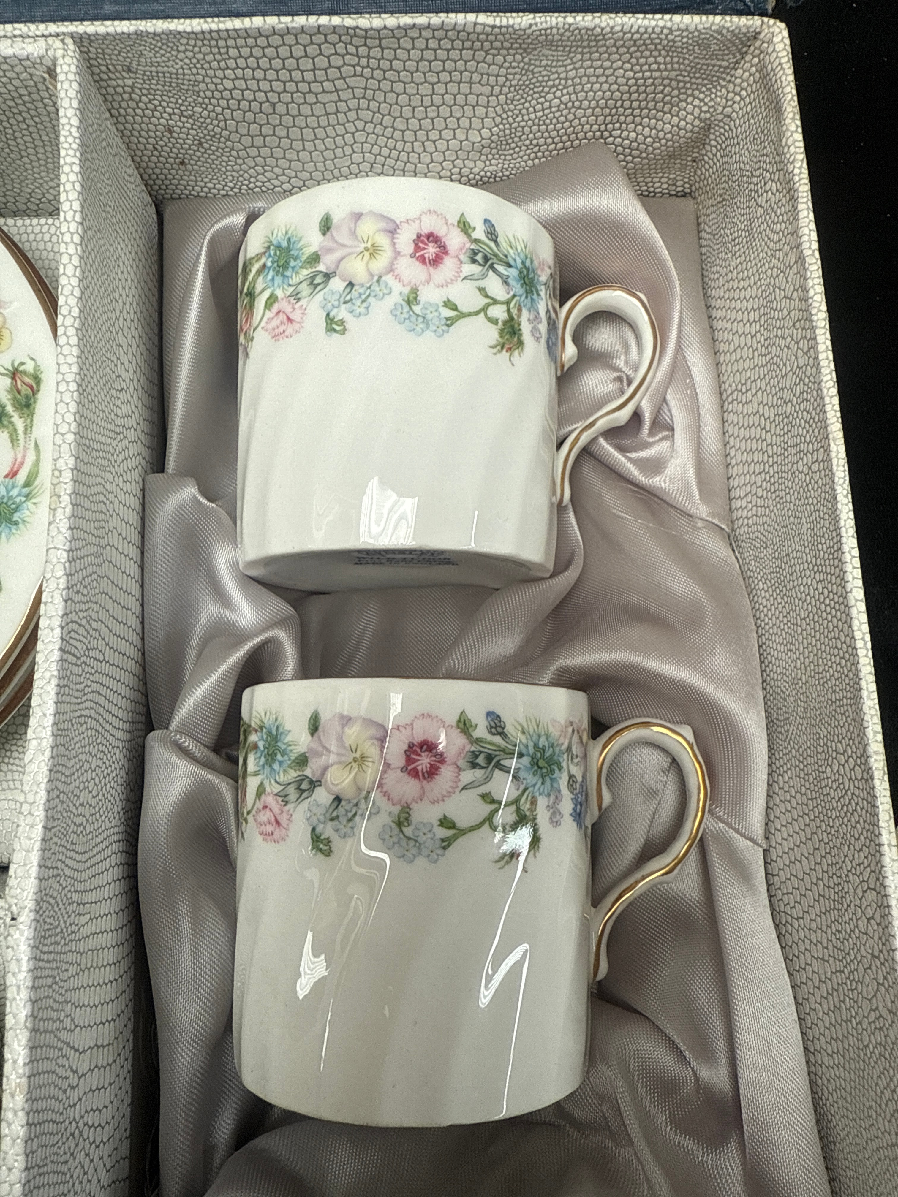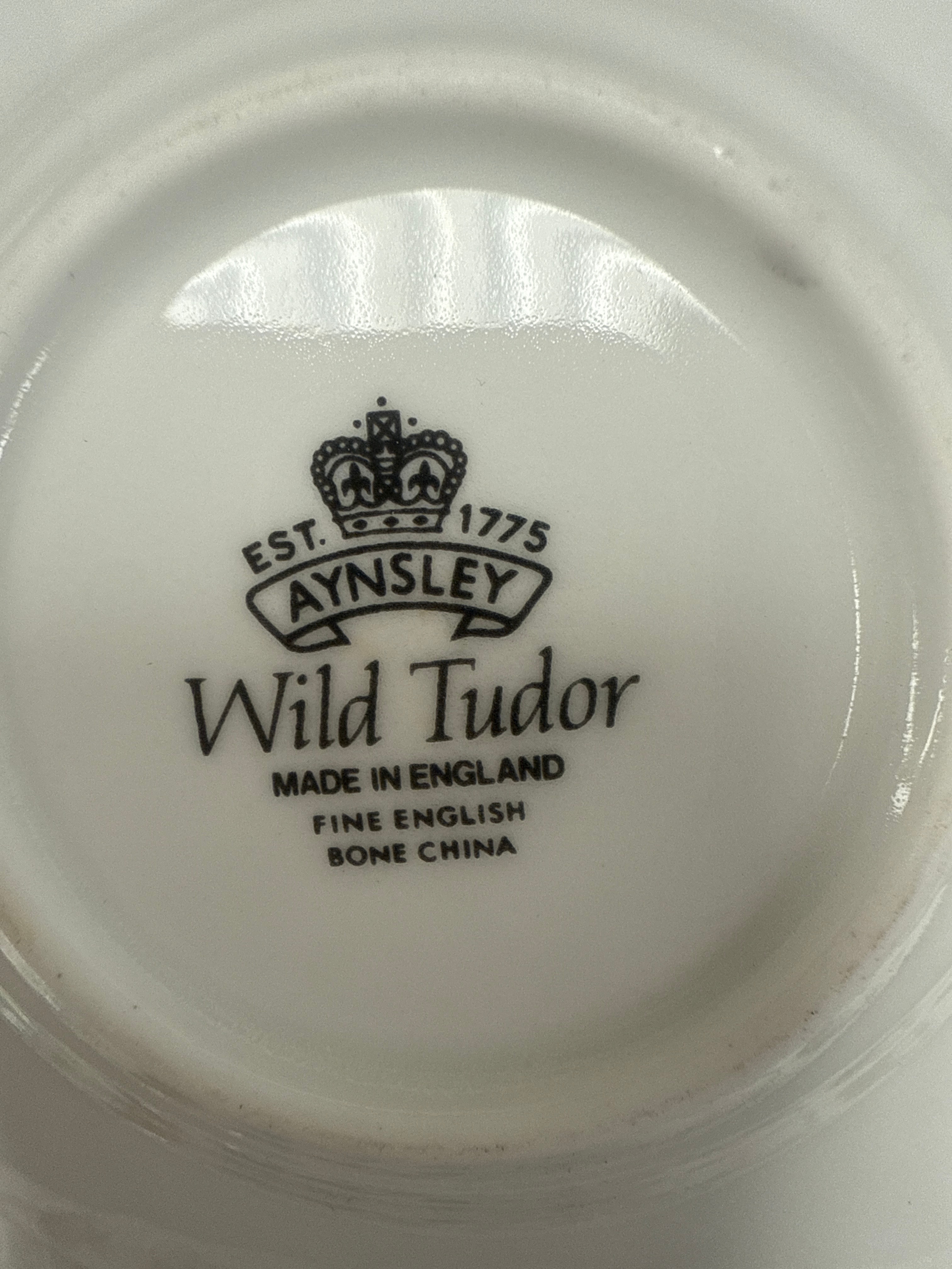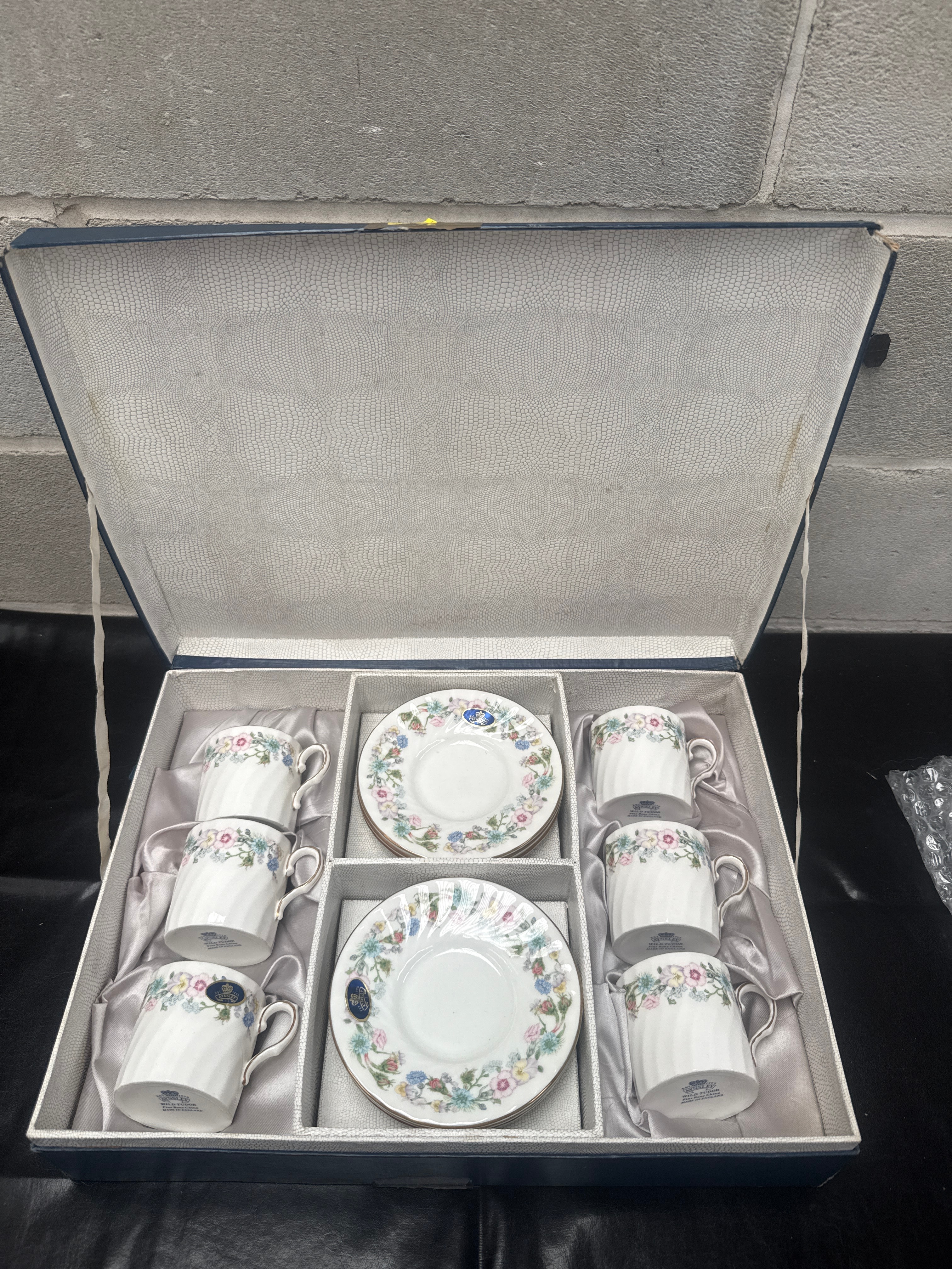 A boxed set of six Aynsley ‘Wild Tudor’ demitasse cups and six matching saucers. Crafted from fine English bone china, each cup features a fluted body design and a delicate floral pattern around the rim, displaying pink, blue, and green blossoms. Gold-toned accents adorn the cup handles. The set is presented in its original blue-grey hinged presentation box with satin-lined compartments. Visible markings on the base confirm the manufacturer as Aynsley, established 1775, and the pattern name ‘Wild Tudor,’ along with ‘MADE IN ENGLAND.’