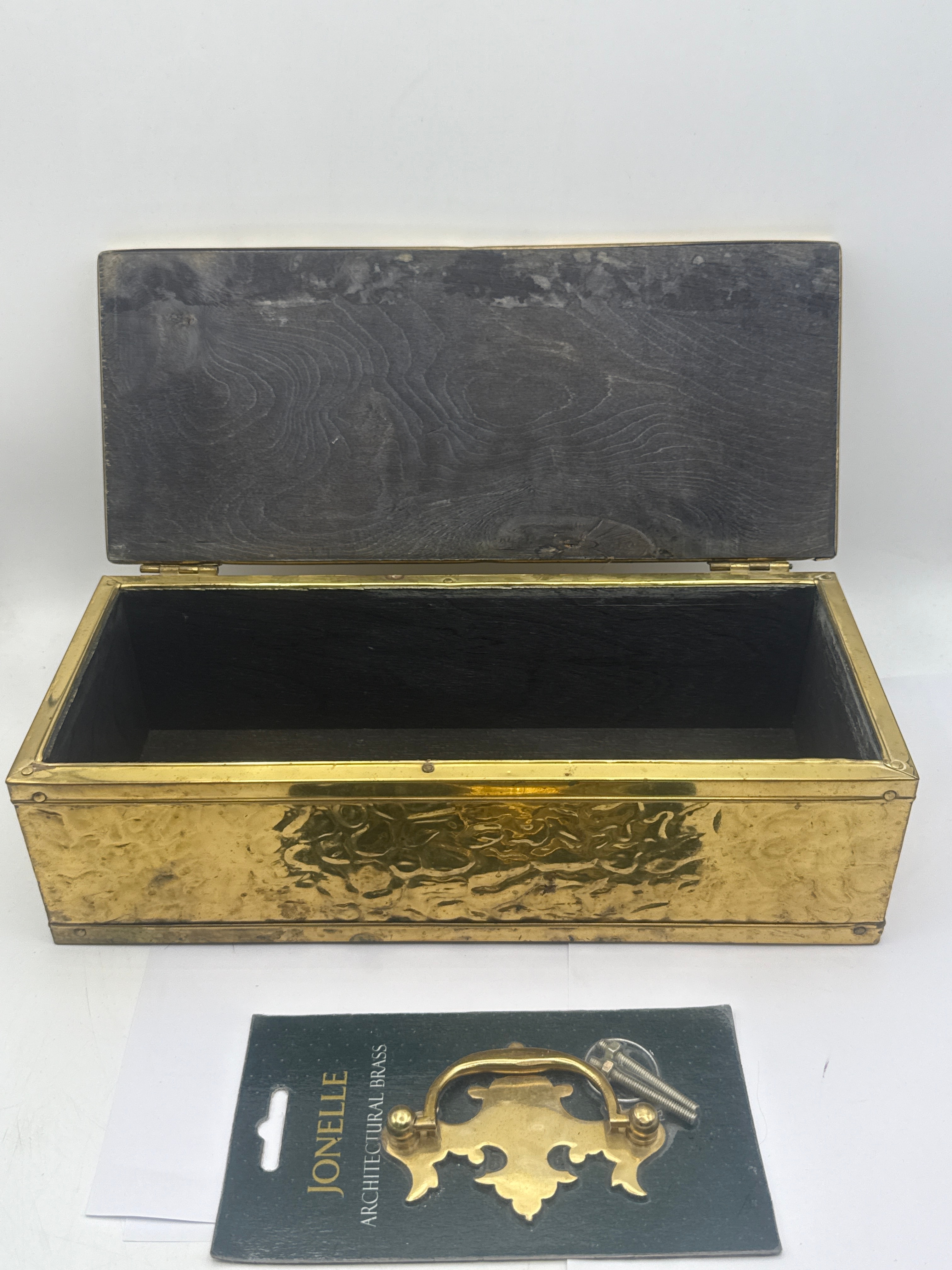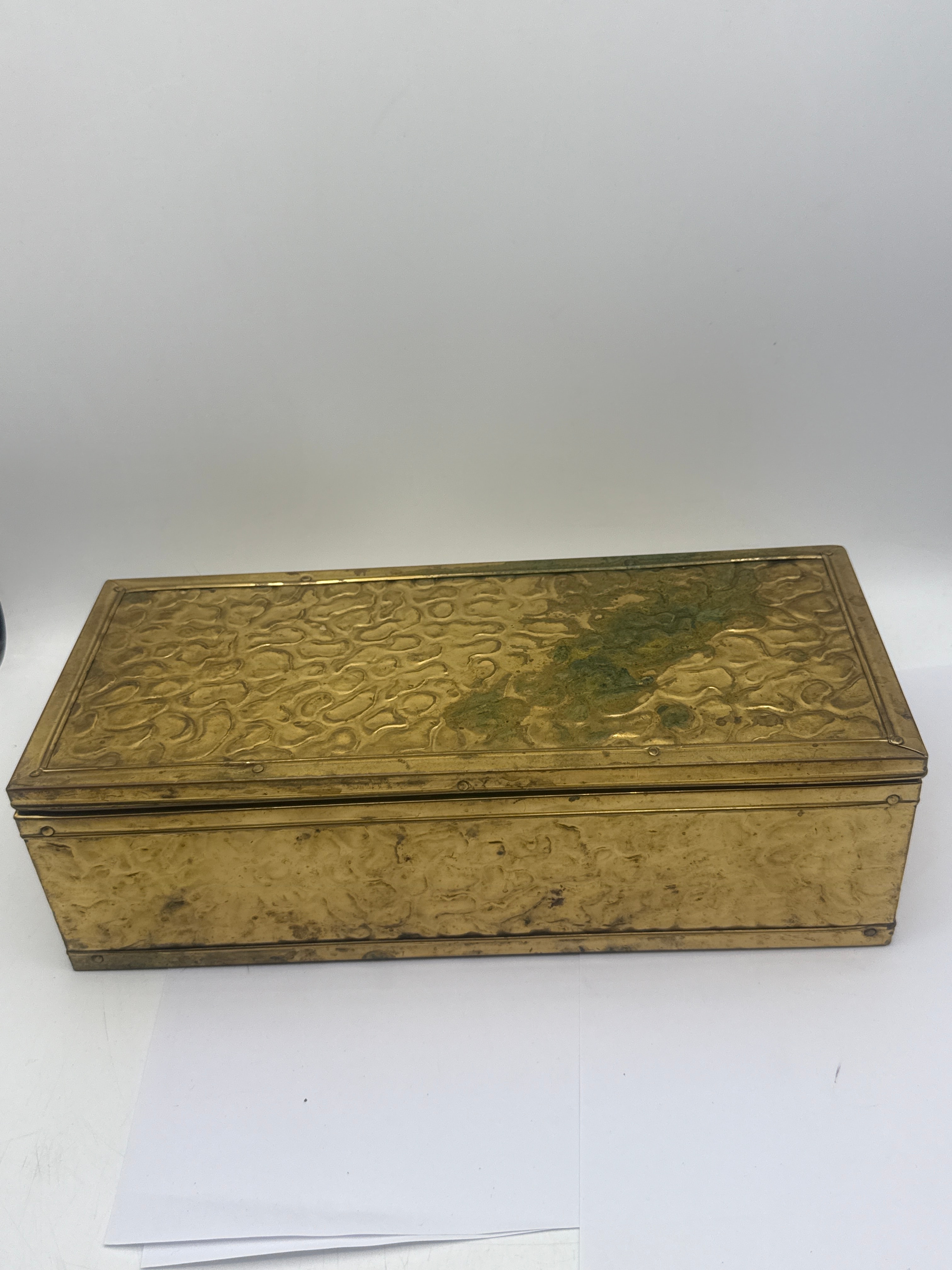 A vintage rectangular brass lidded box, featuring an extensively embossed organic pattern across its lid and sides. The interior is lined with dark wood. 12 X 3 X 5”