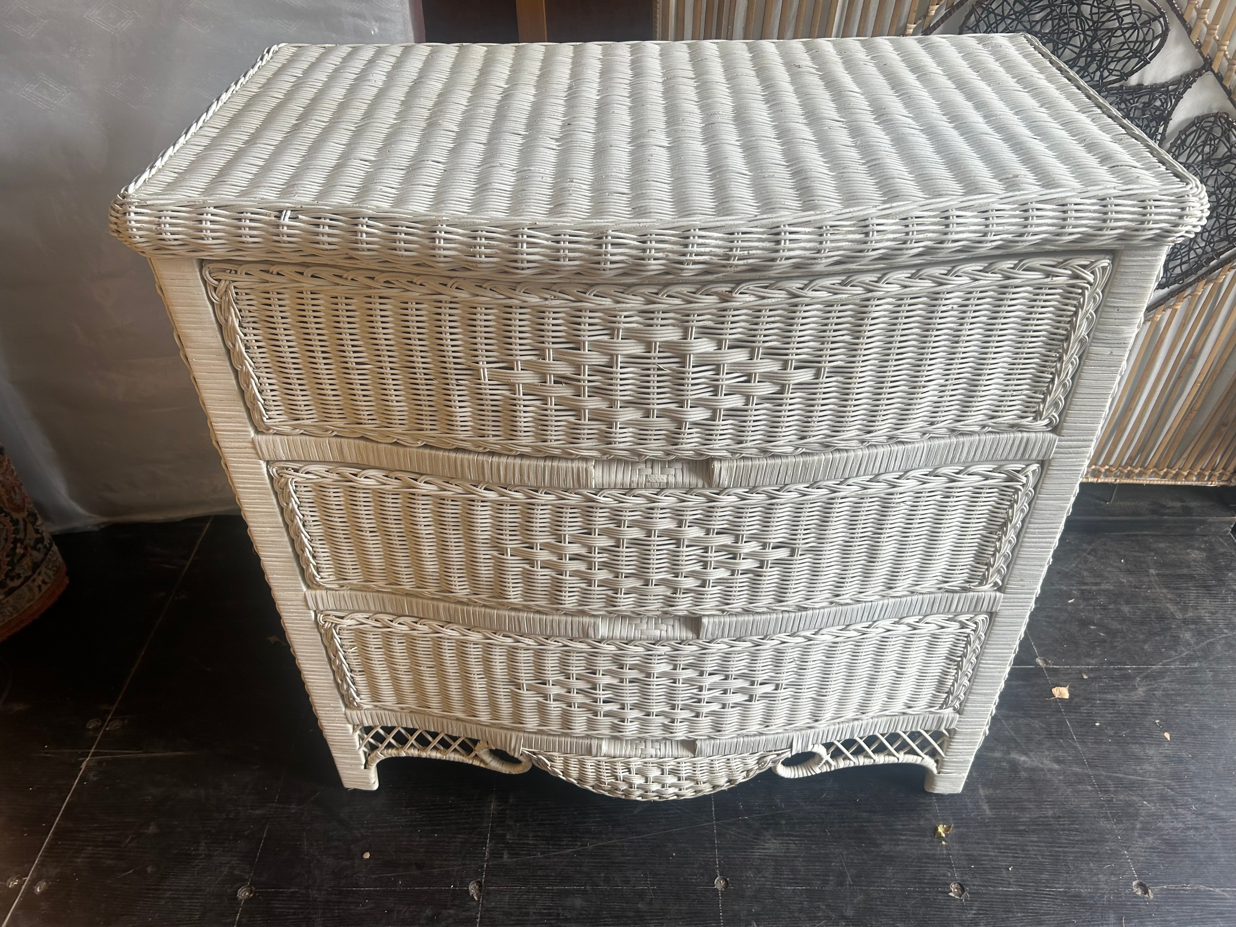A white-painted wicker chest of drawers, featuring a rectangular top and a subtly curved front. The chest is fitted with three full-width drawers, each with woven panels. The base incorporates a decorative curved apron with open lattice work. Constructed entirely from woven wicker or rattan.