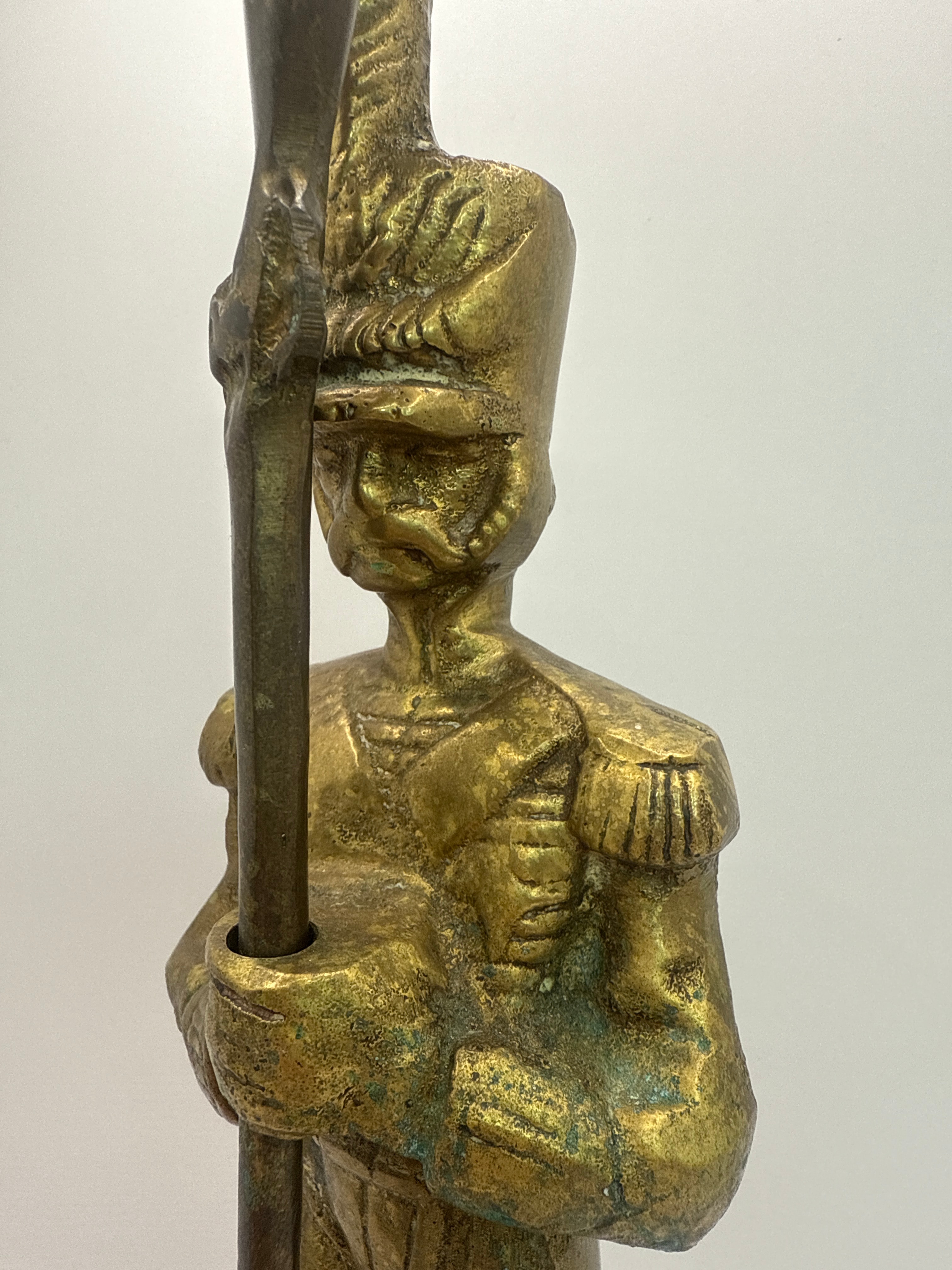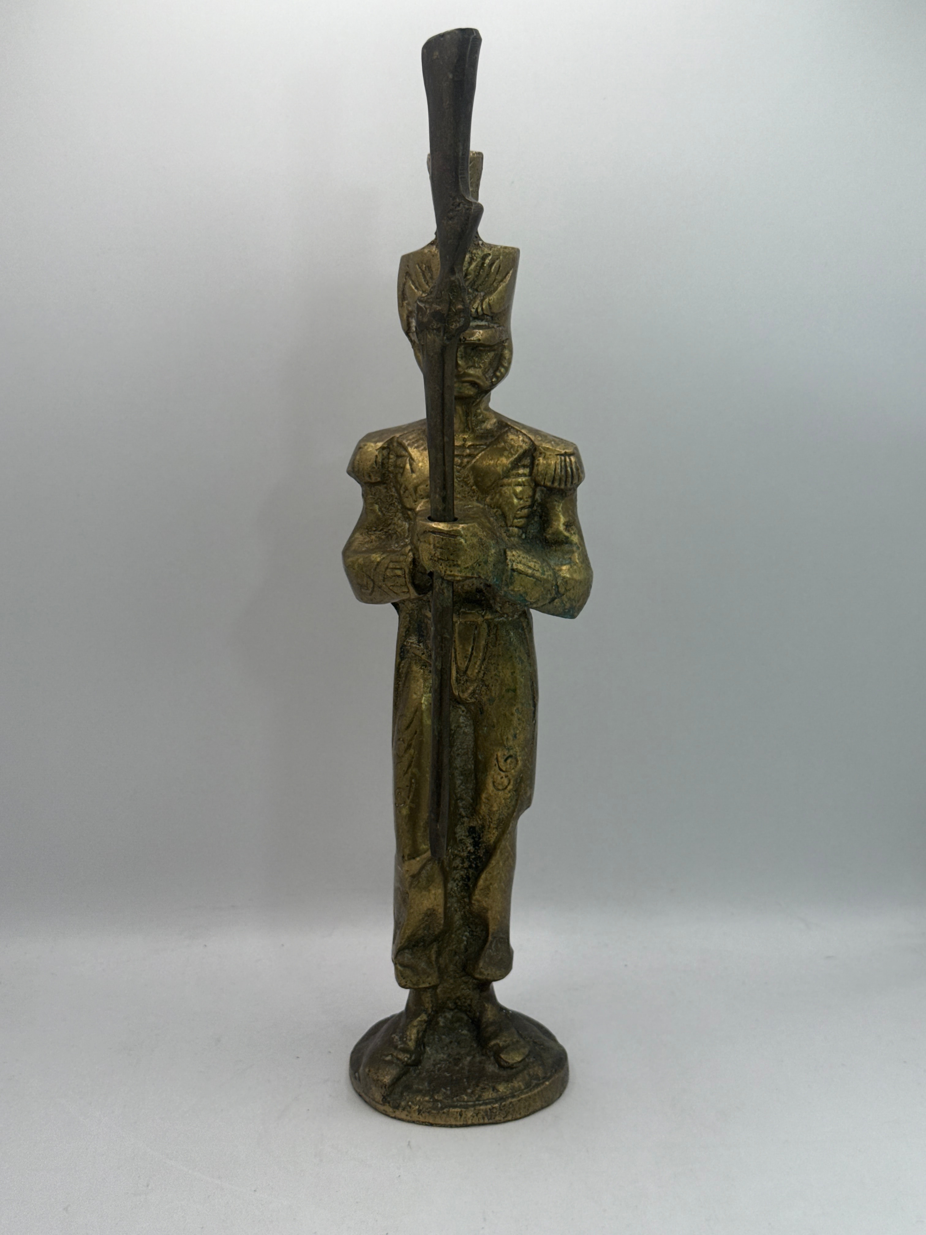 A standing military or ceremonial guard figure sculpture, crafted from brass, depicting a historical uniform complete with a shako-style hat and epaulets, holding a long staff vertically. The item is a single cast figural sculpture.