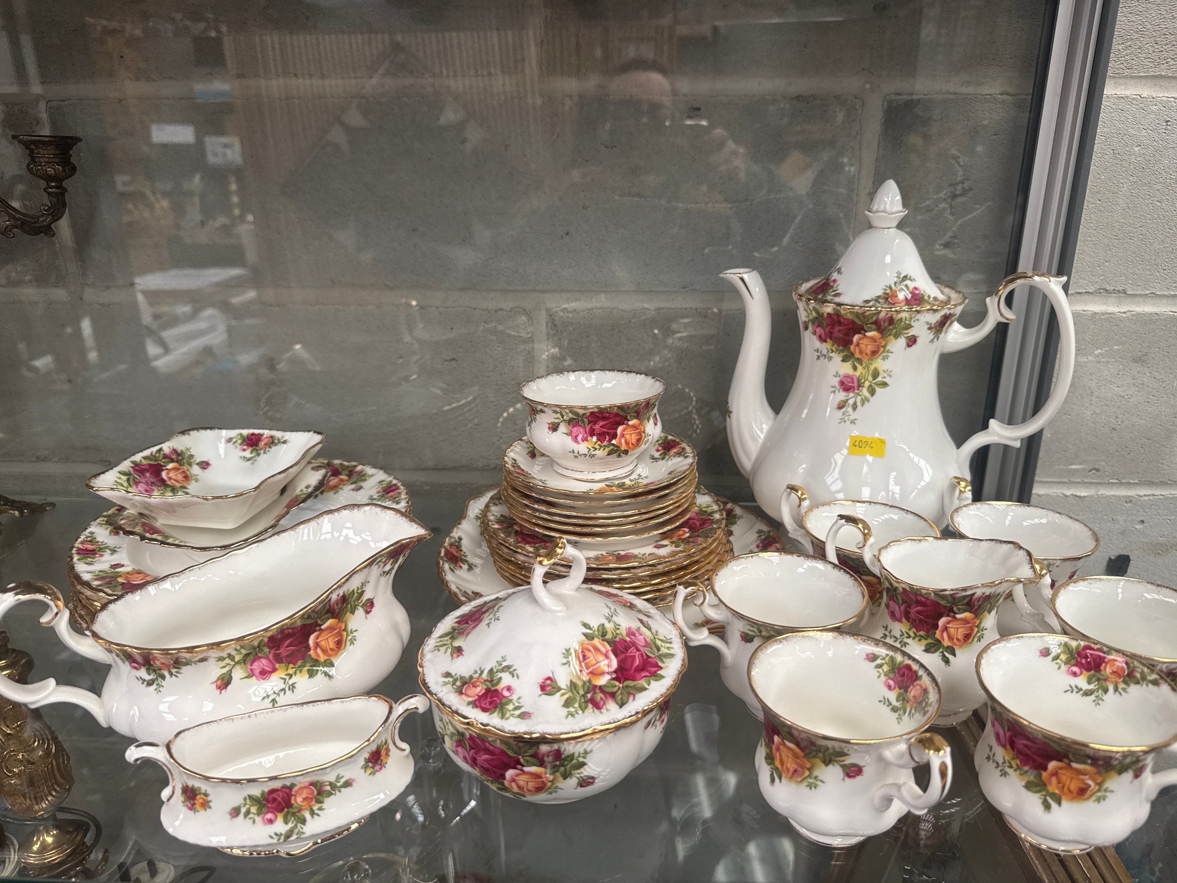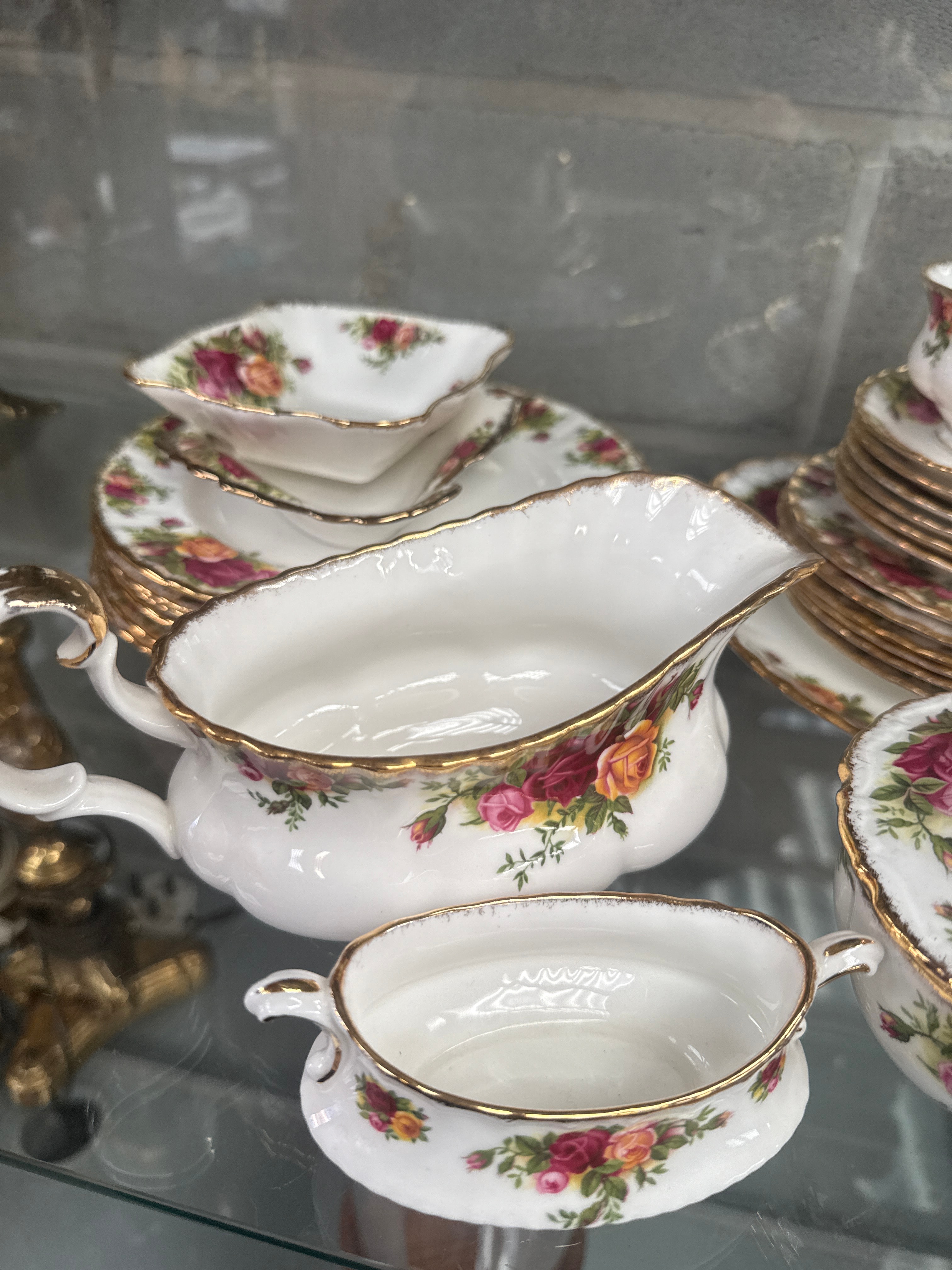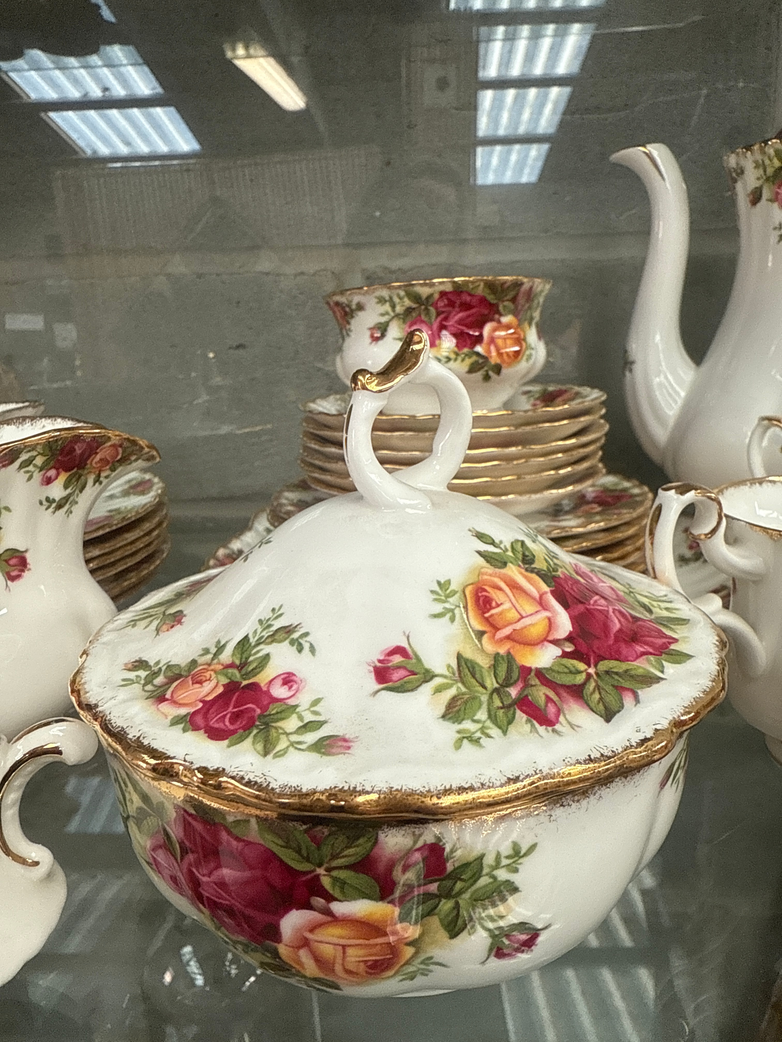 A Royal Albert ‘Old Country Roses’ dinner and tea service, comprising 32 pieces. Each item is unified by a prominent floral pattern depicting clusters of pink, red, and yellow roses with green foliage, elegantly edged with gold-gilt trim. The collection includes a teapot, a covered serving tureen, a gravy boat, multiple teacups, saucers, and various serving dishes. The overall aesthetic suggests a traditional or classic style. The items are of porcelain or bone china construction. A yellow sticker displaying “£30” is affixed to the teapot.