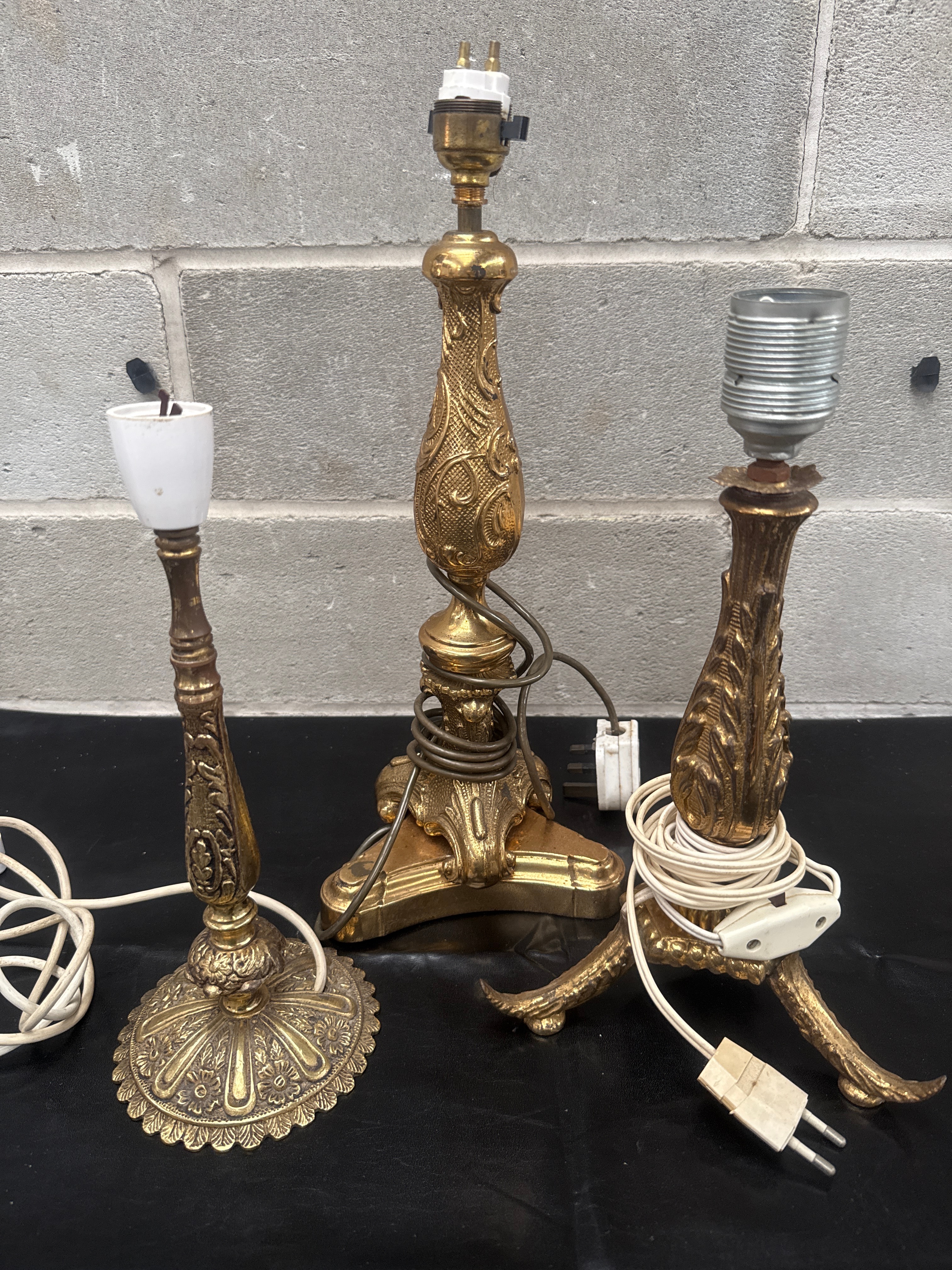 Three electrified brass candlestick table lamps. Crafted from Brass & Other materials, each base exhibits ornate styling reminiscent of Baroque, Rococo, or Neoclassical revival periods. Designs feature intricate cast or molded details including scrollwork, acanthus leaves, and floral motifs. Each lamp is equipped with electrical components, including various white or silver-toned sockets, white or darker electrical cords, and two European-style two-pin plugs, one of which incorporates an inline switch. No discernible manufacturer’s marks or legible text are visible.