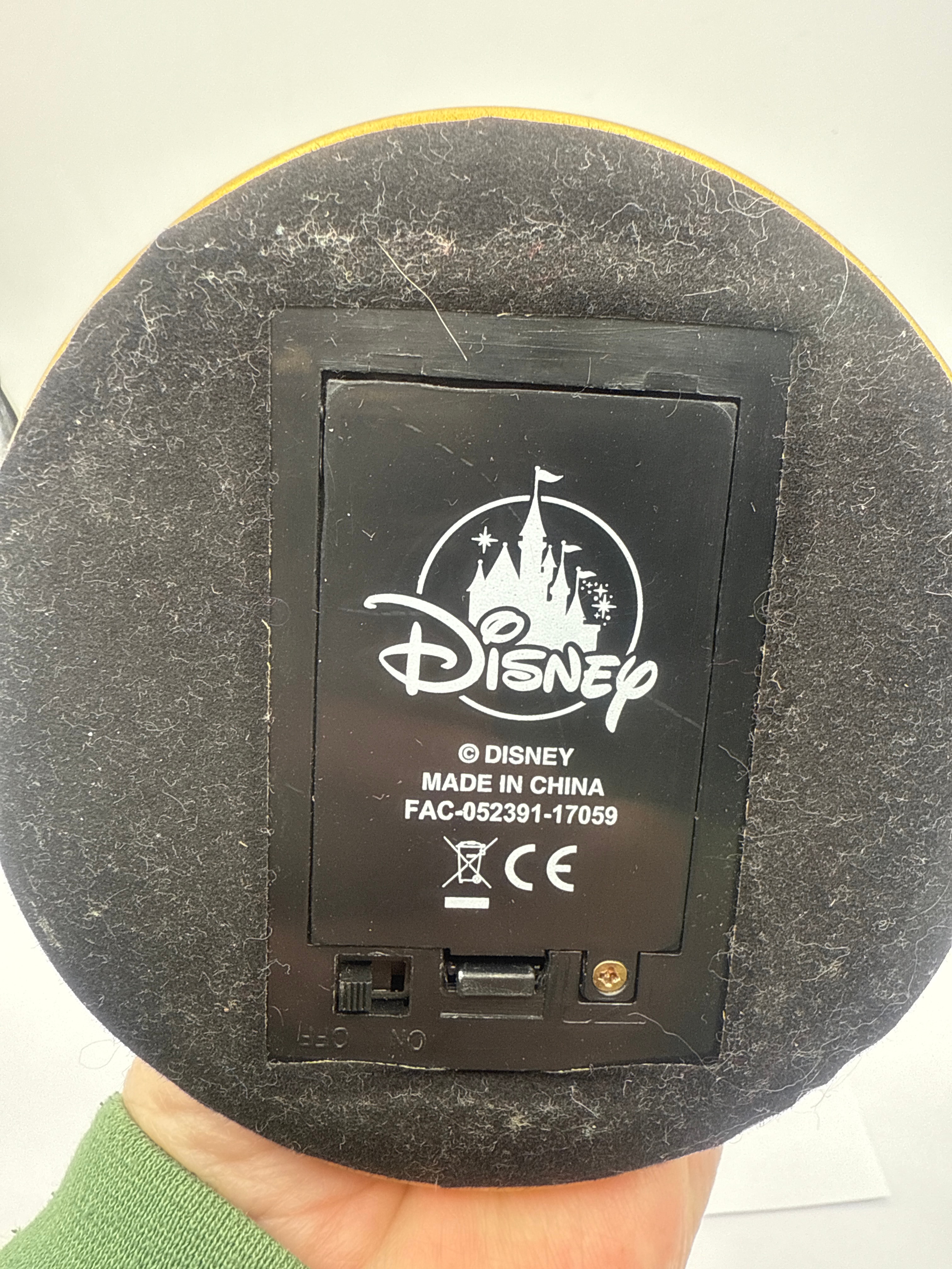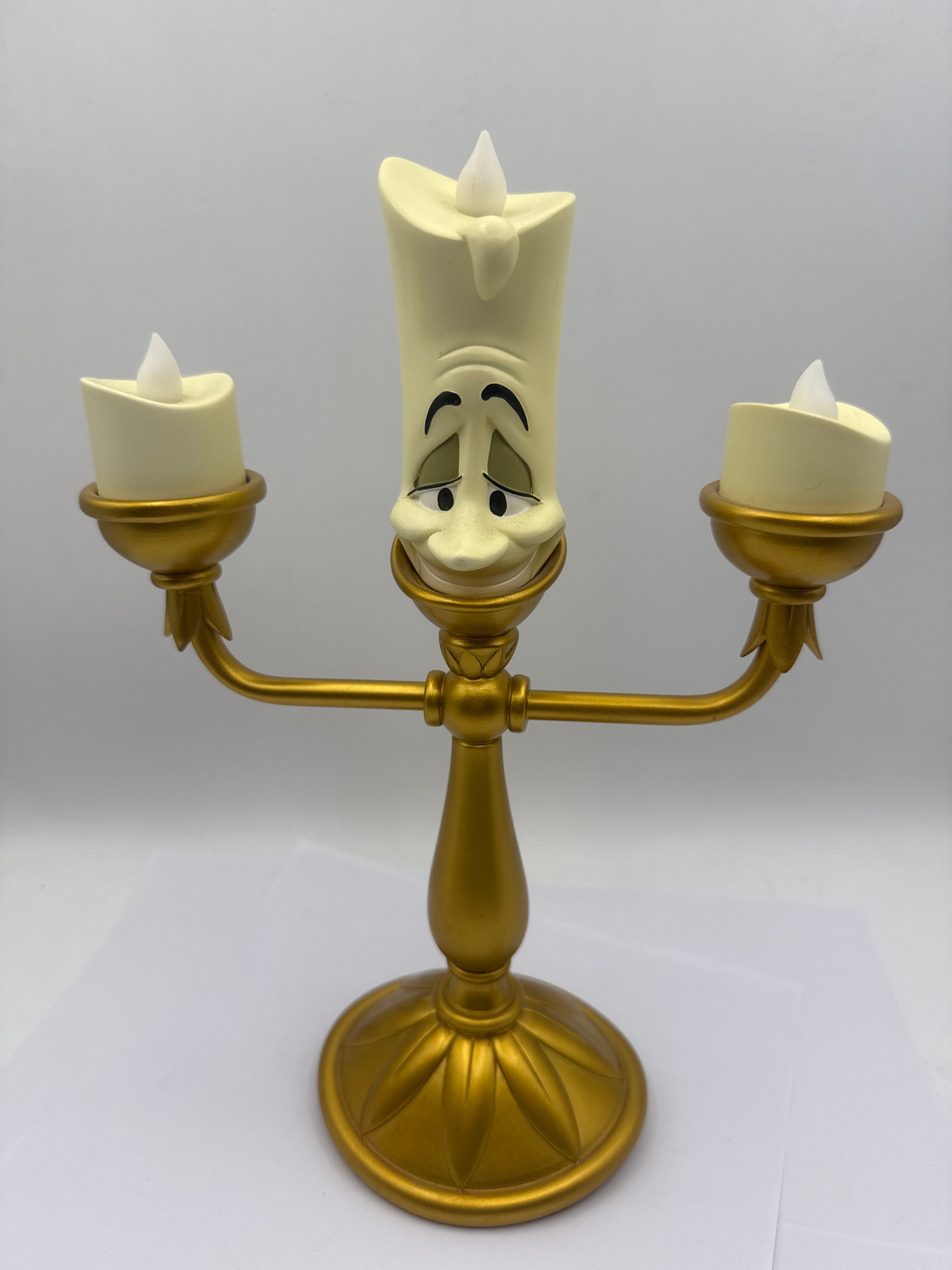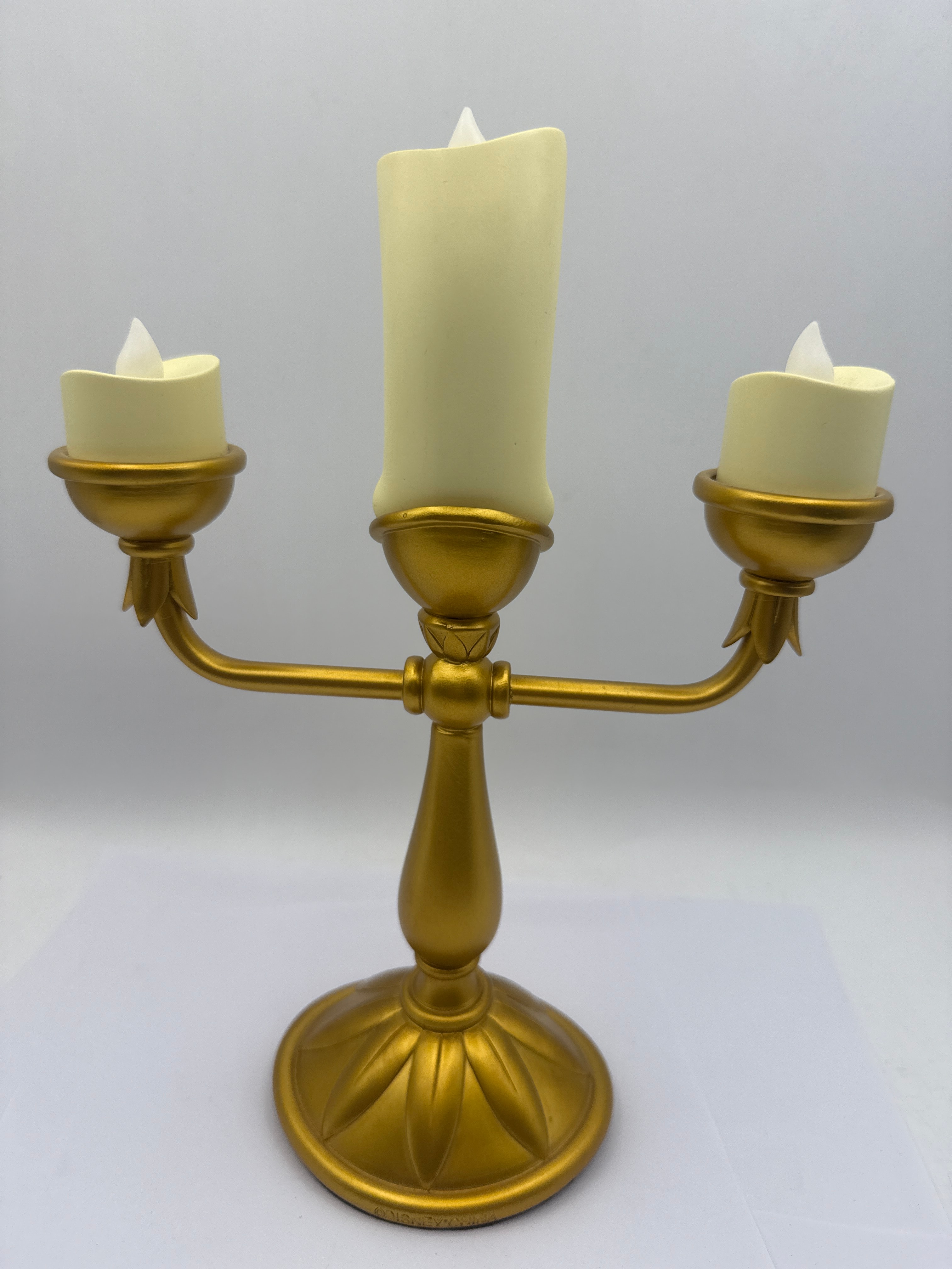 A Disney Parks Beauty and the Beast Lumiere Light-Up Candelabra Figure. Crafted from molded plastic or resin, this modern electric candelabra features a gold-painted base and arms in a traditional design. It supports three cream-colored candle-form elements, each with a flickering translucent LED ‘flame.’ The central ‘candle’ is anthropomorphic, depicting Lumiere with a smiling face, prominent eyebrows, eyes, and a mouth. The underside of the base is covered with black felt and contains a plastic battery compartment plate marked with the ‘Disney’ castle logo, ‘© DISNEY,’ ‘MADE IN CHINA,’ production code ‘FAC-052391-17059,’ a crossed-out wheeled bin symbol, and a ‘CE’ mark, alongside an ‘ON OFF’ switch.