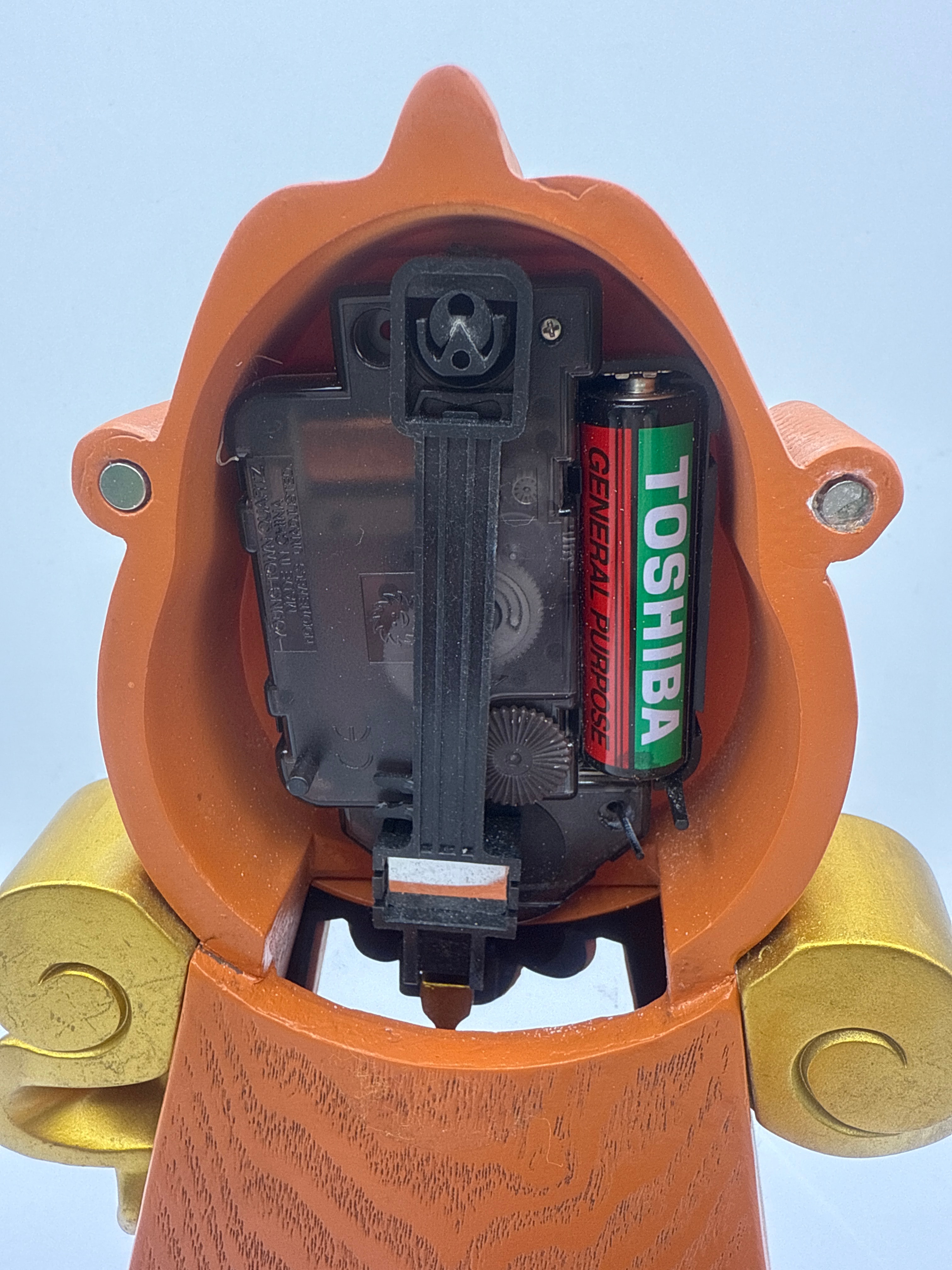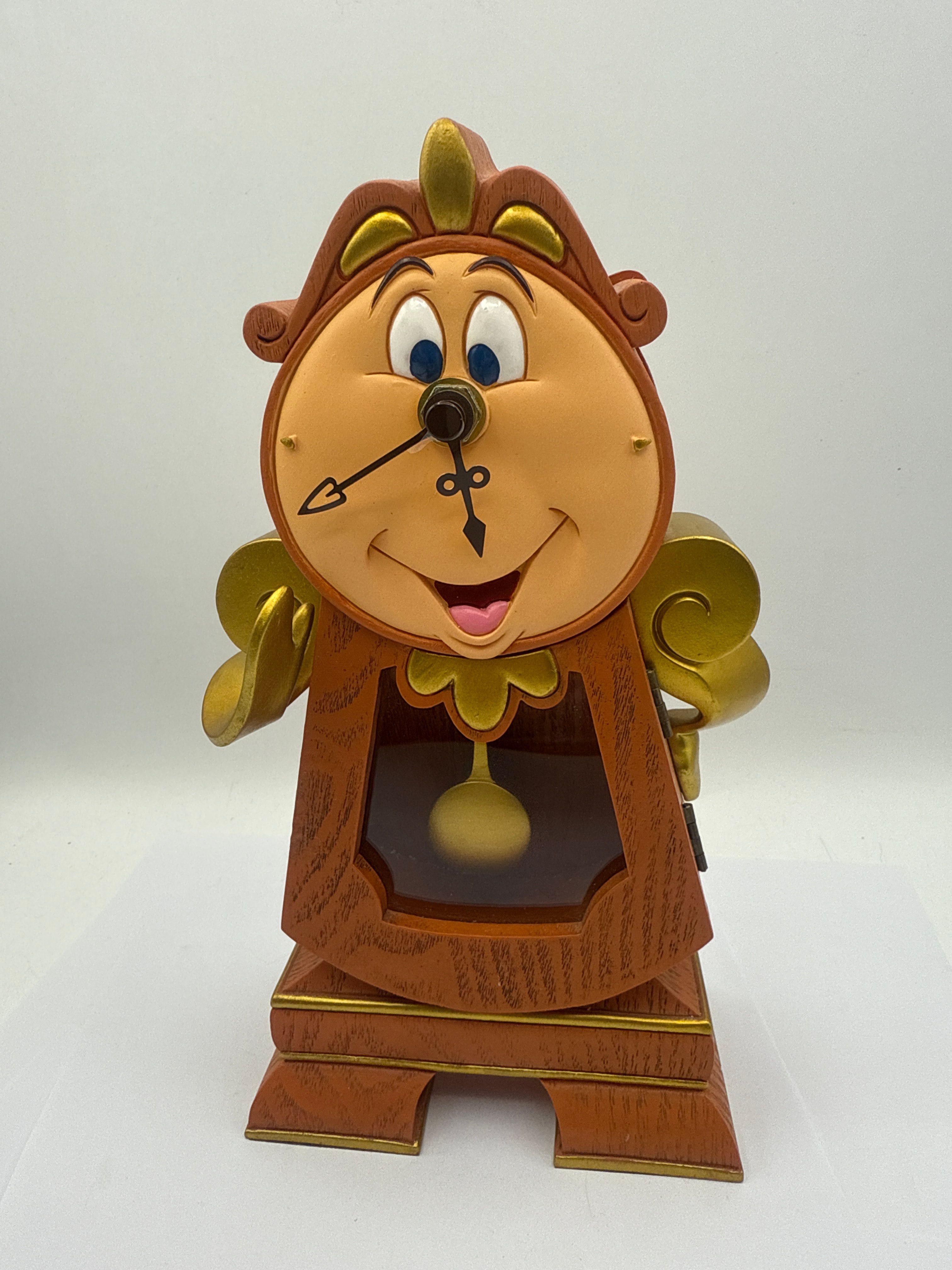 A Disney ‘Beauty & The Beast’ Cogsworth Clock. This modern, anthropomorphic mantel or desk clock is crafted from molded plastic or resin, painted to simulate a wood grain finish with gold accents. The upper section features a stylized human face with animated features, serving as the clock dial with black baton hands. A pendulum is visible through a clear panel in the lower body. The reverse reveals a standard black plastic quartz movement, powered by a Toshiba ‘GENERAL PURPOSE’ battery.