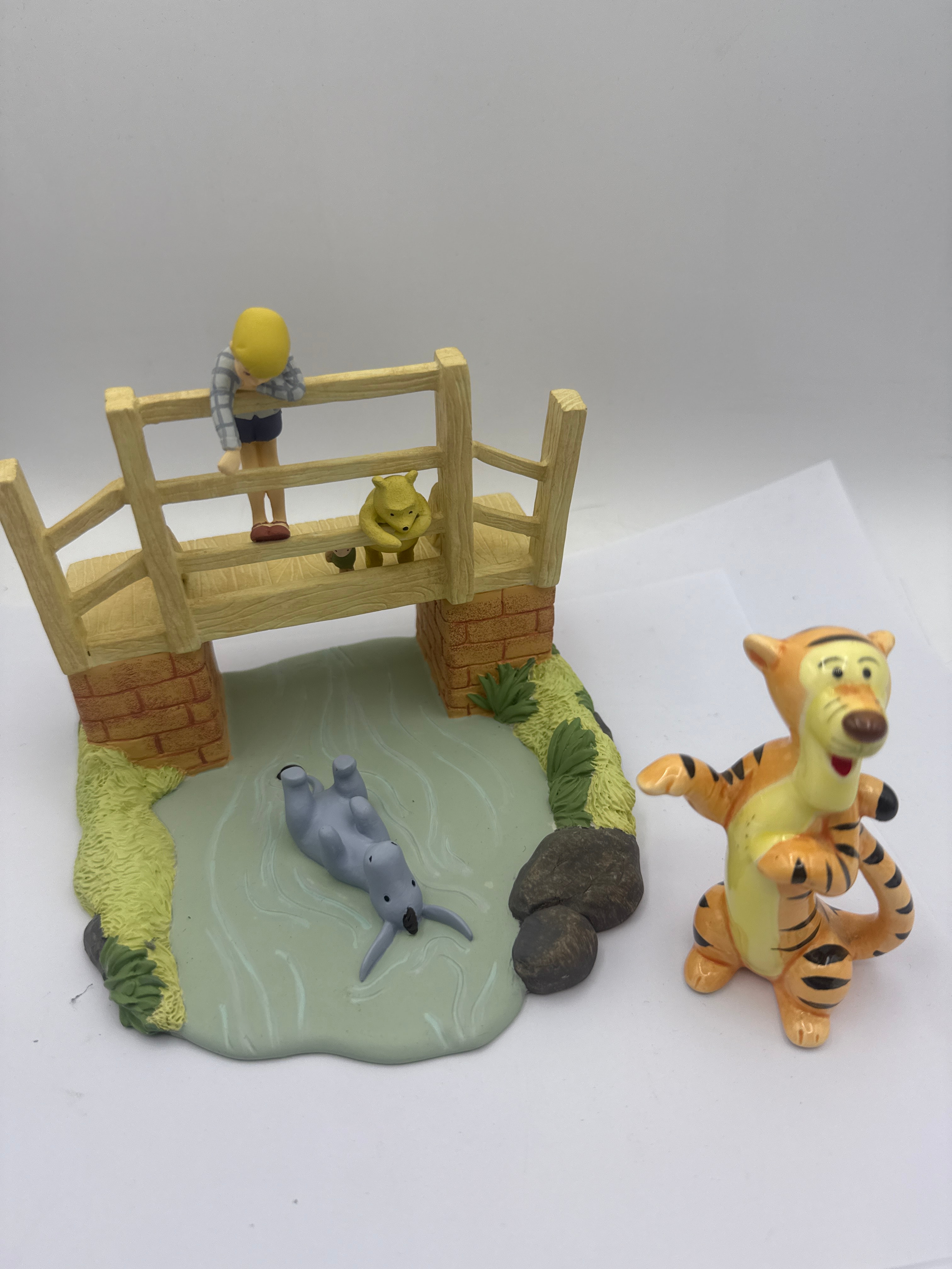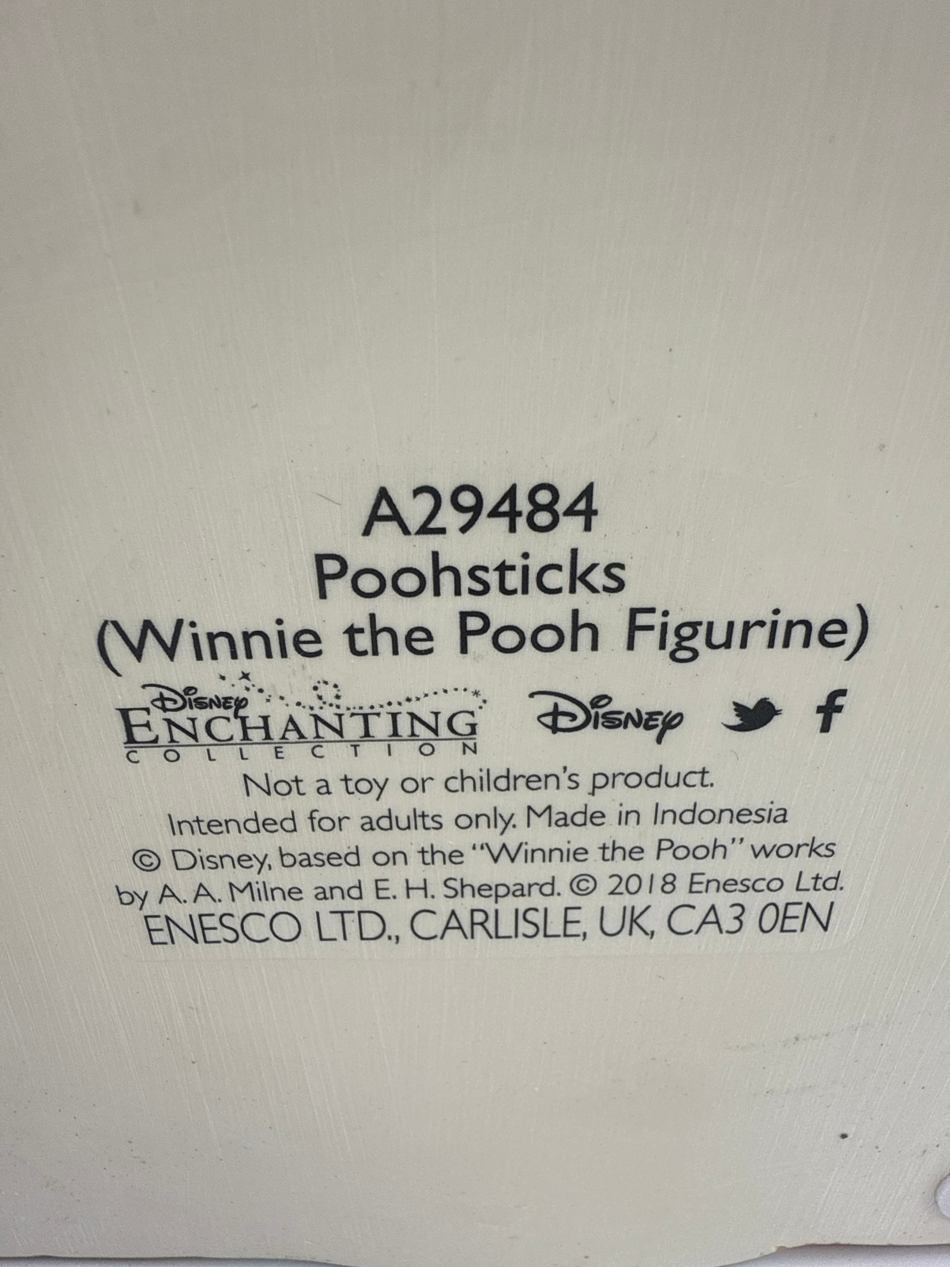 An ‘Enchanting Disney Poohsticks Classic Pooh’ figurine set by Enesco, copyrighted 2018. Depicting the iconic scene from Winnie the Pooh, the set comprises a central diorama base featuring a wooden-style bridge over sculpted water, with figurines of Christopher Robin and Winnie the Pooh on the bridge and Eeyore floating in the water below. A separate, larger Tigger figurine is also included. Crafted from hand-painted resin or a similar composite material. The underside is marked ‘A29484 Poohsticks (Winnie the Pooh Figurine),’ ‘Not a toy or children’s product. Intended for adults only. Made in Indonesia,’ and ‘© 2018 Enesco Ltd.’