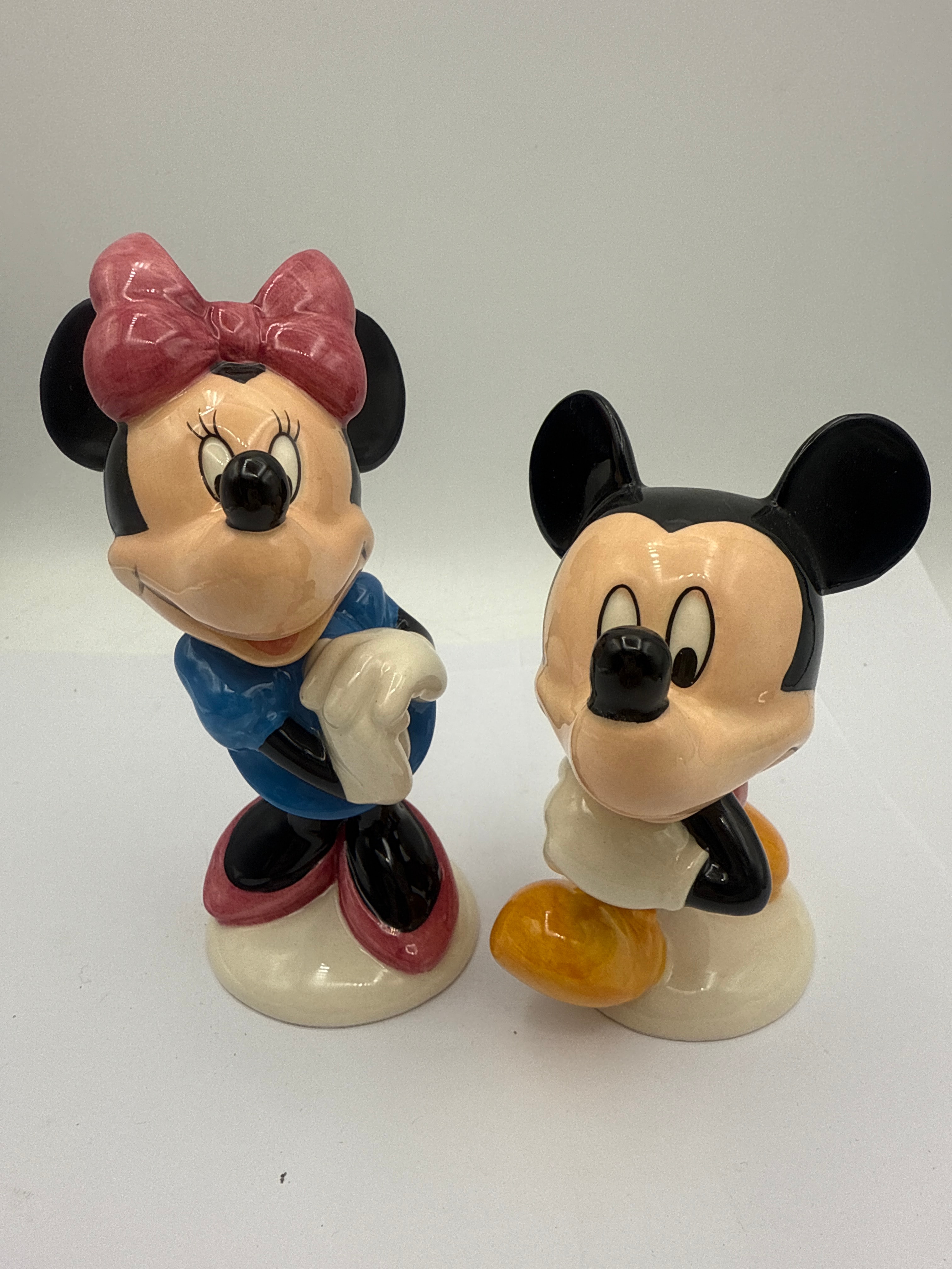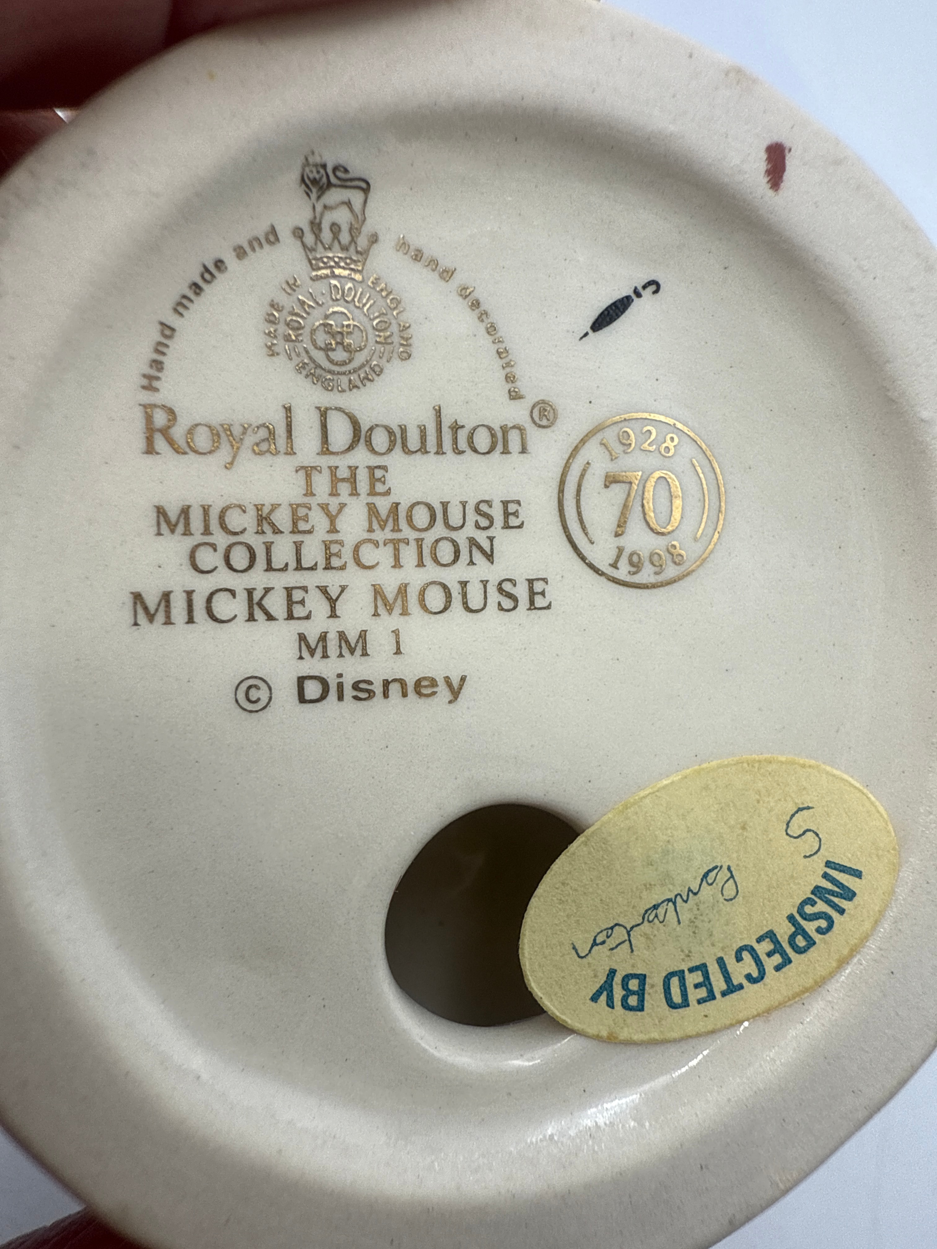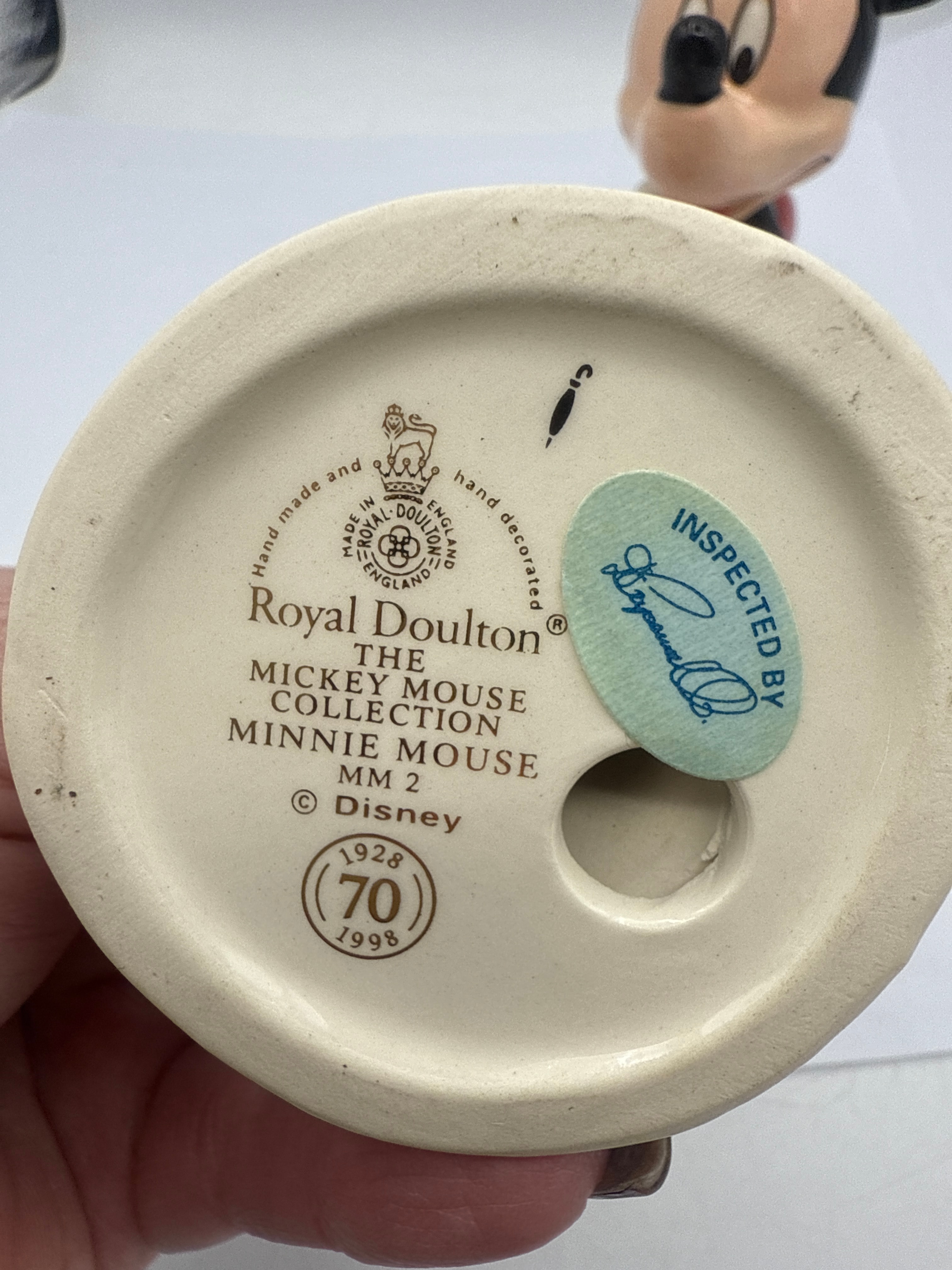 A pair of Royal Doulton ‘The Mickey Mouse Collection’ 70th Anniversary glazed ceramic figurines, depicting Mickey Mouse (MM1) and Minnie Mouse (MM2). Each figure features the Royal Doulton crown and lion mark, stating ‘MADE IN ENGLAND’ and ‘Hand made and hand decorated,’ along with a ‘© Disney’ copyright. The bases also bear a commemorative mark ‘1928 70 1998,’ indicating a 70th-anniversary edition, and ‘INSPECTED BY’ stickers.