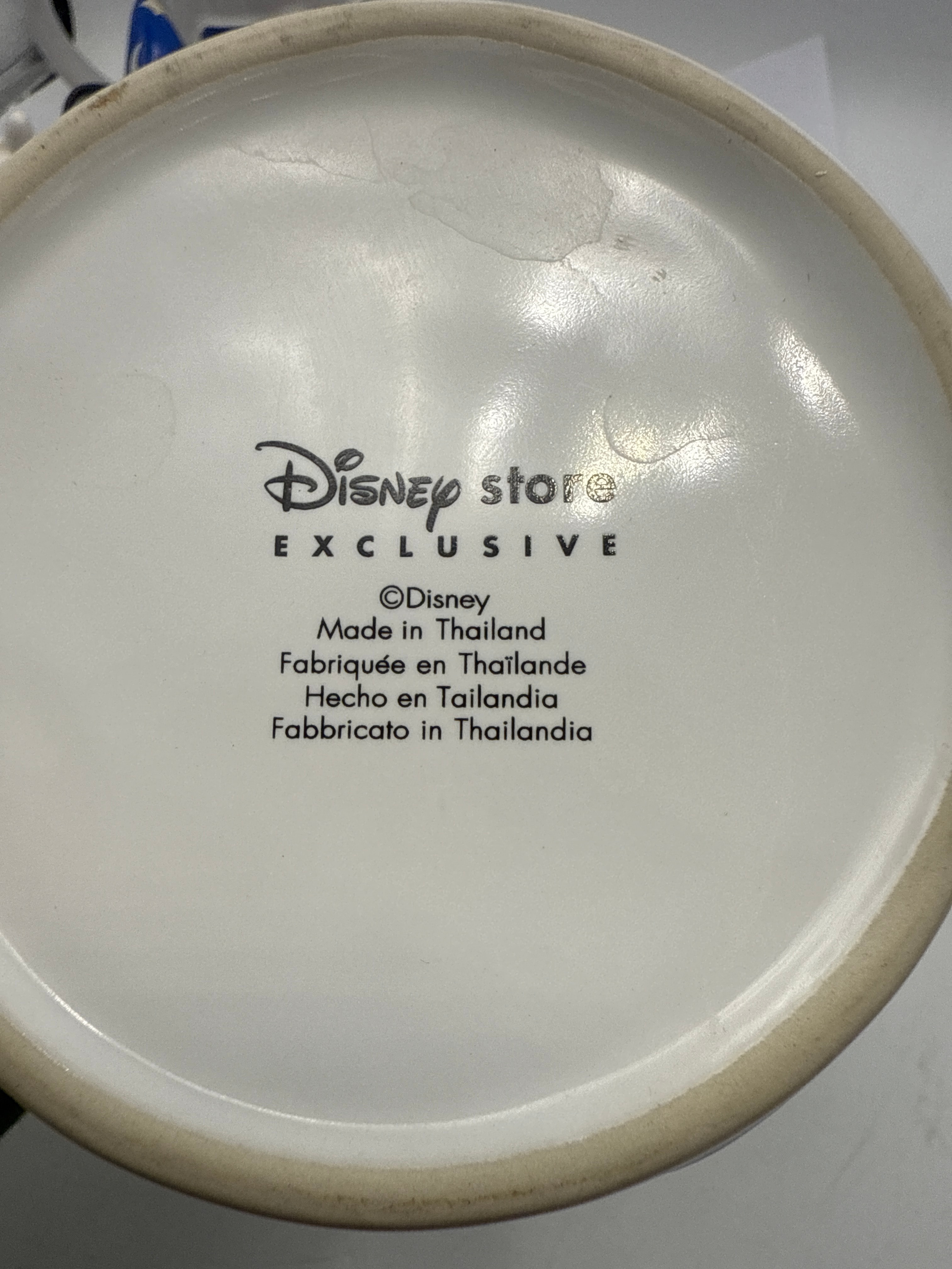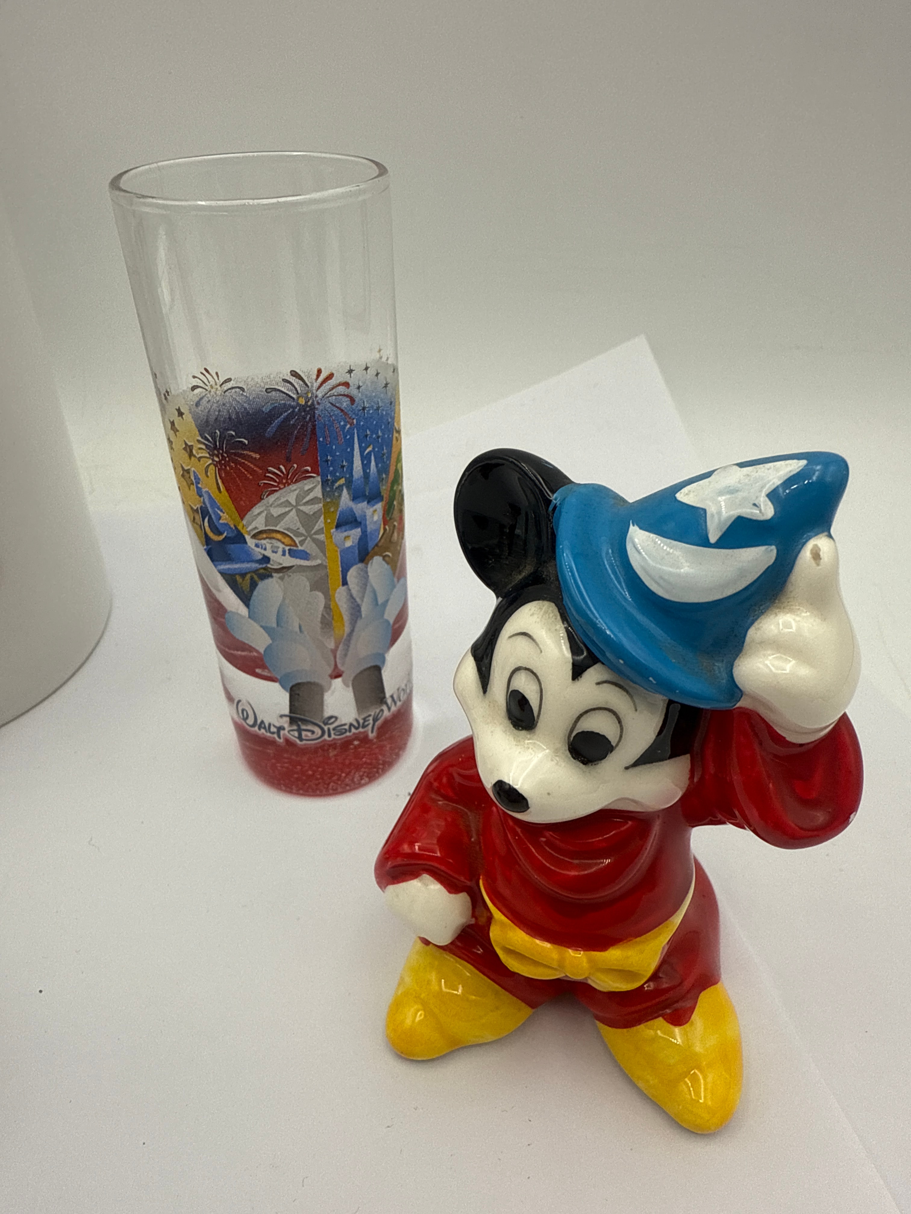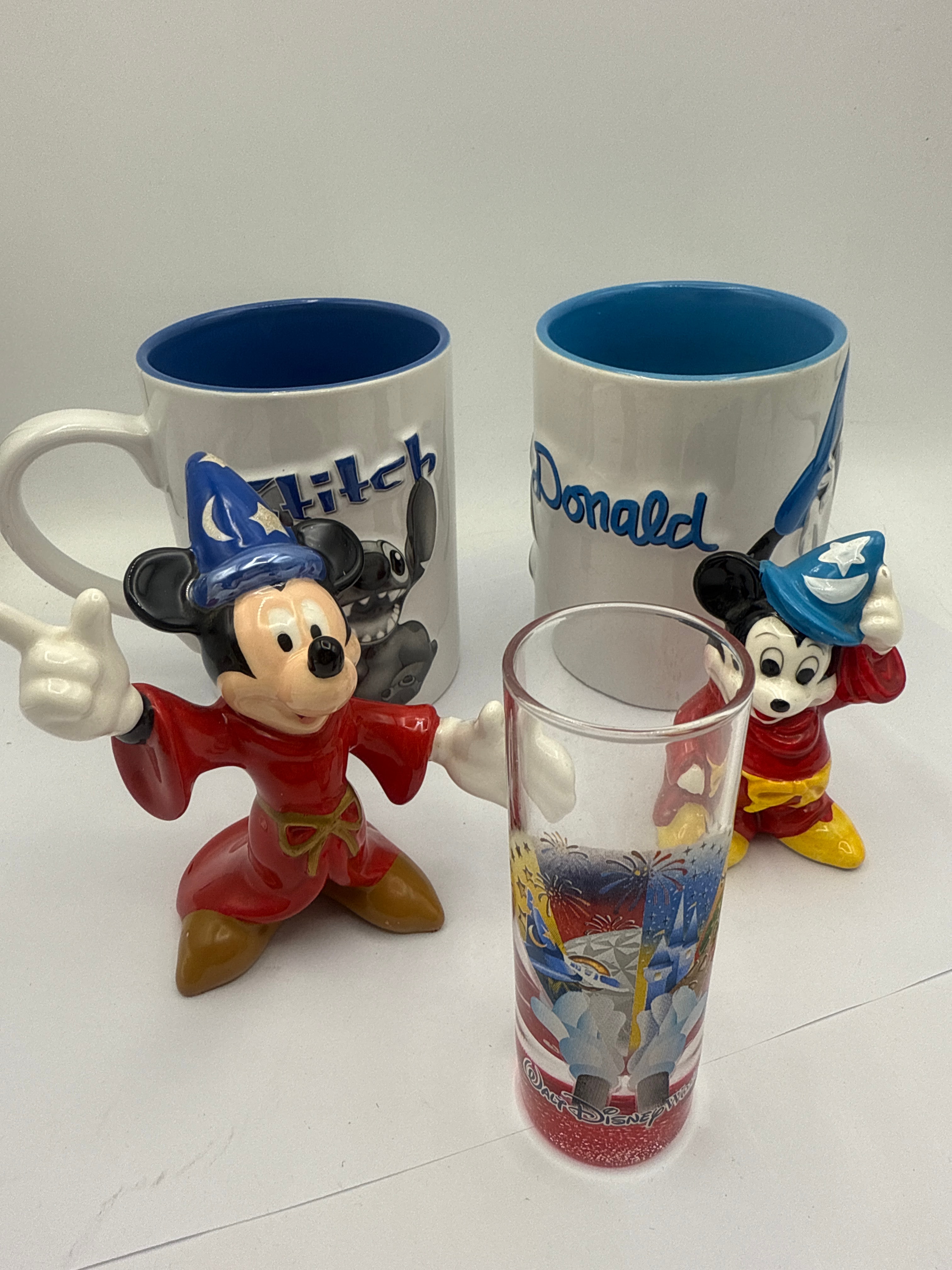 This group comprises five Disney-branded collectibles. It features two ceramic figurines depicting Sorcerer Mickey Mouse in red robes and blue wizard hats; one stands with his hat raised, and the other crouches with his hat on. Also included are two white ceramic mugs with blue interior glazes, one marked “Stitch” with a character graphic and the other displaying “Donald” in script. The lot is completed by one clear glass tumbler featuring a printed scene of a Disney castle with fireworks and partially visible “Walt Disney World” text, set against a red glittered base. All ceramic items are marked on their bases with “Disney store EXCLUSIVE,” “©Disney,” and “Made in Thailand,” with the latter also translated into French, Spanish, and Italian.