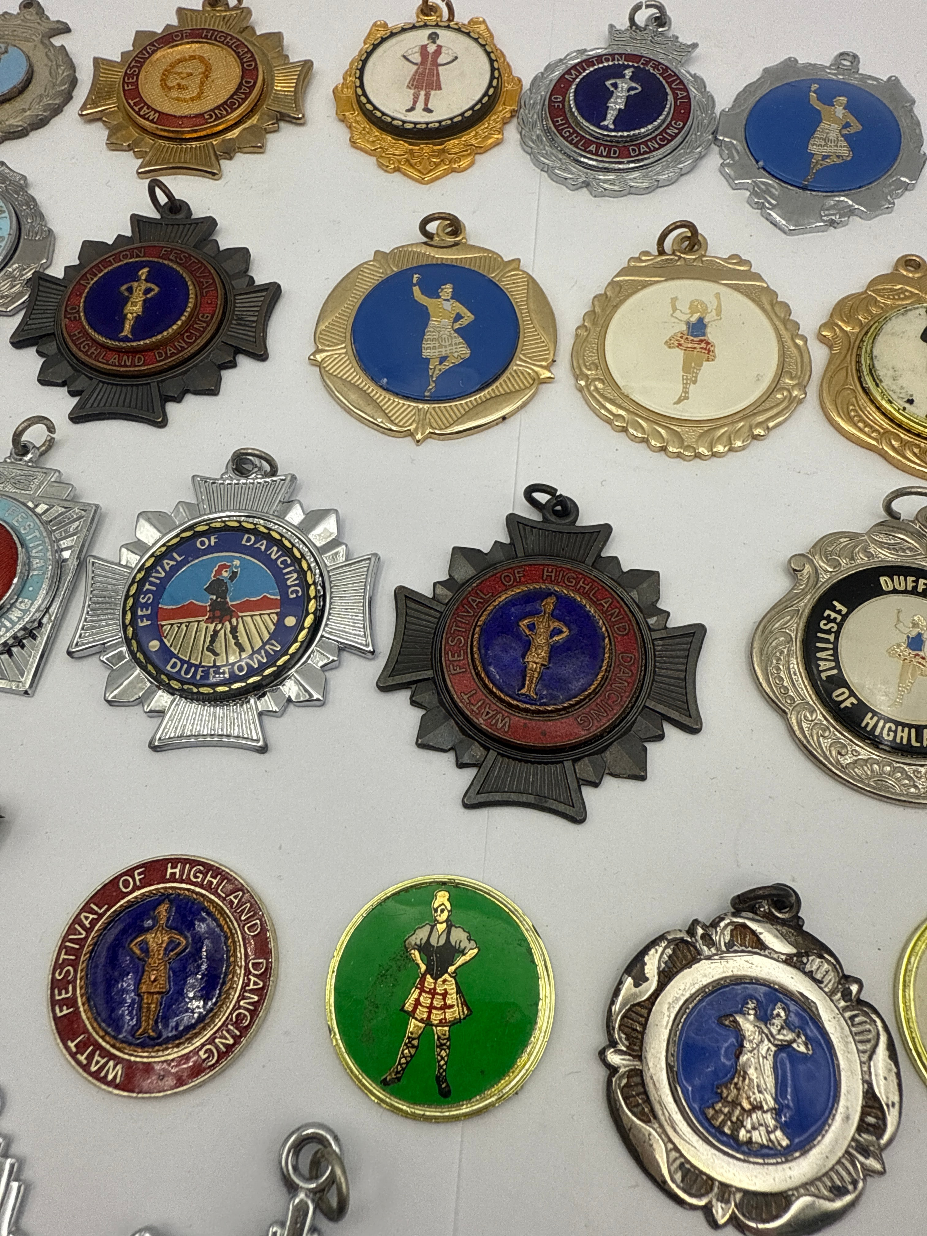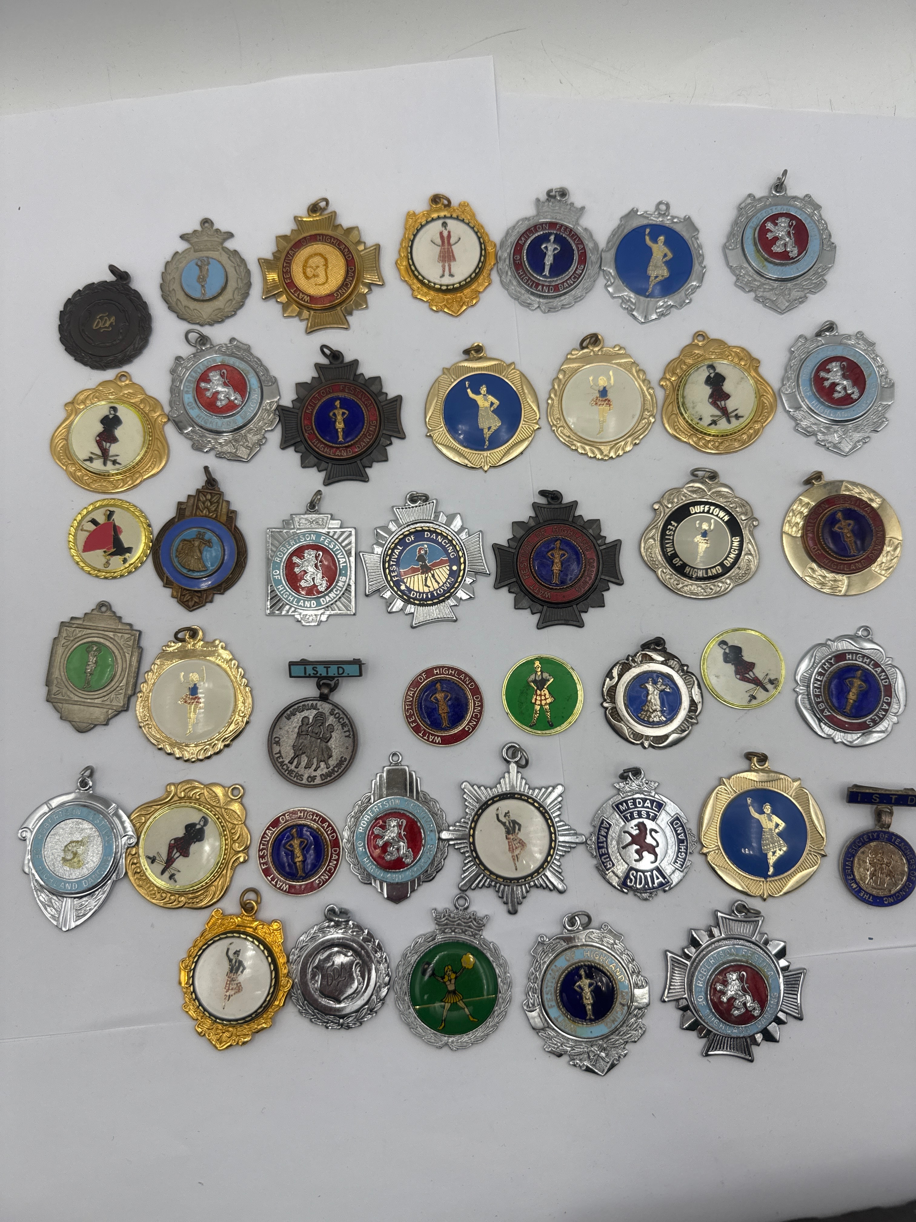 This lot comprises 42 medals, pendants, and pin badges, predominantly crafted from gold-tone, silver-tone, and bronze-tone metals, frequently featuring vibrant enamel or colored plastic inserts. The consistent iconography centers around figures of Scottish Highland dancers in various poses, often accompanied by traditional Scottish motifs such as thistles, laurels, crests, and stars. Visible English text, including “FESTIVAL OF HIGHLAND DANCING,” “DUFFTOWN,” “WATT,” “MEDAL,” “JUNIOR CHAMPION,” “S.D.T.A.,” and “B.A.T.D.,” indicates their origin from competitive Highland dance events. Stylistically, the items date from the mid-20th century to the early 21st century.
