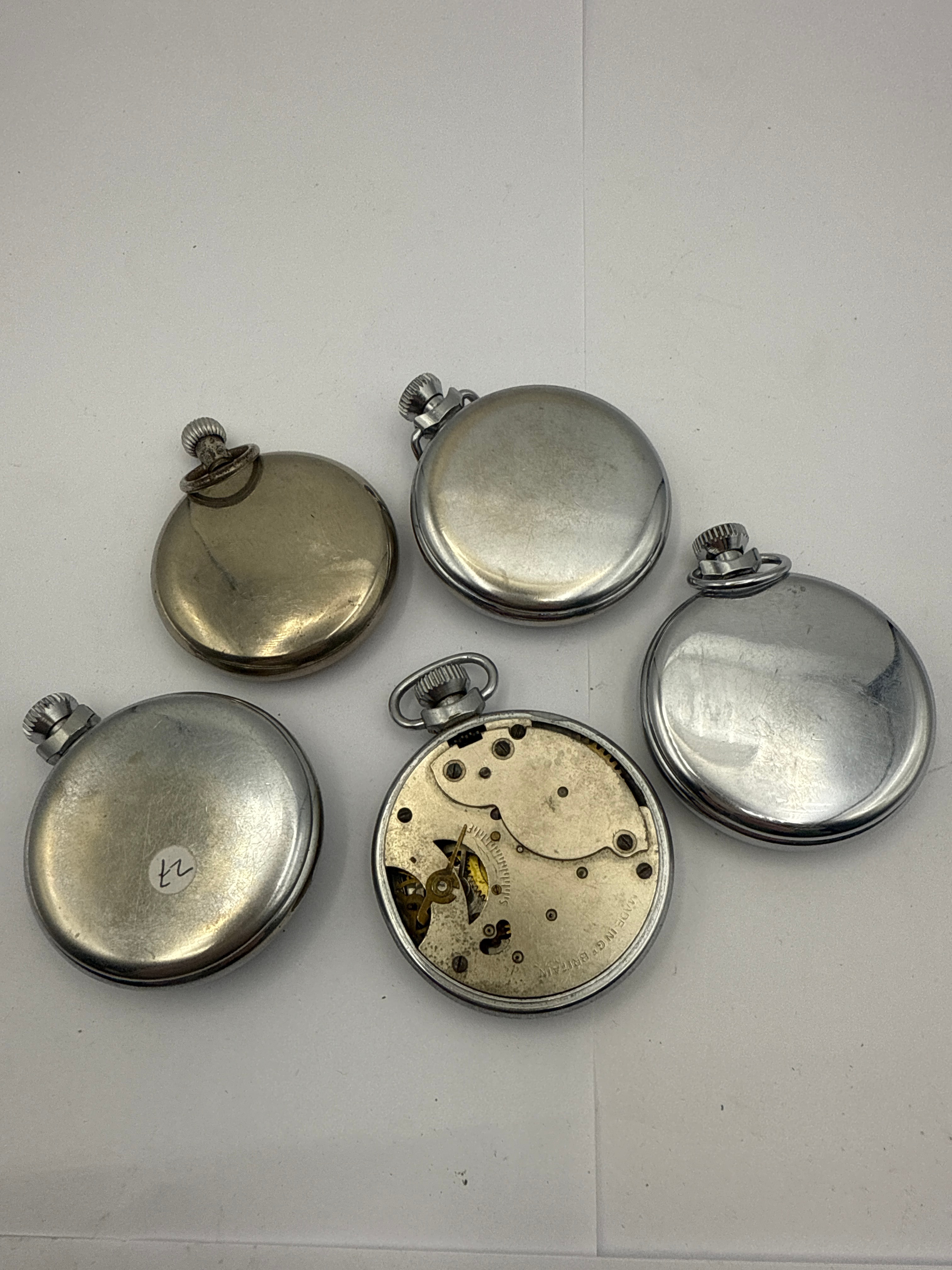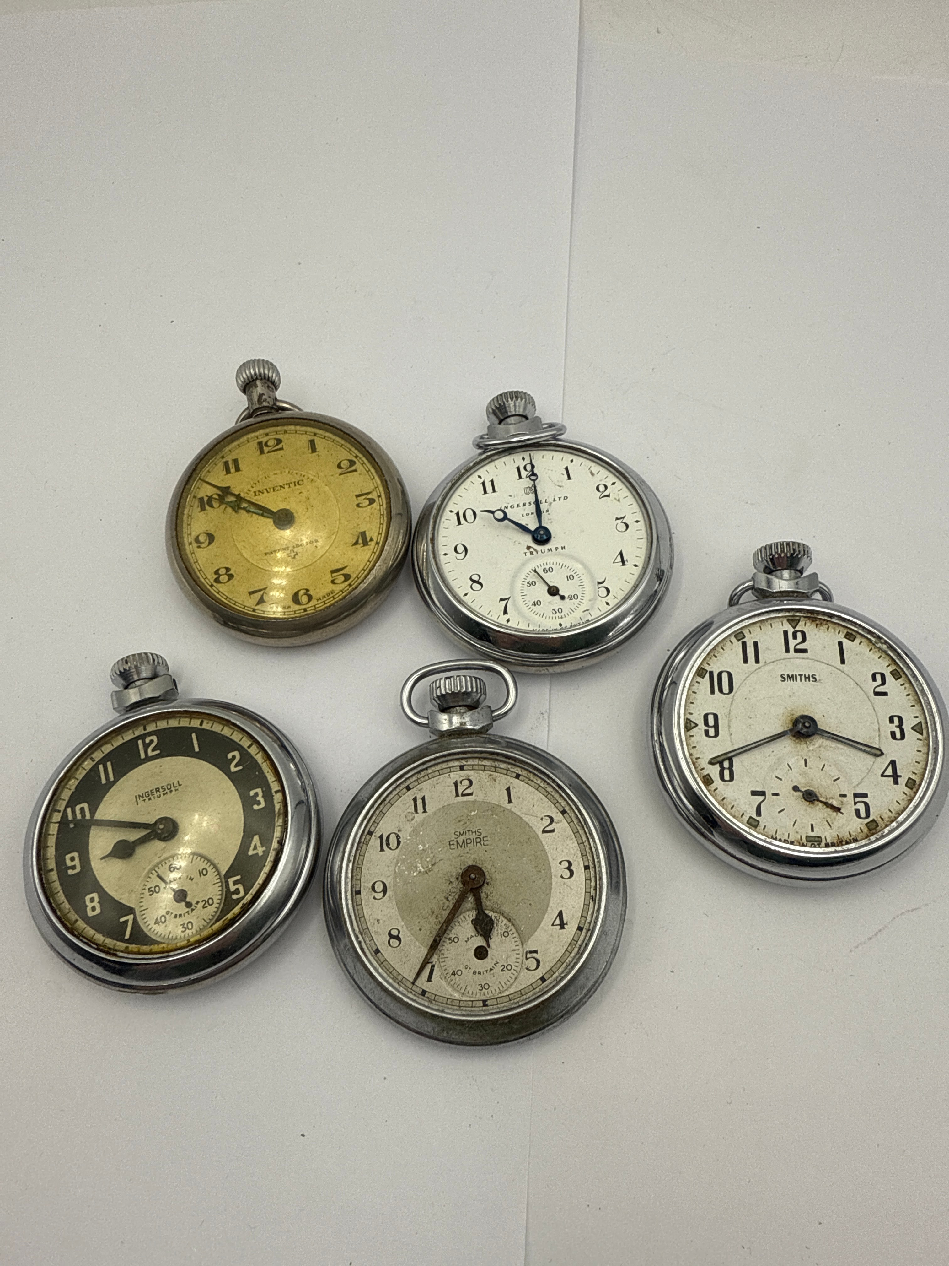 A group of 5 mechanical pocket watches, primarily featuring brands such as Smiths and Empire, likely dating to the early to mid-20th century. The watches feature primarily silver-tone metal cases, with one exhibiting a gold-tone finish, and various dial styles. Visible brands include ‘INGERSOLL,’ ‘SMITHS,’ and ‘EMPIRE,’ with ‘MADE IN BRITAIN’ and ‘SWISS MADE’ also present on some dials. One watch’s movement is exposed, displaying brass components and an inner case marked ‘MADE IN GREAT BRITAIN.’ The exterior of another case bears a handwritten ’72.’