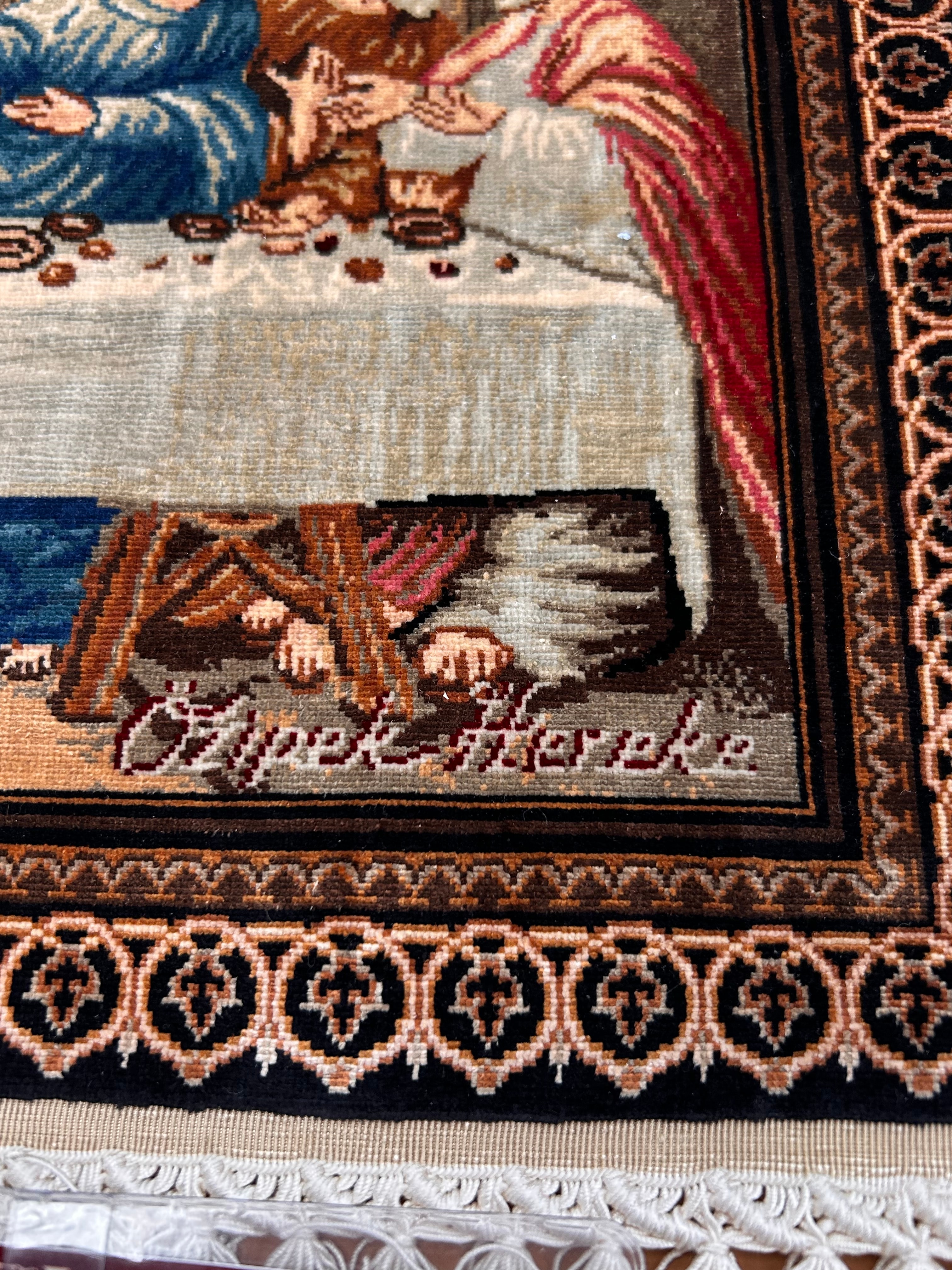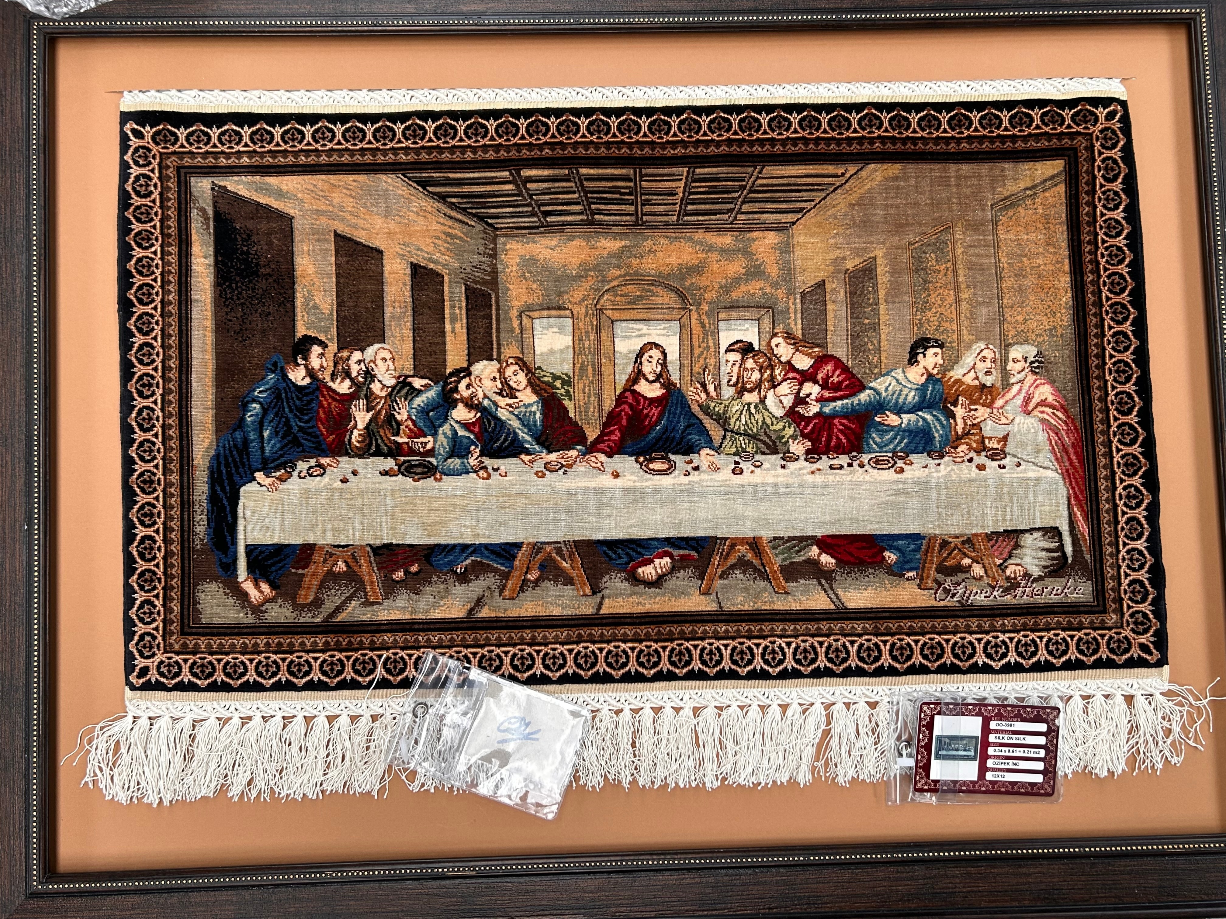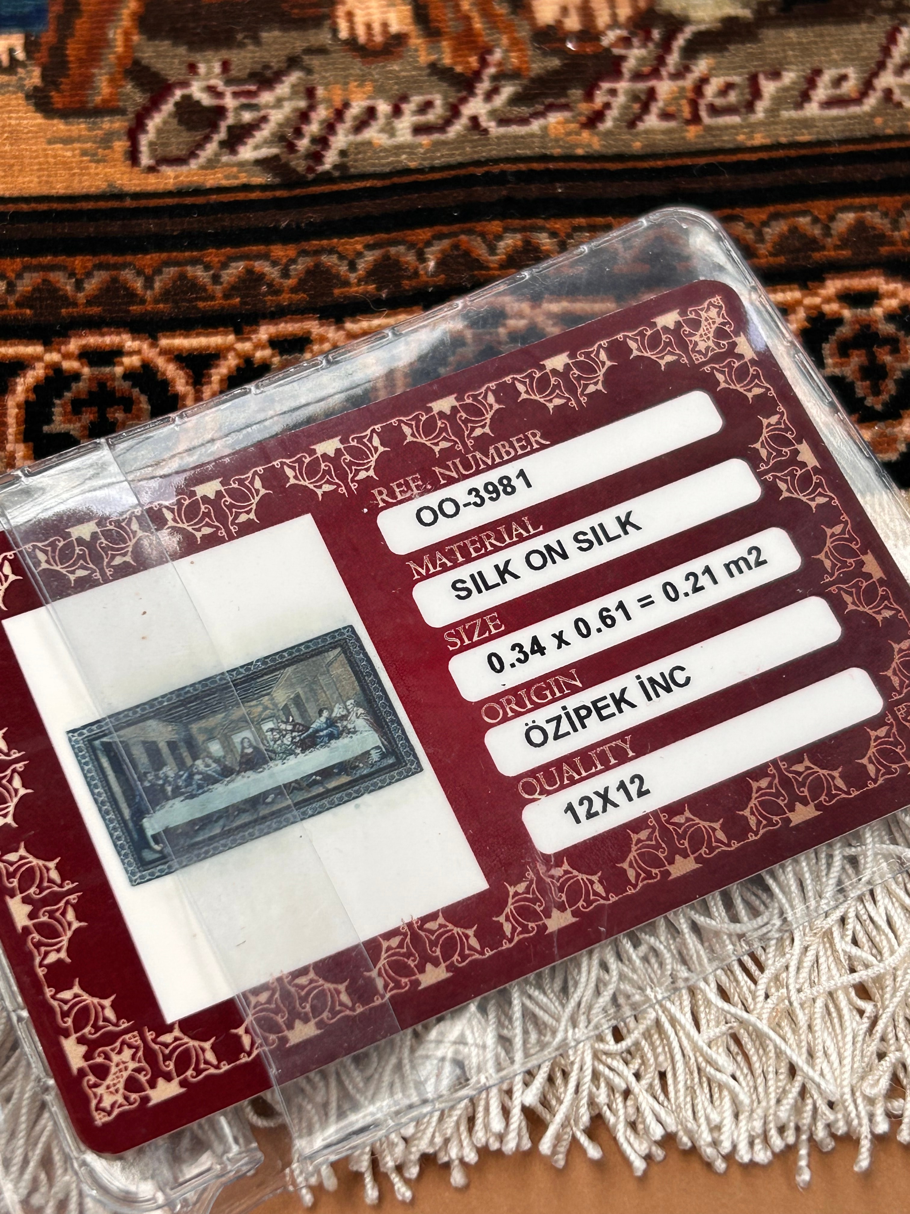 A hand-made silk-on-silk textile by Özipek Hereke, depicting Leonardo da Vinci’s “The Last Supper.” The detailed woven depiction is bordered by intricate geometric patterns. The lower right corner of the textile is woven with the text “Özipek Hereke.” It features a white macrame-style fringe along the bottom edge. Accompanying information tags indicate the material as “SILK ON SILK,” reference number “OO-3981,” origin as “ÖZİPEK INC” (or “ÖZİPEK İNCE”), and quality as “12X12.” The textile is presented within a dark wood-effect frame.