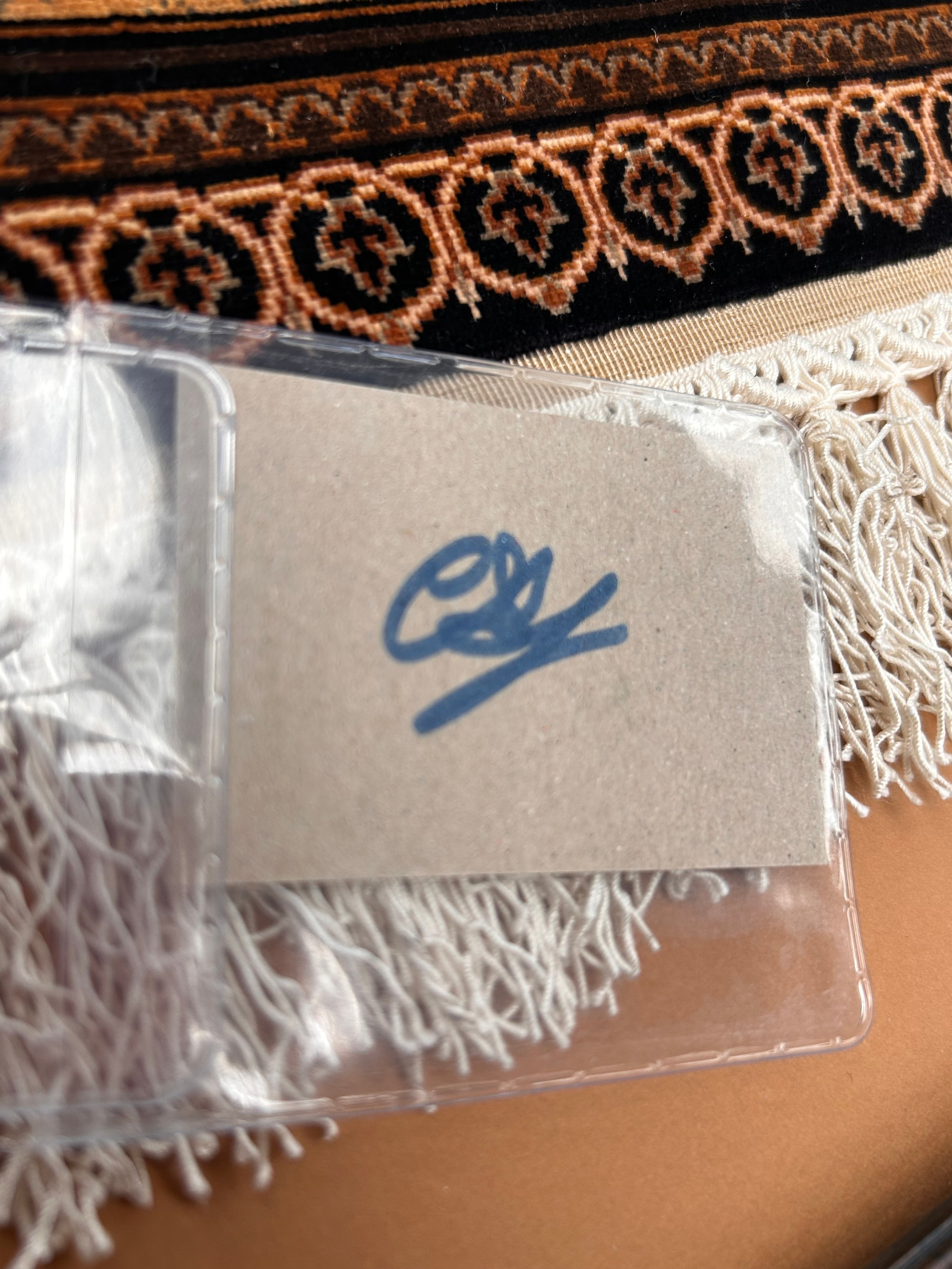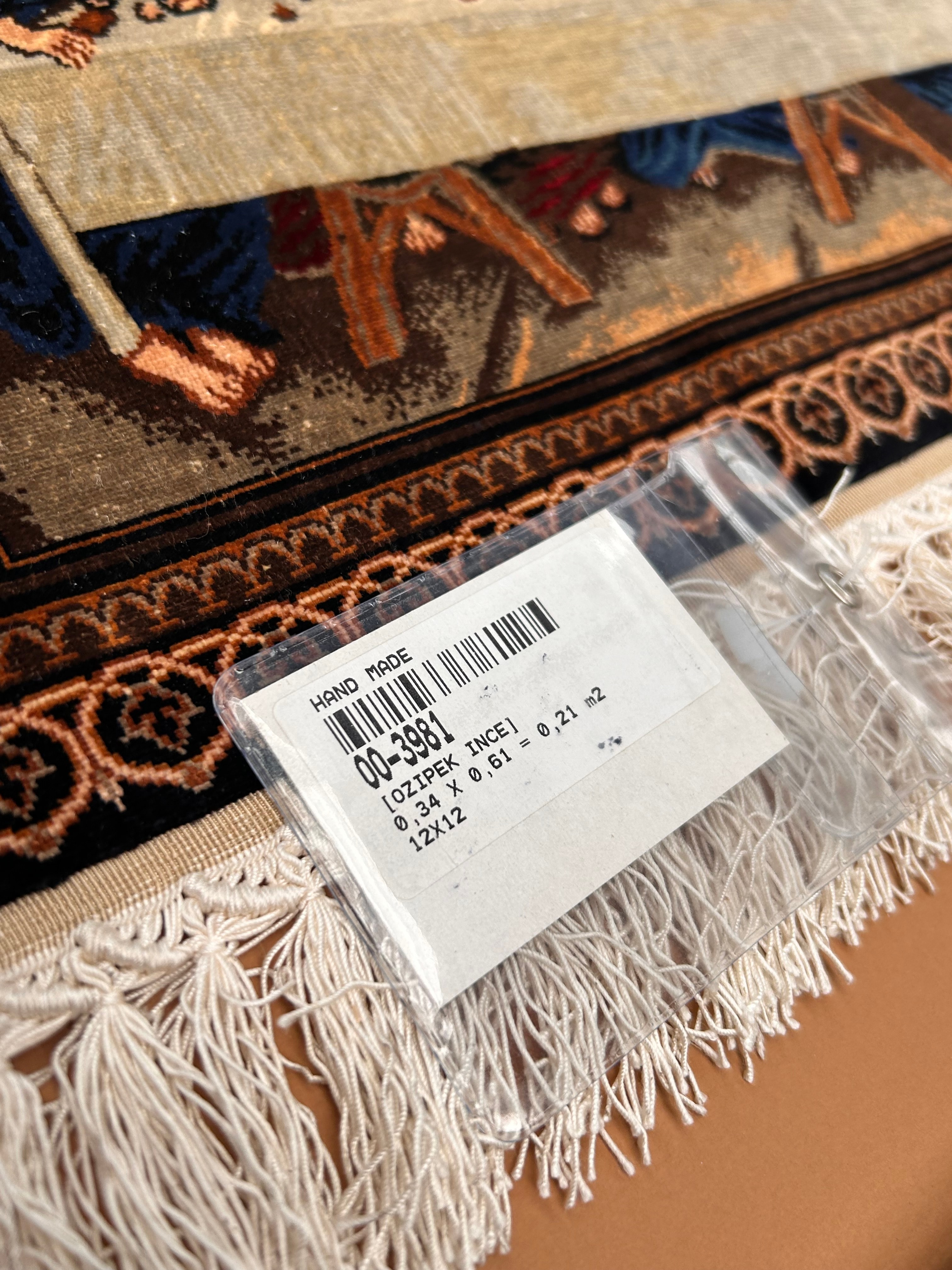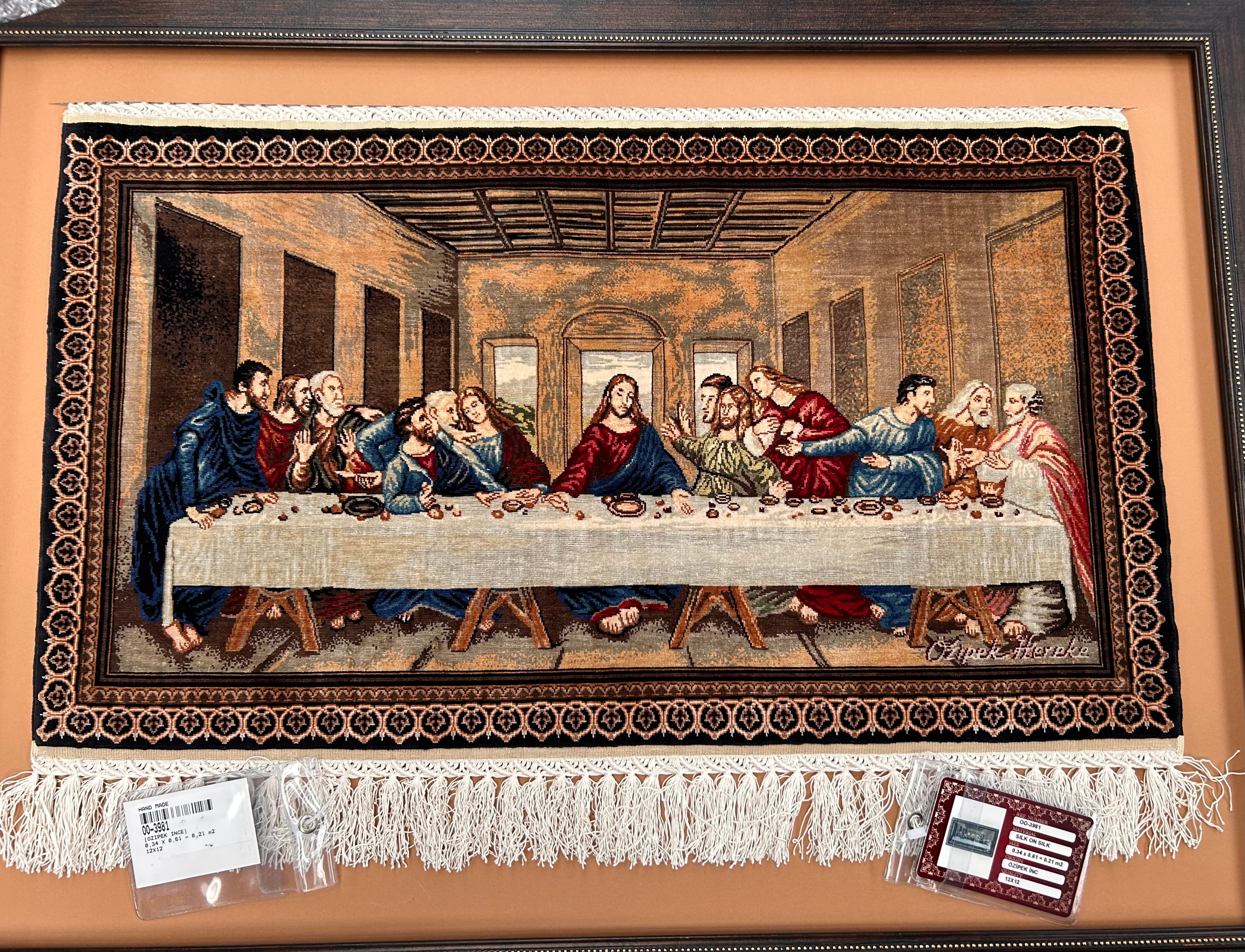 A hand-made silk-on-silk textile by Özipek Hereke, depicting Leonardo da Vinci’s “The Last Supper.” The detailed woven depiction is bordered by intricate geometric patterns. The lower right corner of the textile is woven with the text “Özipek Hereke.” It features a white macrame-style fringe along the bottom edge. Accompanying information tags indicate the material as “SILK ON SILK,” reference number “OO-3981,” origin as “ÖZİPEK INC” (or “ÖZİPEK İNCE”), and quality as “12X12.” The textile is presented within a dark wood-effect frame.