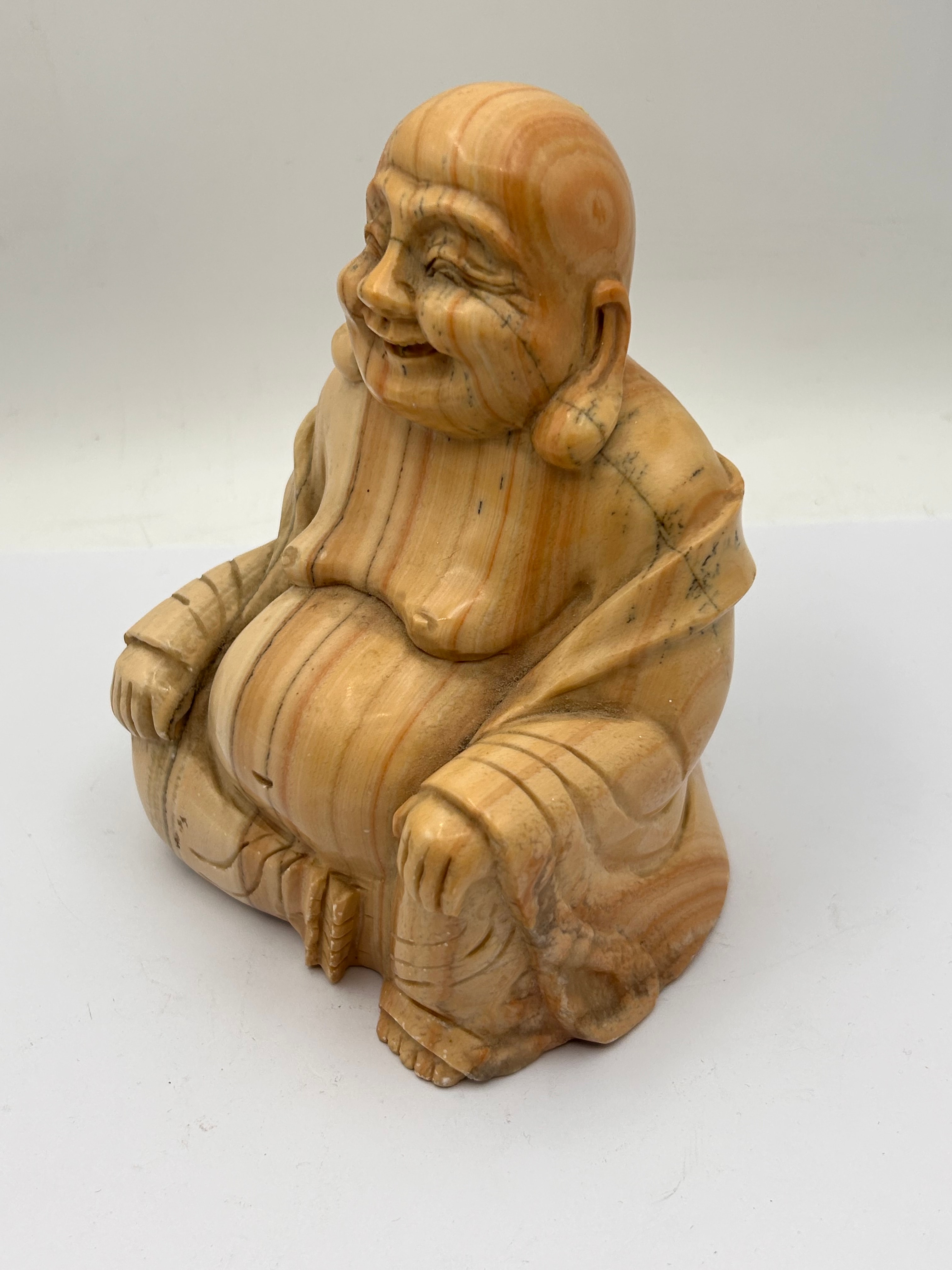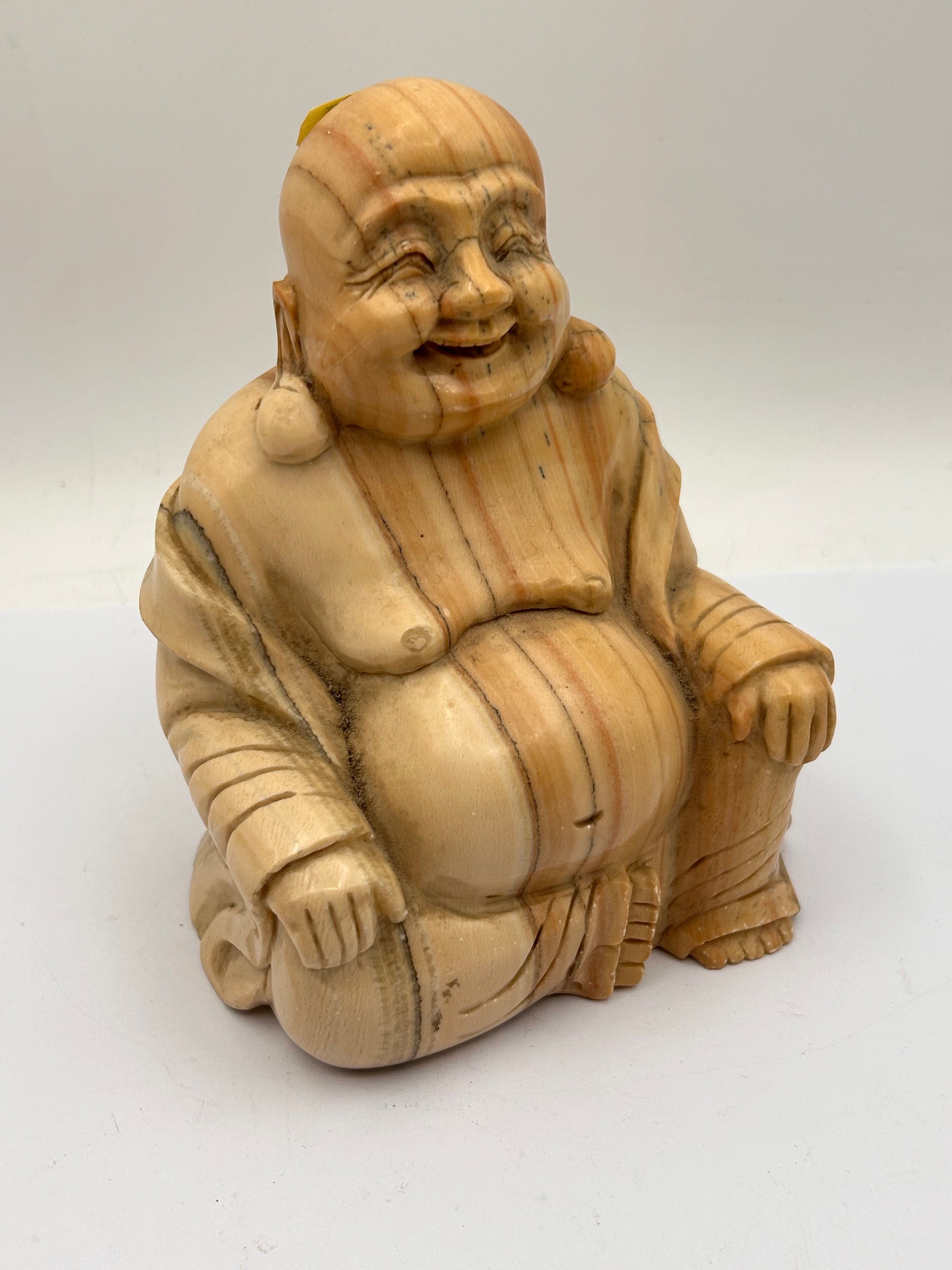 A carved figurine depicting a seated, laughing Buddha or Hotei figure, characterized by a corpulent belly, jovial facial expression, and draped robes. It is crafted from a natural material exhibiting prominent striations and banding in shades of creamy off-white, tan, and reddish-brown, suggestive of banded stone. The surface appears smooth with a slight sheen. A white sticker with blue text “BM1442” and some red markings is affixed to the underside/back.