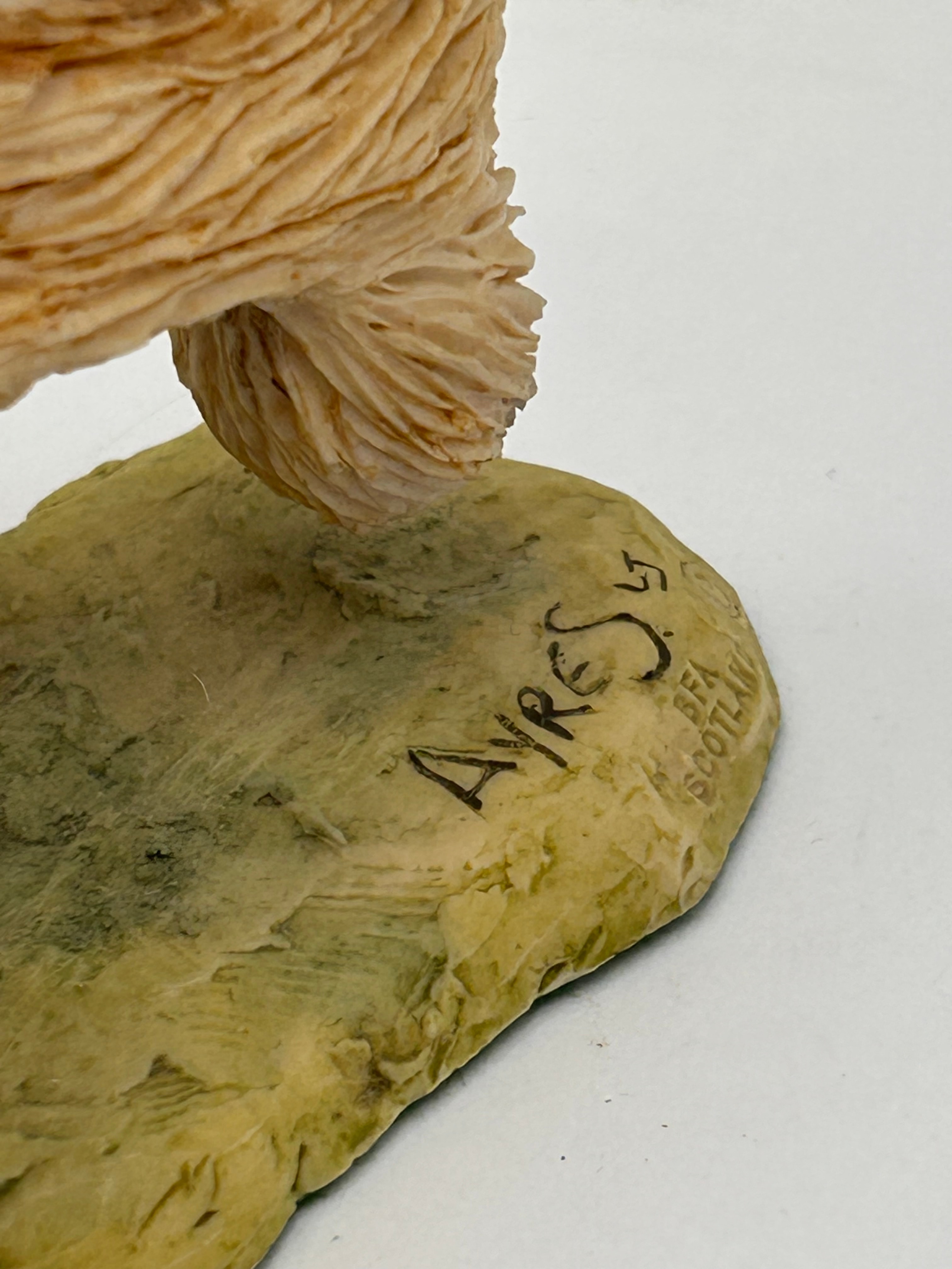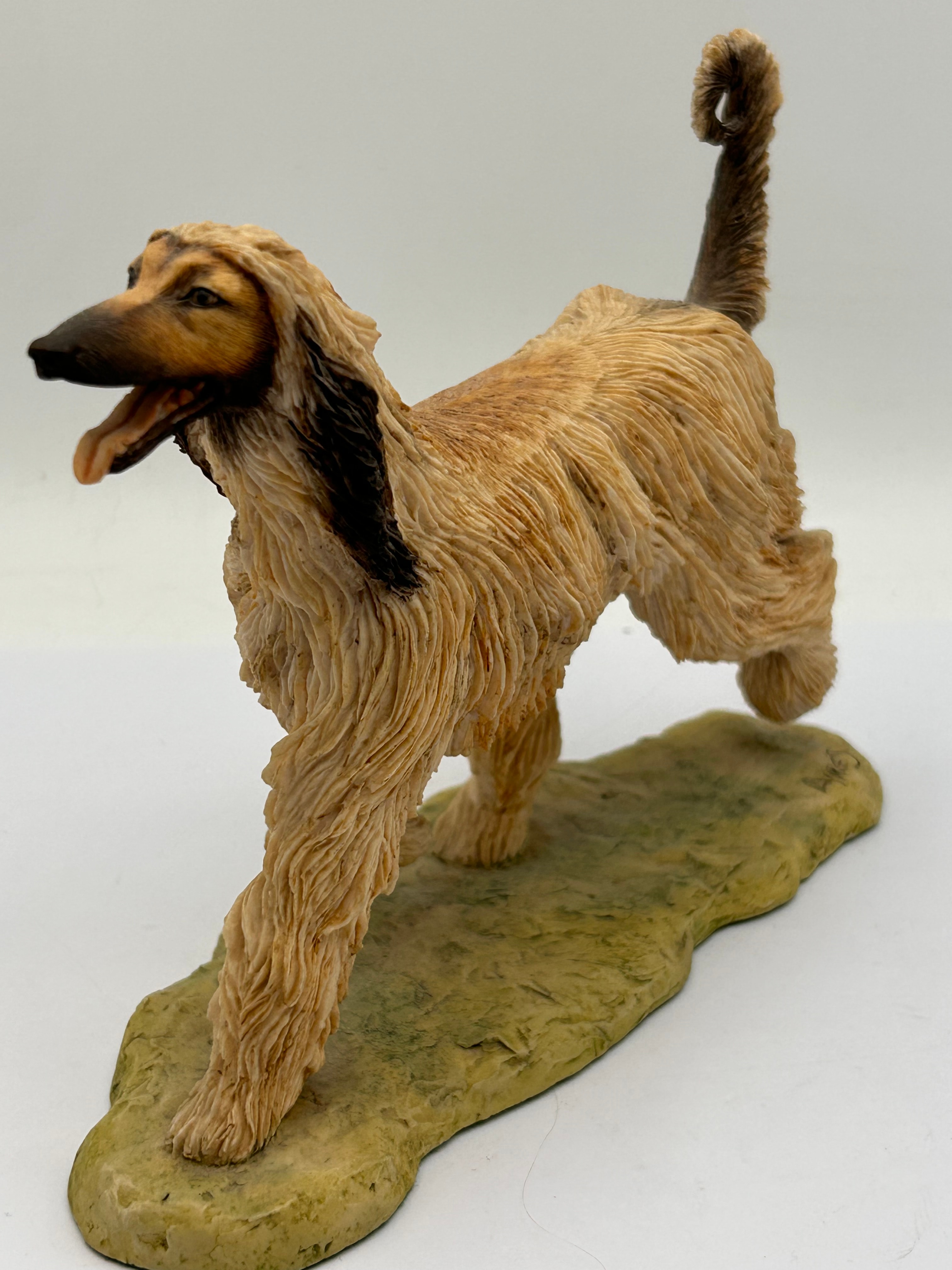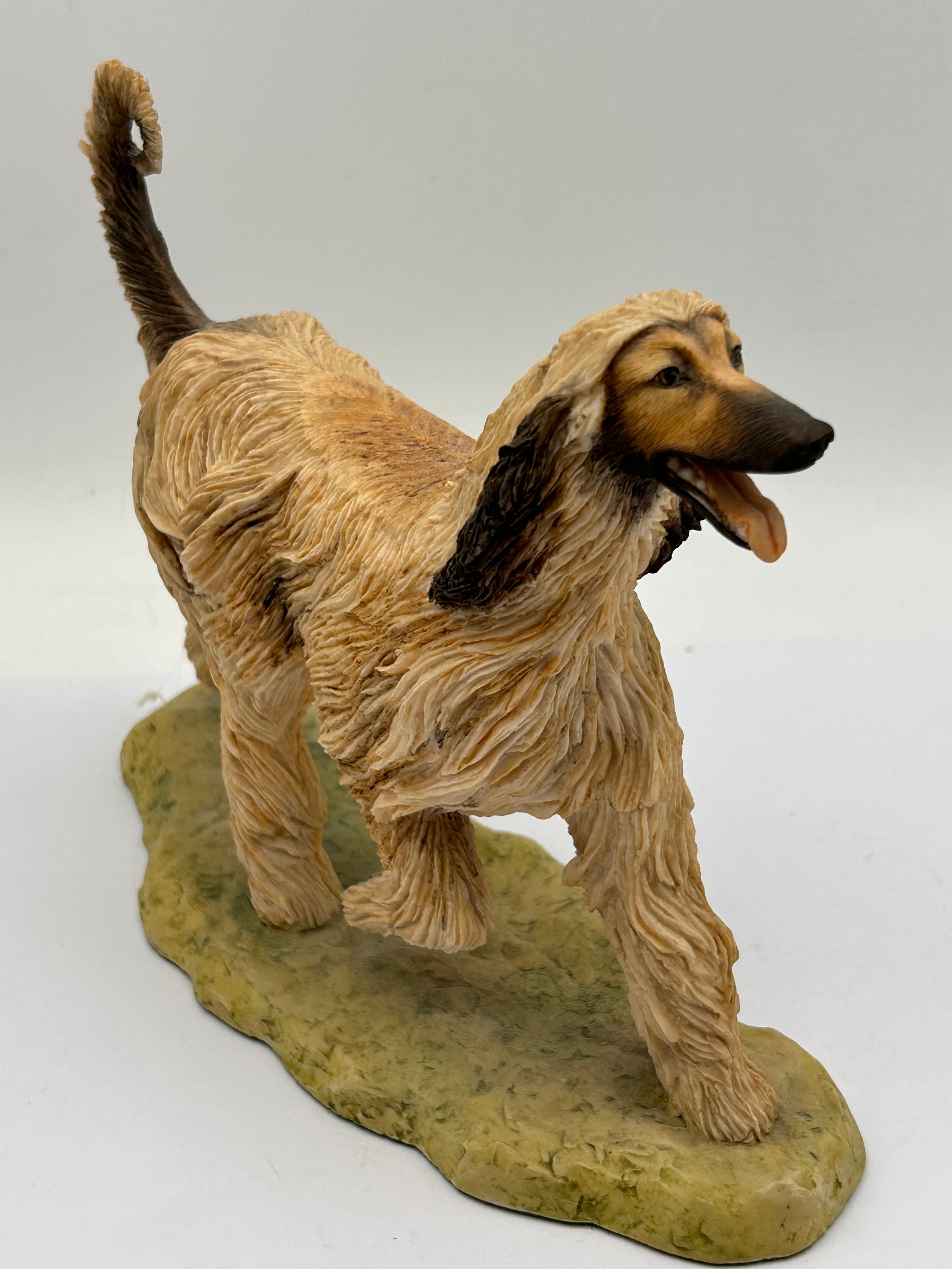 A hand-painted resin figurine depicting a tan Afghan Hound dog in a striding pose with a darker muzzle, ears, and tail, rendered in a realistic, contemporary style. The figurine is mounted on a textured, olive-green base. Visible markings on the base include “AIRES” in stylized script and “BFA SCOTLAND” below it.