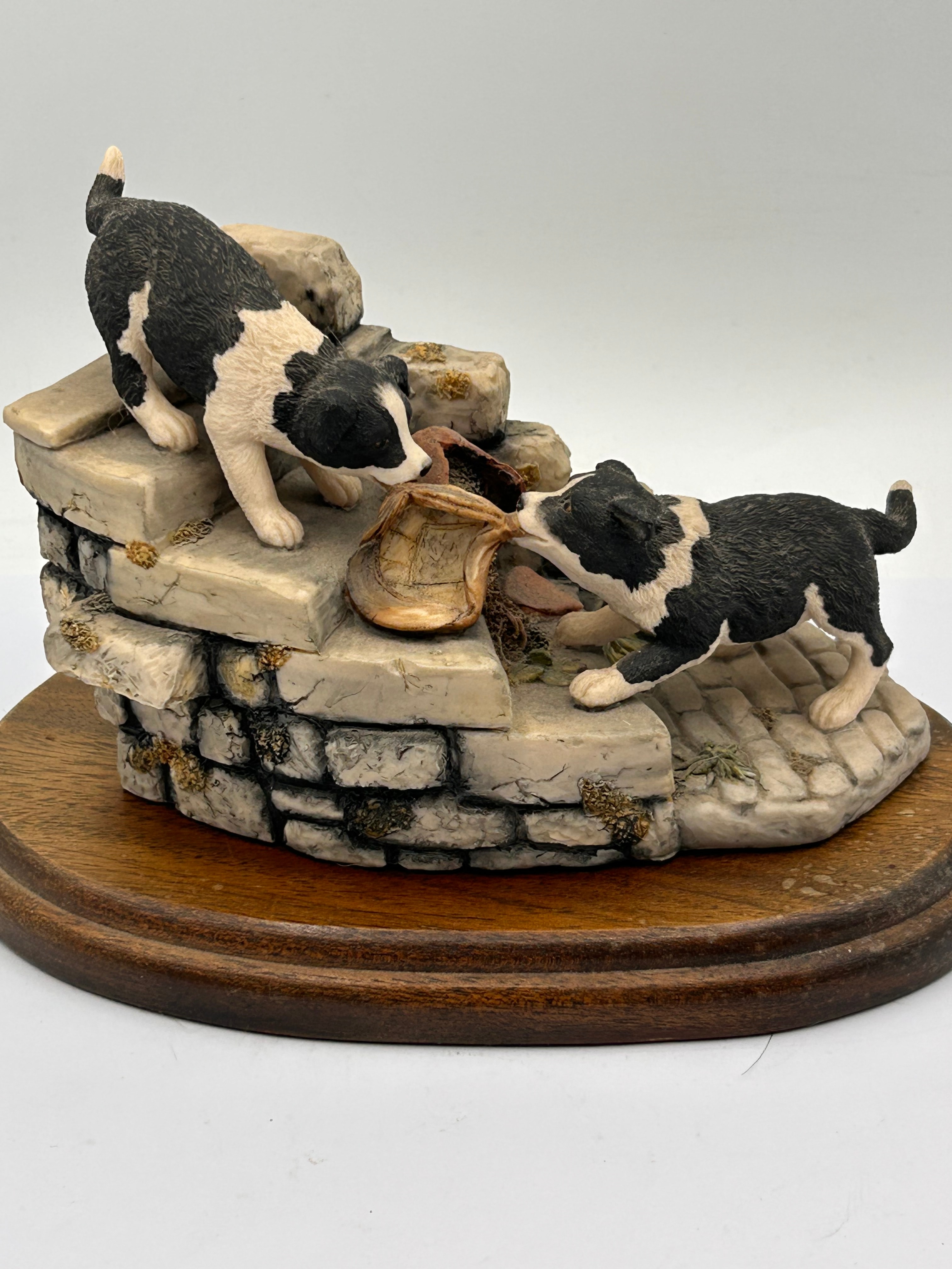 A Border Fine Arts ‘Tug o’ War’ figurine, JH61, from the James Herriot collection. This hand-painted resin or composite material piece depicts two black and white puppies, likely Border Collies, interacting with a stone-like well or pump structure featuring a bucket or trough. It is mounted on a round, stained wooden base. Visible markings on the side of the base include ‘D. Walton AP’ and ‘© JAMES HERRIOT’.