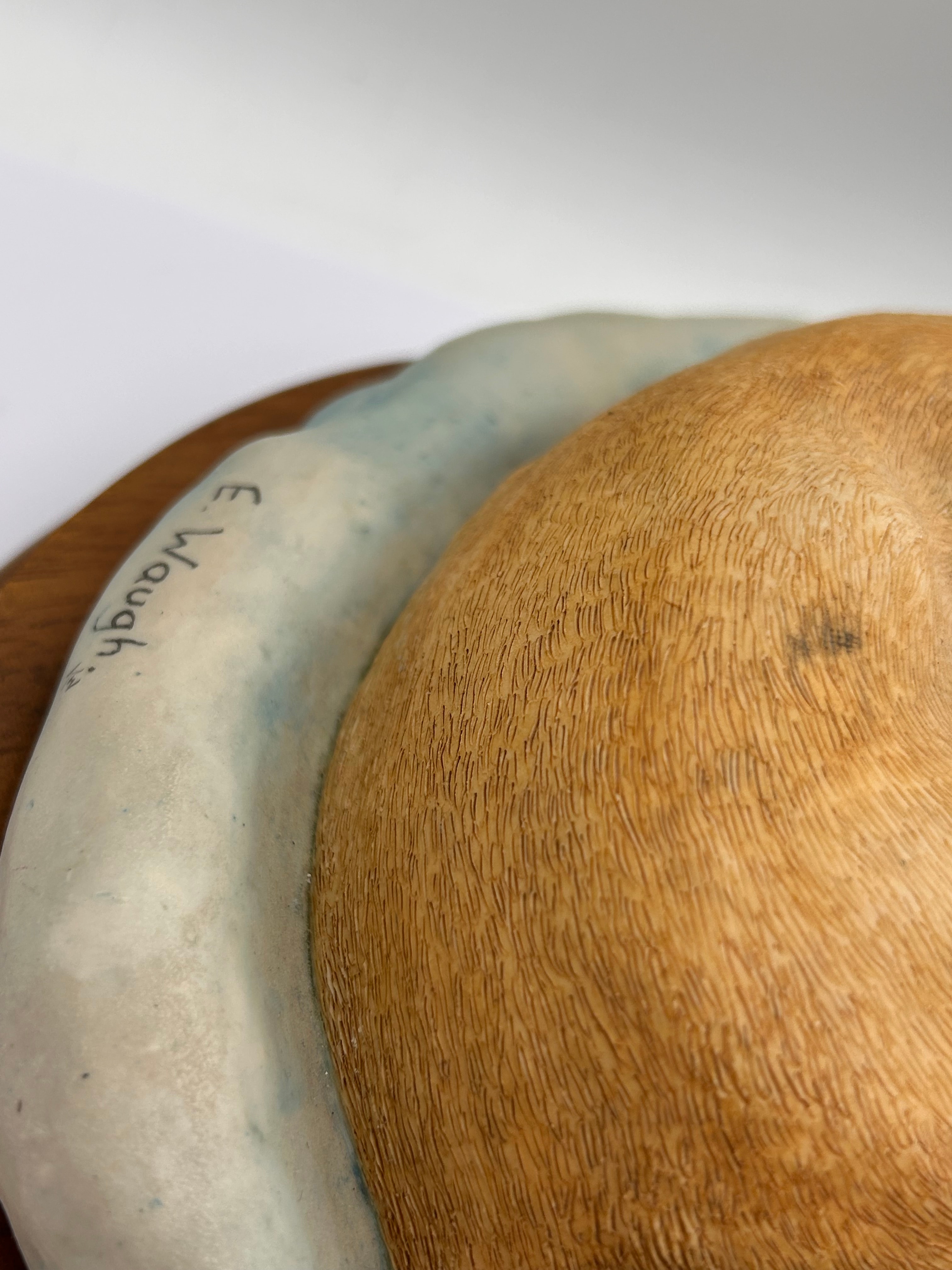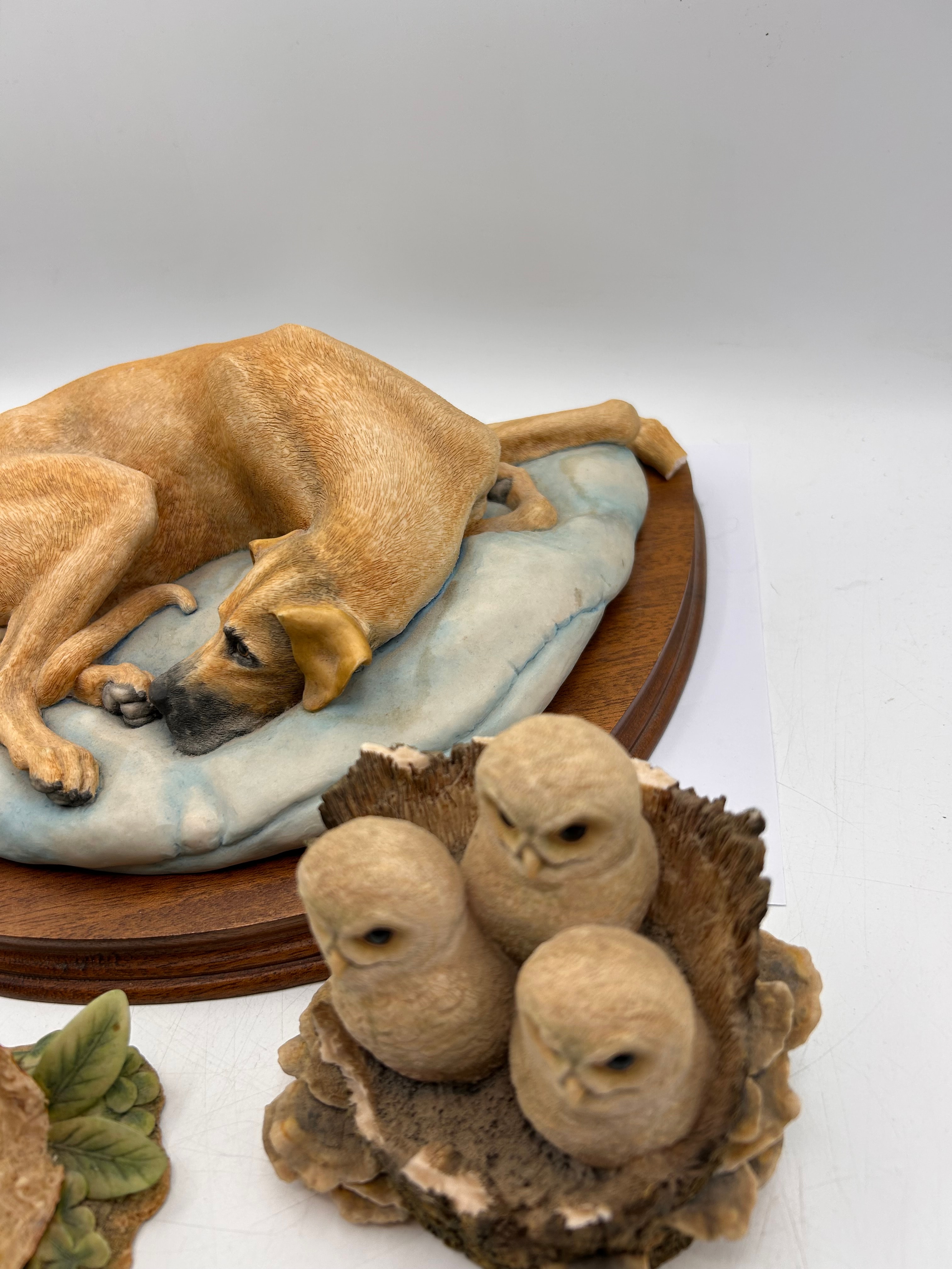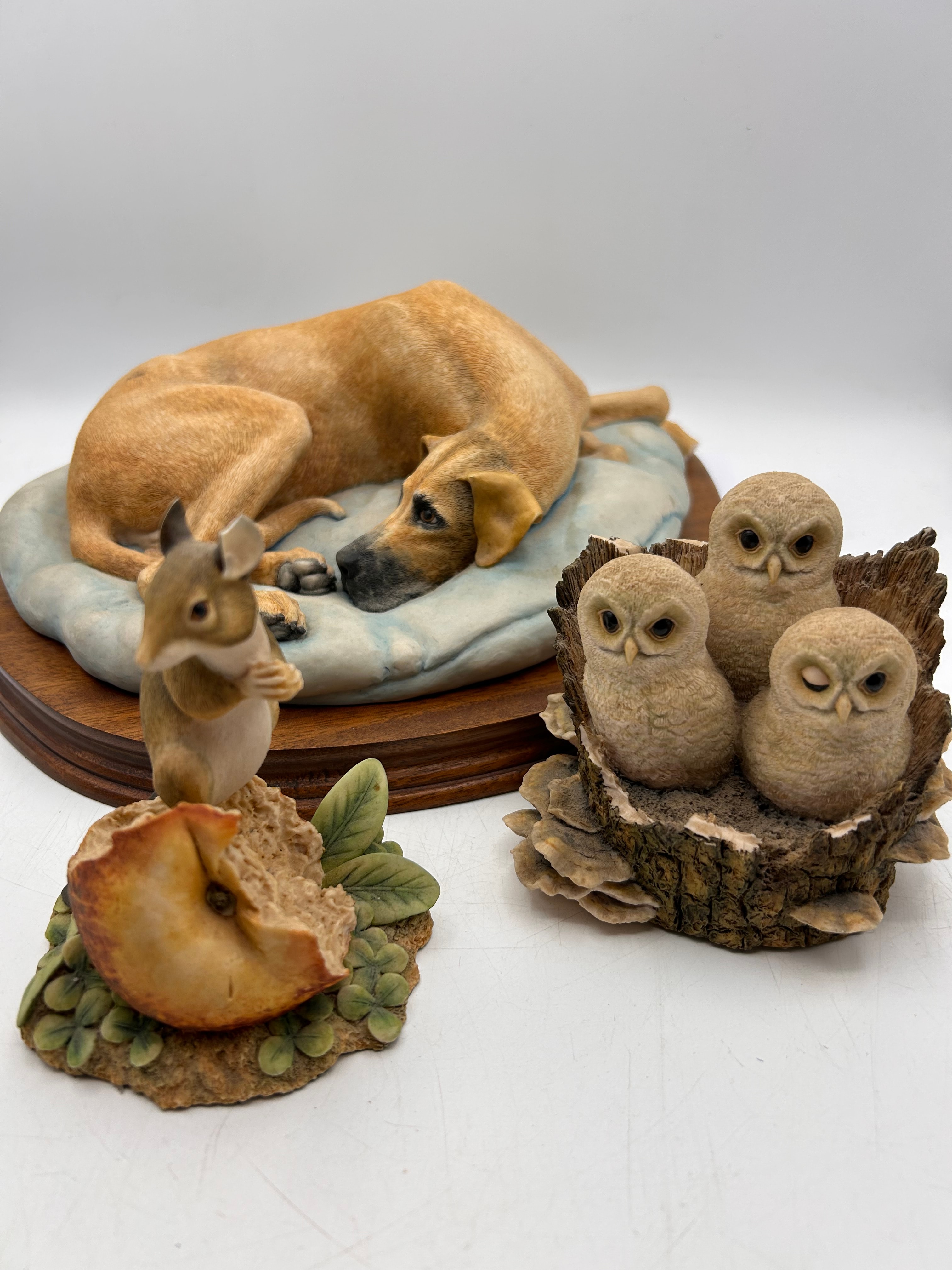 A group of three naturalistic animal figurines, crafted from a composite material such as resin. The primary item depicts a tan-colored dog, possibly a retriever breed, sleeping on a light blue cushion, resting on a circular polished wooden base. The cushion bears a visible signature, “E. Waugh.” A second figurine features a small rodent, potentially a mouse or chipmunk, standing alongside a partially eaten red apple with green foliage on a textured base. The third piece showcases three small, light brown owls nestled within a detailed tree bark structure with apparent bracket fungi. All items exhibit finely sculpted details.
