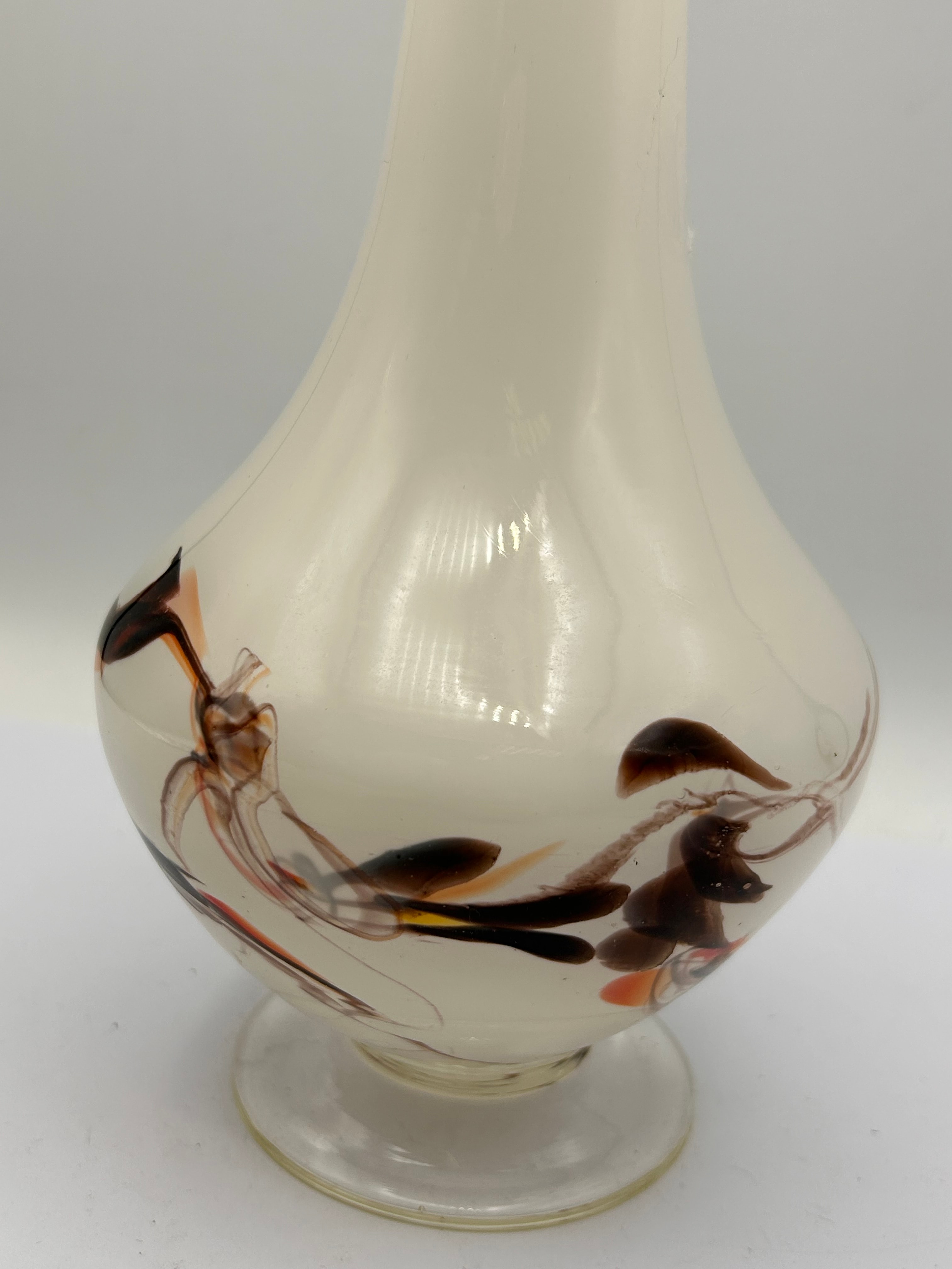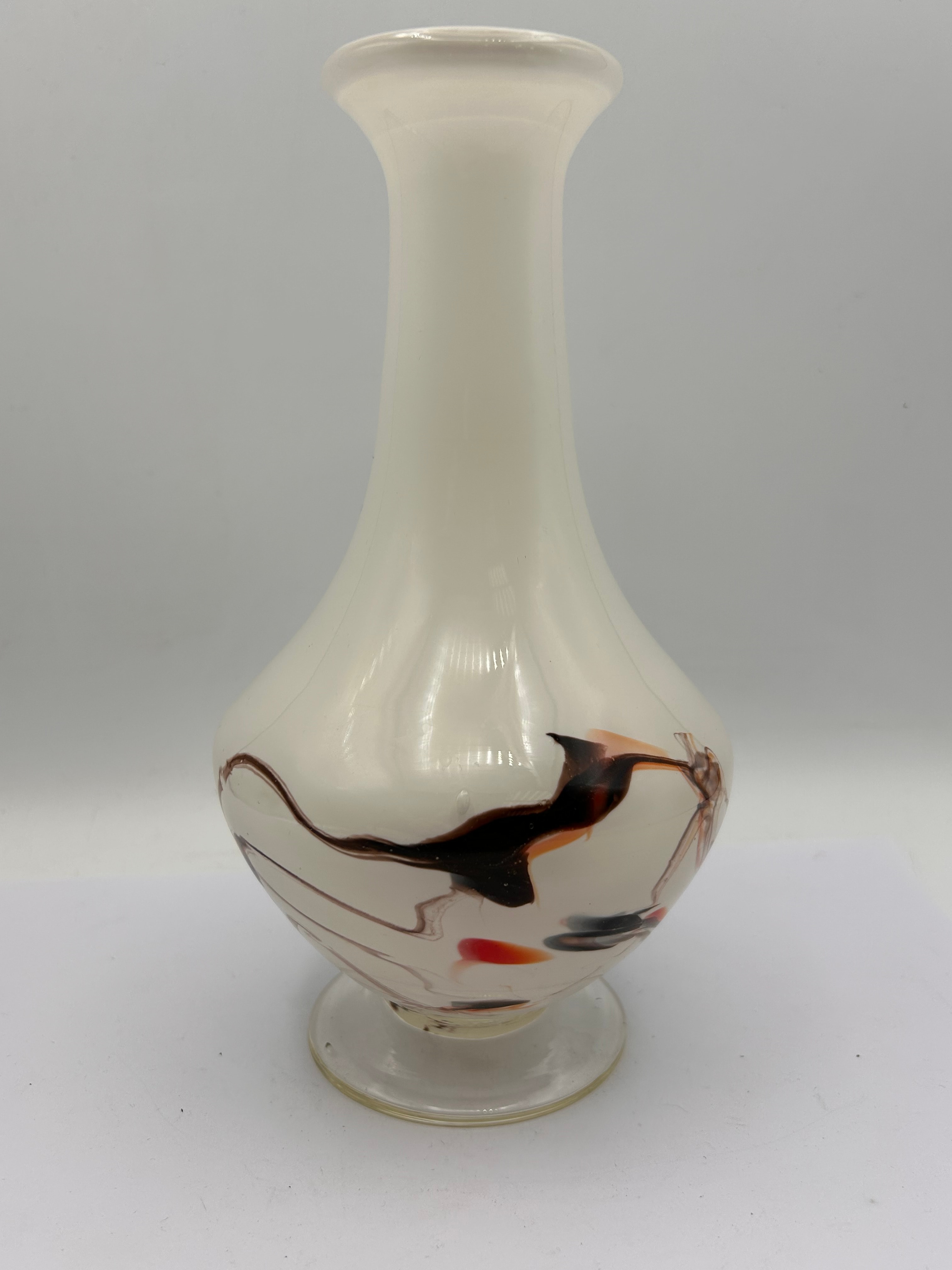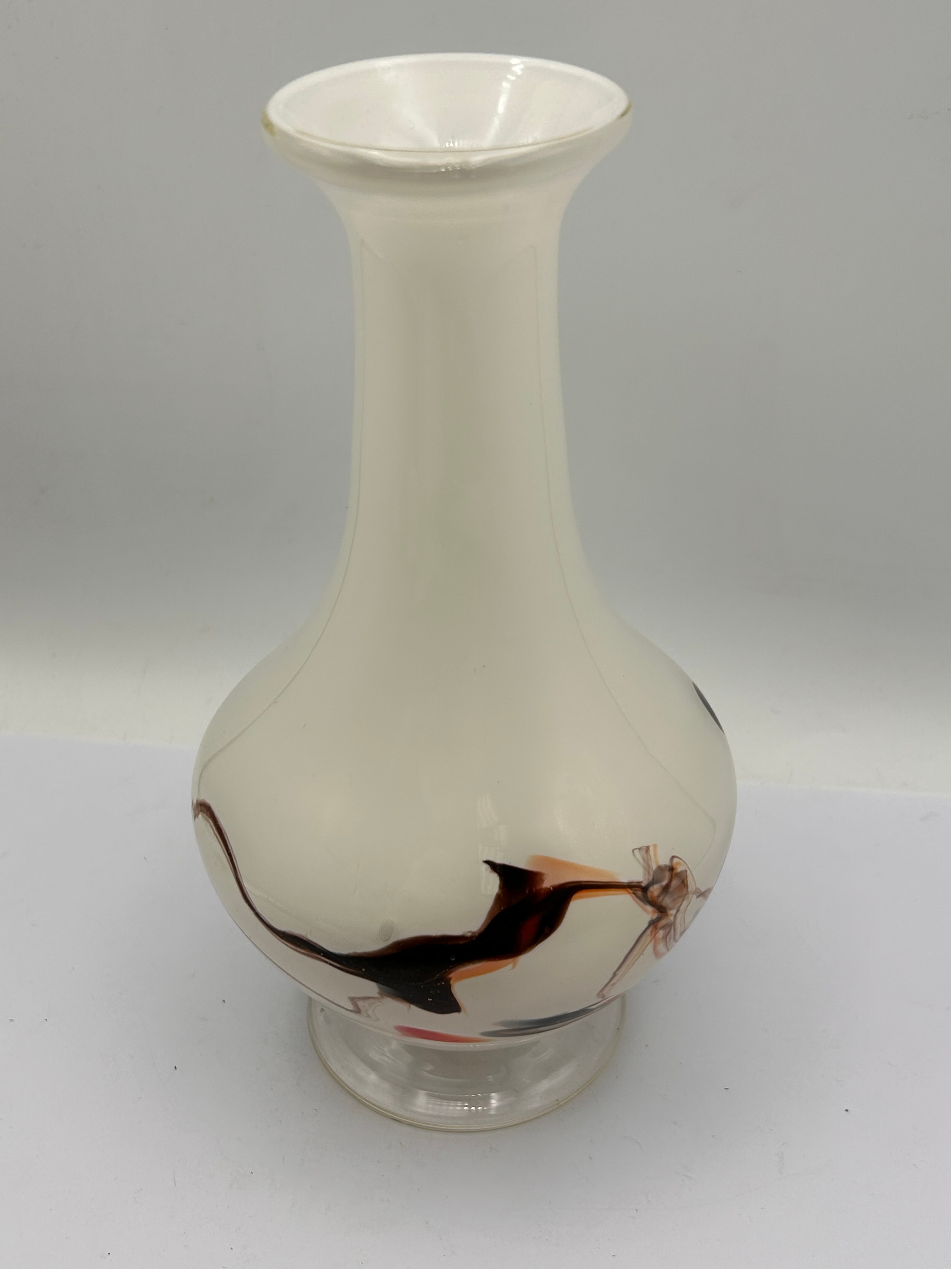 A Mid-20th Century Modernist opaque white art glass vase. The vase features a flared rim, a slender neck transitioning to a bulbous body, and a clear, disk-shaped foot. The body is decorated with abstract, swirling patterns of embedded glass in shades of brown, black, and hints of orange/red. No visible text, signatures, or maker’s marks are discernible.