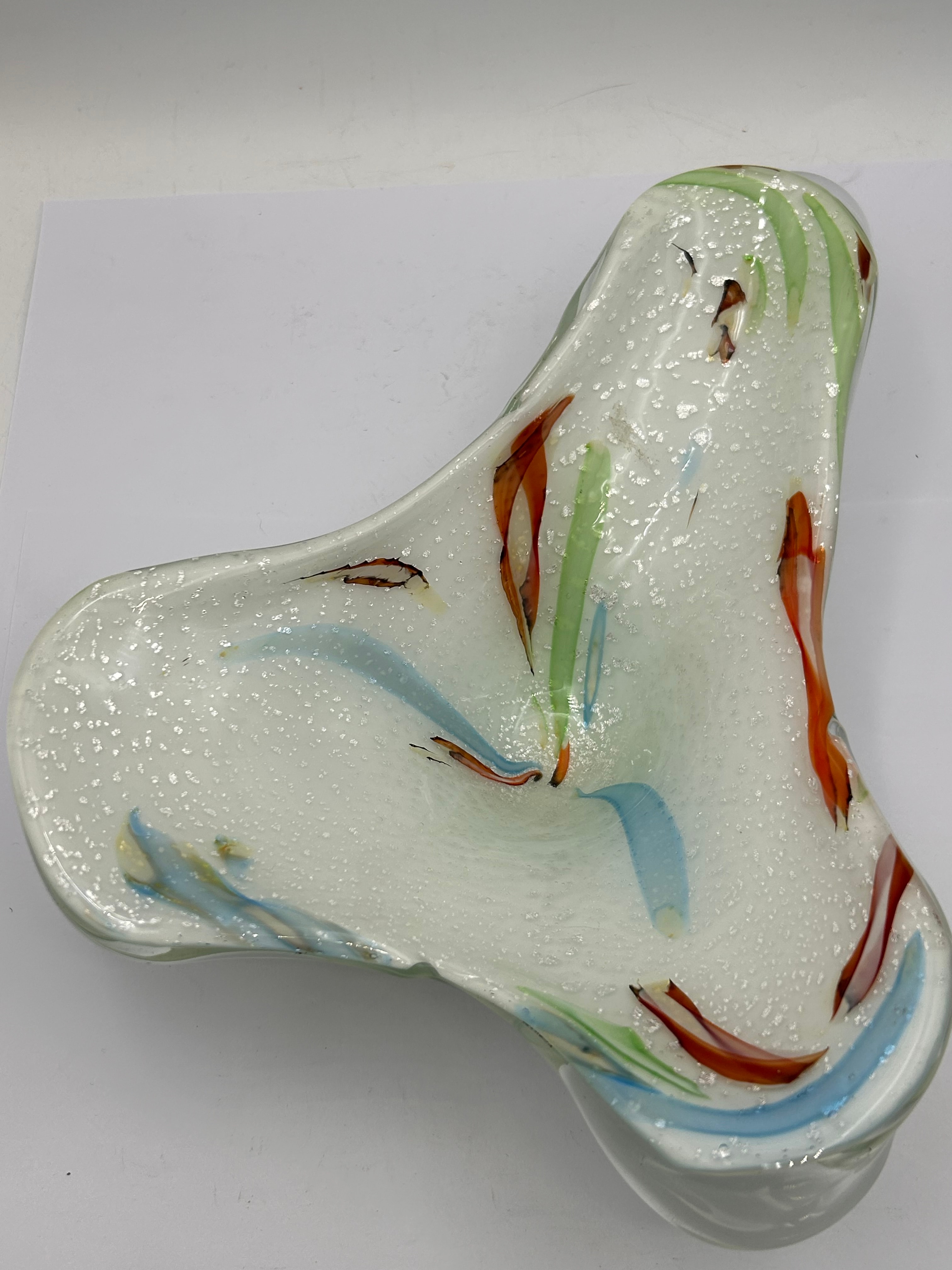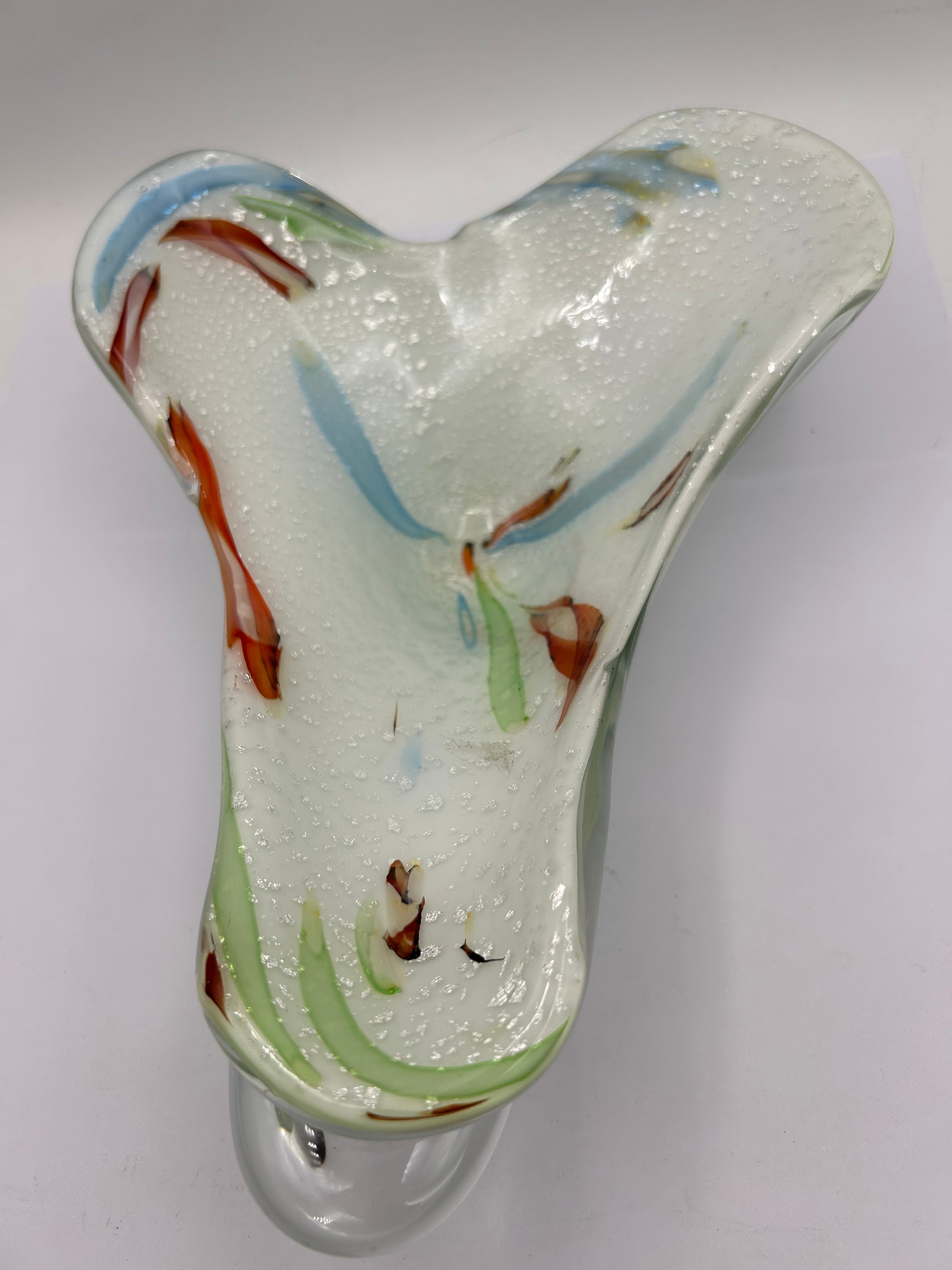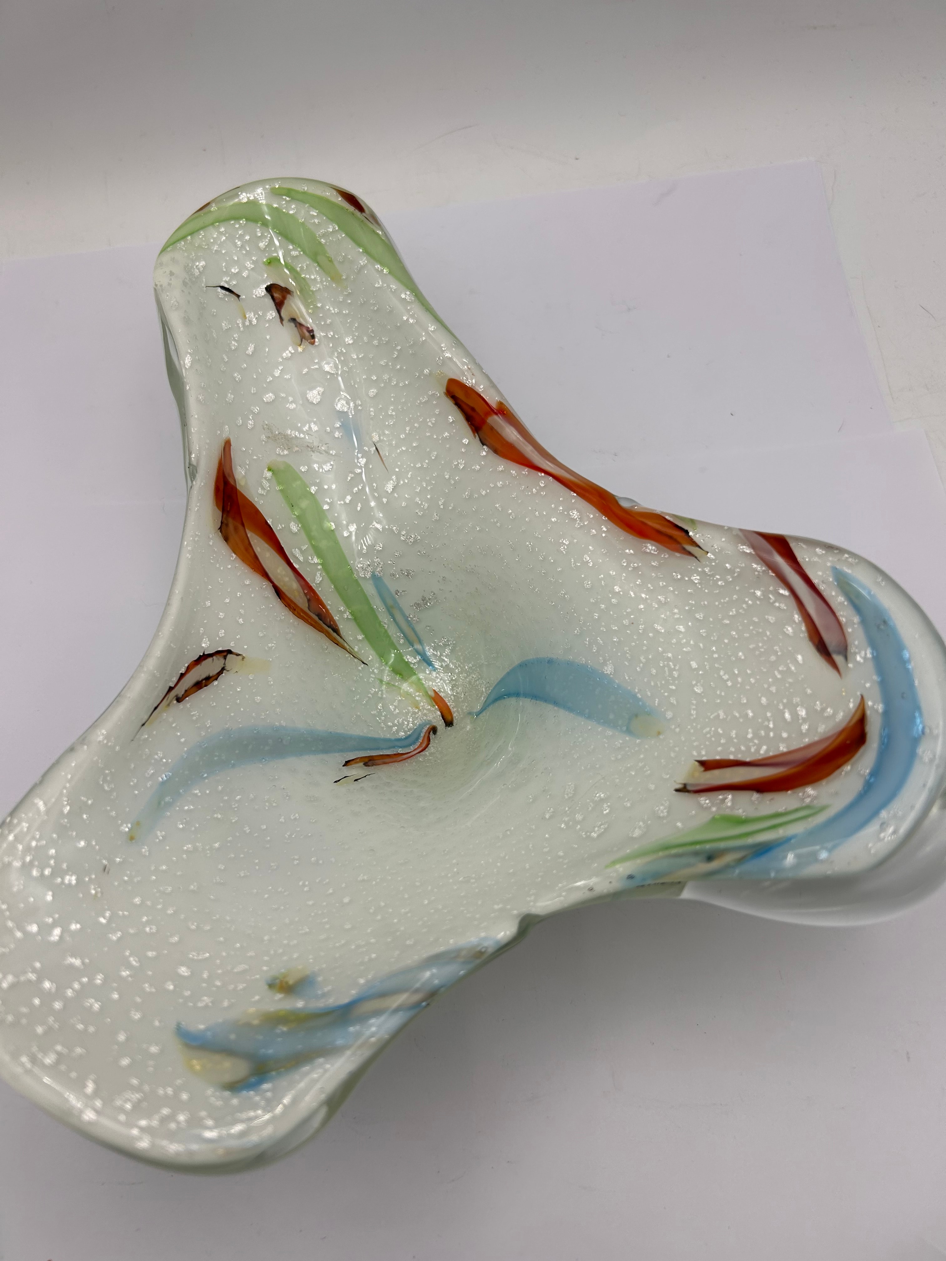 A vintage Italian hand-blown Murano art glass vessel, likely a decorative bowl or catchall, featuring a distinctive tutti-frutti design with silver inclusions. The piece exhibits an irregular, organic form with a flared, undulating rim and rests on a solid circular base. It is crafted from opaque white glass, with an all-over textured appearance due to numerous embedded air bubbles, characteristic of the bullicante technique. Internal streaks and patches of blue, green, and rust-orange colored glass are visible throughout the body. A “Made in Italy” sticker is present on the underside of the base.