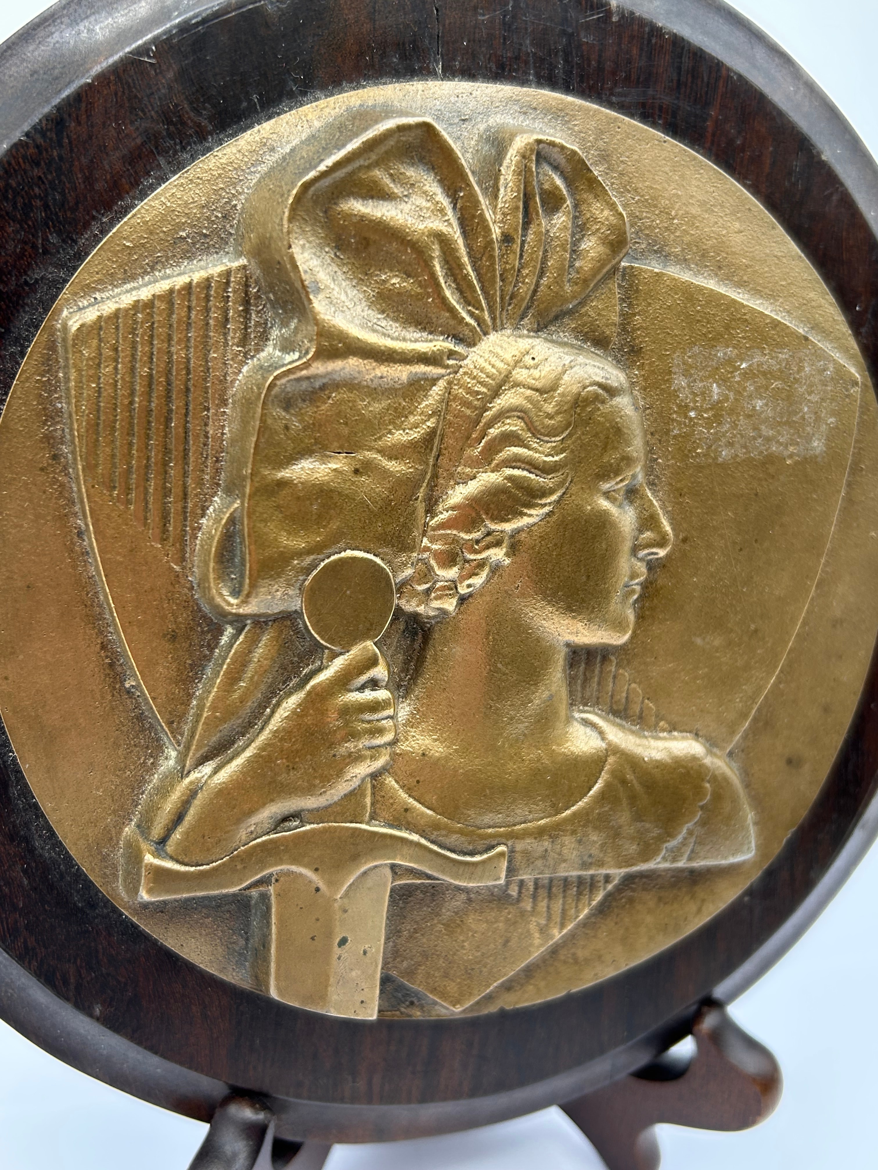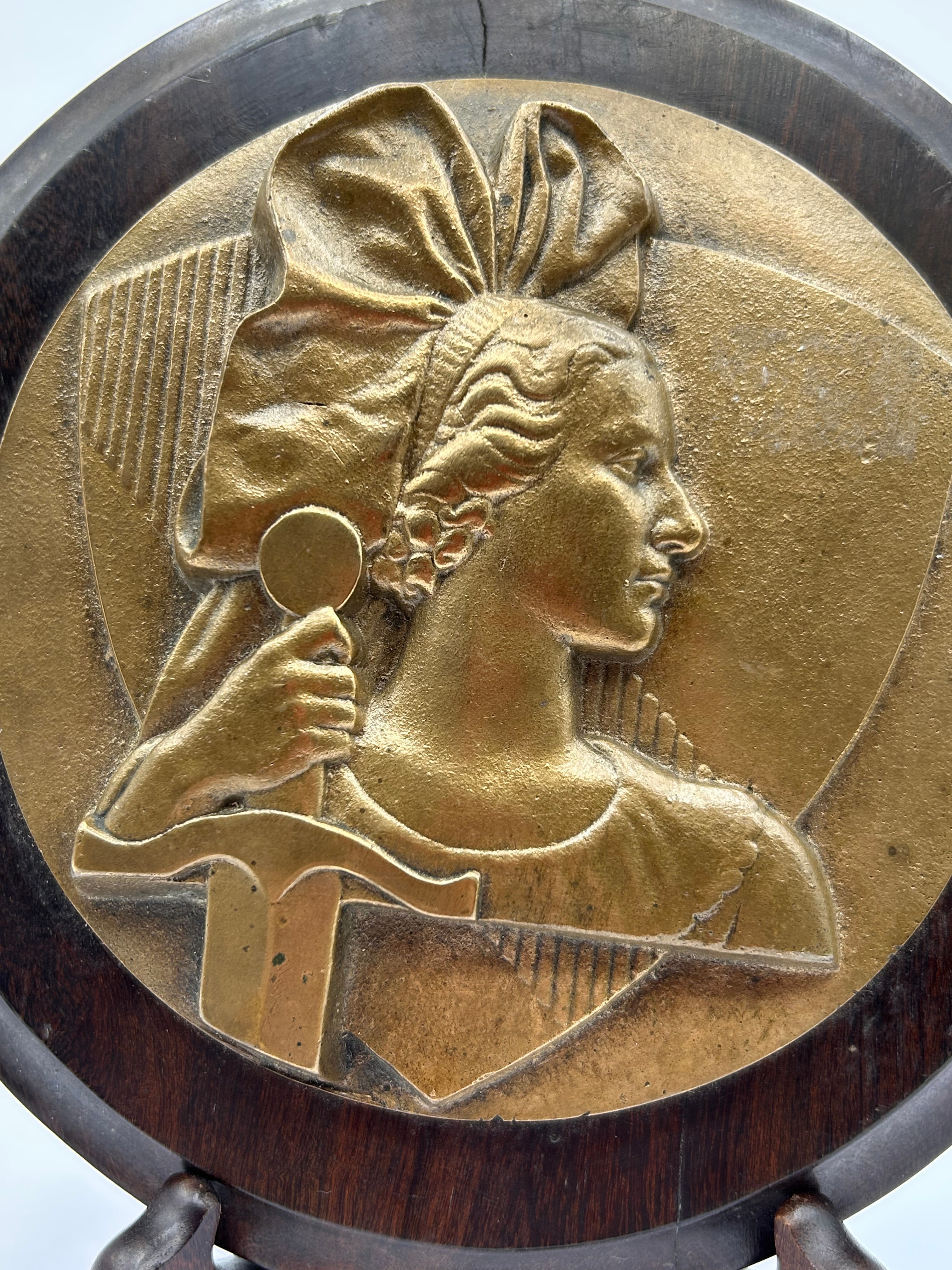 An H. Dropsy? French Resistance Bronze medallion, mounted within a dark stained wooden plaque. The medallion features a high-relief profile depiction of a stylized woman with a large bow in her hair, holding a sword, set against a background incorporating shield-like and architectural elements. The reverse of the wooden plaque reveals brass hanging hardware.